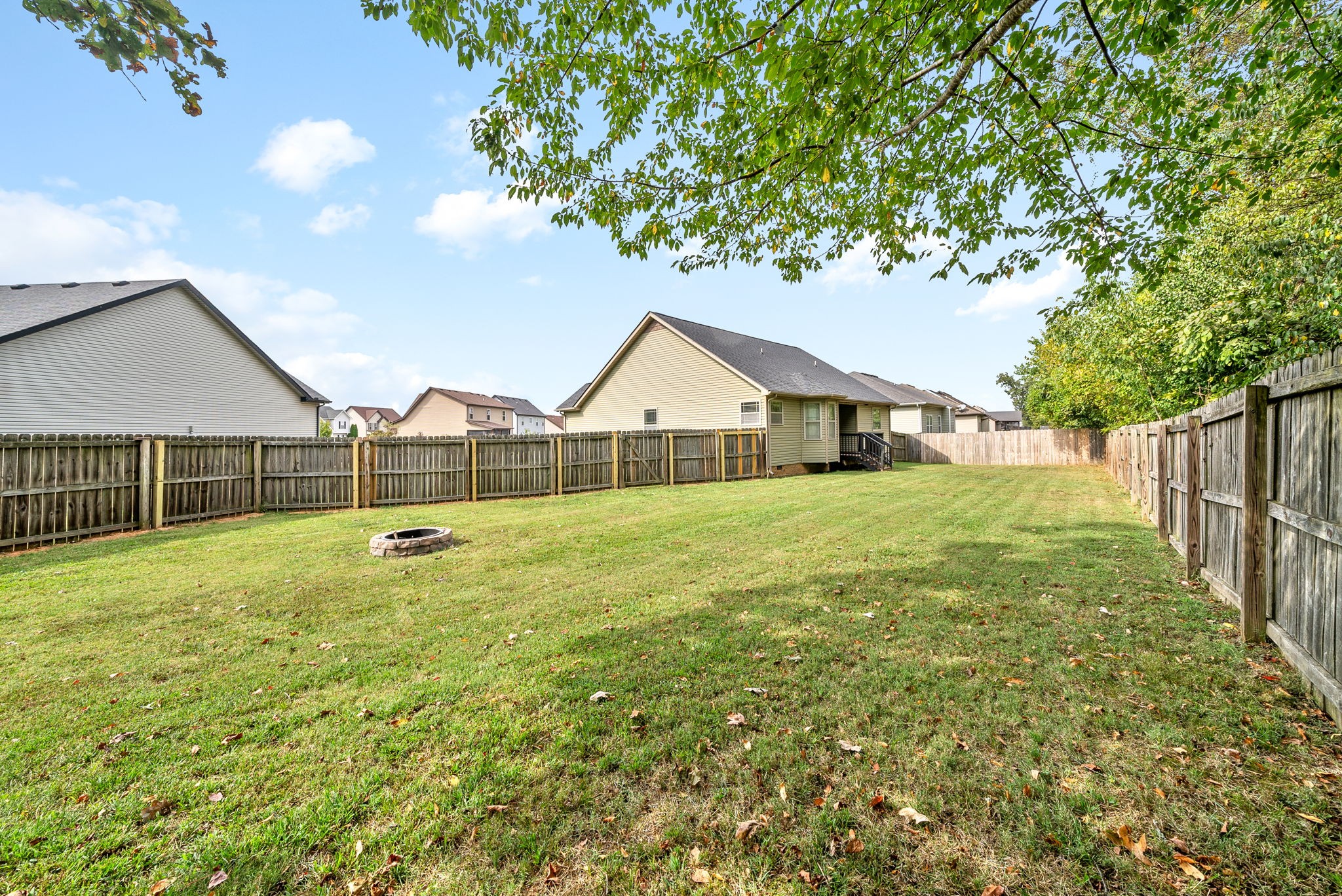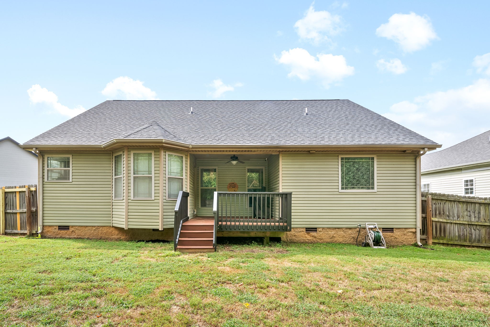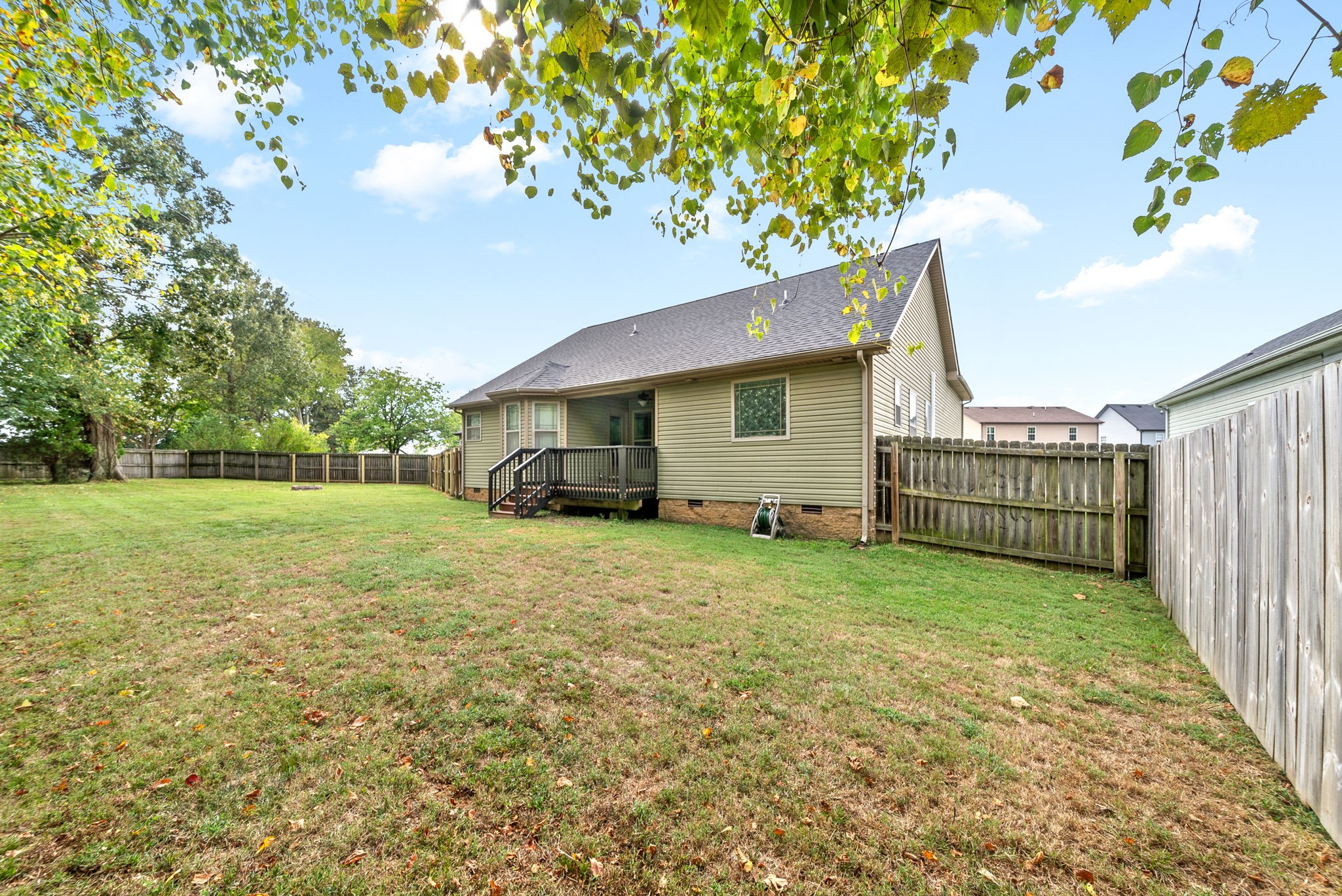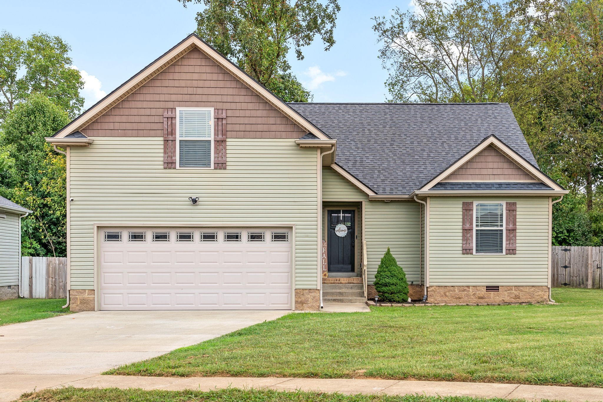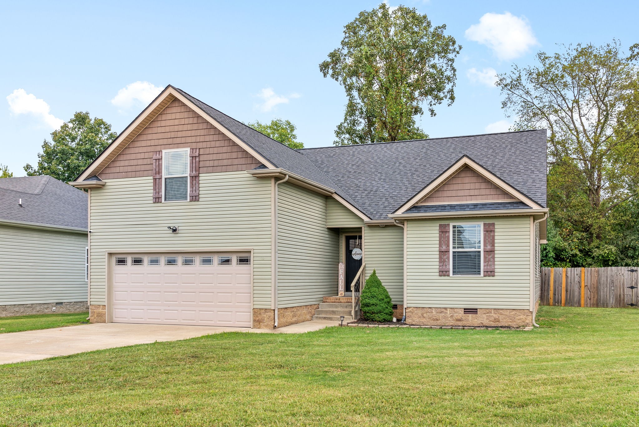 This charming home, free of HOA restrictions, offers a tree-lined backyard, a storm shelter in the 2-car garage, and easy access to both Fort Campbell and Nashville. Inside, you'll find 3 bedrooms, 2 full bathrooms, and just over 1,500 square feet of living space, including a bonus room and a spacious living area perfect for entertaining or relaxing. The open-concept kitchen boasts stainless steel appliances, ample counter space, and a cozy eat-in area. The primary bedroom is a retreat with vaulted ceilings, plenty of natural light, an en suite bath featuring a tiled walk-in shower, a jacuzzi tub, and two closets. The versatile bonus room can serve as a second living space, kids' playroom, or provide attic access. Outside, the fenced backyard offers a covered deck and ample space to create your own outdoor oasis. BRAND NEW roof + HVAC, also!