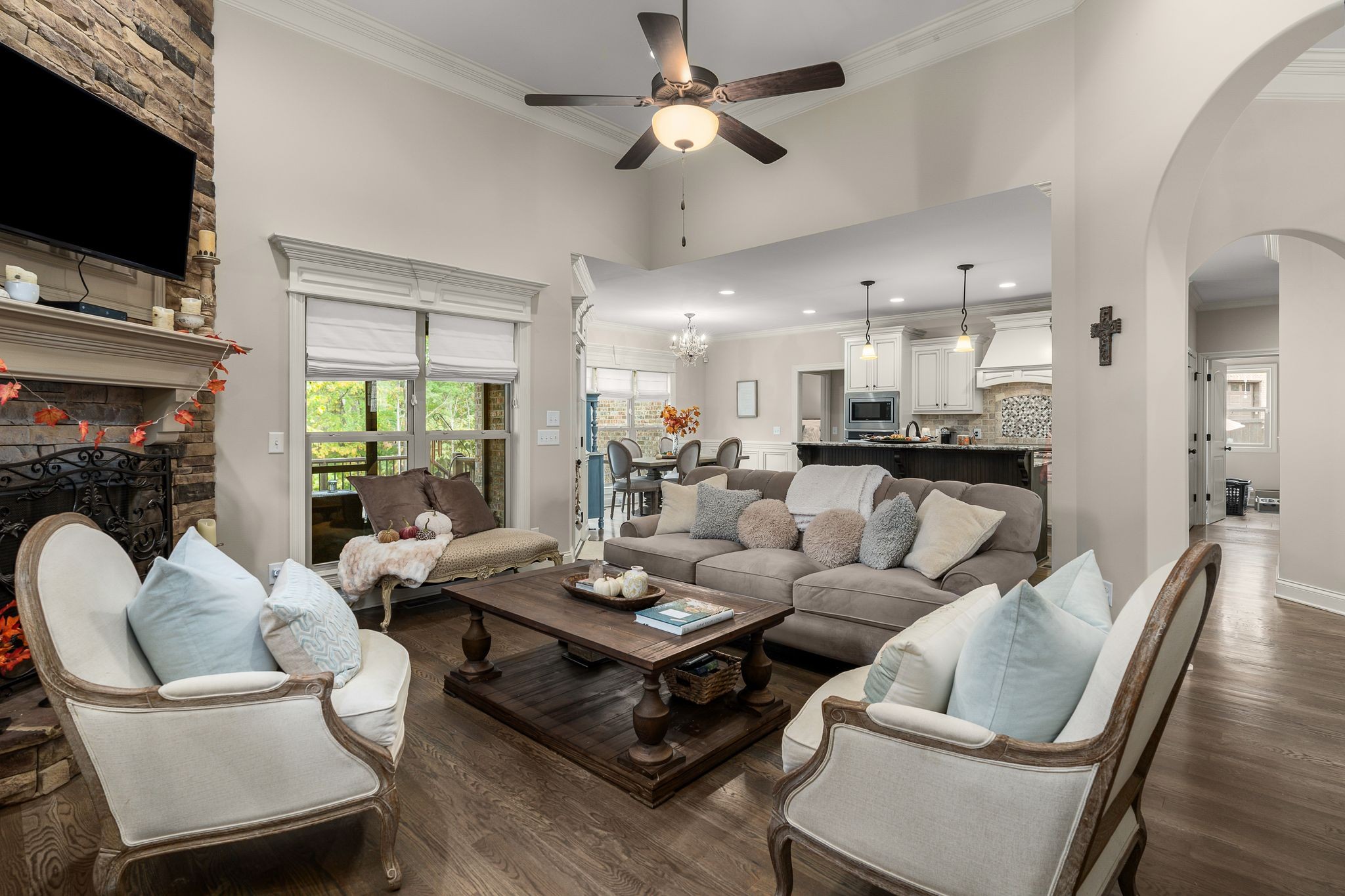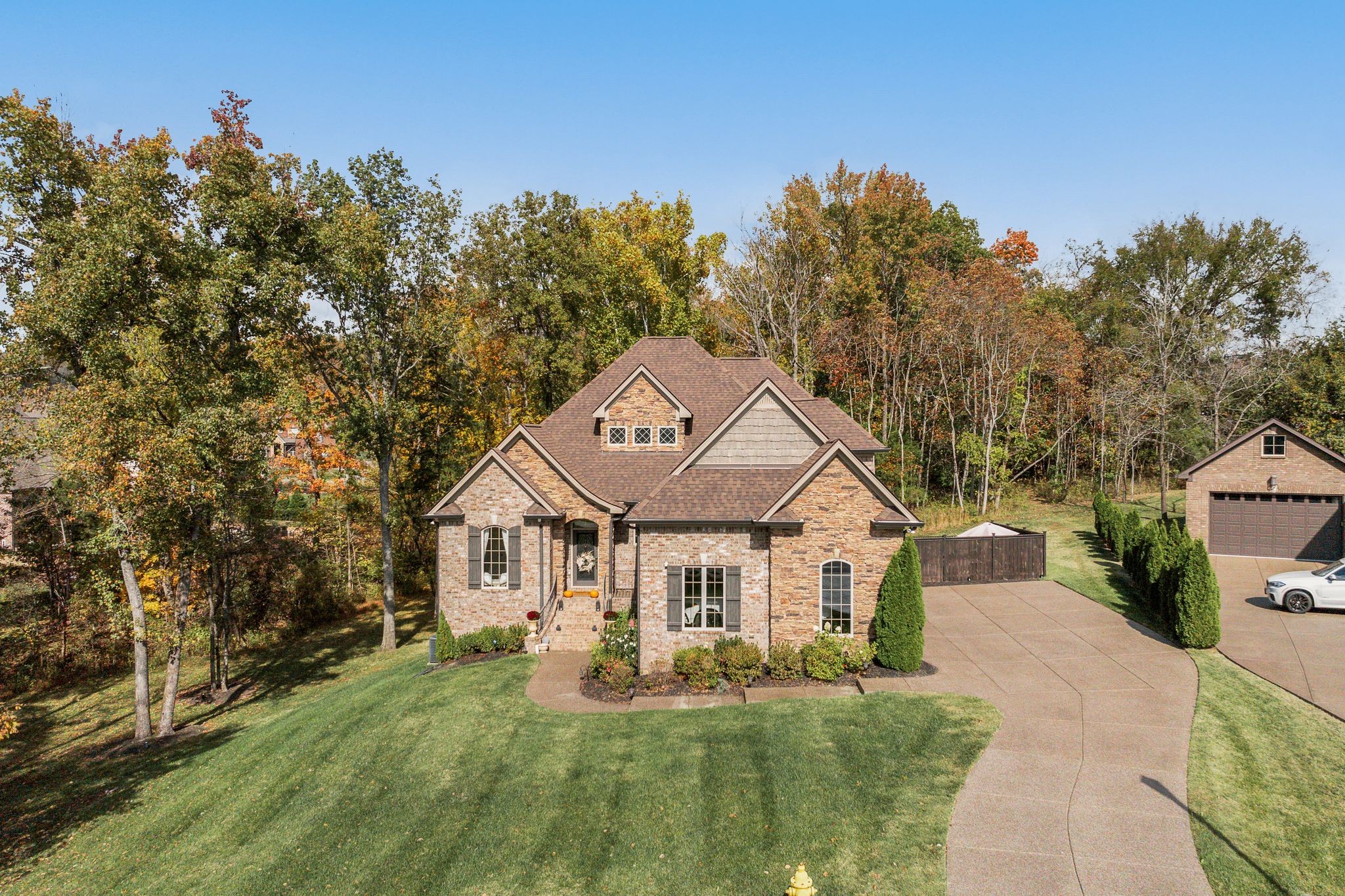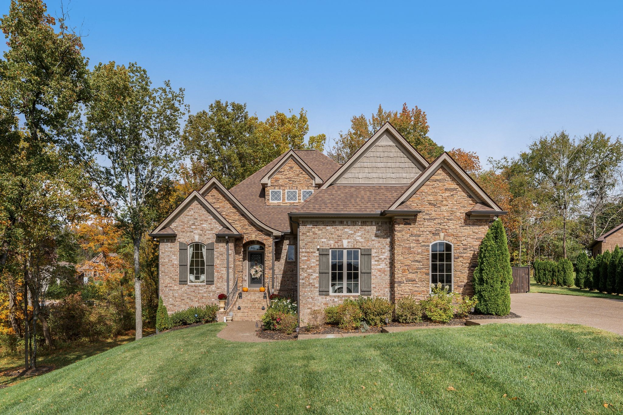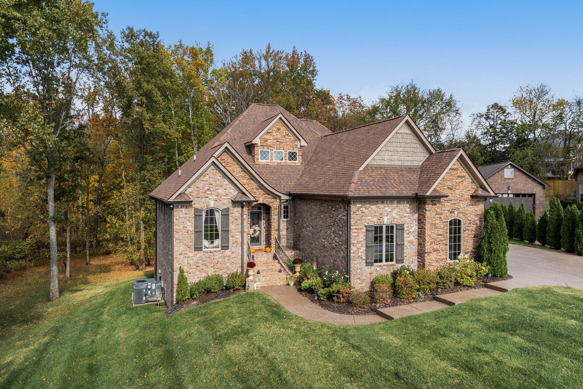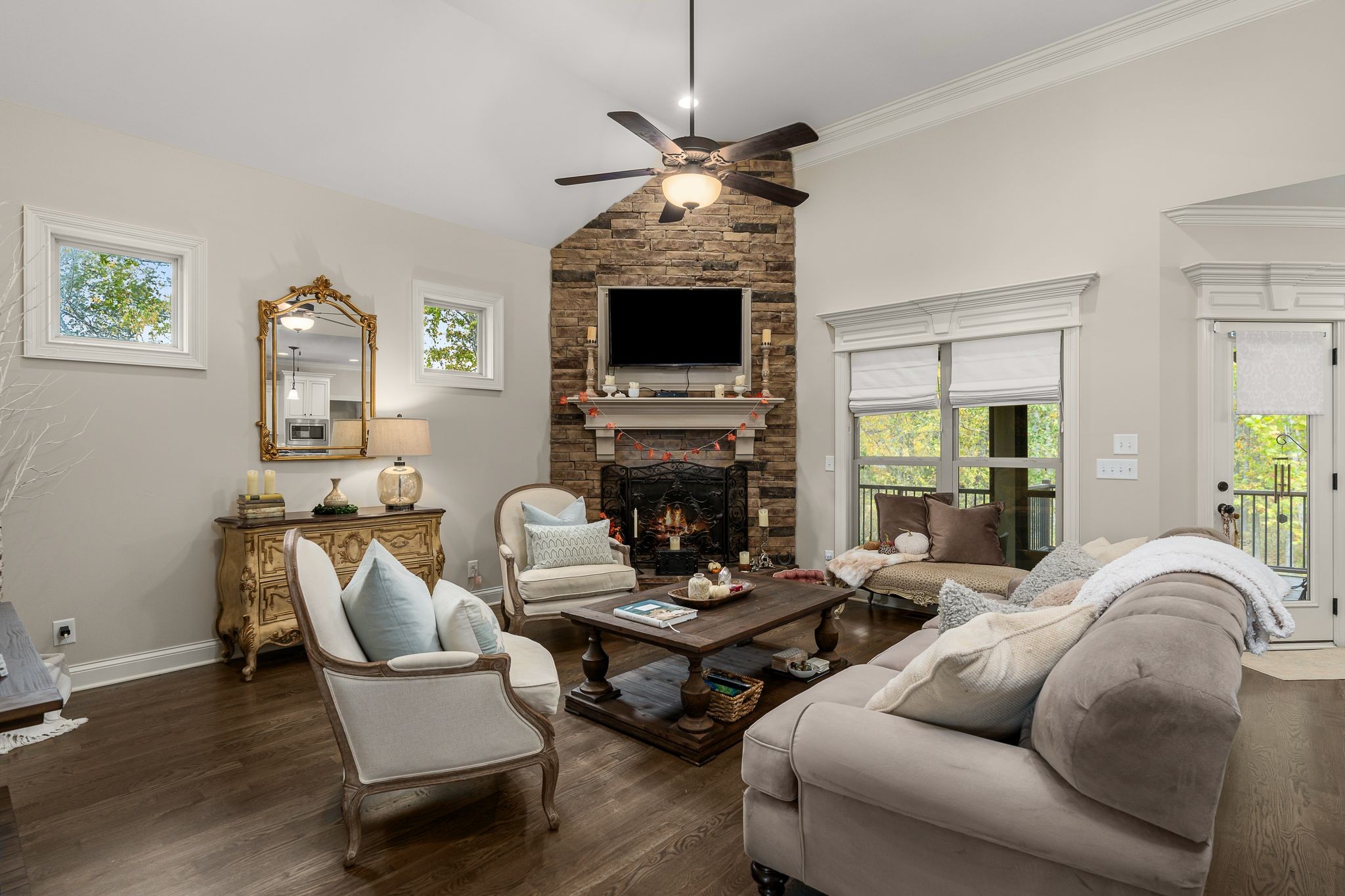 Don't miss this storybook home nestled on a private, wooded lot of nearly an acre, with a serene creek running through the property. This immaculate 4-bedroom, 2.5-bath residence has been thoughtfully updated with decorator-level finishes that lend a luxurious feel throughout. The main level boasts a spacious, open-concept layout, ideal for both entertaining and everyday living. The large kitchen serves as the heart of the home, featuring beautiful granite countertops, an island perfect for meal prep, and sleek cabinetry. Stainless steel appliances and abundant counter space make this kitchen as functional as it is stylish. Adjacent to the kitchen is a dining area that flows seamlessly into the living room, where a cozy gas-log stone fireplace adds warmth and ambiance. The main floor also includes the master suite, designed as a peaceful escape with ample natural light, and a luxurious en-suite bathroom with high-end finishes. An additional bedroom on the main level could serve as an office or guest room, adding flexibility to the home’s layout. Upstairs, you’ll find two spacious bedrooms that share a well-appointed bathroom, along with a media room that’s perfect for movie nights, gaming, or as a play area. A screened porch, open deck and open patio offers a tranquil retreat, allowing you to enjoy the surrounding nature in comfort. Outside, the beautifully landscaped, irrigated lawn extends to both the front and back of the property. For those who enjoy an active lifestyle, membership to the nearby Five Oaks Golf & Country Club offers access to golf, tennis, and pool amenities.