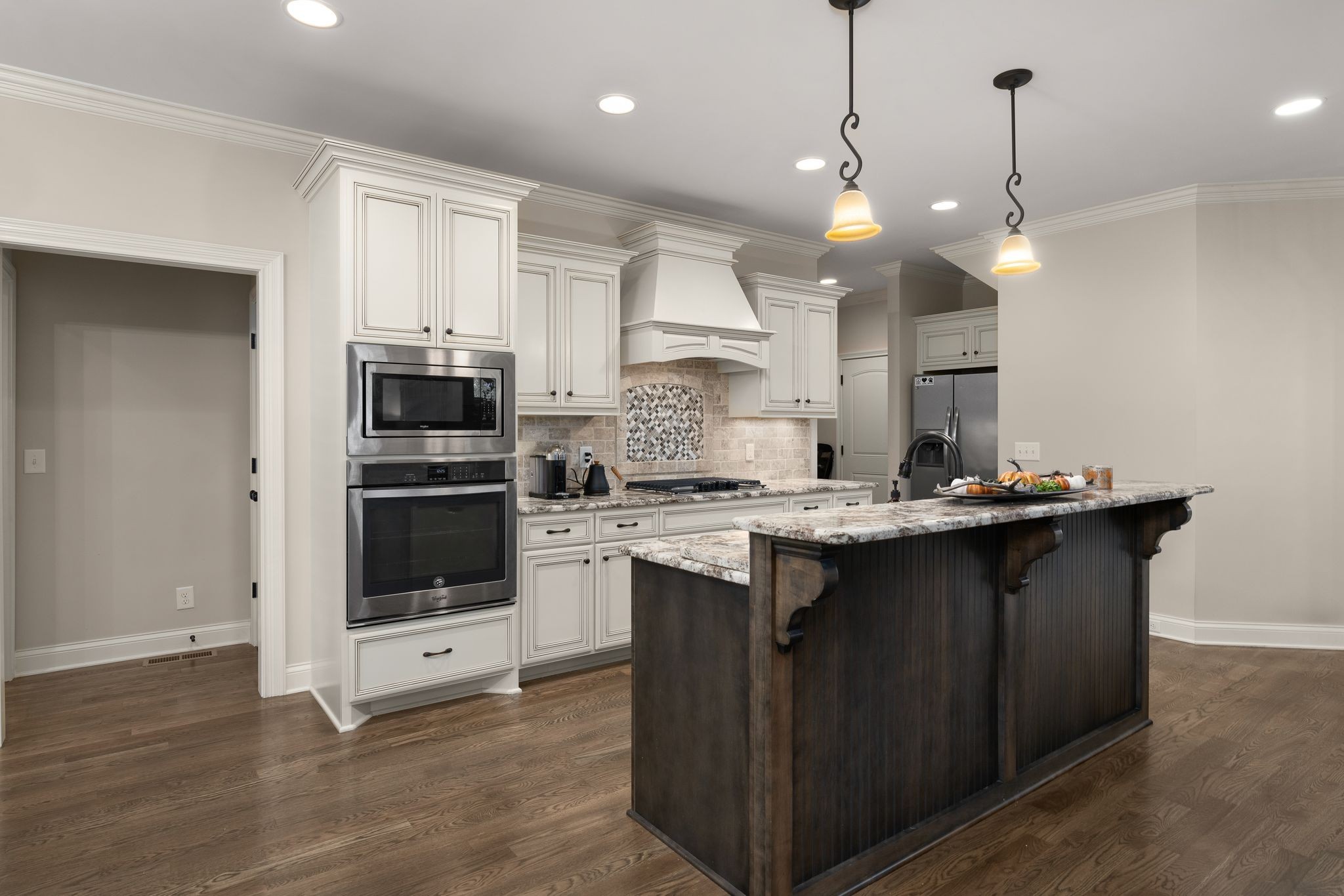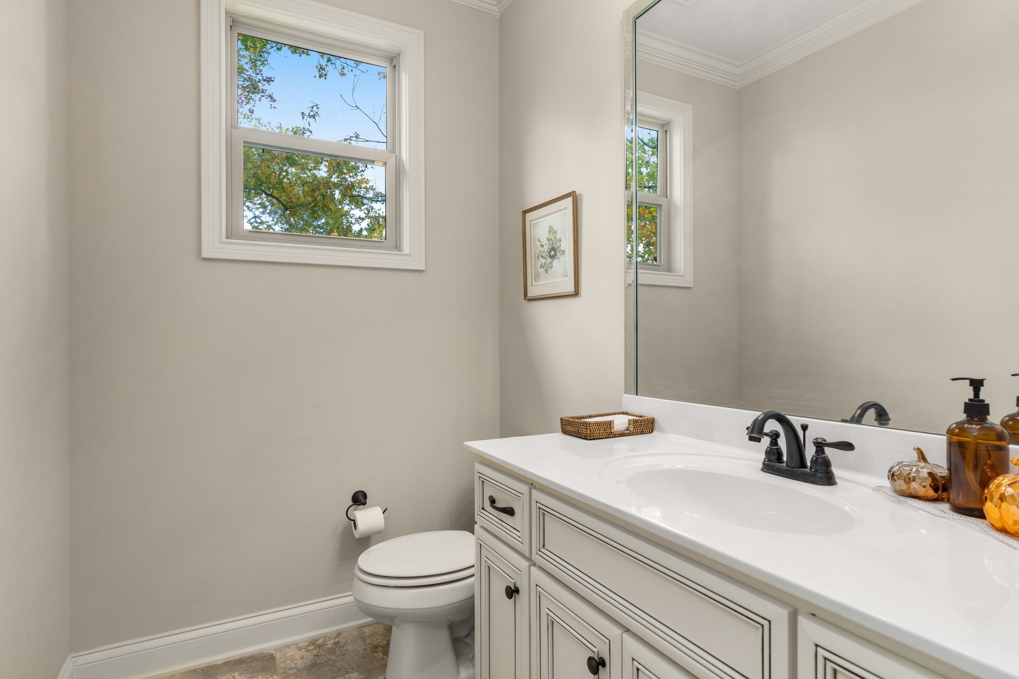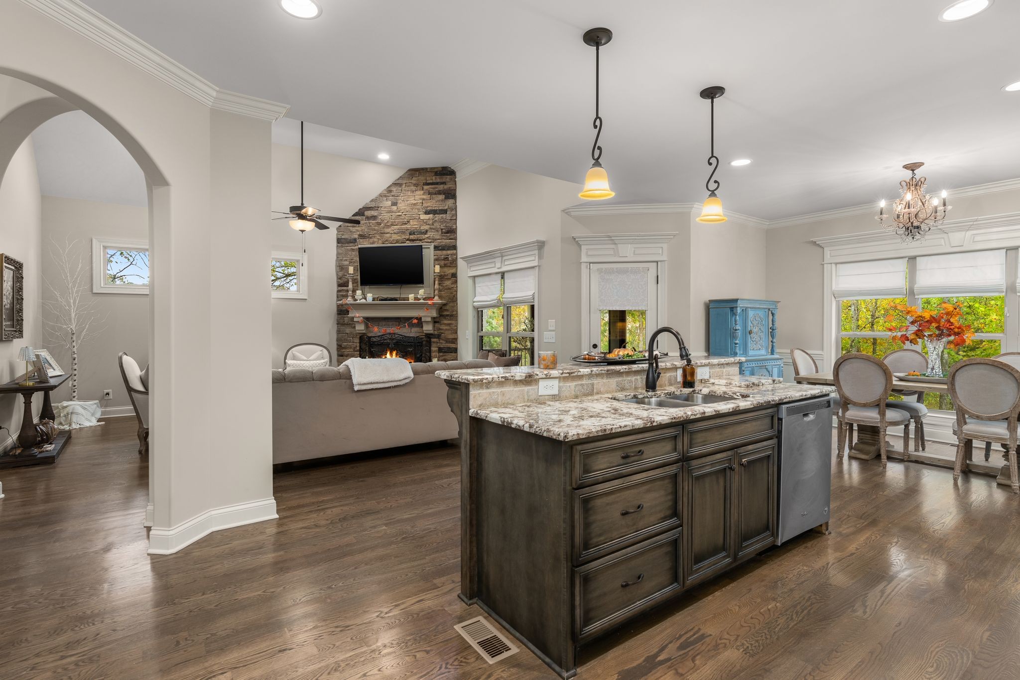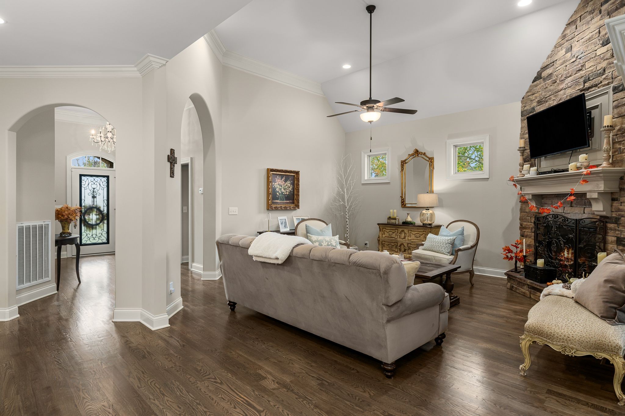 Don't miss this storybook home nestled on a private, wooded lot of nearly an acre, with a serene creek running through the property. This immaculate 4-bedroom, 2.5-bath residence has been thoughtfully updated with decorator-level finishes that lend a luxurious feel throughout. The main level boasts a spacious, open-concept layout, ideal for both entertaining and everyday living. The large kitchen serves as the heart of the home, featuring beautiful granite countertops, an island perfect for meal prep, and sleek cabinetry. Stainless steel appliances and abundant counter space make this kitchen as functional as it is stylish. Adjacent to the kitchen is a dining area that flows seamlessly into the living room, where a cozy gas-log stone fireplace adds warmth and ambiance. The main floor also includes the master suite, designed as a peaceful escape with ample natural light, and a luxurious en-suite bathroom with high-end finishes. An additional bedroom on the main level could serve as an office or guest room, adding flexibility to the home’s layout. Upstairs, you’ll find two spacious bedrooms that share a well-appointed bathroom, along with a media room that’s perfect for movie nights, gaming, or as a play area. A screened porch, open deck and open patio offers a tranquil retreat, allowing you to enjoy the surrounding nature in comfort. Outside, the beautifully landscaped, irrigated lawn extends to both the front and back of the property. For those who enjoy an active lifestyle, membership to the nearby Five Oaks Golf & Country Club offers access to golf, tennis, and pool amenities.