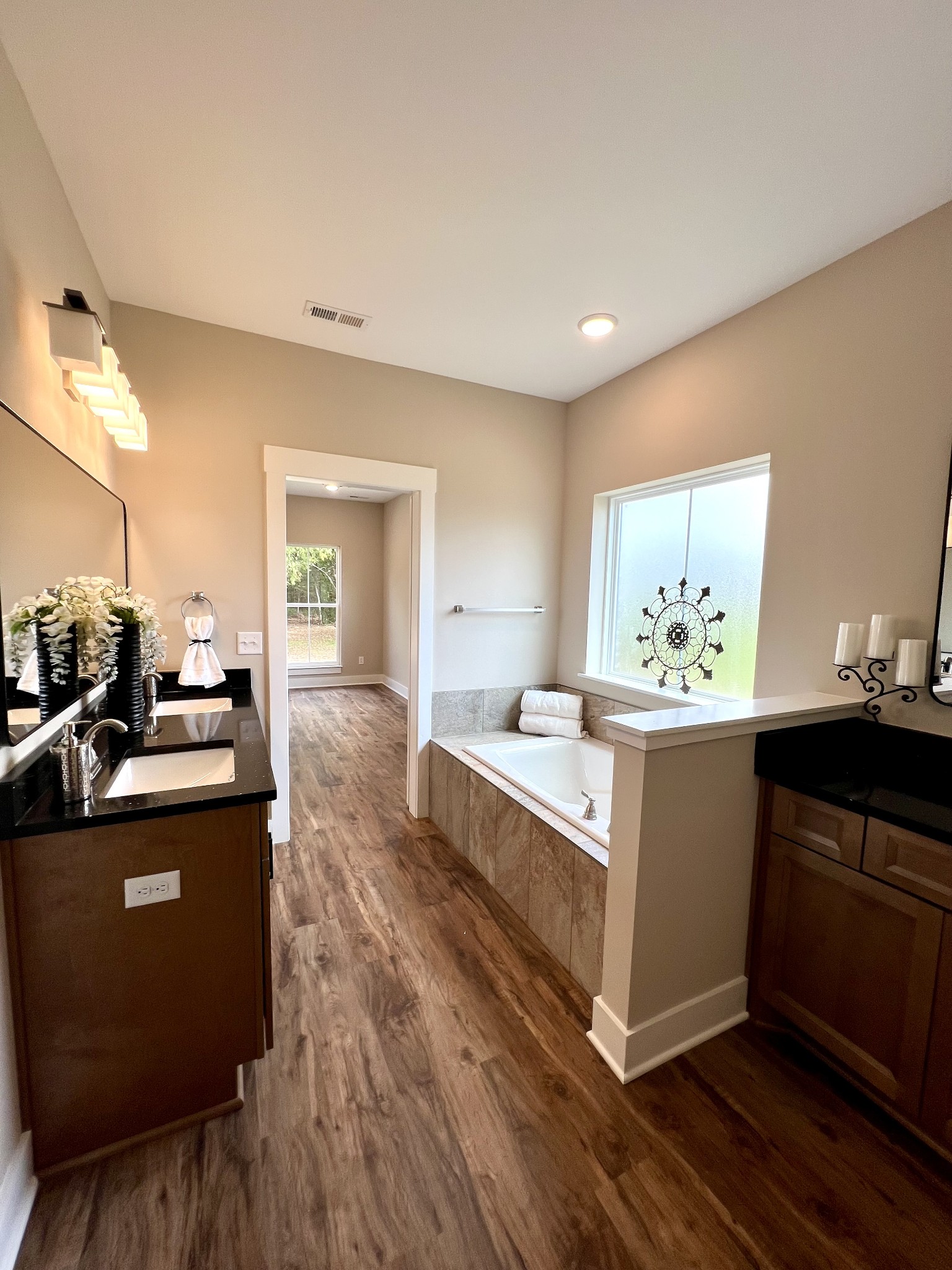 Discover refined comfort and timeless design in this beautifully appointed home nestled on a private 2.38-acre wooded lot. The main level features a luxurious primary suite complete with a spa-inspired bathroom offering a tiled walk-in shower, separate soaking tub, and dual vanities. A second bedroom on the main floor includes its own full bath, ideal for guests or multigenerational living.