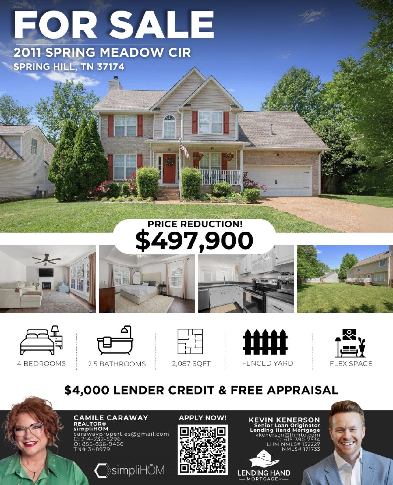 Sellers are moving for a job transfer so bring us an offer! Beautifully Updated Home in Prime Spring Hill Location with NO HOA! Welcome to 2011 Spring Meadow Circle — a spacious and completely refreshed 4-bedroom, 2.5-bath home offering 2,087 sq ft of stylish and functional living space. Step inside to find brand new hardwood flooring throughout, including the custom hardwood staircase, with fresh paint and new crown molding adding a crisp, modern feel to every room.