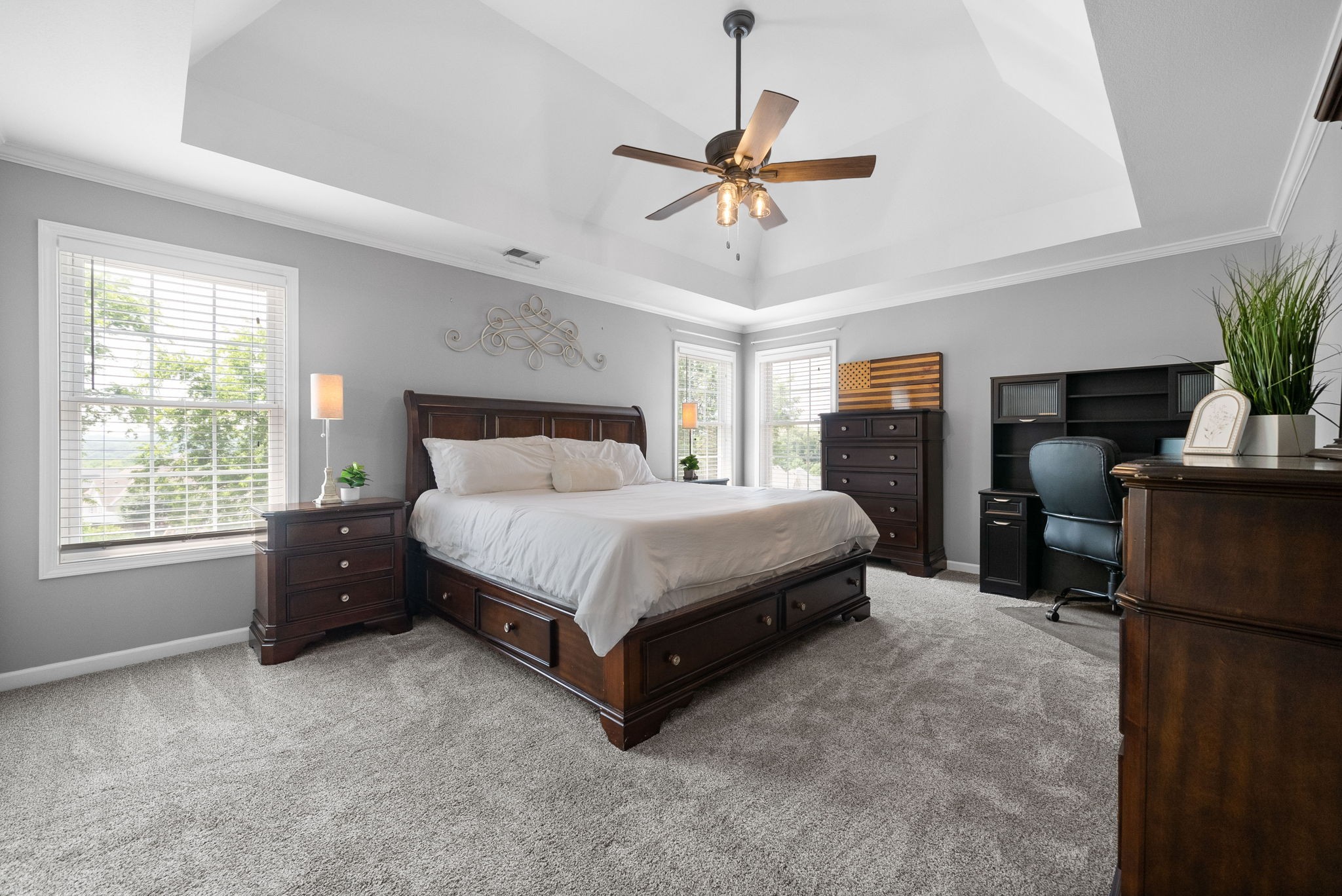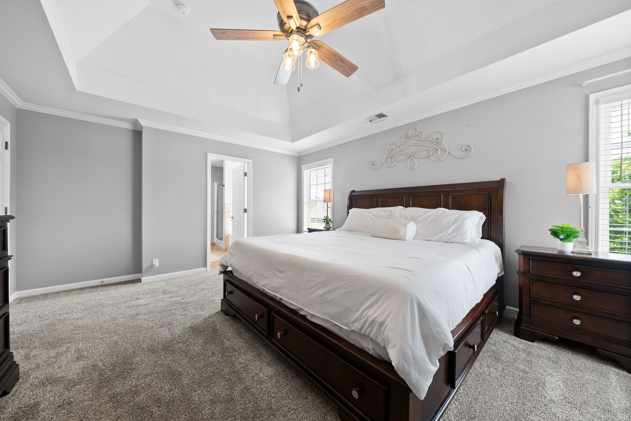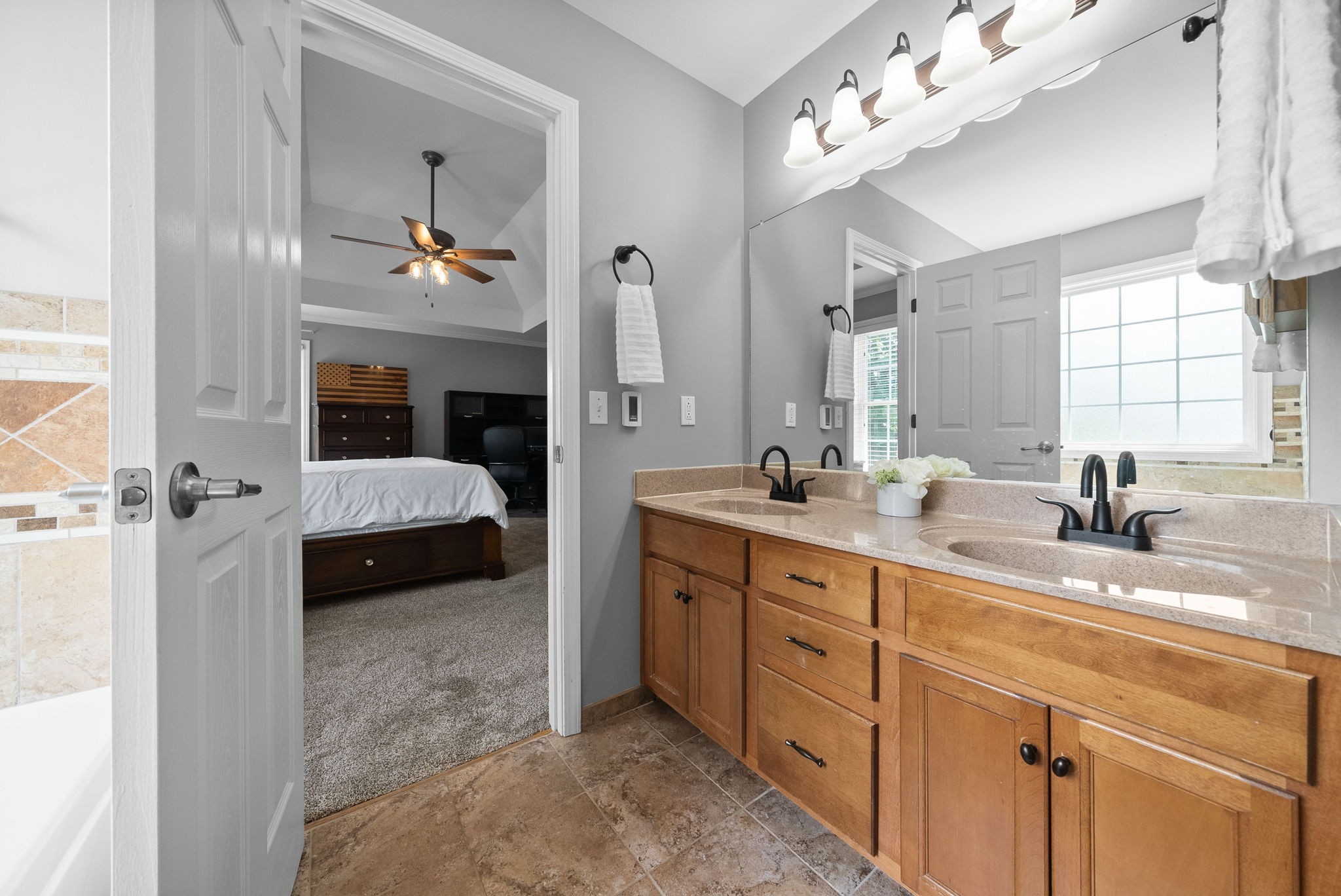 The spacious primary suite boasts elegant tray ceilings, a walk-in closet, double vanity sinks, a water closet, a relaxing jacuzzi tub, and luxurious heated tile floors. The oversized bonus room is an optional 5th bedroom.