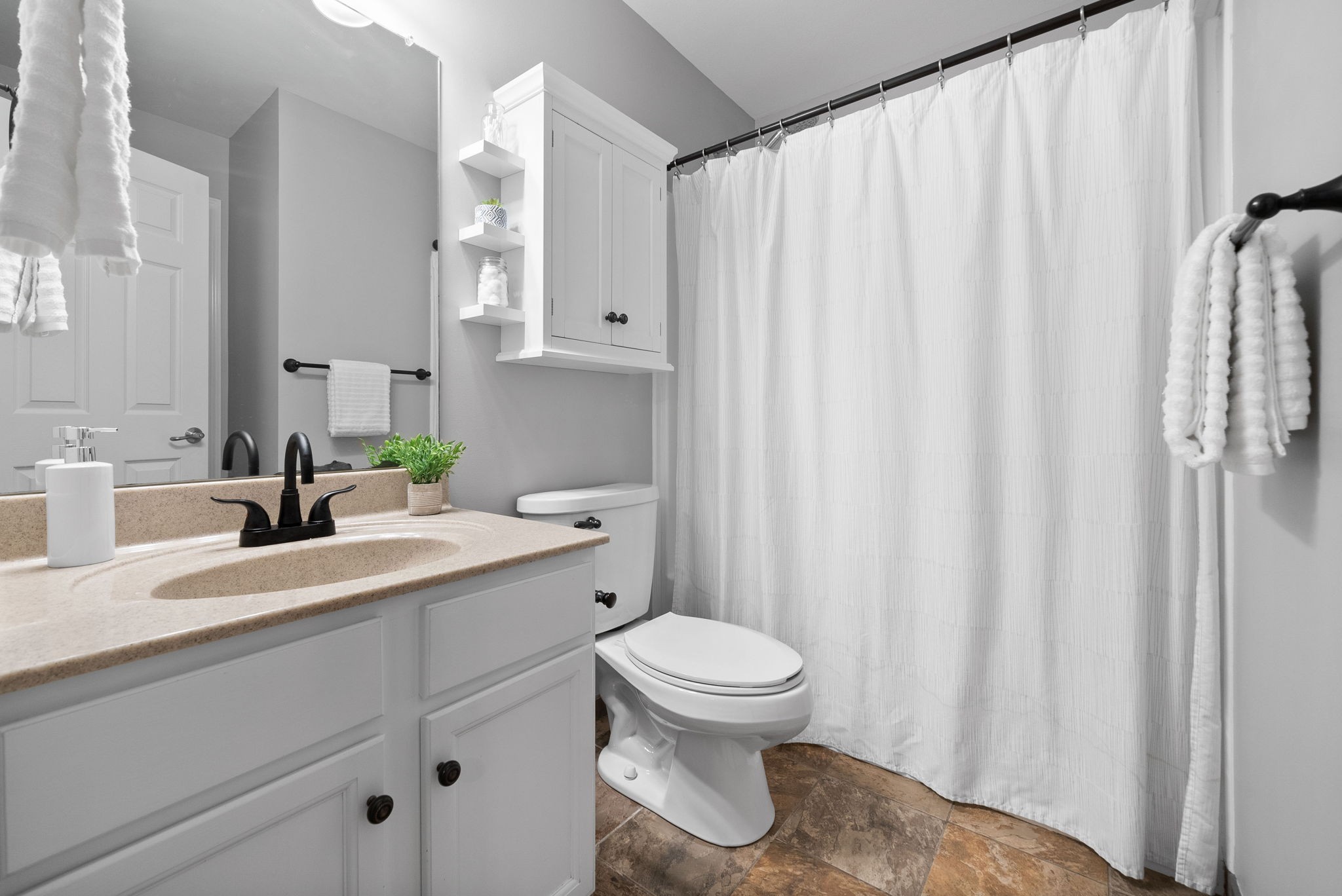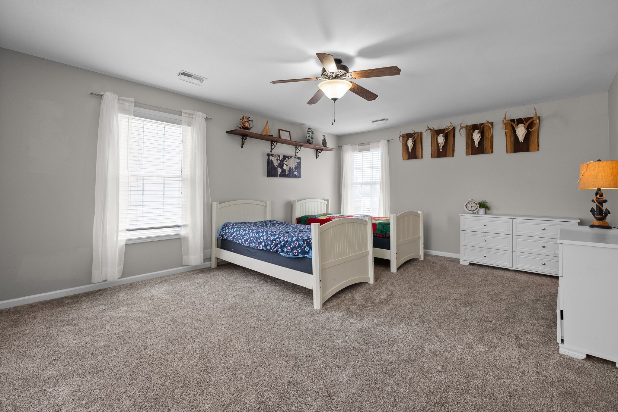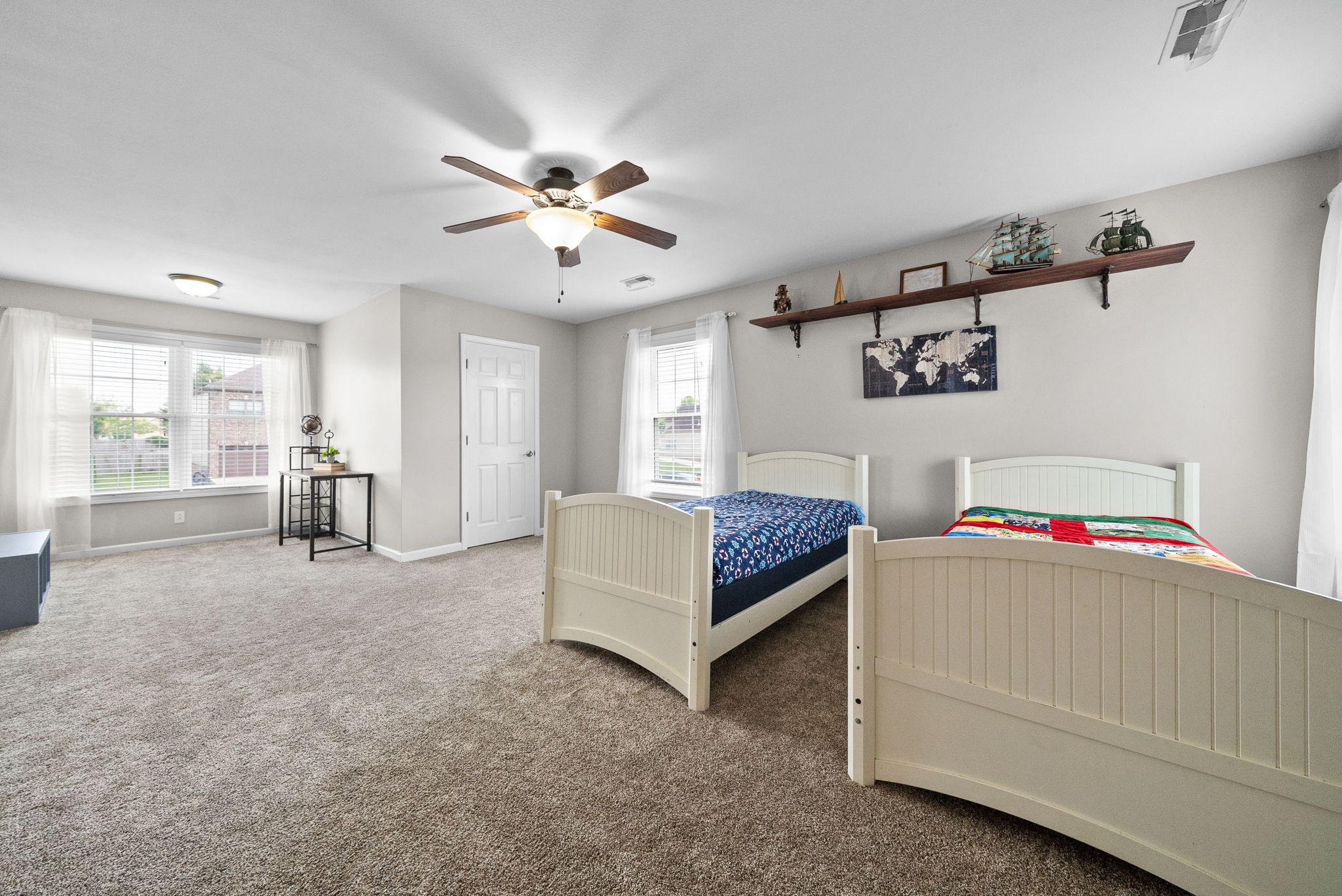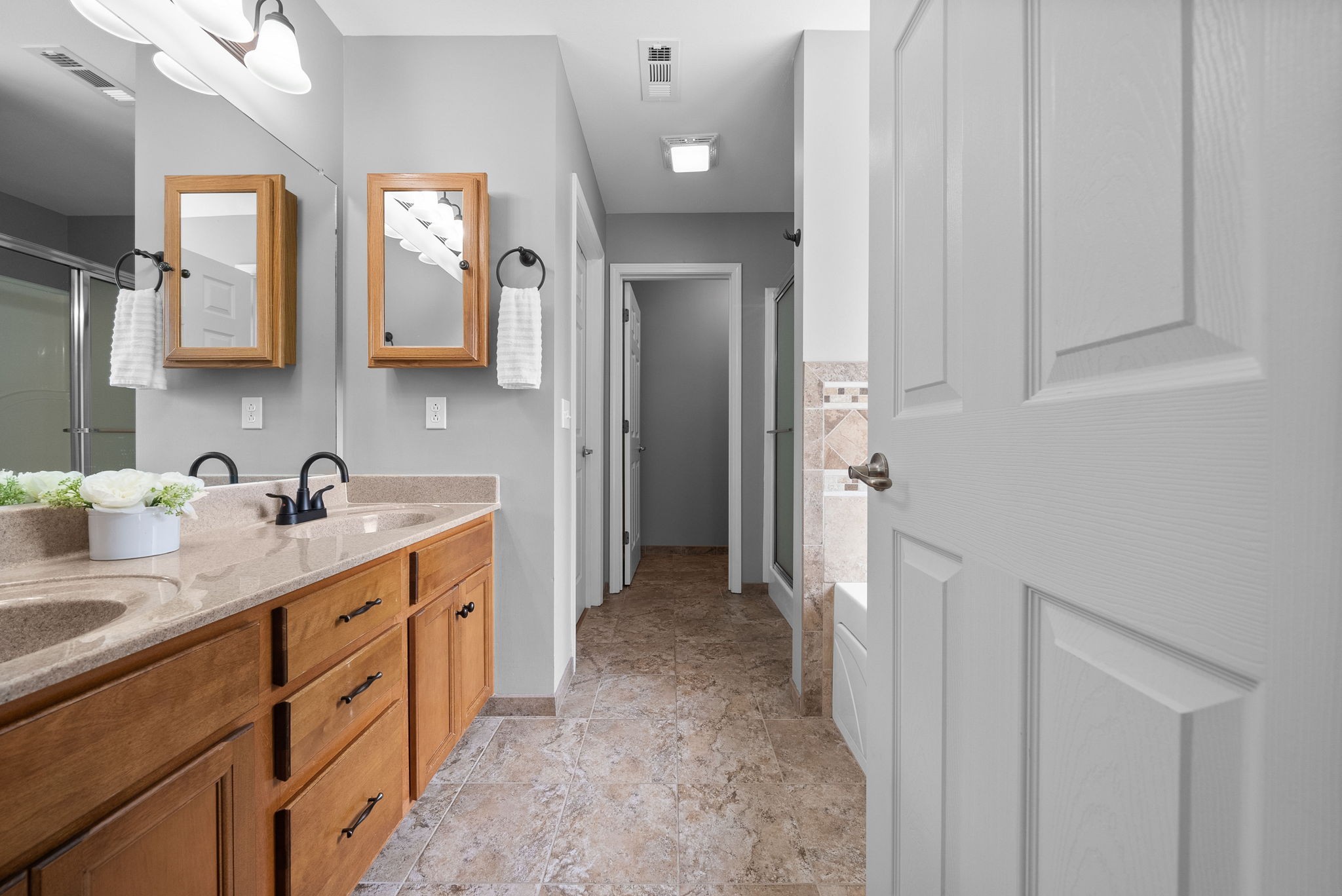 The spacious primary suite boasts elegant tray ceilings, a walk-in closet, double vanity sinks, a water closet, a relaxing jacuzzi tub, and luxurious heated tile floors. The oversized bonus room is an optional 5th bedroom.