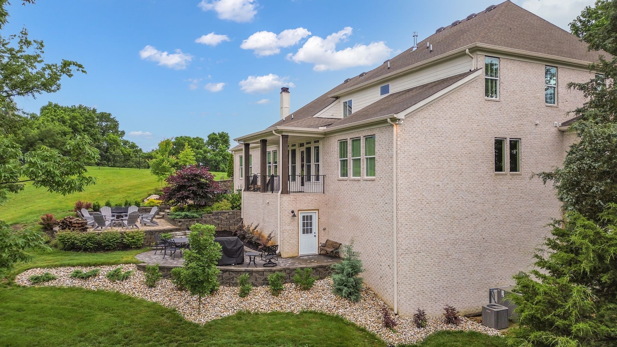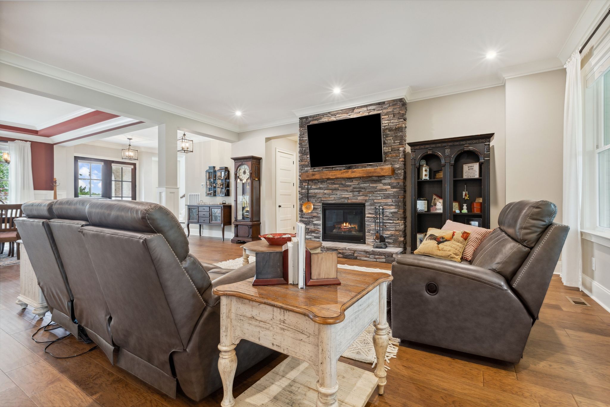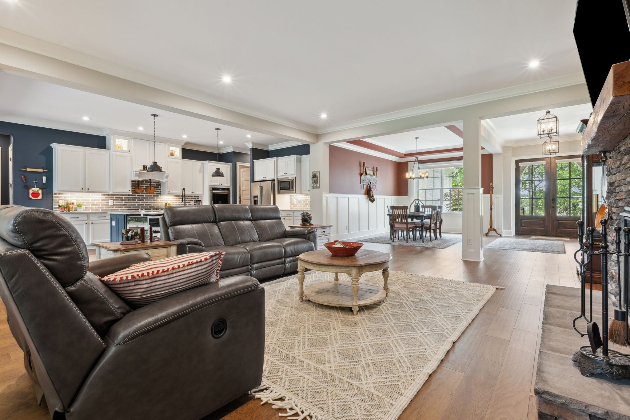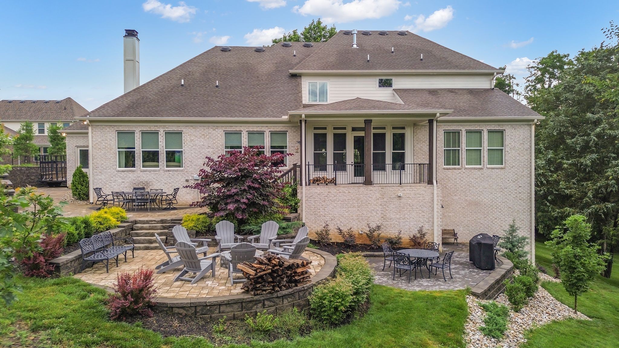 Designed with entertaining in mind, the stunning outdoor stone patio is ideal for morning sunrises and shaded, relaxing afternoons. Inside, you'll love the open-concept layout, including a cozy hearth room with a wood-burning fireplace and a gas fireplace in the main living area — perfect for creating a warm, inviting atmosphere year-round.