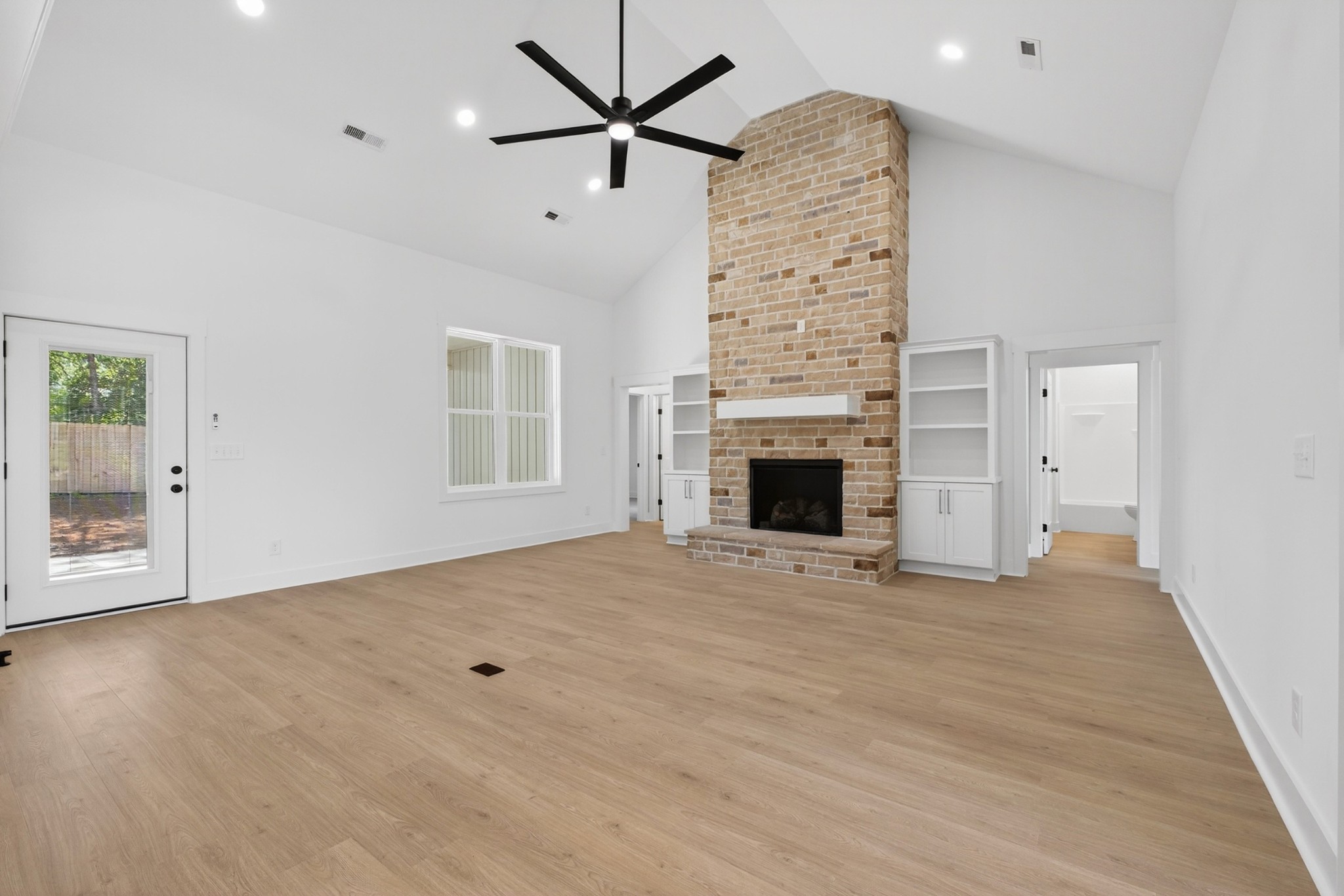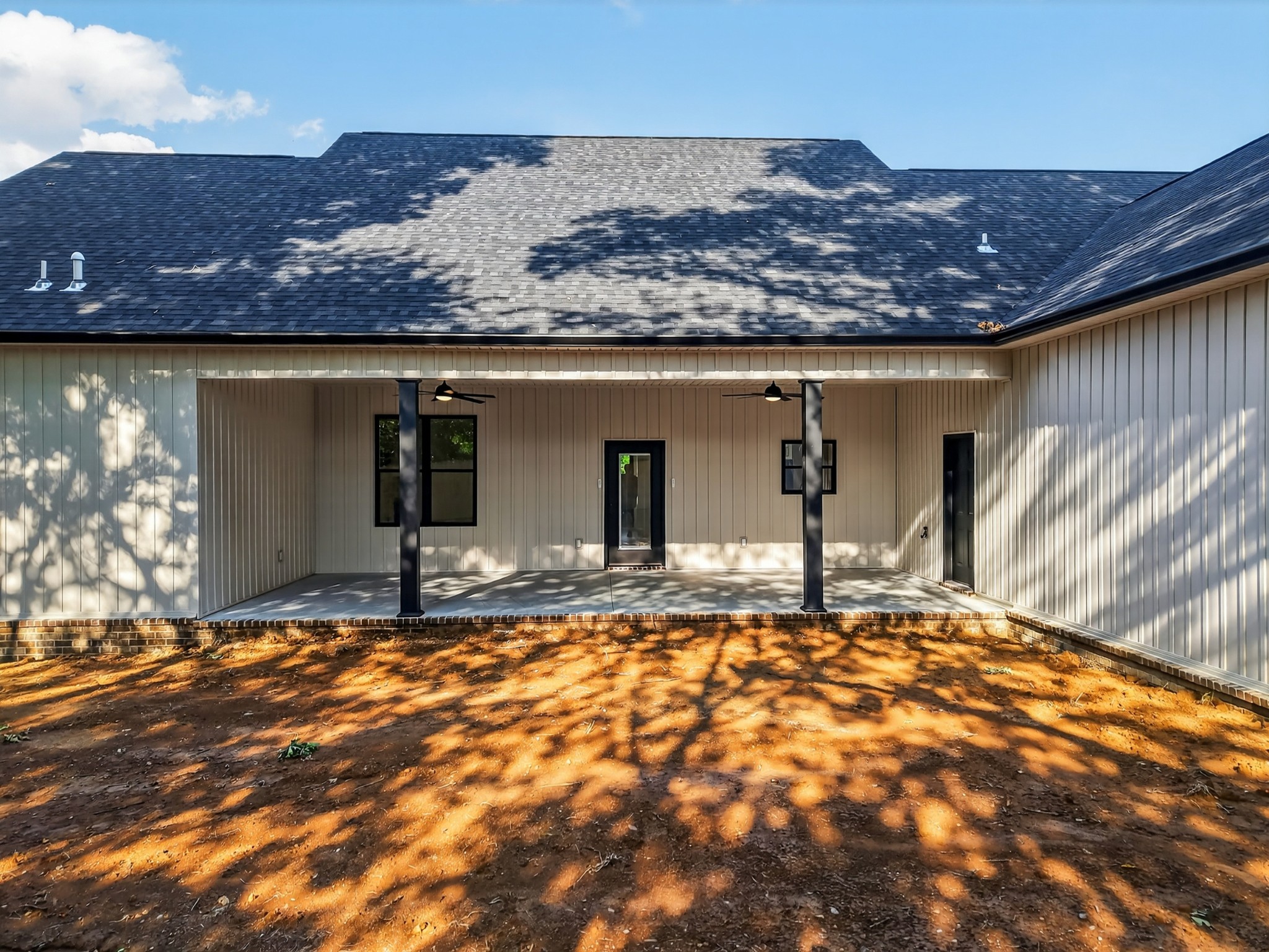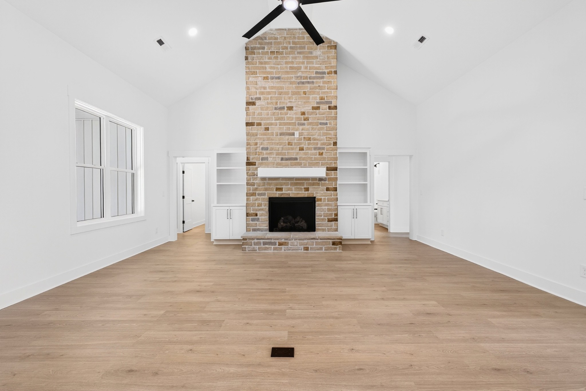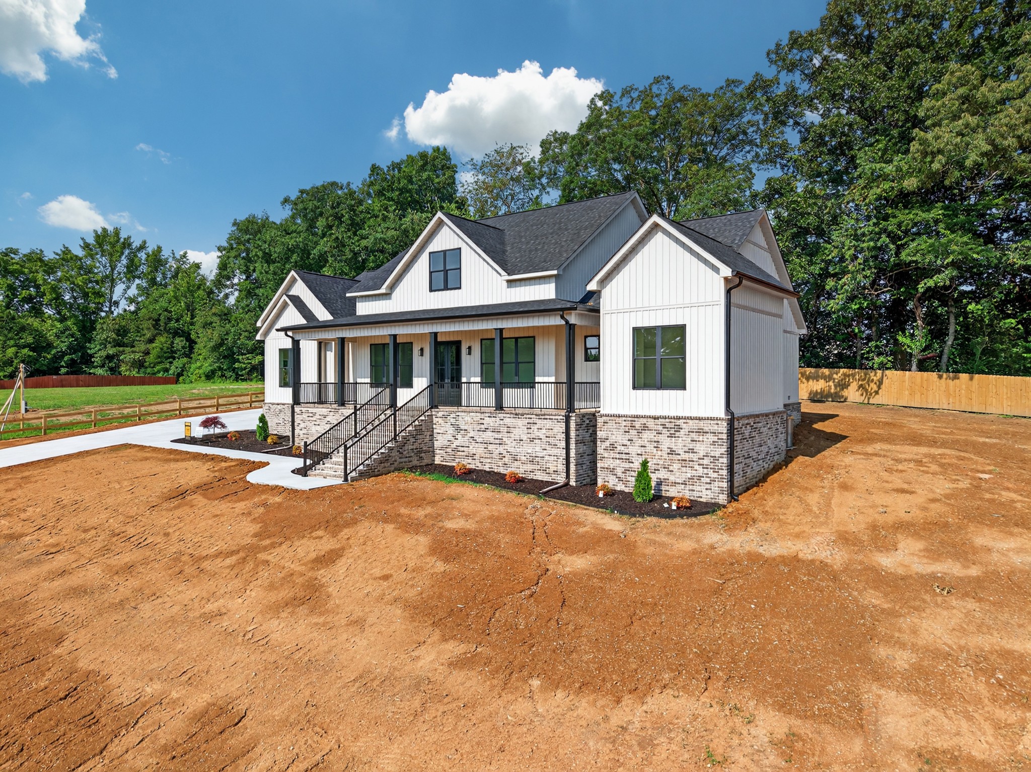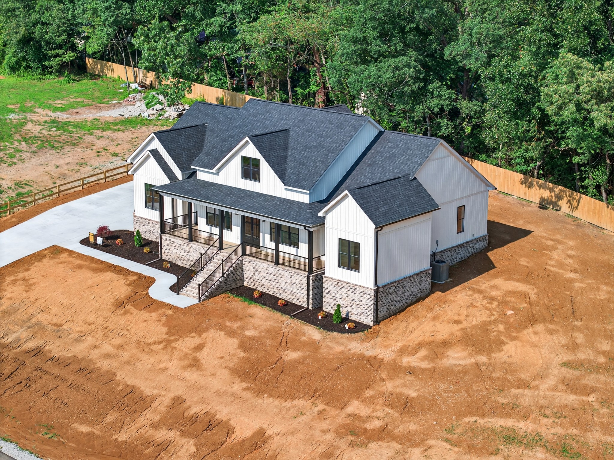 The living room features a built-in gas fireplace with striking stone surround - perfect for cozy nights in. Built for durability and comfort: 2x6 insulated exterior walls, well insulated, electric HVAC, gas tankless water heater, and a storm shelter in the garage. Exterior features include maintenance-free board and batten siding in Antique White, maintenance-free aluminum columns, and huge front porch for added Southern charm. The lawn comes fully seeded and landscaped—no upgrades needed.