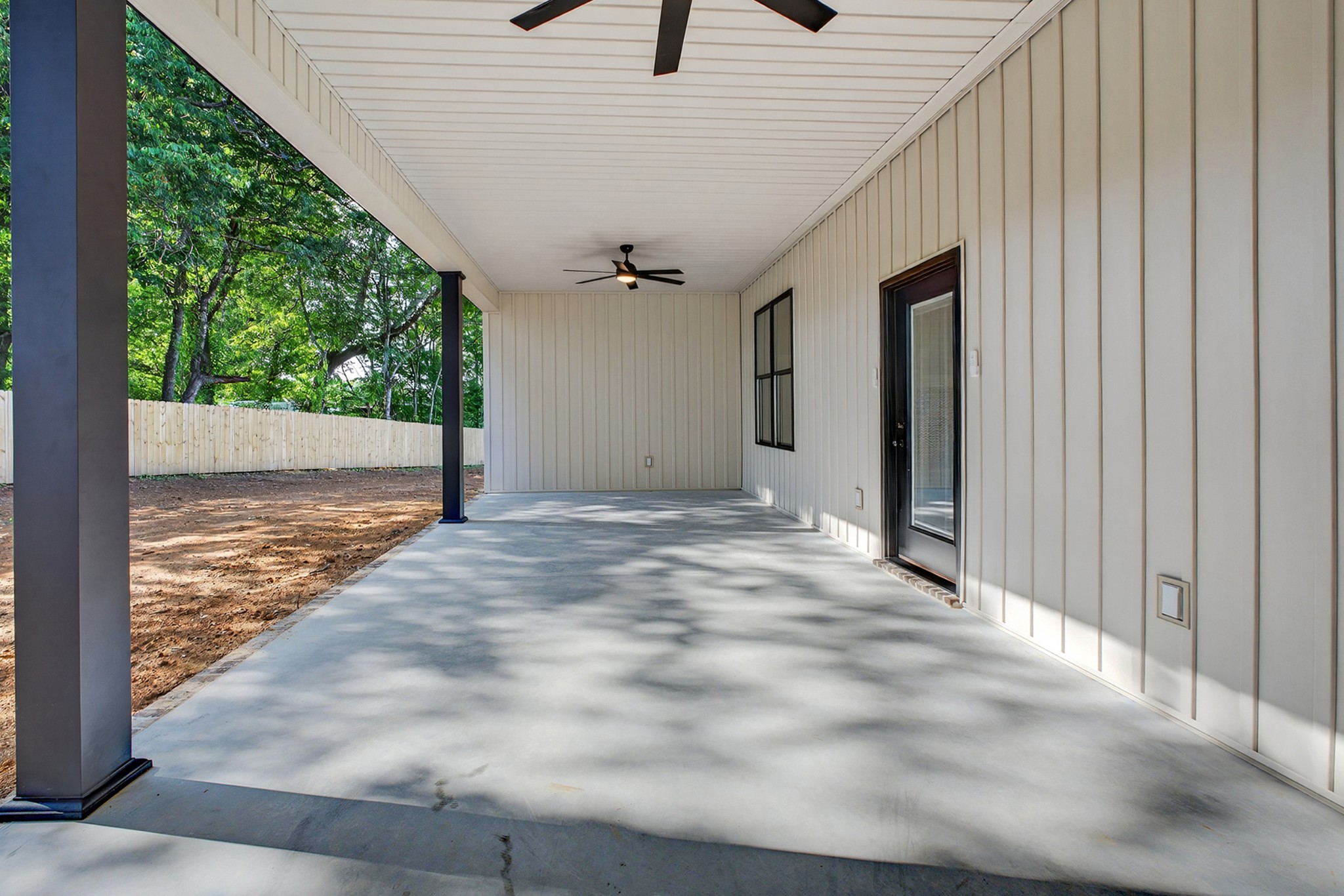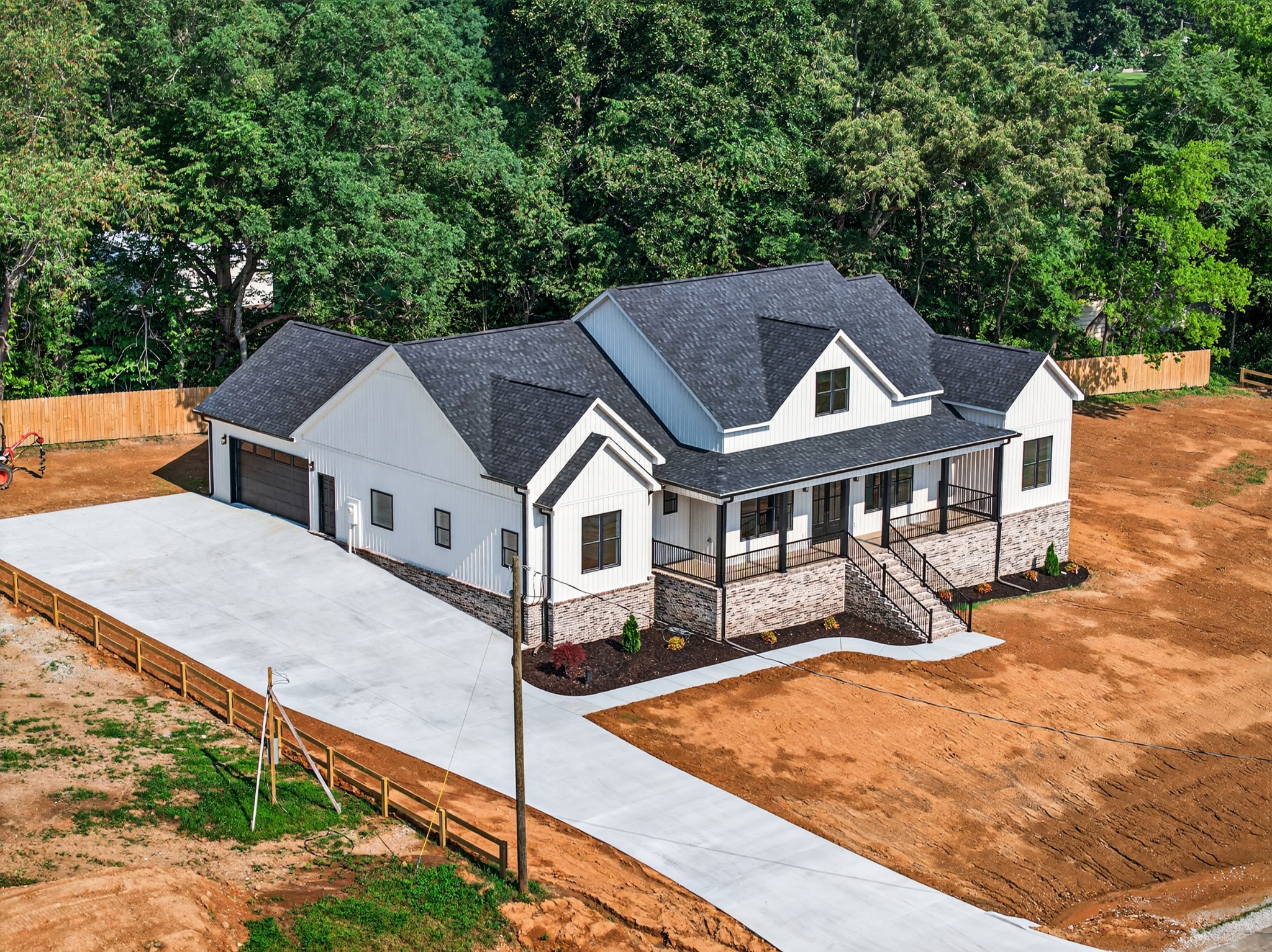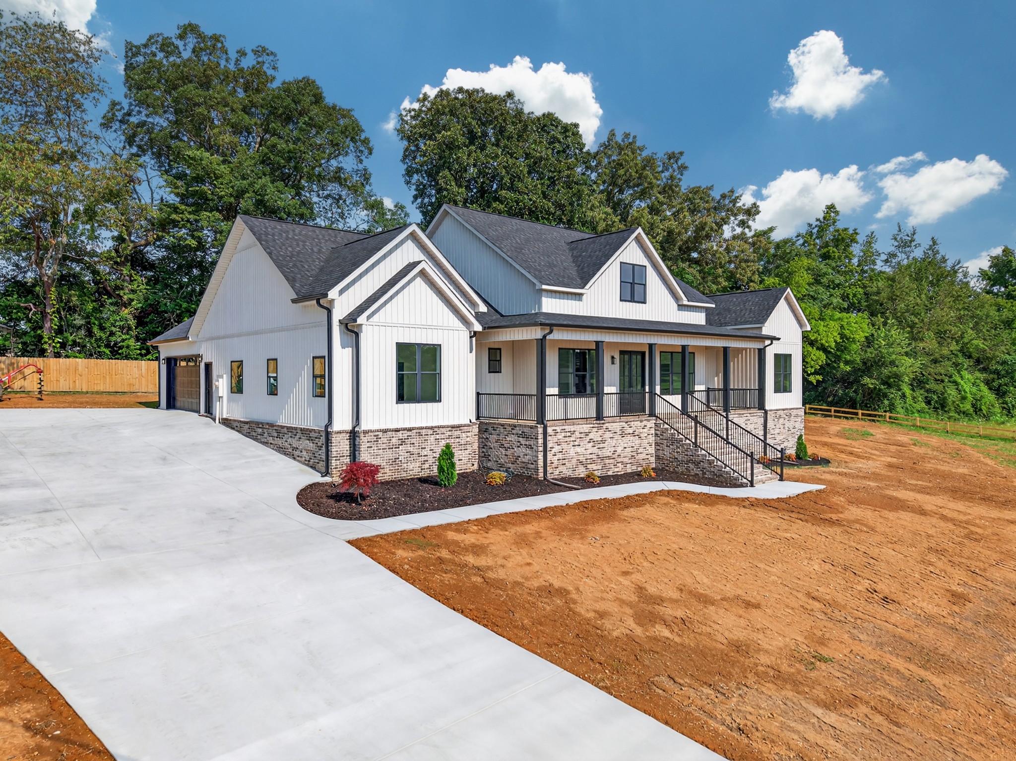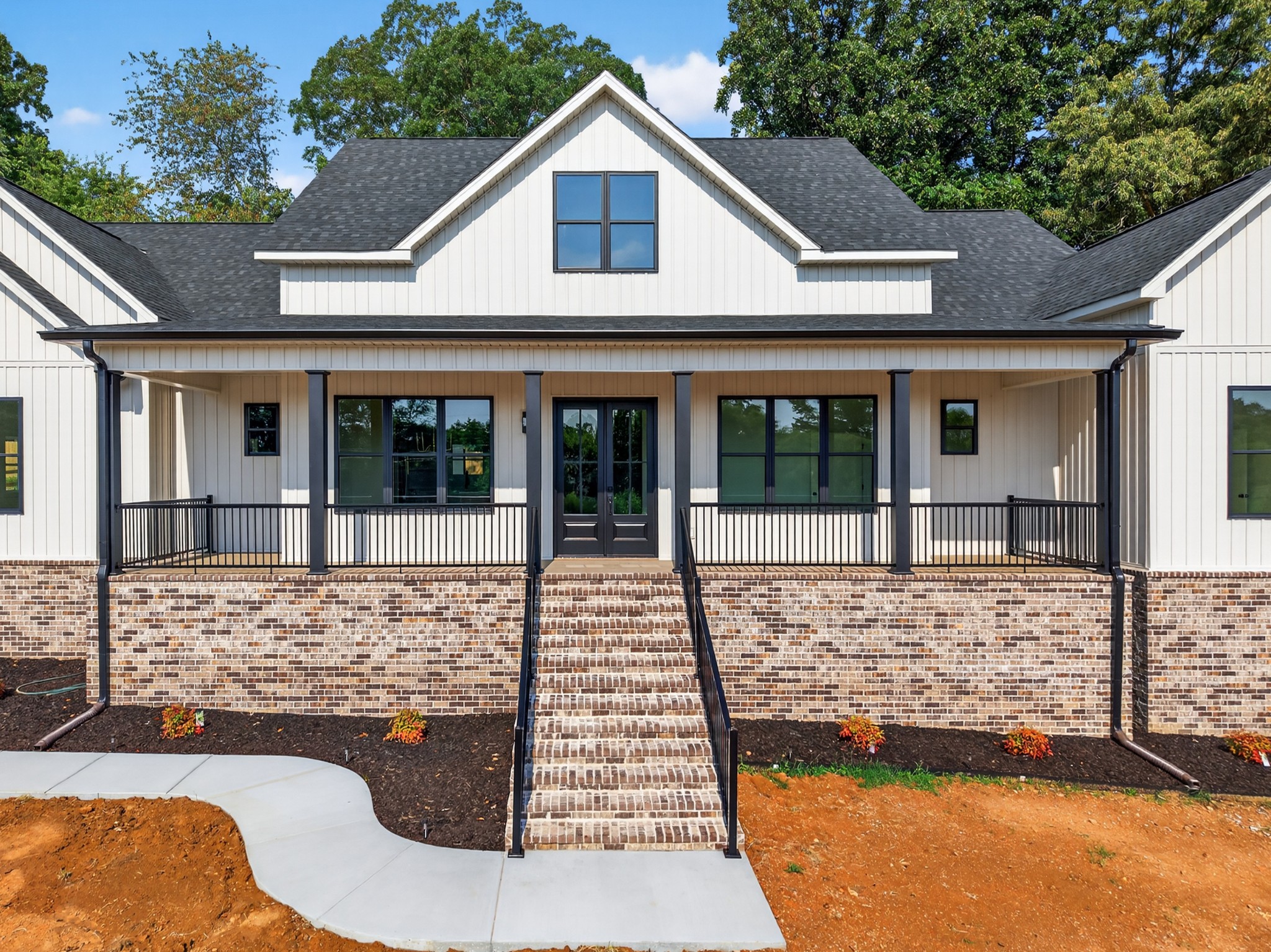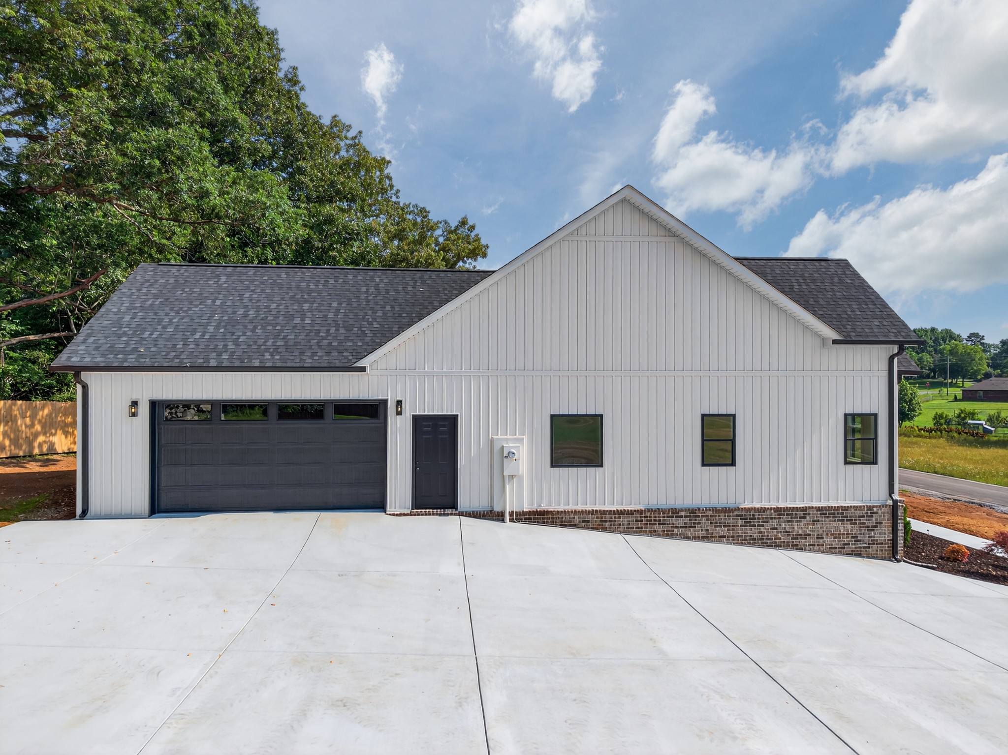 The living room features a built-in gas fireplace with striking stone surround - perfect for cozy nights in. Built for durability and comfort: 2x6 insulated exterior walls, well insulated, electric HVAC, gas tankless water heater, and a storm shelter in the garage. Exterior features include maintenance-free board and batten siding in Antique White, maintenance-free aluminum columns, and huge front porch for added Southern charm. The lawn comes fully seeded and landscaped—no upgrades needed.