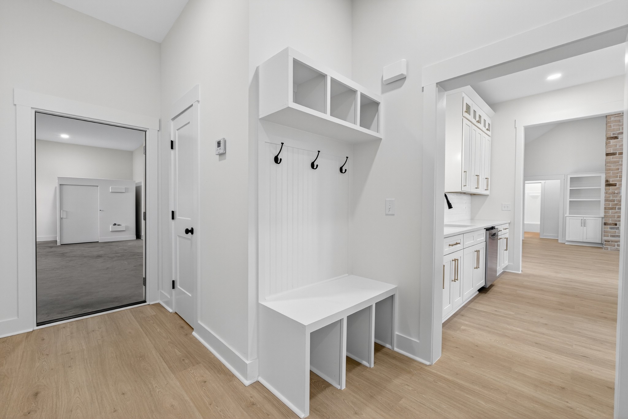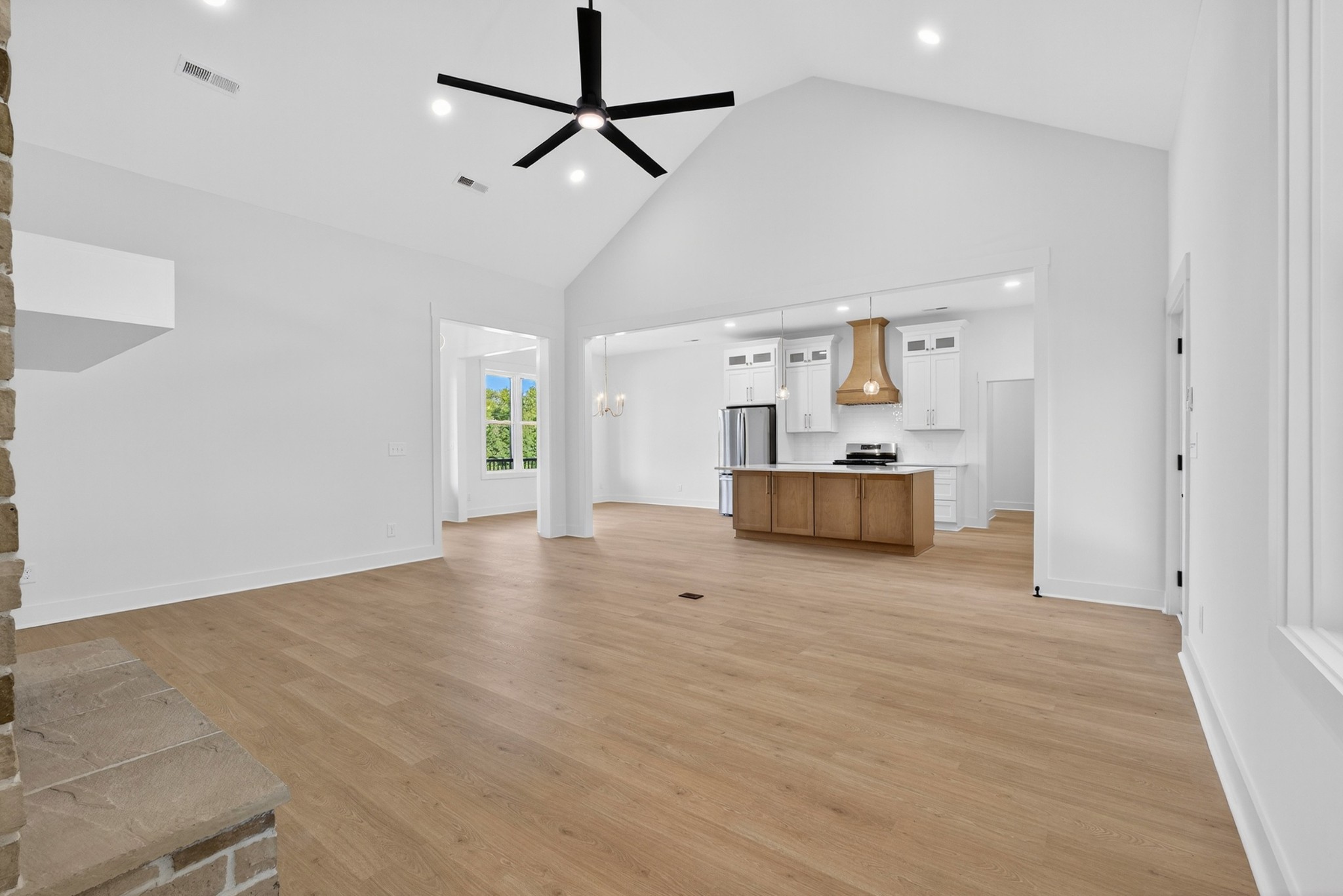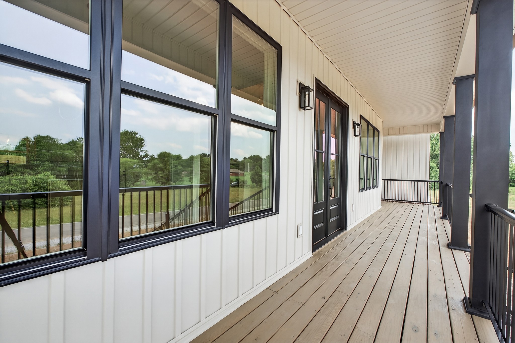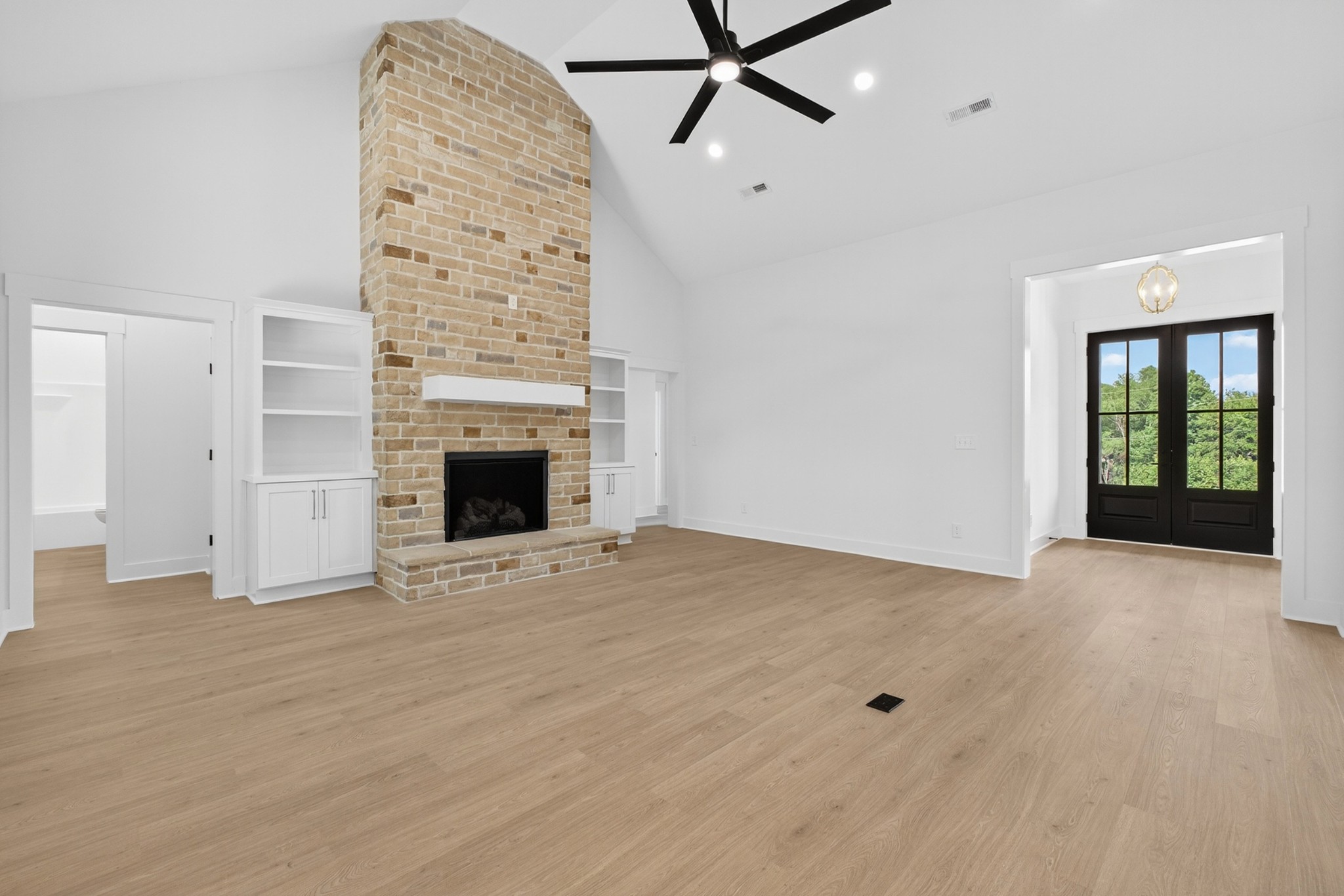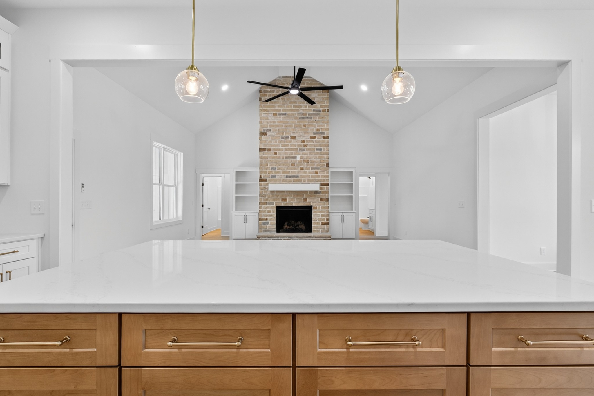 The living room features a built-in gas fireplace with striking stone surround - perfect for cozy nights in. Built for durability and comfort: 2x6 insulated exterior walls, well insulated, electric HVAC, gas tankless water heater, and a storm shelter in the garage. Exterior features include maintenance-free board and batten siding in Antique White, maintenance-free aluminum columns, and huge front porch for added Southern charm. The lawn comes fully seeded and landscaped—no upgrades needed.