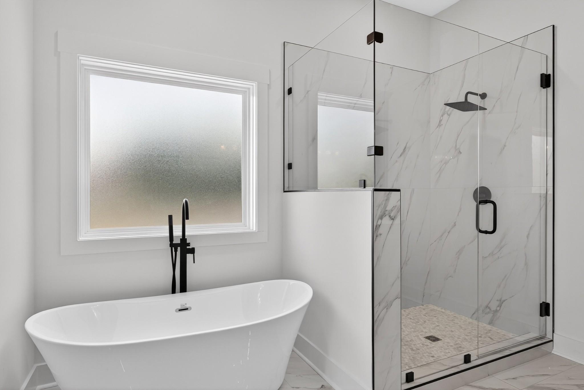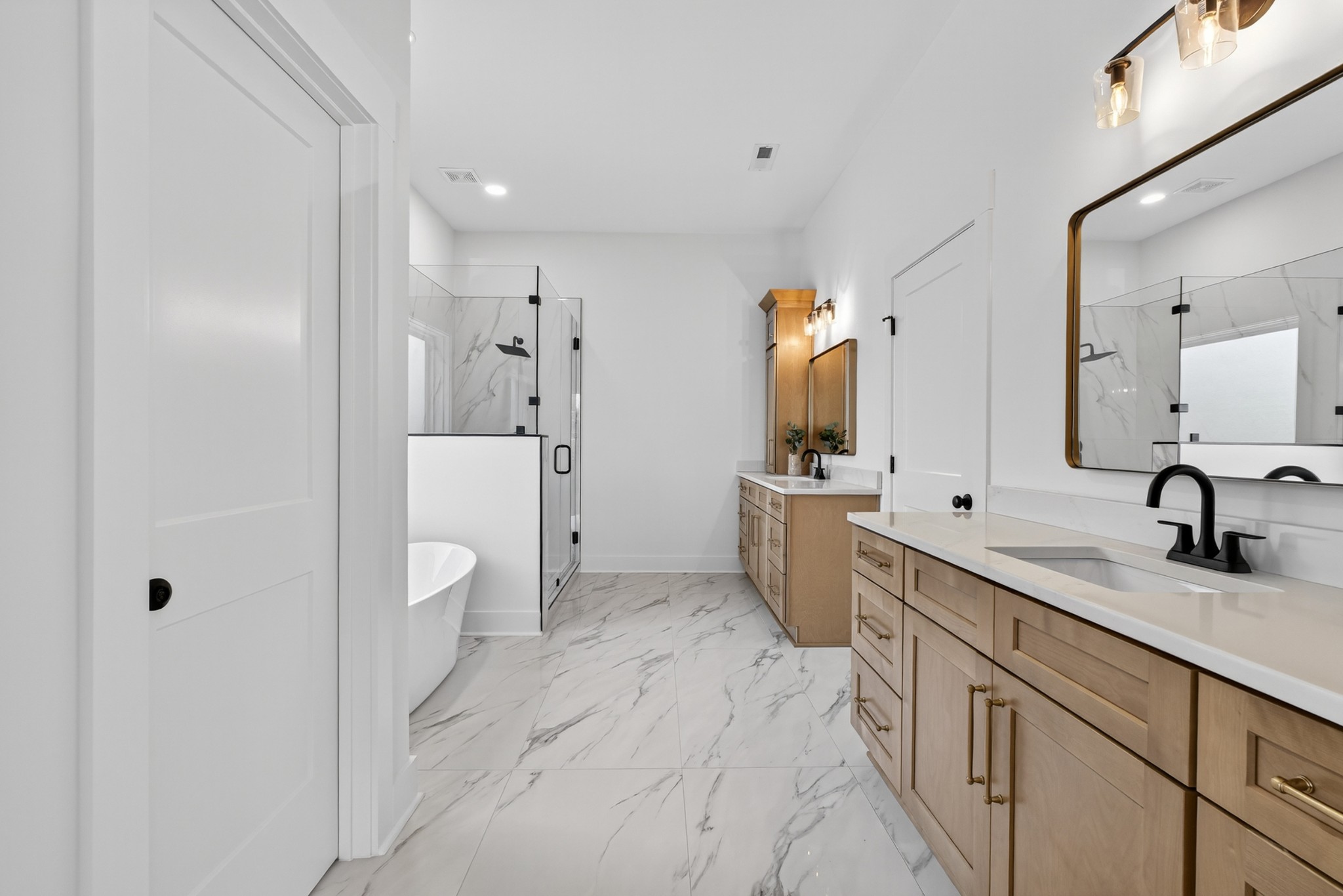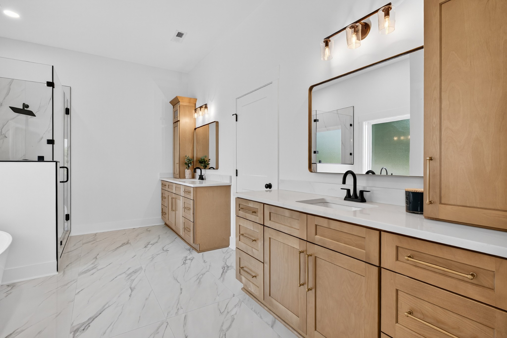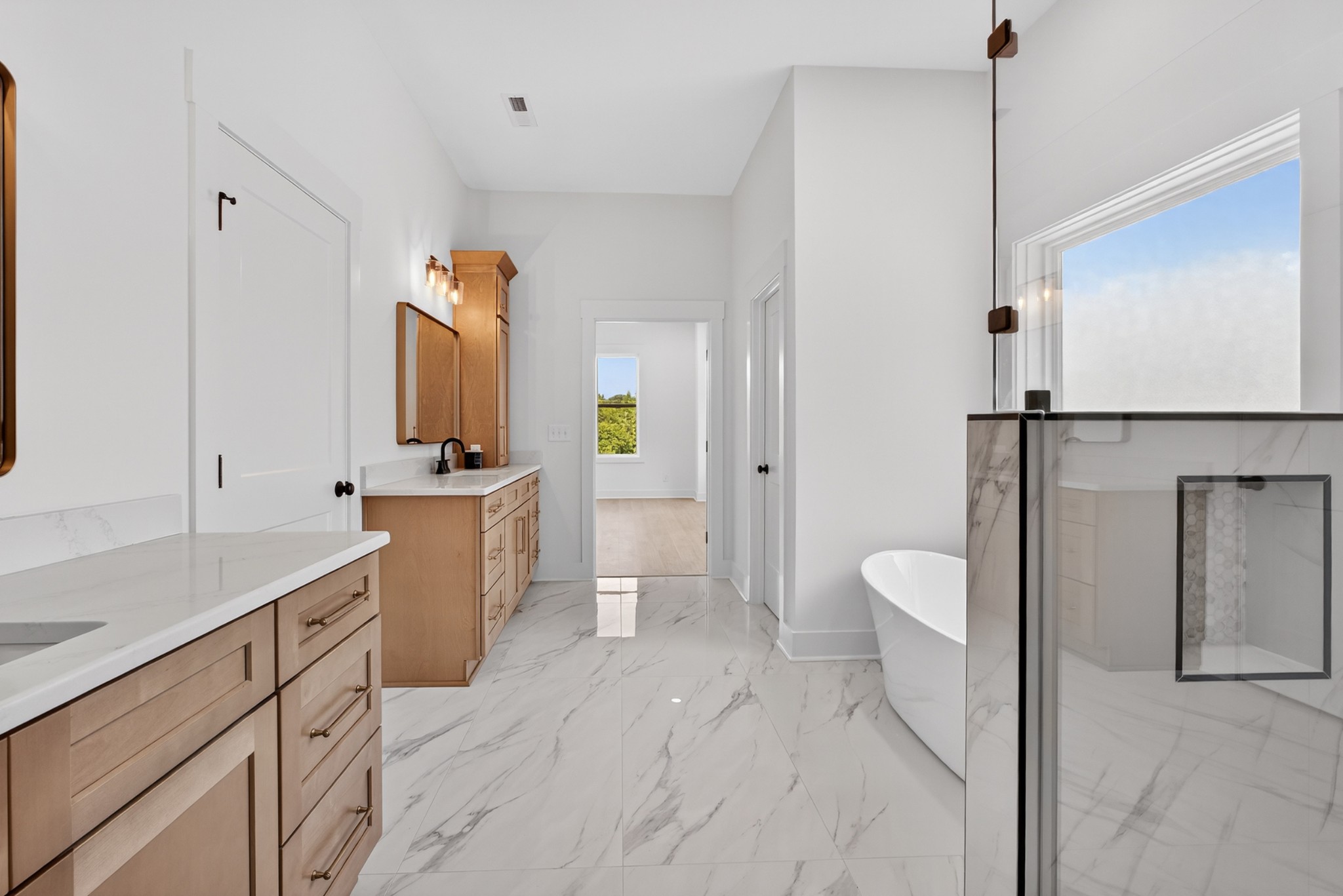 The heart of the home? The dream-worthy primary bathroom—a true spa retreat. Enjoy a freestanding soaking tub framed by a large frosted window, a huge walk-in shower with dual rainfall heads and marble-look tile, and dual vanities with soft-close cabinetry, quartz countertops, and matte black fixtures. Gorgeous oversized tile floors, warm honey-toned wood finishes, and luxe lighting elevate the space with timeless sophistication.