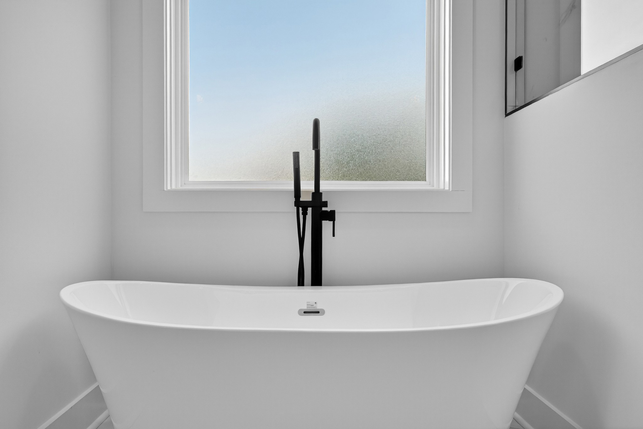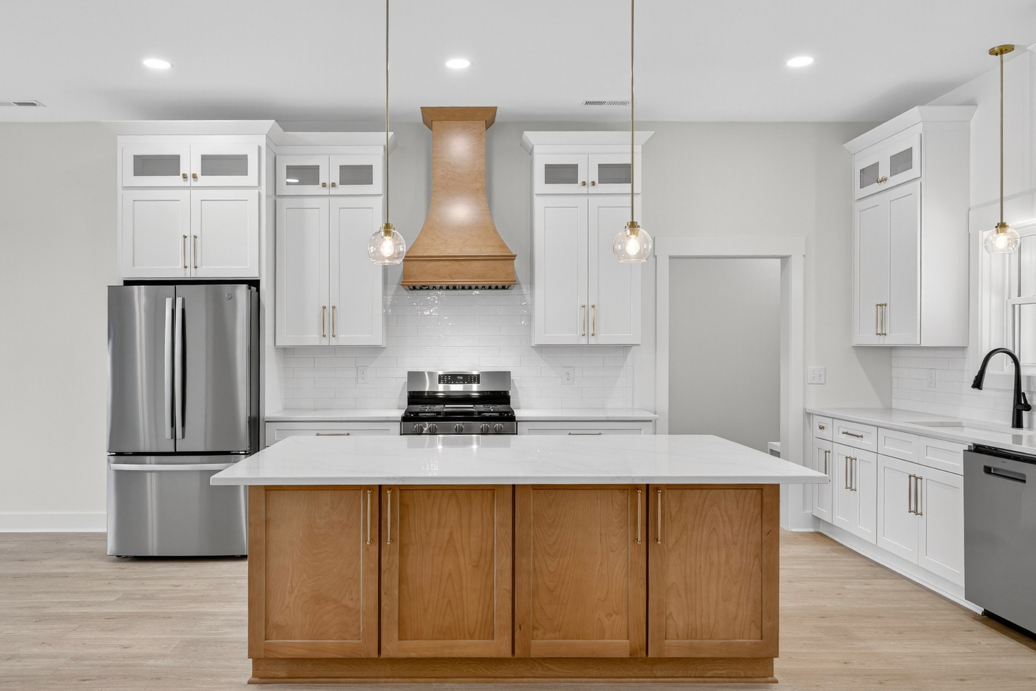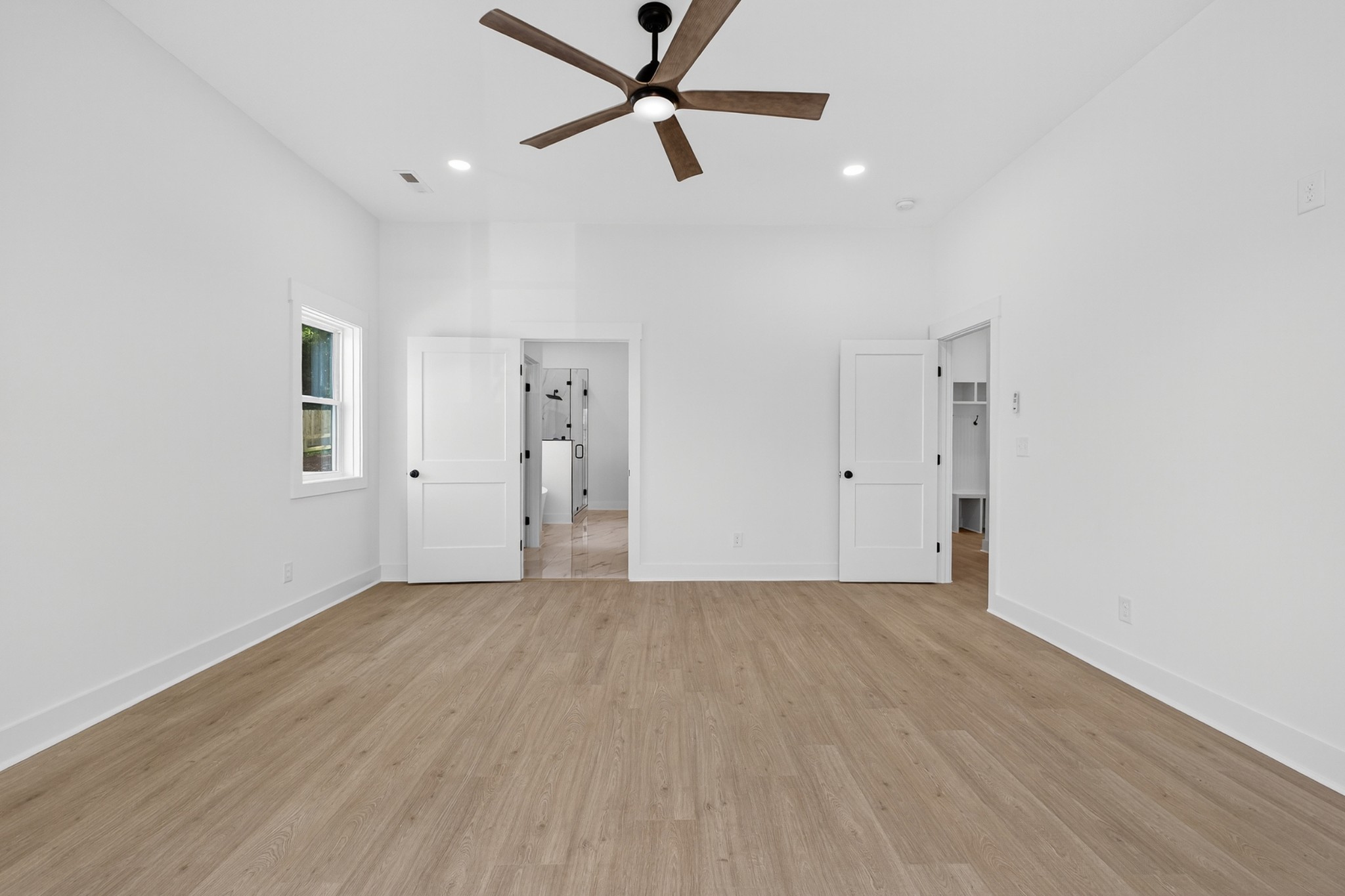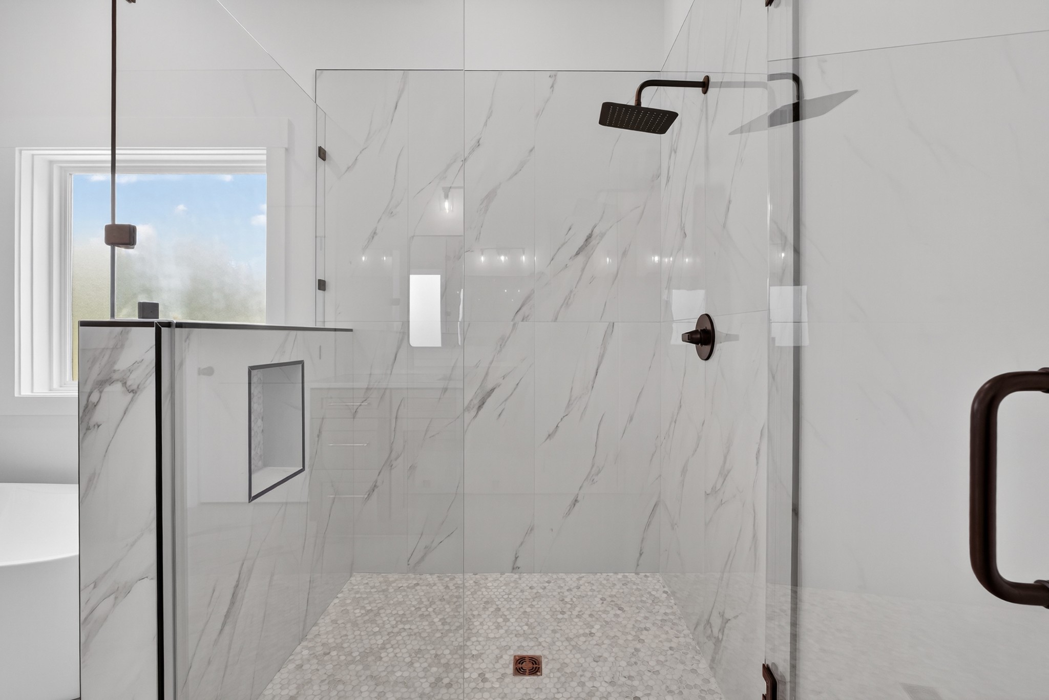 The heart of the home? The dream-worthy primary bathroom—a true spa retreat. Enjoy a freestanding soaking tub framed by a large frosted window, a huge walk-in shower with dual rainfall heads and marble-look tile, and dual vanities with soft-close cabinetry, quartz countertops, and matte black fixtures. Gorgeous oversized tile floors, warm honey-toned wood finishes, and luxe lighting elevate the space with timeless sophistication.
