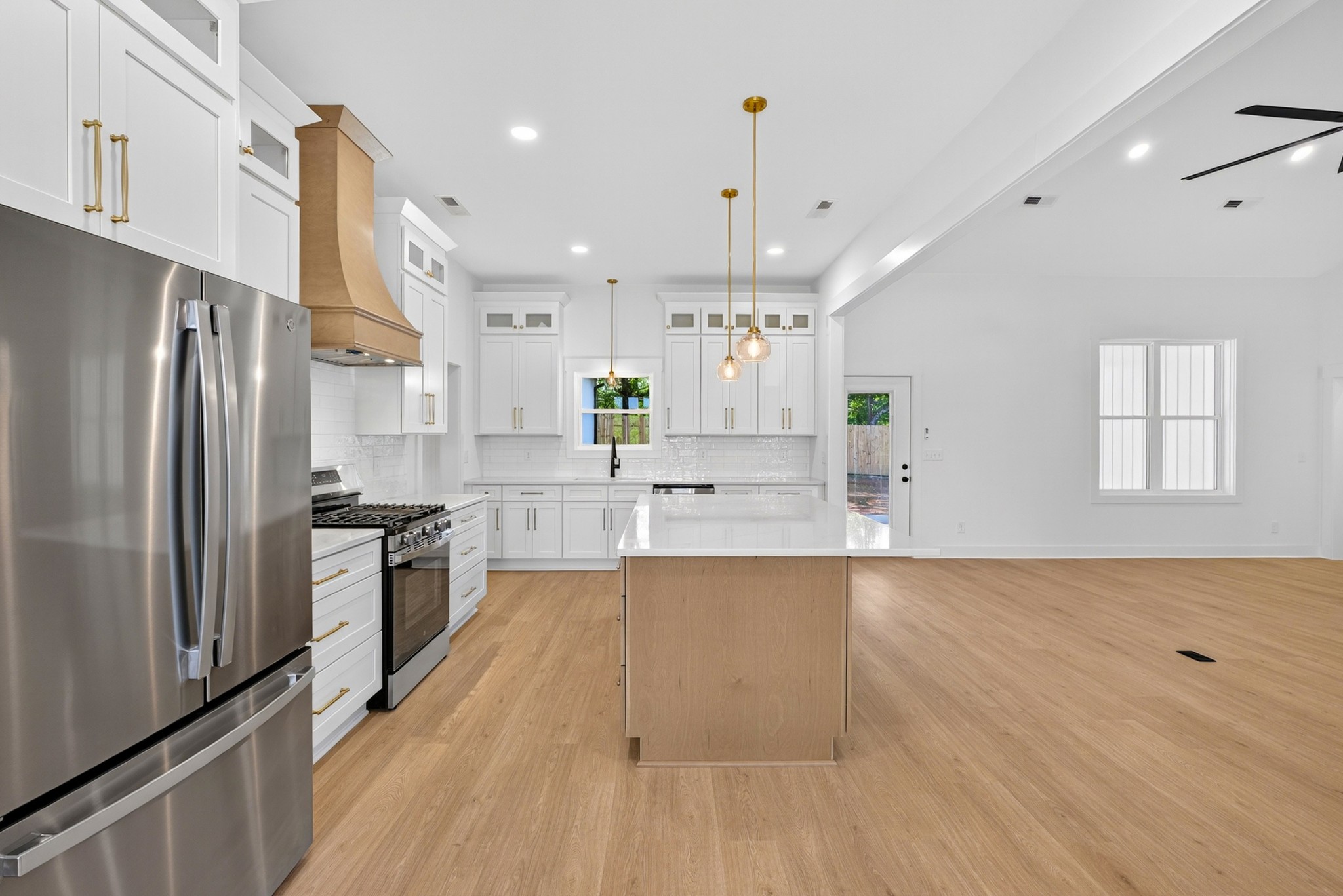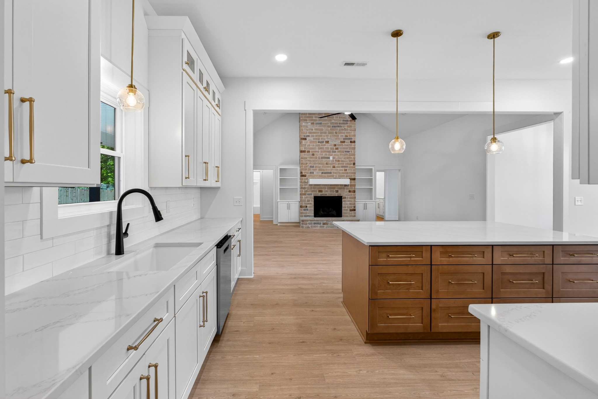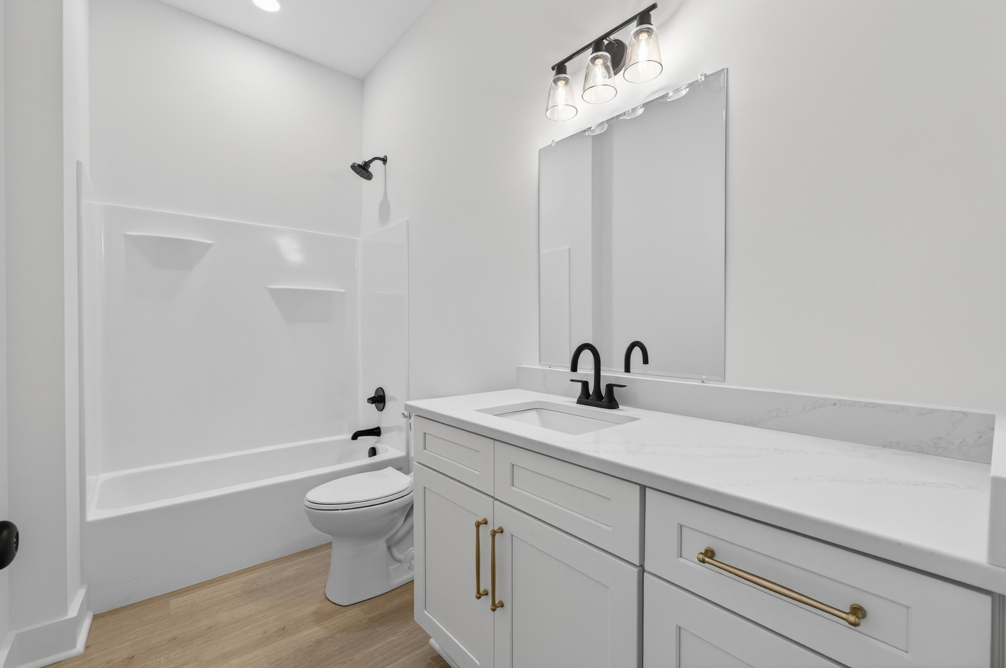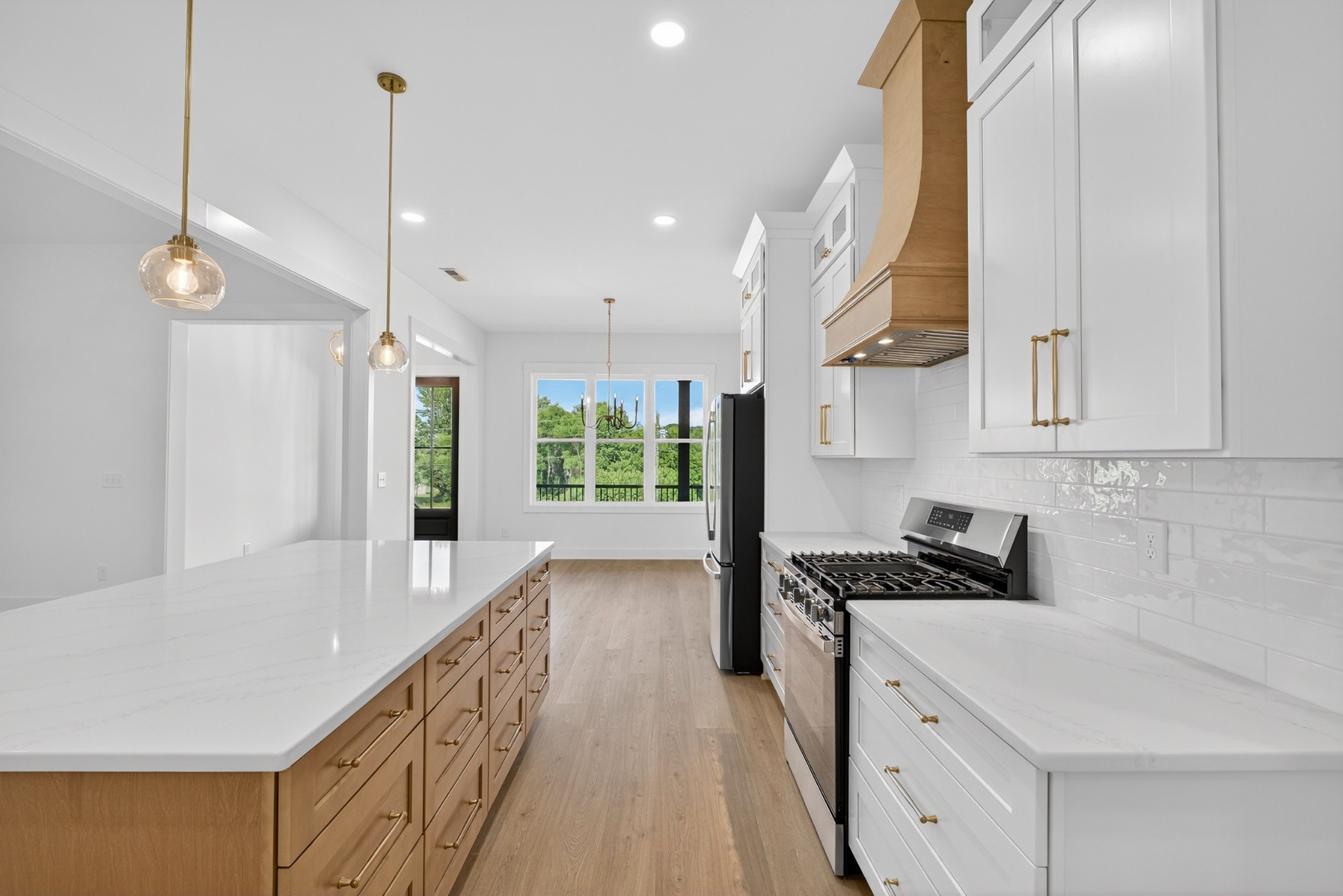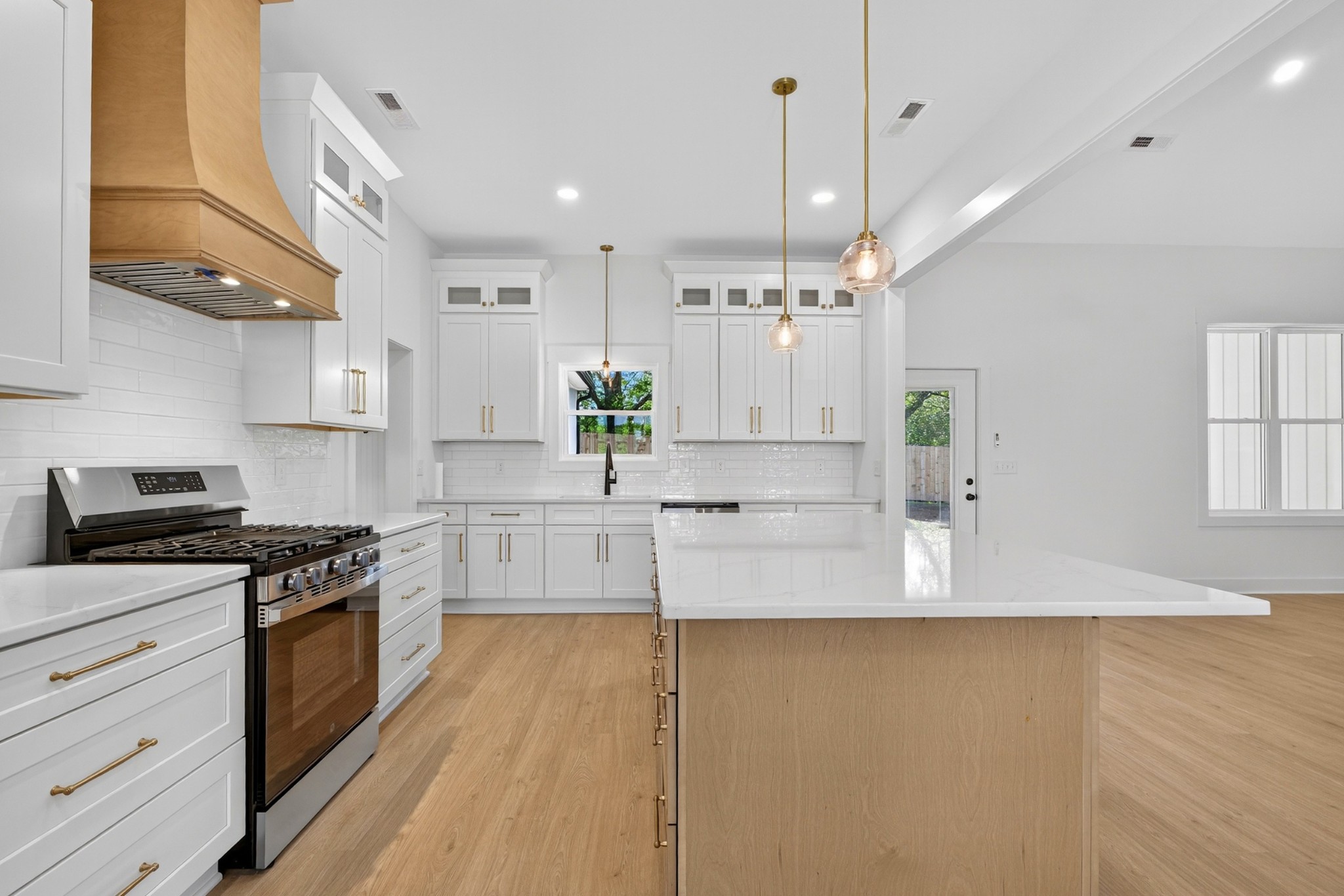 The heart of the home? The dream-worthy primary bathroom—a true spa retreat. Enjoy a freestanding soaking tub framed by a large frosted window, a huge walk-in shower with dual rainfall heads and marble-look tile, and dual vanities with soft-close cabinetry, quartz countertops, and matte black fixtures. Gorgeous oversized tile floors, warm honey-toned wood finishes, and luxe lighting elevate the space with timeless sophistication.