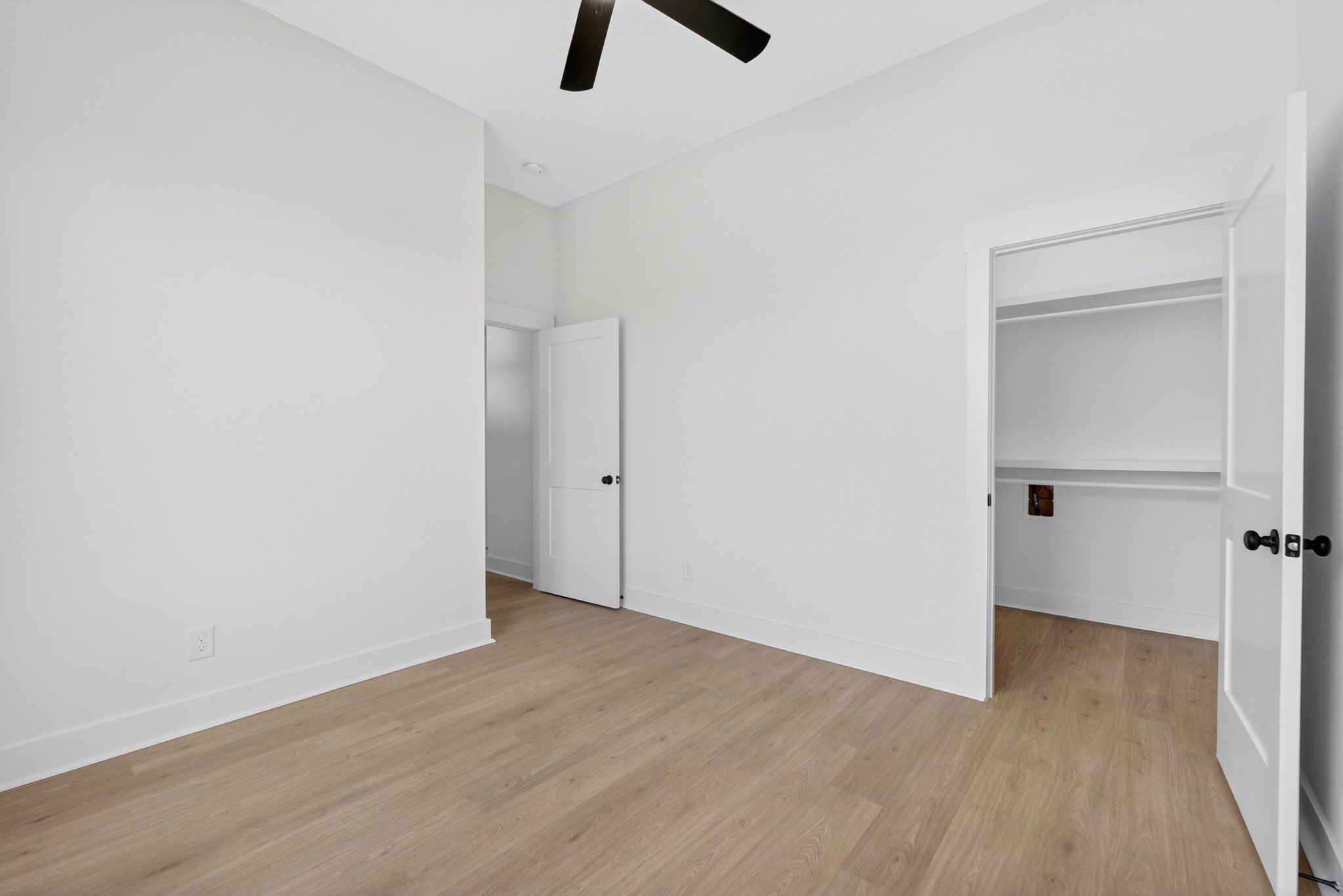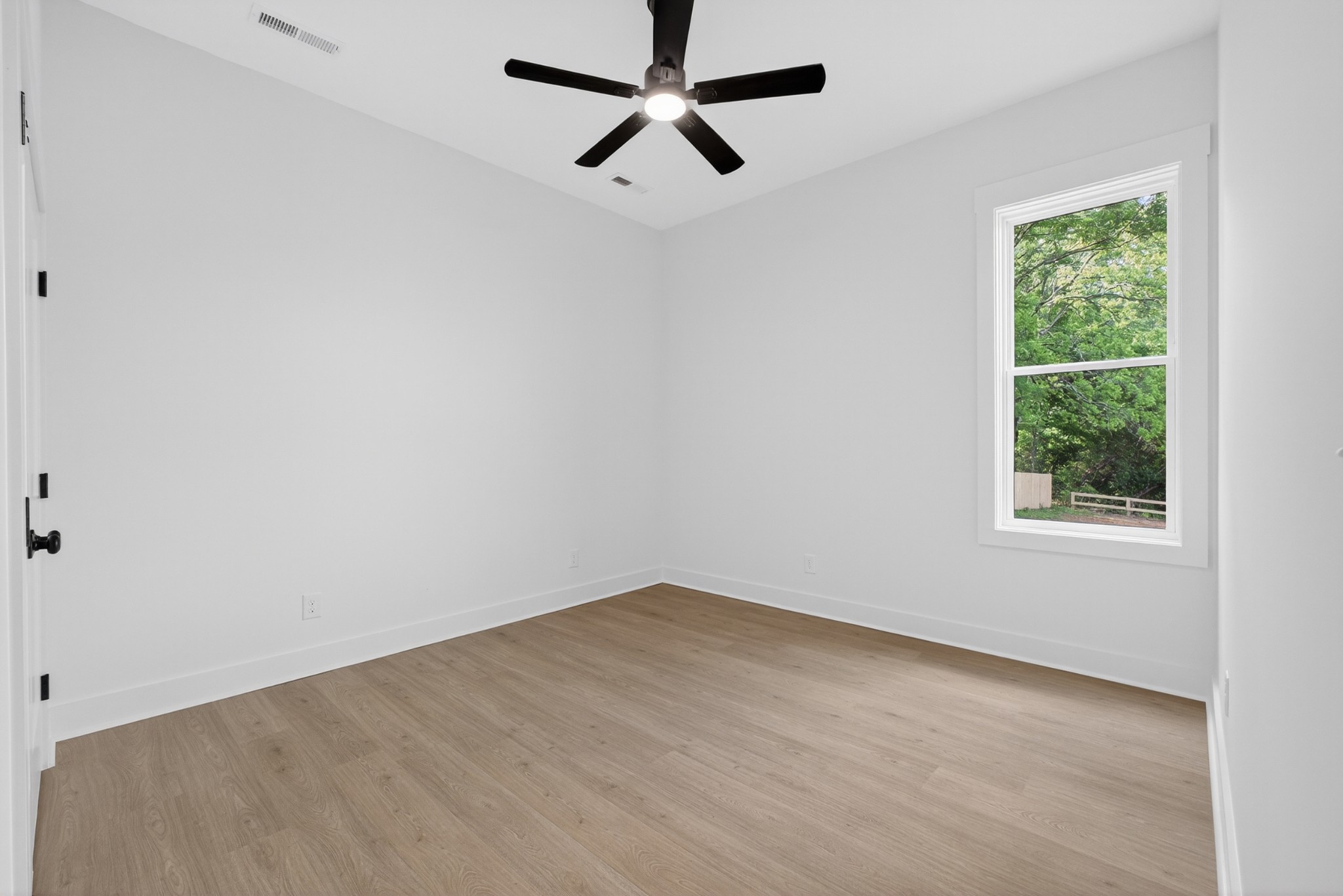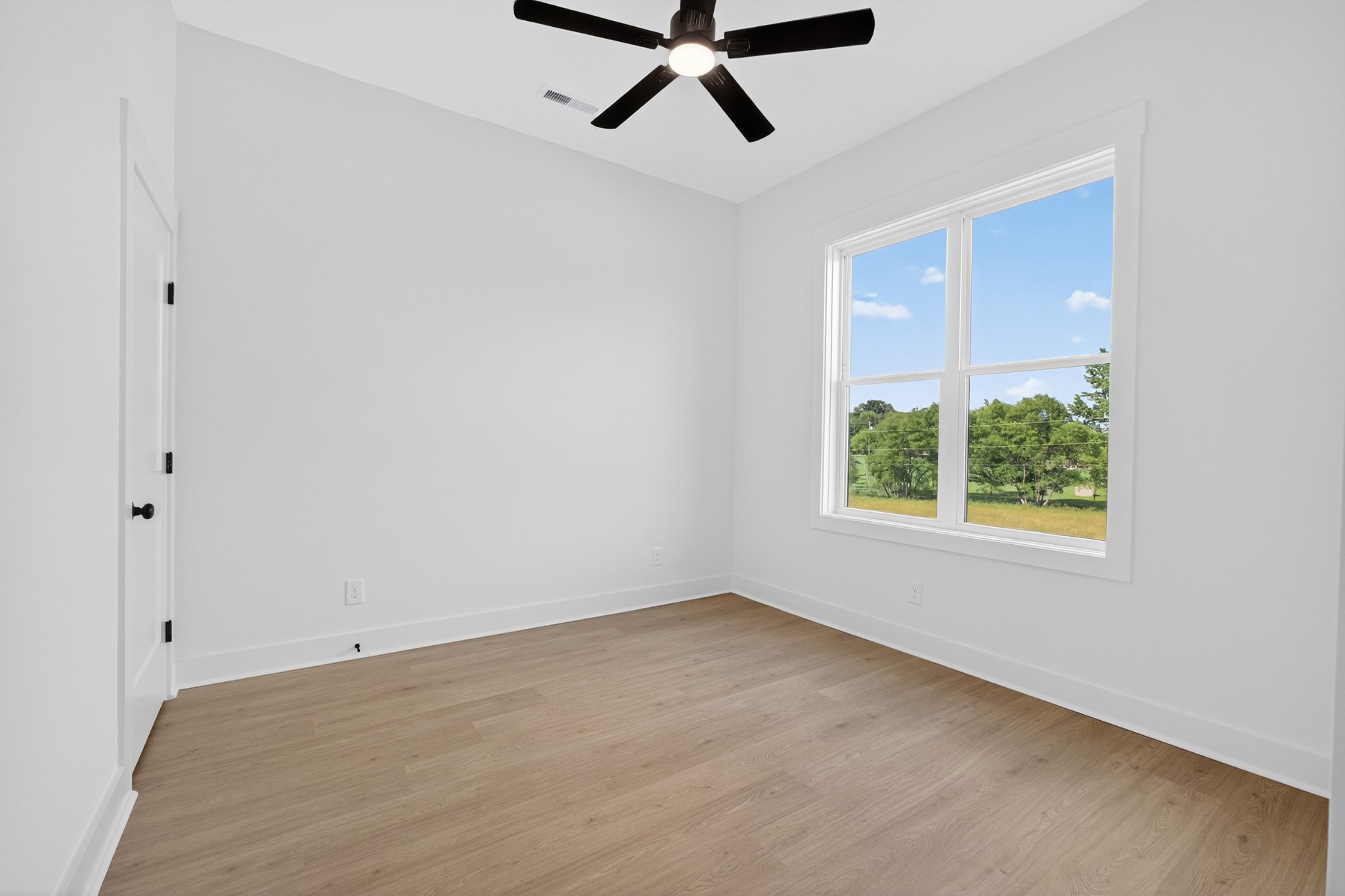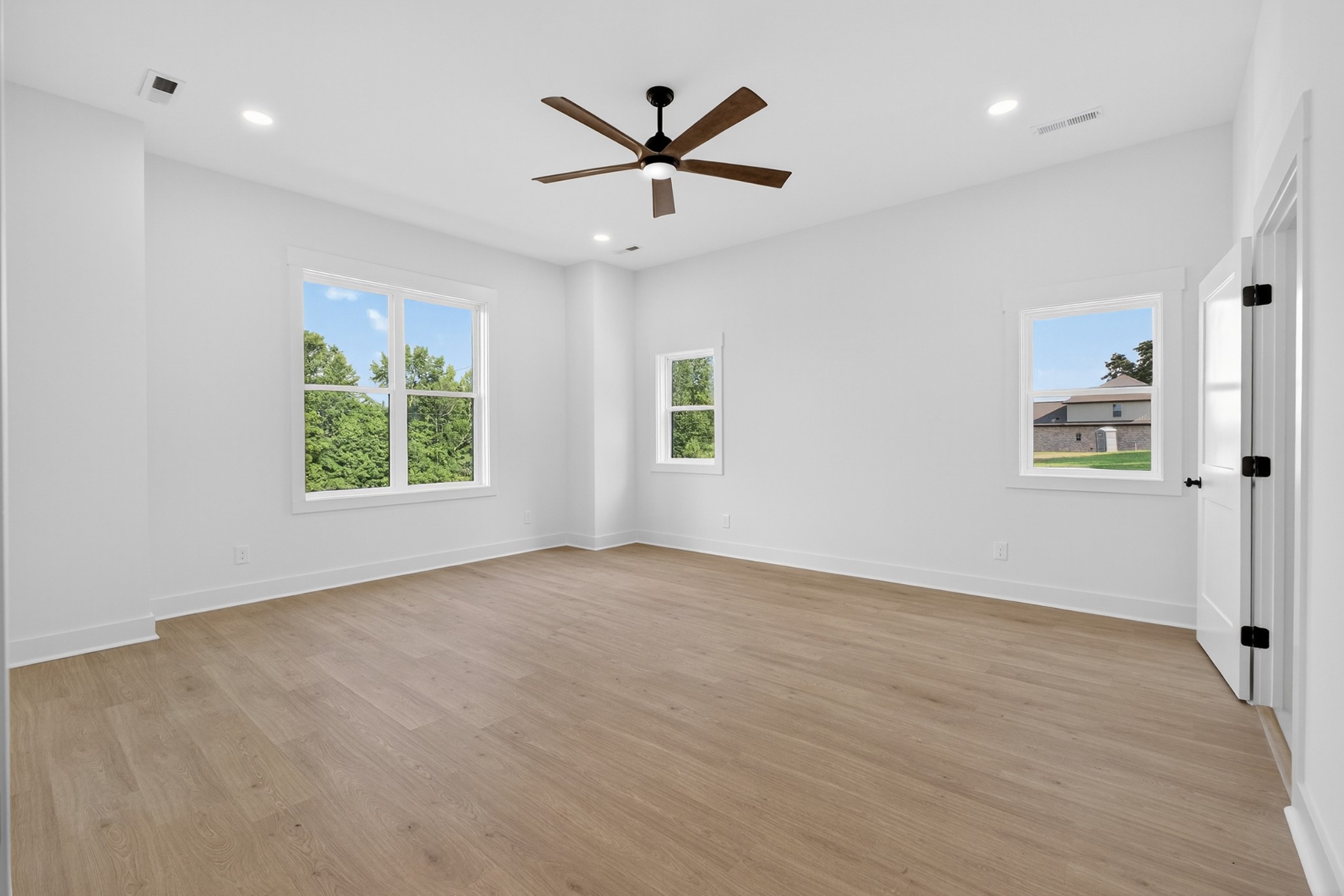 The heart of the home? The dream-worthy primary bathroom—a true spa retreat. Enjoy a freestanding soaking tub framed by a large frosted window, a huge walk-in shower with dual rainfall heads and marble-look tile, and dual vanities with soft-close cabinetry, quartz countertops, and matte black fixtures. Gorgeous oversized tile floors, warm honey-toned wood finishes, and luxe lighting elevate the space with timeless sophistication.