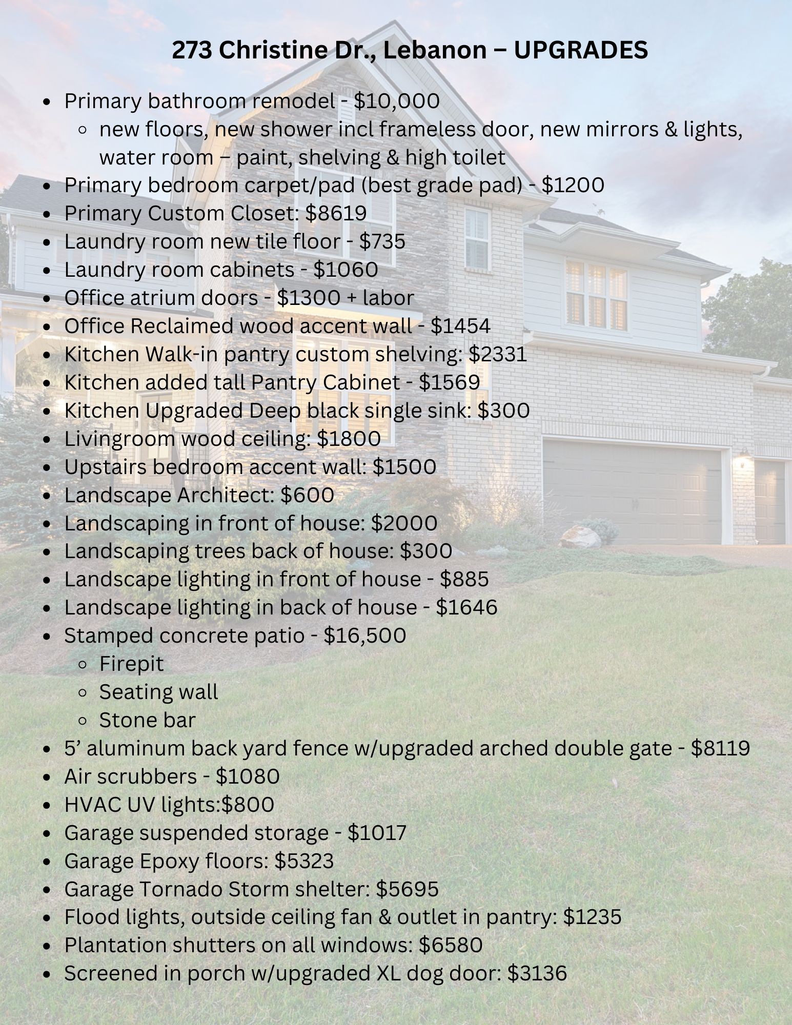 Beautiful 5-Bedroom Home Just Minutes from Historic Lebanon Square! Not only does this home have 5 spacious bedrooms but it also has a dedicated office AND a huge bonus room. The primary bedroom and 1 guest room is located on the main level. This beautifully upgraded home offers the perfect blend of comfort, style, and convenience—just 7 minutes from the charming Lebanon Square, 30 minutes to the airport, and 40 minutes to downtown Nashville. Ideal for commuters, it's also just minutes from the Music City Star train station. Step outside to your own private retreat: a large, fenced backyard featuring mature trees with professional uplighting, a custom stamped concrete patio, built-in stone bar, firepit, and a cozy sitting wall—perfect for entertaining year-round. The screened-in porch includes an upgraded XL dog door for your four-legged family members. Inside, the gourmet kitchen boasts a large island (7' 3") and not one, but two pantries—including a custom-designed walk-in pantry. The primary suite features a recently renovated spa-like bathroom with new flooring, a fully tiled shower with frameless glass slider door, updated lighting, mirrors, and fresh paint. You’ll also love the custom-designed walk-in closet tailored for both function and style. Additional features include: 3-car garage with epoxy floors, suspended storage racks, and a walk-in tornado shelter. Plantation shutters throughout. Indoor dog kennel (can be easily converted back to storage room). Professional landscaping designed by a landscape architect. This well-maintained home has been thoughtfully updated with too many upgrades to list—come see it in person to truly appreciate everything it has to offer! (**This could be easily converted to a gas stovetop) LISTED BELOW RECENT APPRAISAL! (Sq ftg professionally measured)