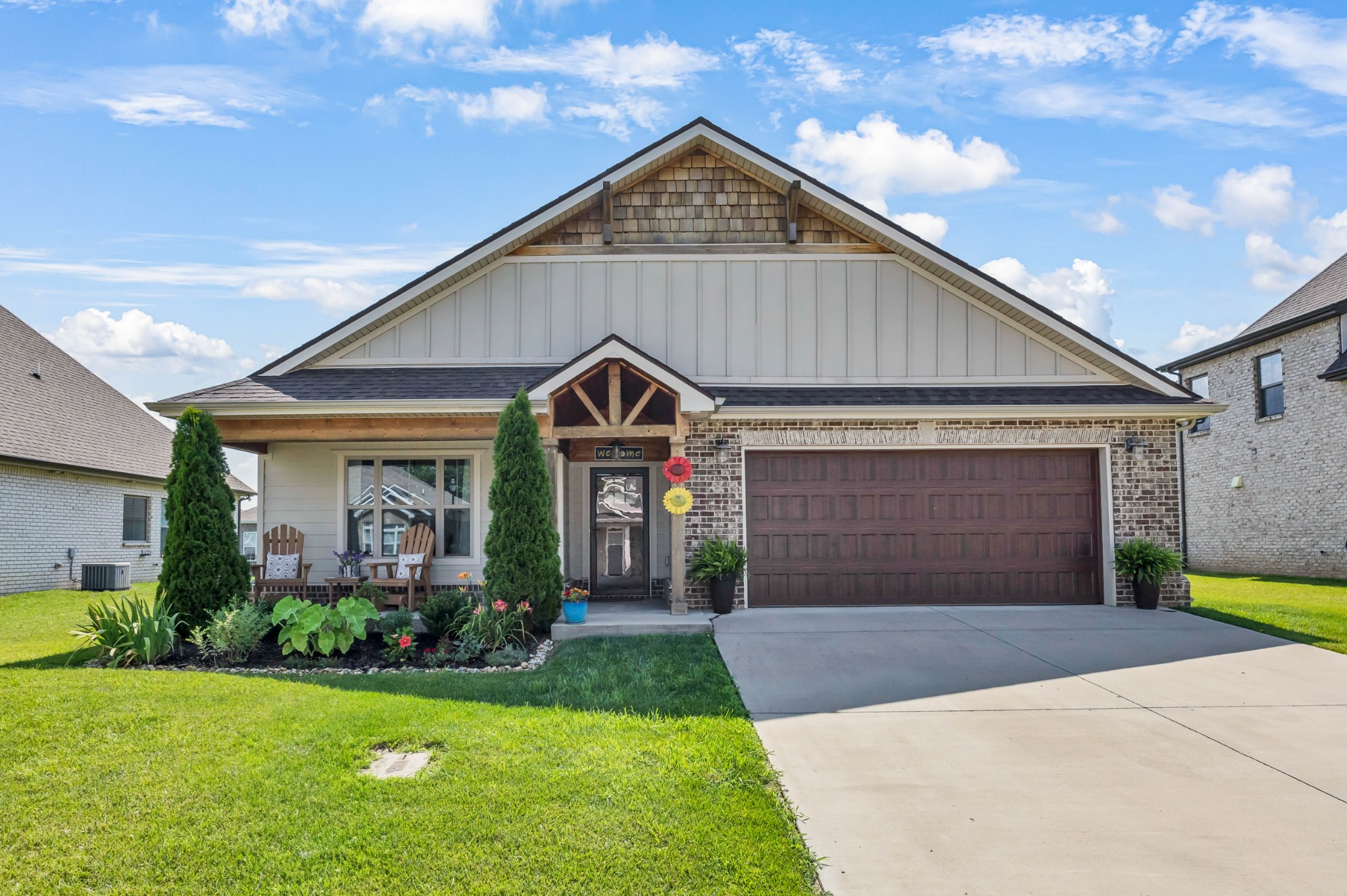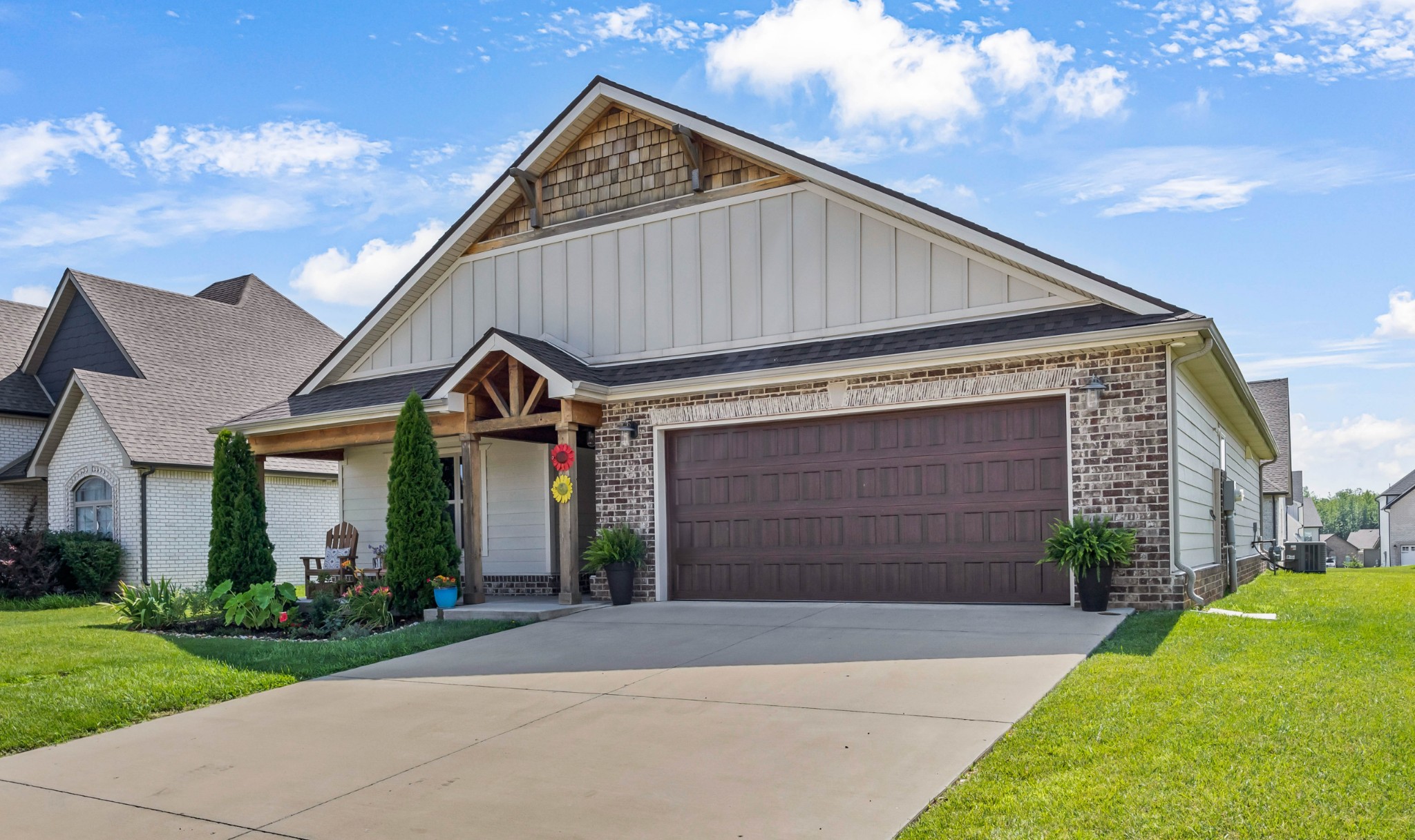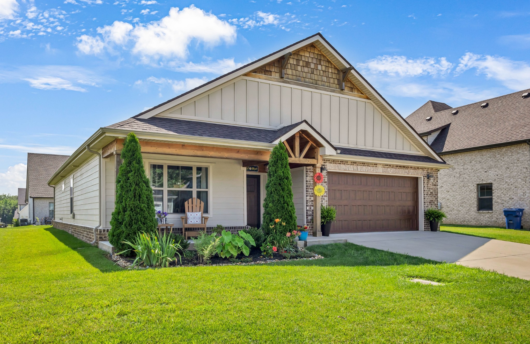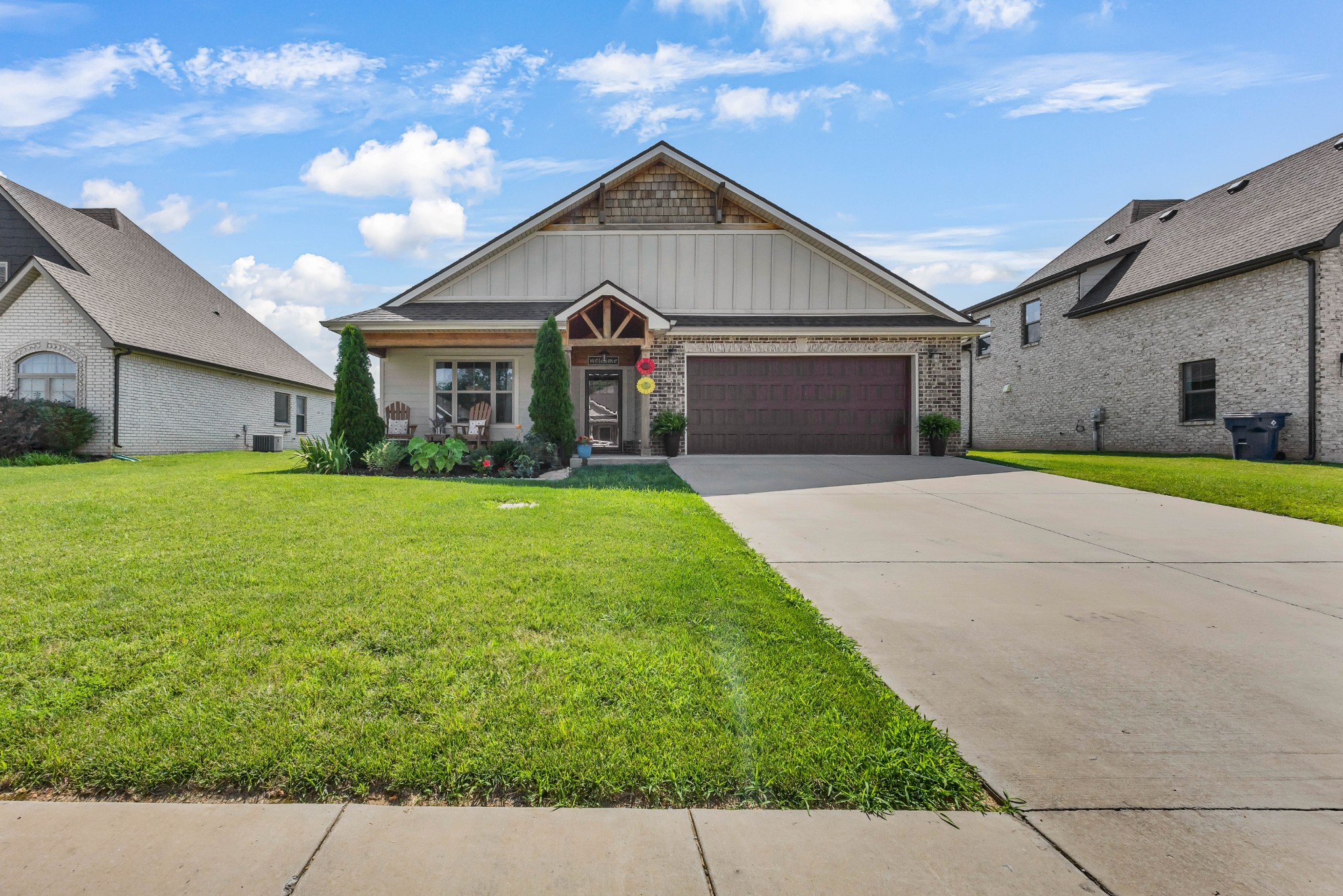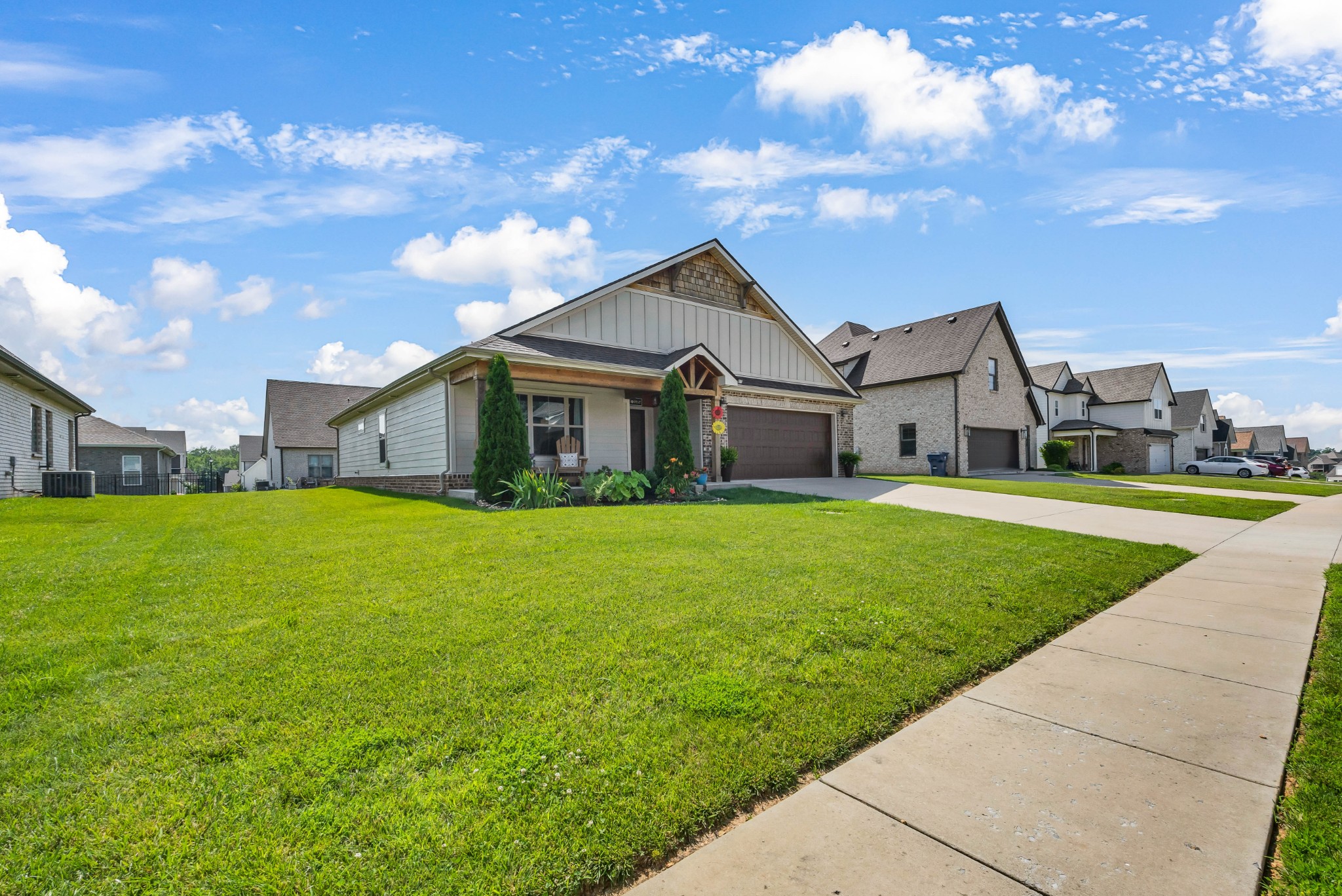 Your Perfect One-Level Dream Home! Here’s your chance to own a stylish and comfortable one-level home with low-entry access and timeless curb appeal! The exterior showcases a striking blend of board and batten siding, brick accents, and beautiful natural cedar details that add warmth and character. Gardeners will fall in love with the lush landscaping and well-maintained lawn, perfect for enjoying the outdoors. Inside, luxury vinyl plank flooring gives the look of hand-scraped hardwood with durability and ease of maintenance. The open-concept floorplan seamlessly connects the kitchen, living room, and breakfast nook—ideal for entertaining or relaxed daily living. The kitchen boasts abundant cabinetry, quartz countertops, and a modern design sure to impress.