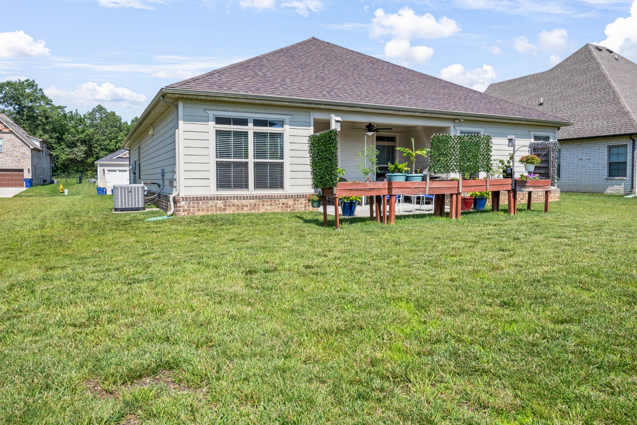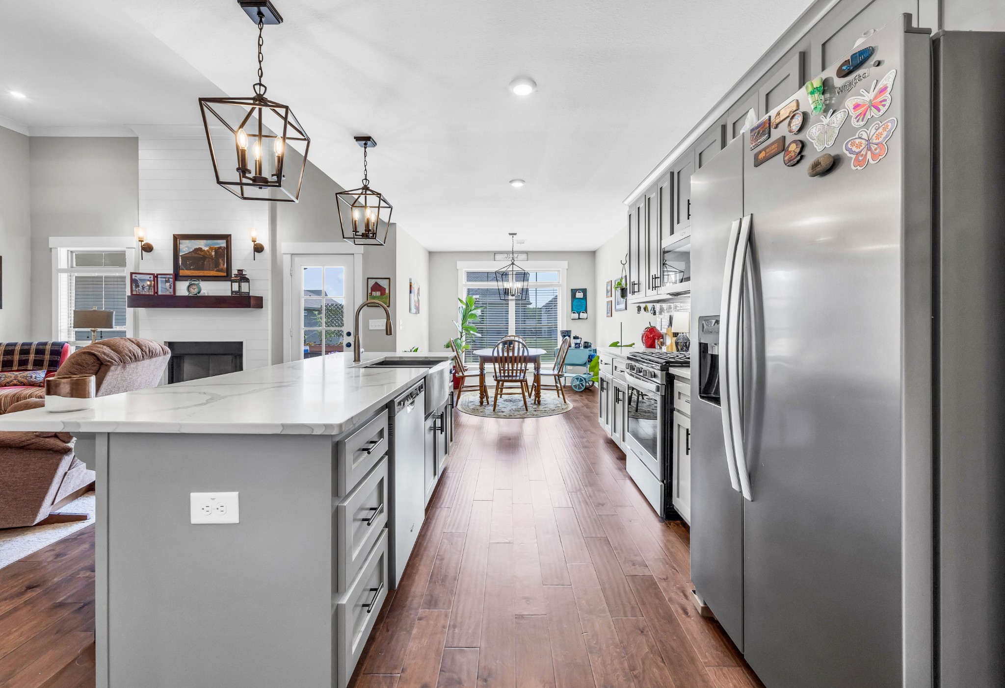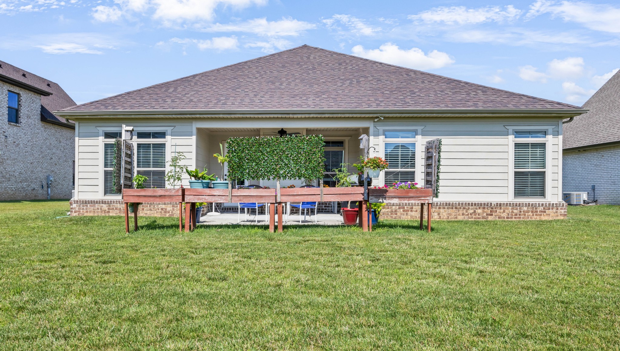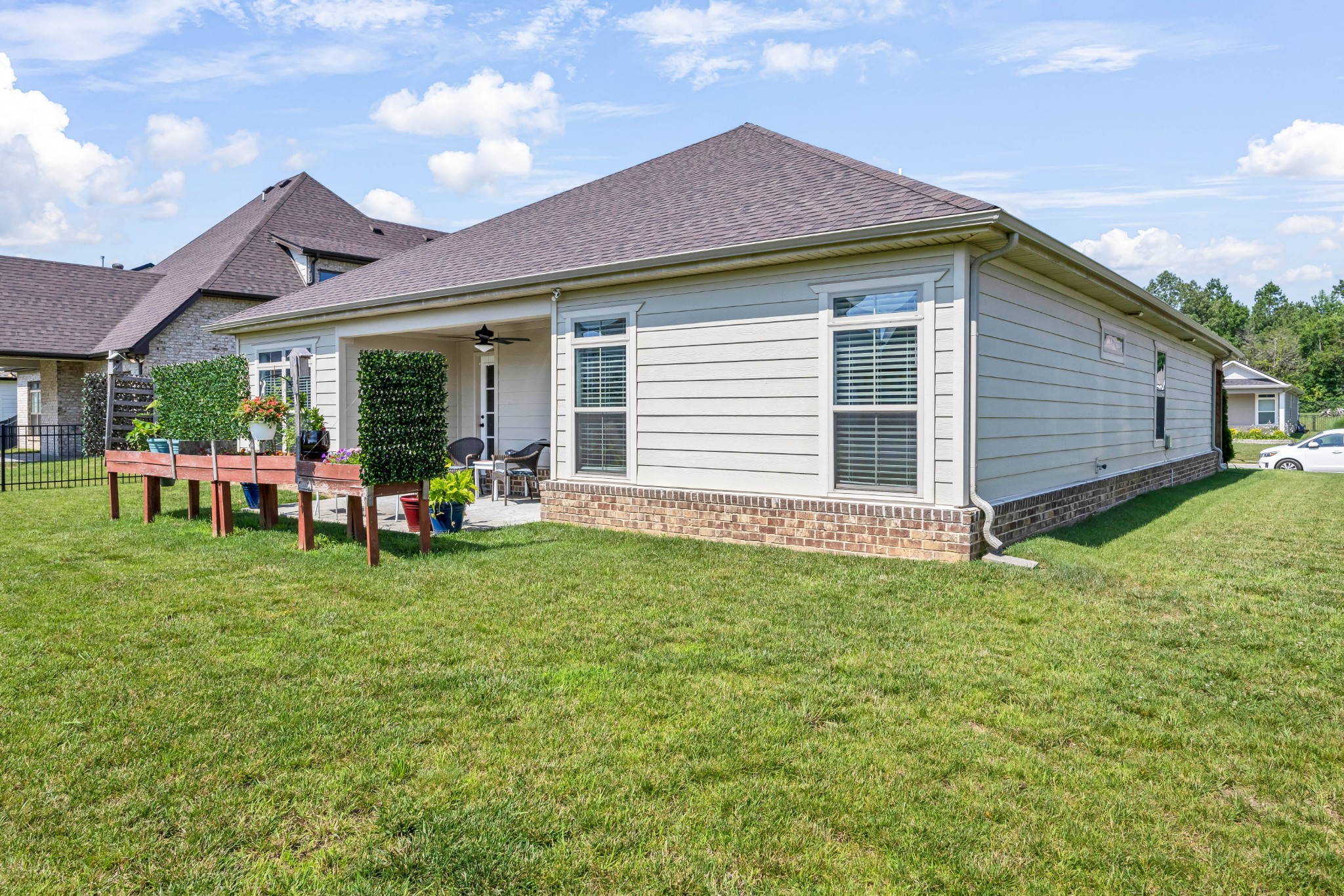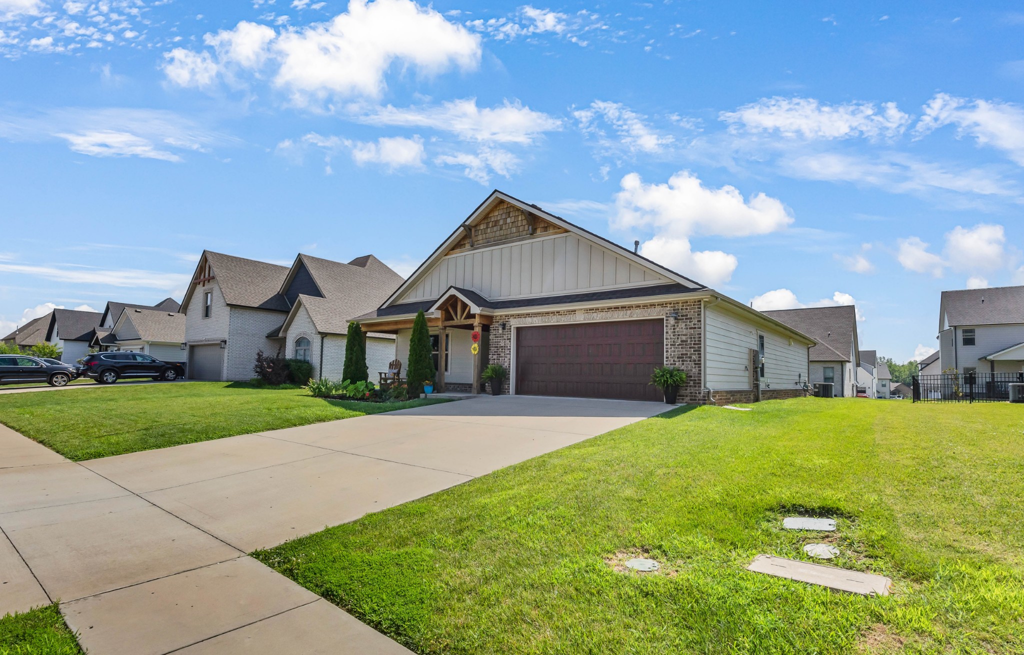 Your Perfect One-Level Dream Home! Here’s your chance to own a stylish and comfortable one-level home with low-entry access and timeless curb appeal! The exterior showcases a striking blend of board and batten siding, brick accents, and beautiful natural cedar details that add warmth and character. Gardeners will fall in love with the lush landscaping and well-maintained lawn, perfect for enjoying the outdoors. Inside, luxury vinyl plank flooring gives the look of hand-scraped hardwood with durability and ease of maintenance. The open-concept floorplan seamlessly connects the kitchen, living room, and breakfast nook—ideal for entertaining or relaxed daily living. The kitchen boasts abundant cabinetry, quartz countertops, and a modern design sure to impress.