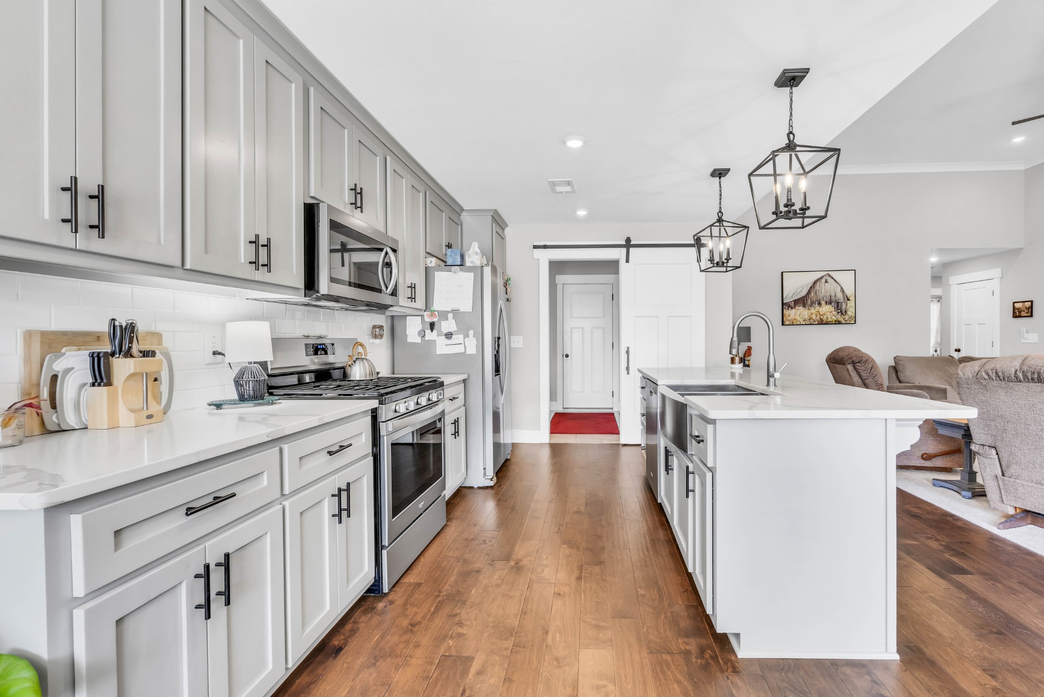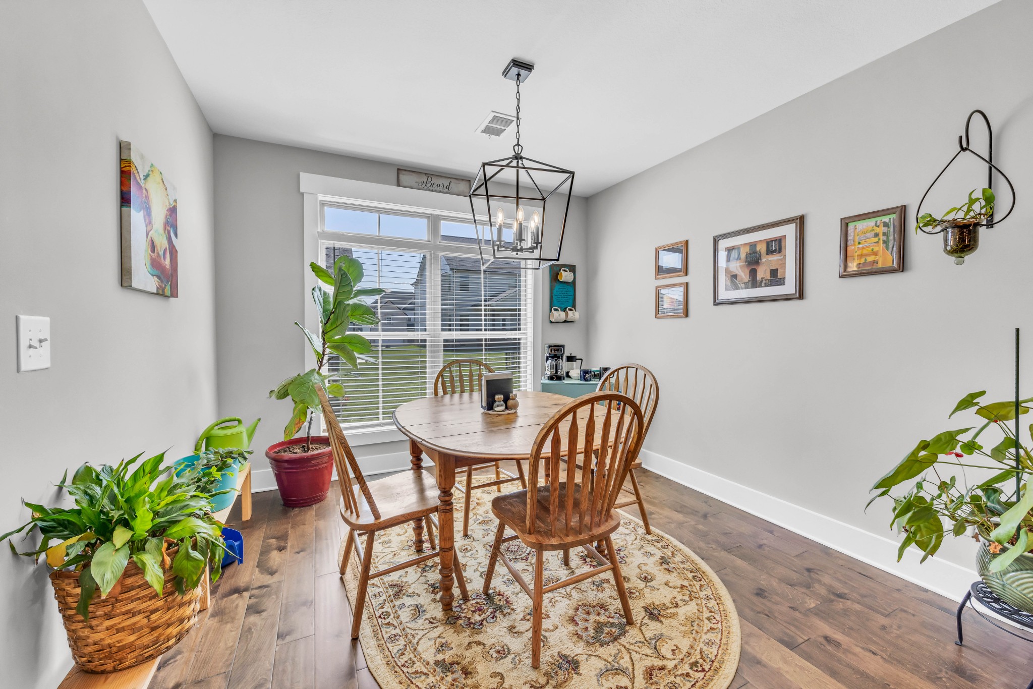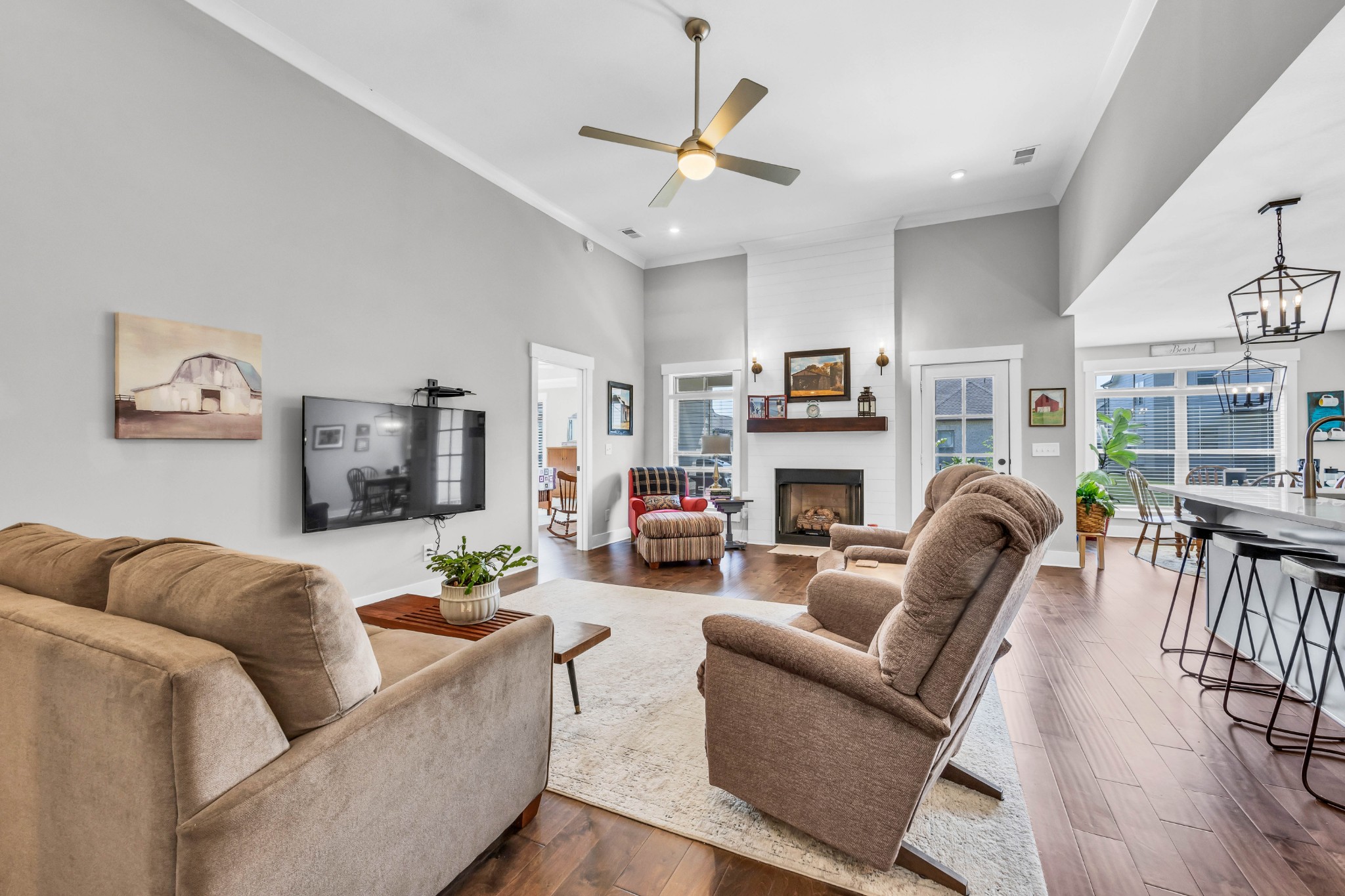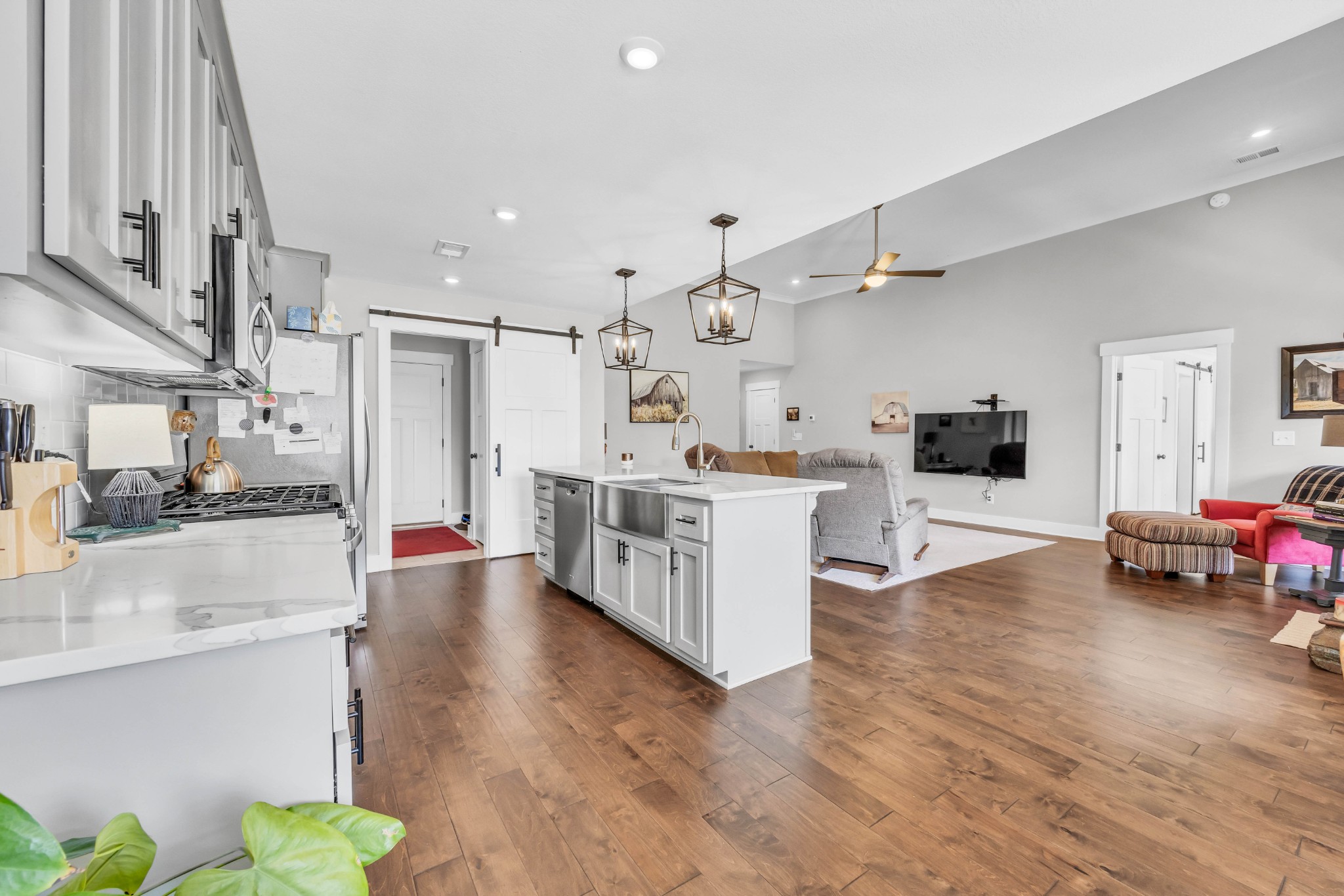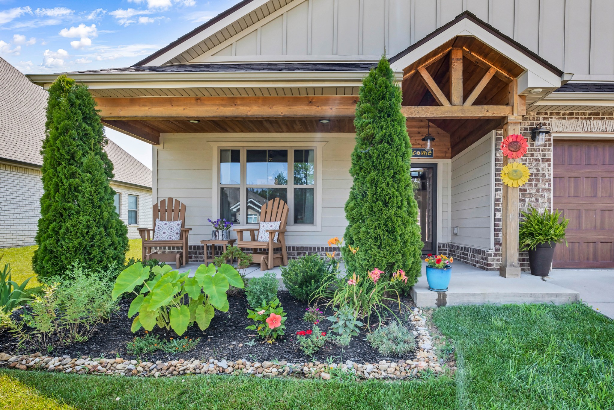 Your Perfect One-Level Dream Home! Here’s your chance to own a stylish and comfortable one-level home with low-entry access and timeless curb appeal! The exterior showcases a striking blend of board and batten siding, brick accents, and beautiful natural cedar details that add warmth and character. Gardeners will fall in love with the lush landscaping and well-maintained lawn, perfect for enjoying the outdoors. Inside, luxury vinyl plank flooring gives the look of hand-scraped hardwood with durability and ease of maintenance. The open-concept floorplan seamlessly connects the kitchen, living room, and breakfast nook—ideal for entertaining or relaxed daily living. The kitchen boasts abundant cabinetry, quartz countertops, and a modern design sure to impress.