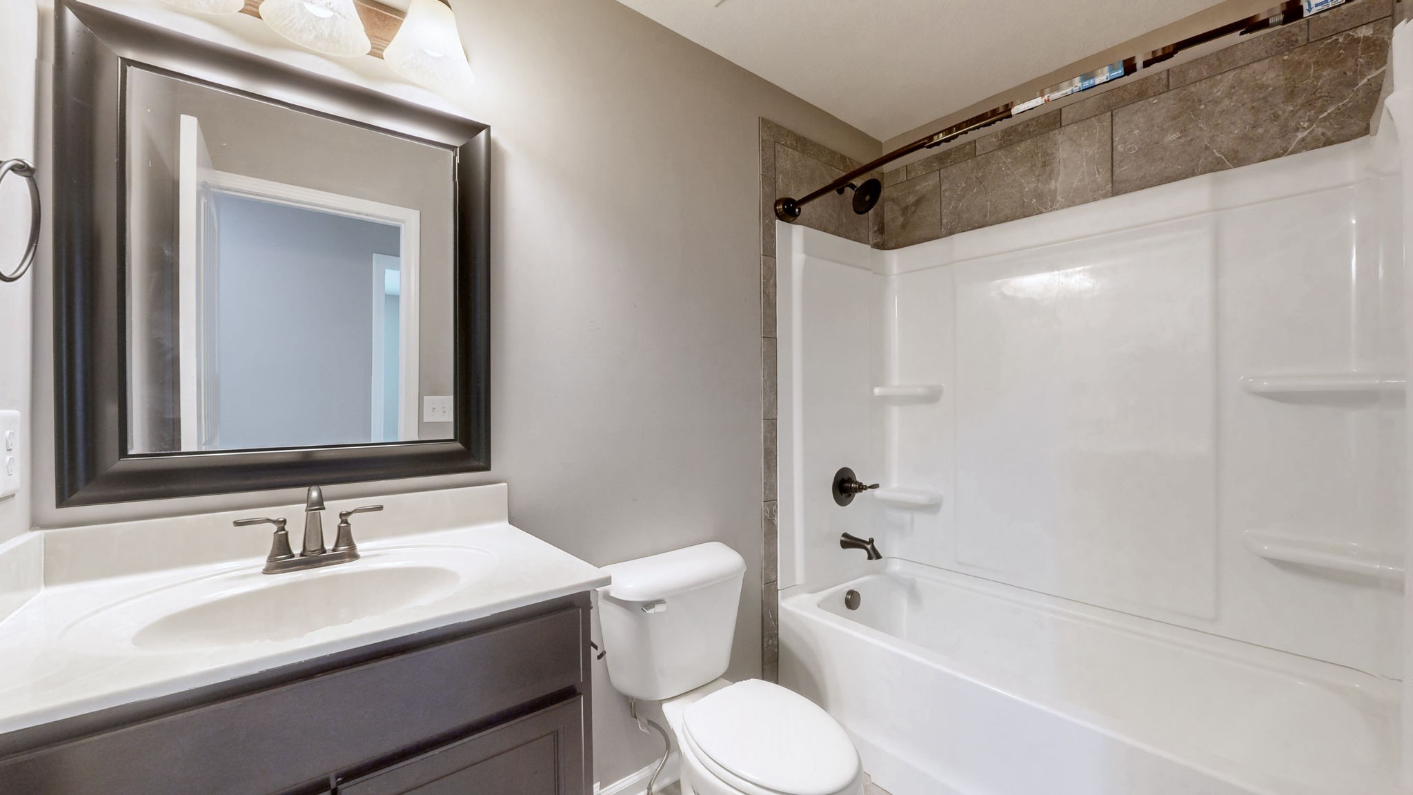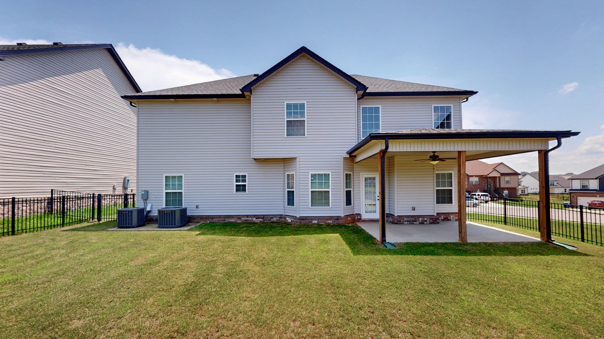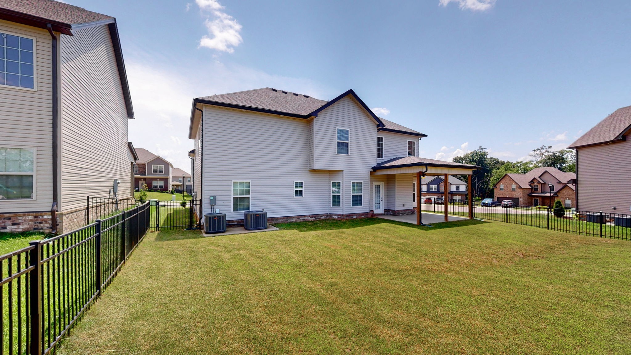 The primary suite includes a spacious layout with a soaking tub, separate shower, and dual vanities. Secondary bedrooms are well-sized with access to a full hall bath. The fully fenced backyard provides added privacy with no rear neighbors and includes a covered patio for outdoor enjoyment.