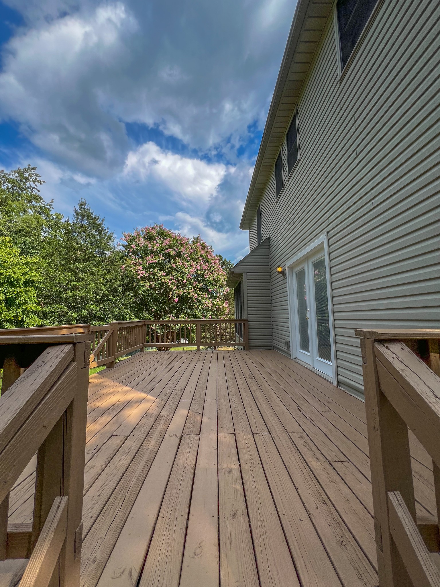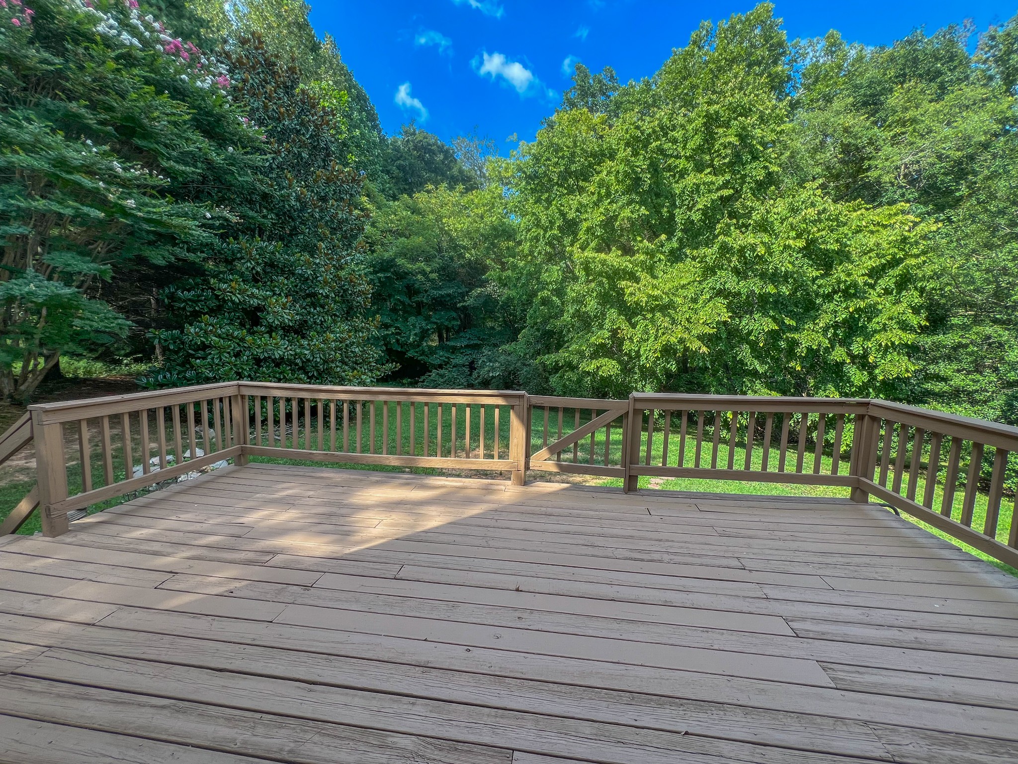 The kitchen features a high-top counter for additional seating, an eat-in dining area framed by large windows, and direct access to another spacious living area. From here, deck doors open to a tree-lined backyard complete with a large deck, ideal for entertaining or simply enjoying the serene surroundings.
