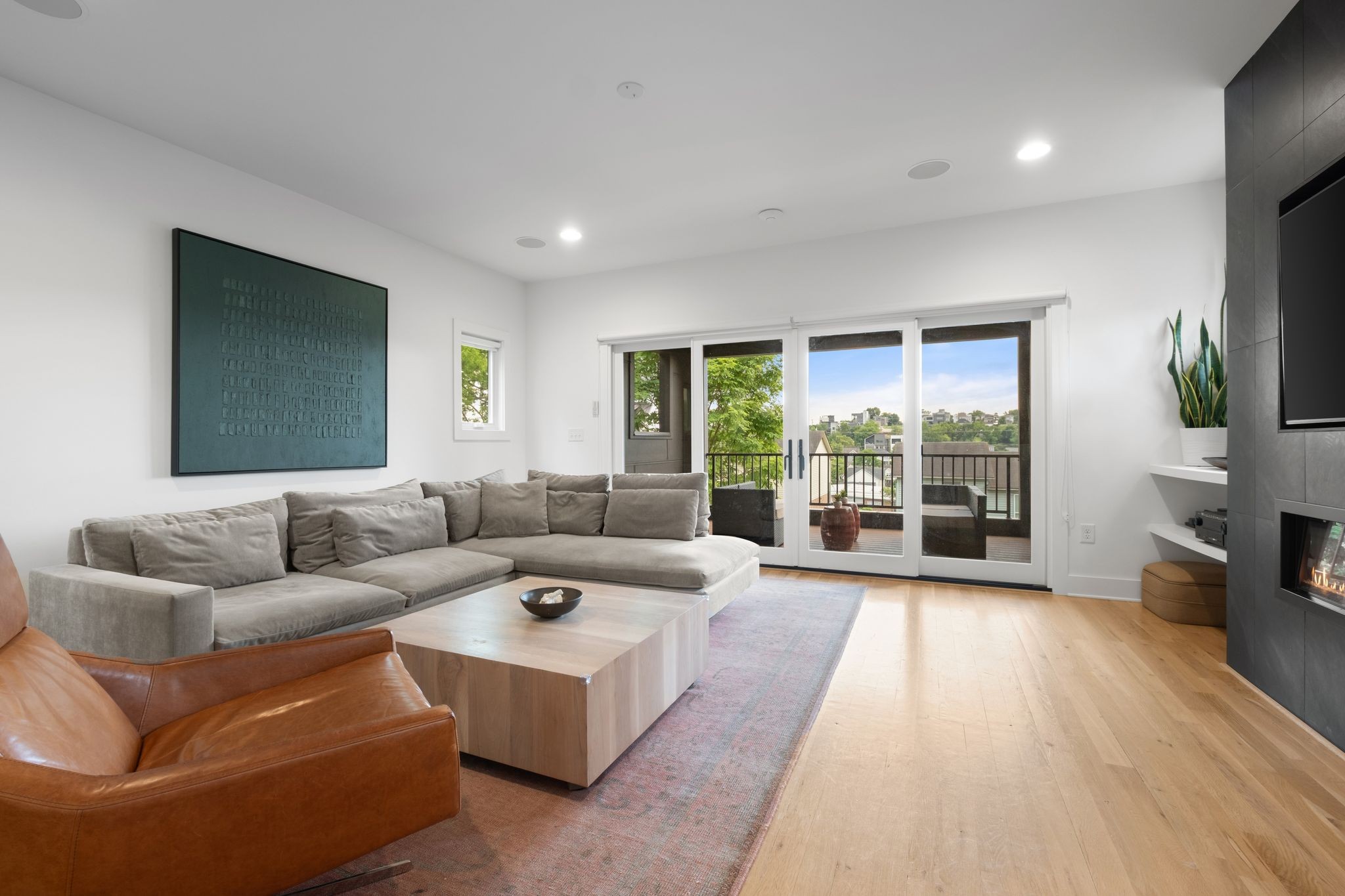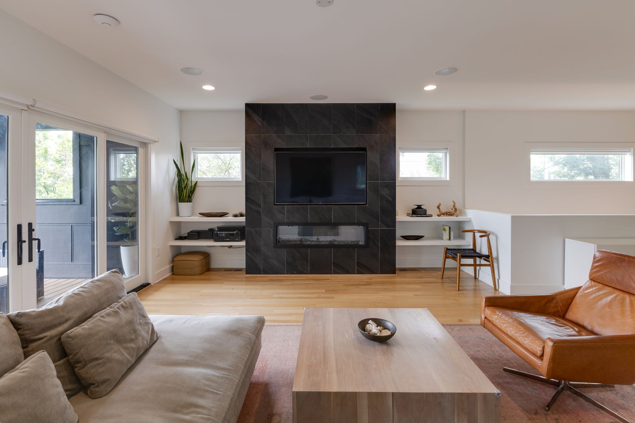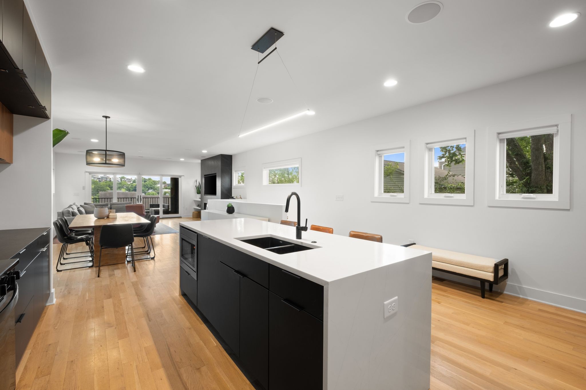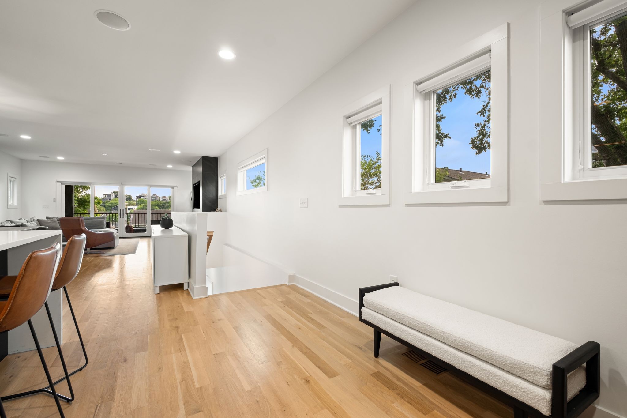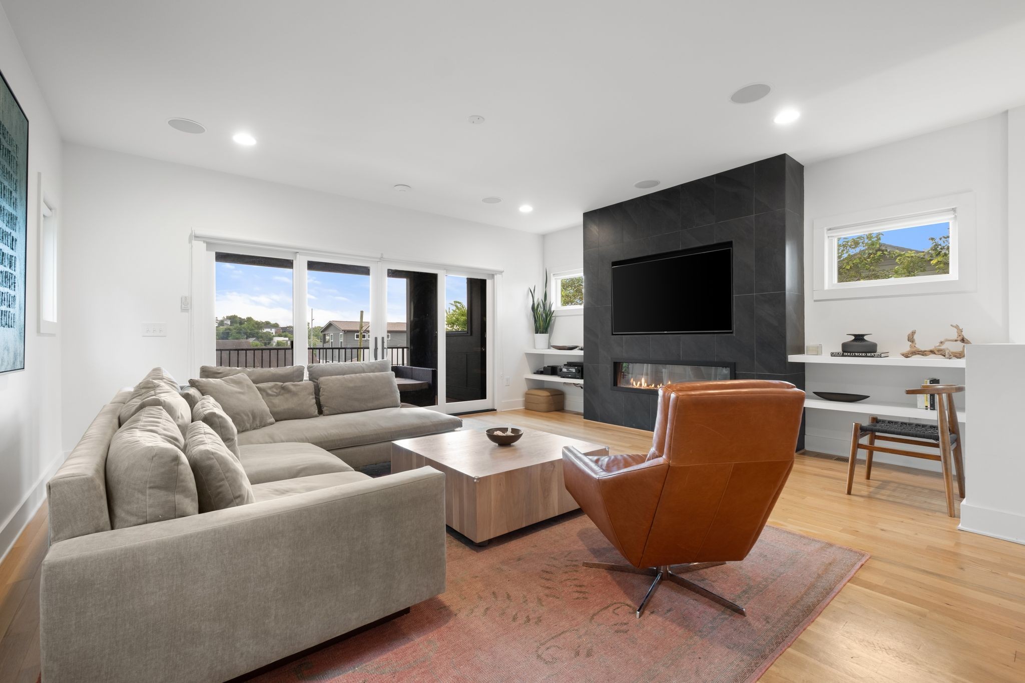 Step inside to a thoughtfully designed interior featuring real hardwood floors throughout, a sleek electric fireplace, and a designer-curated lighting package. Oversized windows flood every room with light, highlighting the home’s clean lines and modern aesthetic.