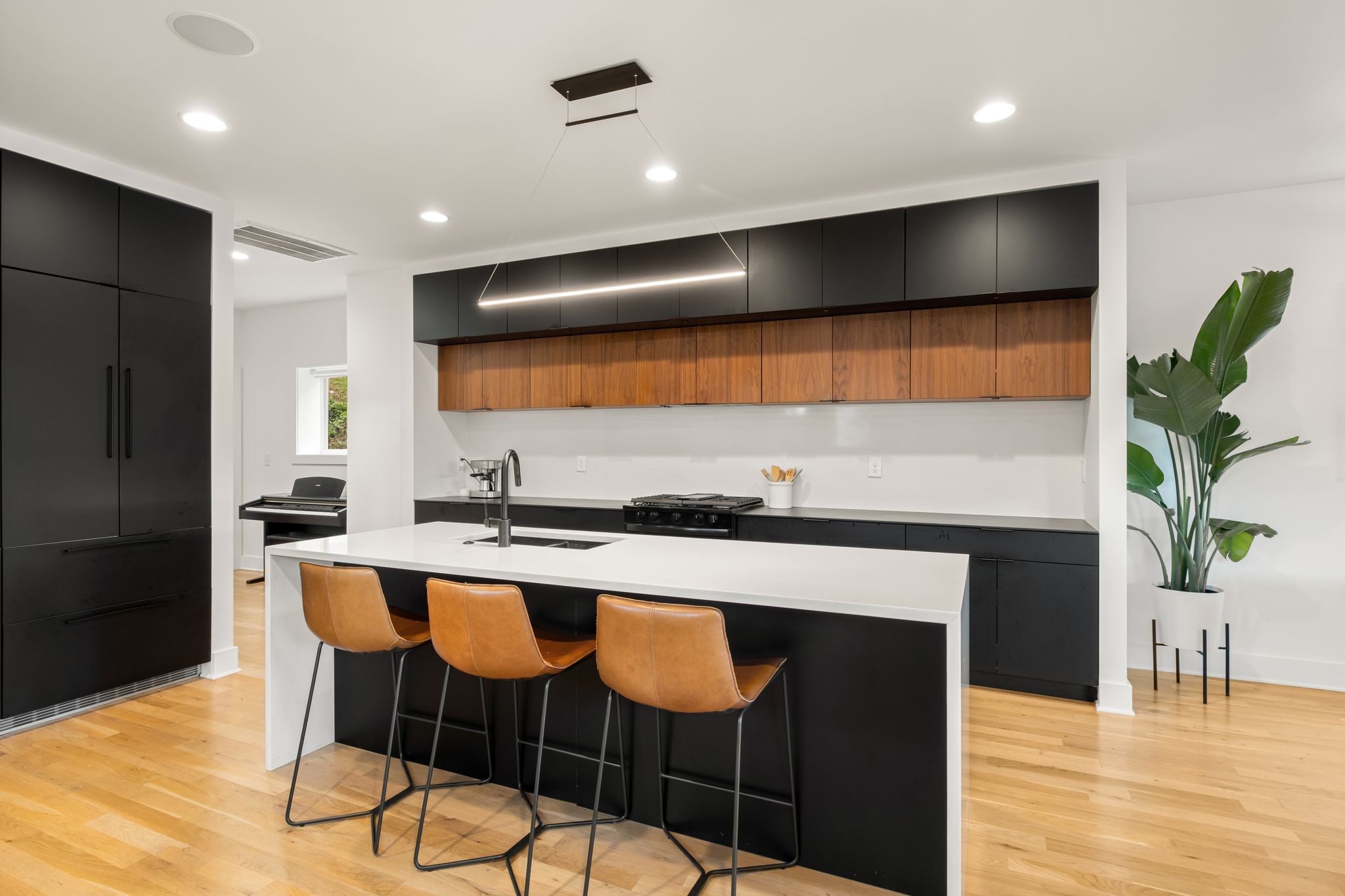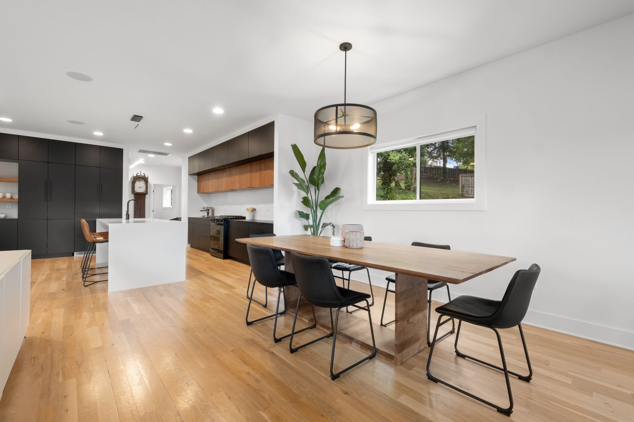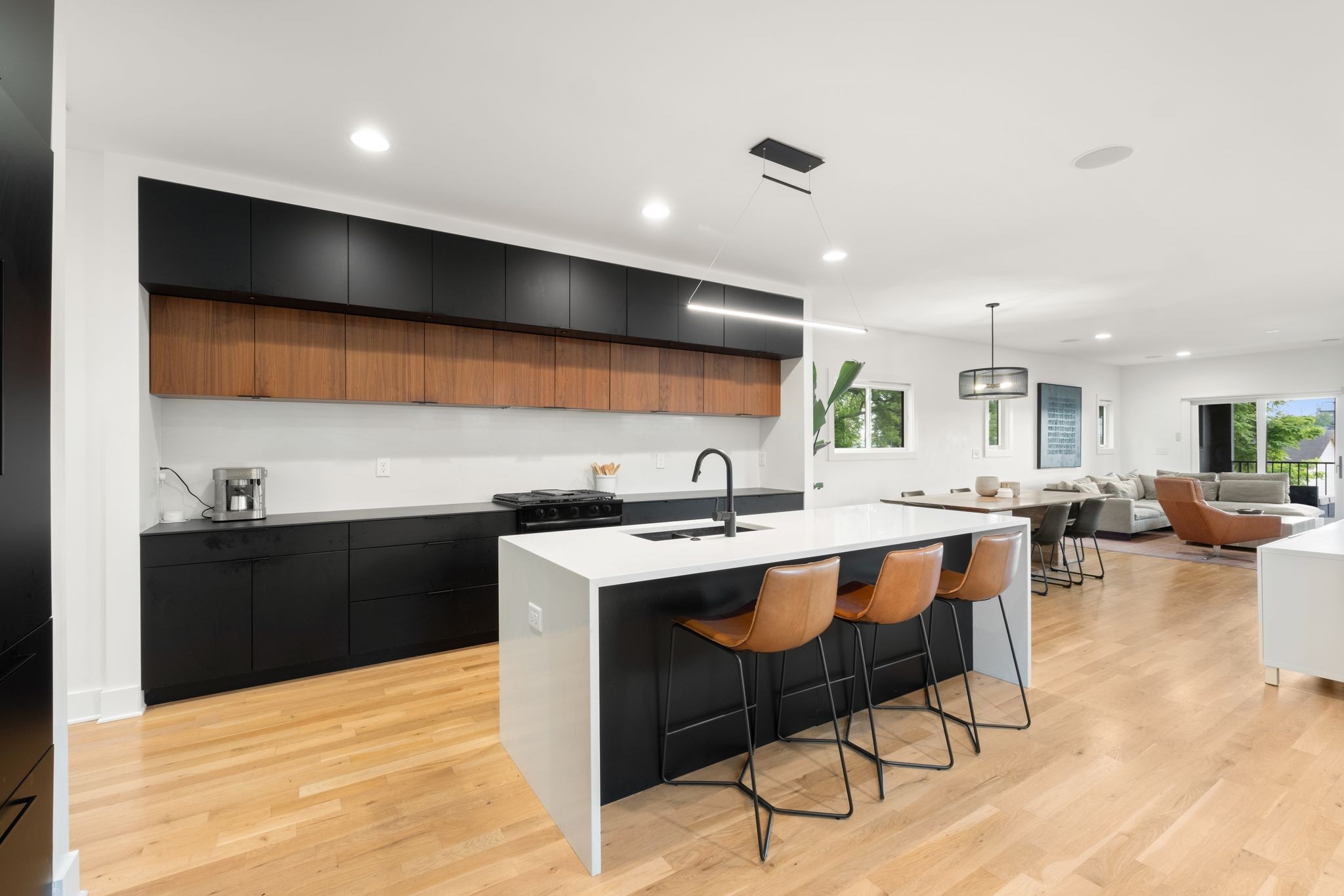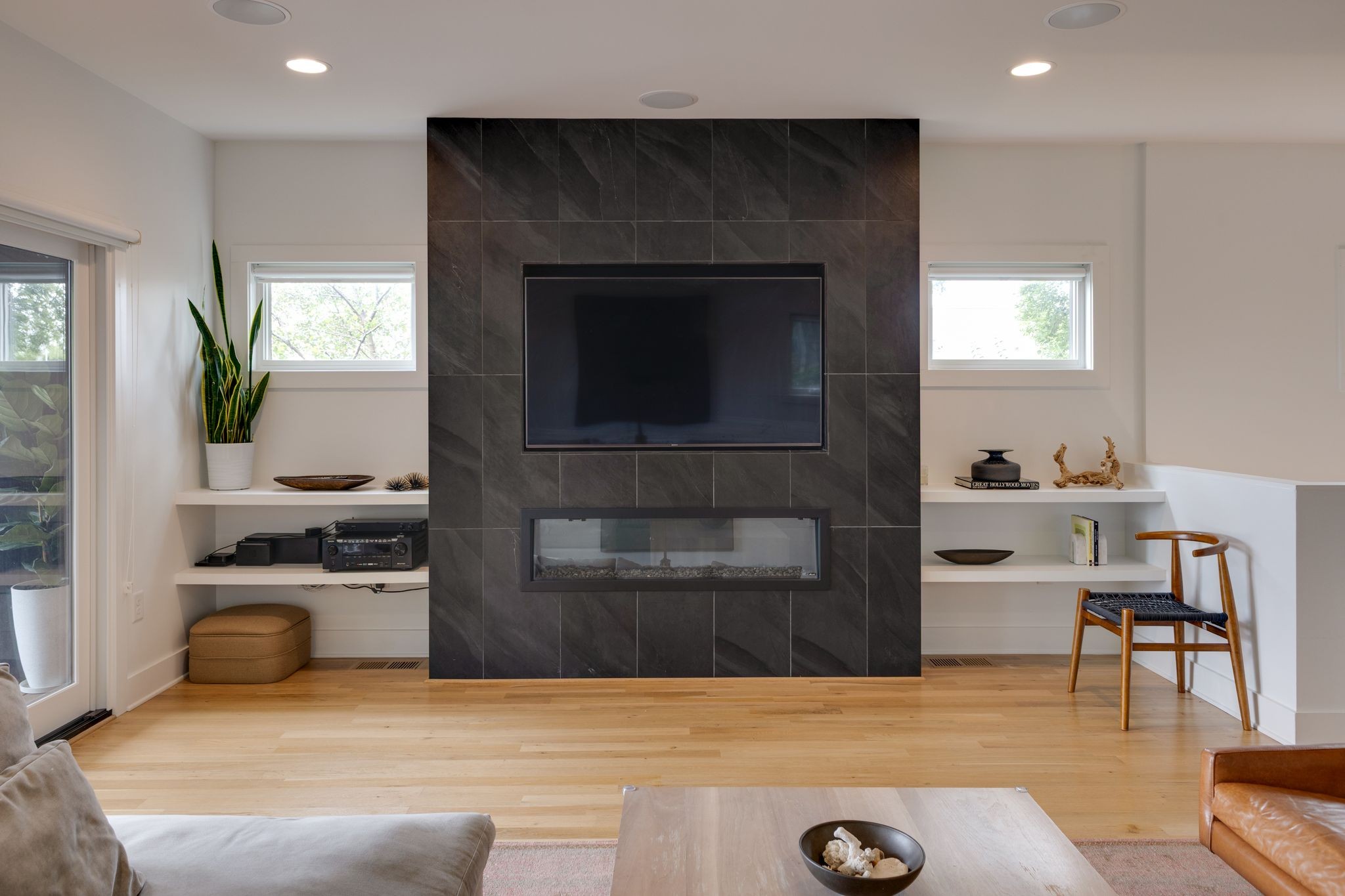 Step inside to a thoughtfully designed interior featuring real hardwood floors throughout, a sleek electric fireplace, and a designer-curated lighting package. Oversized windows flood every room with light, highlighting the home’s clean lines and modern aesthetic.