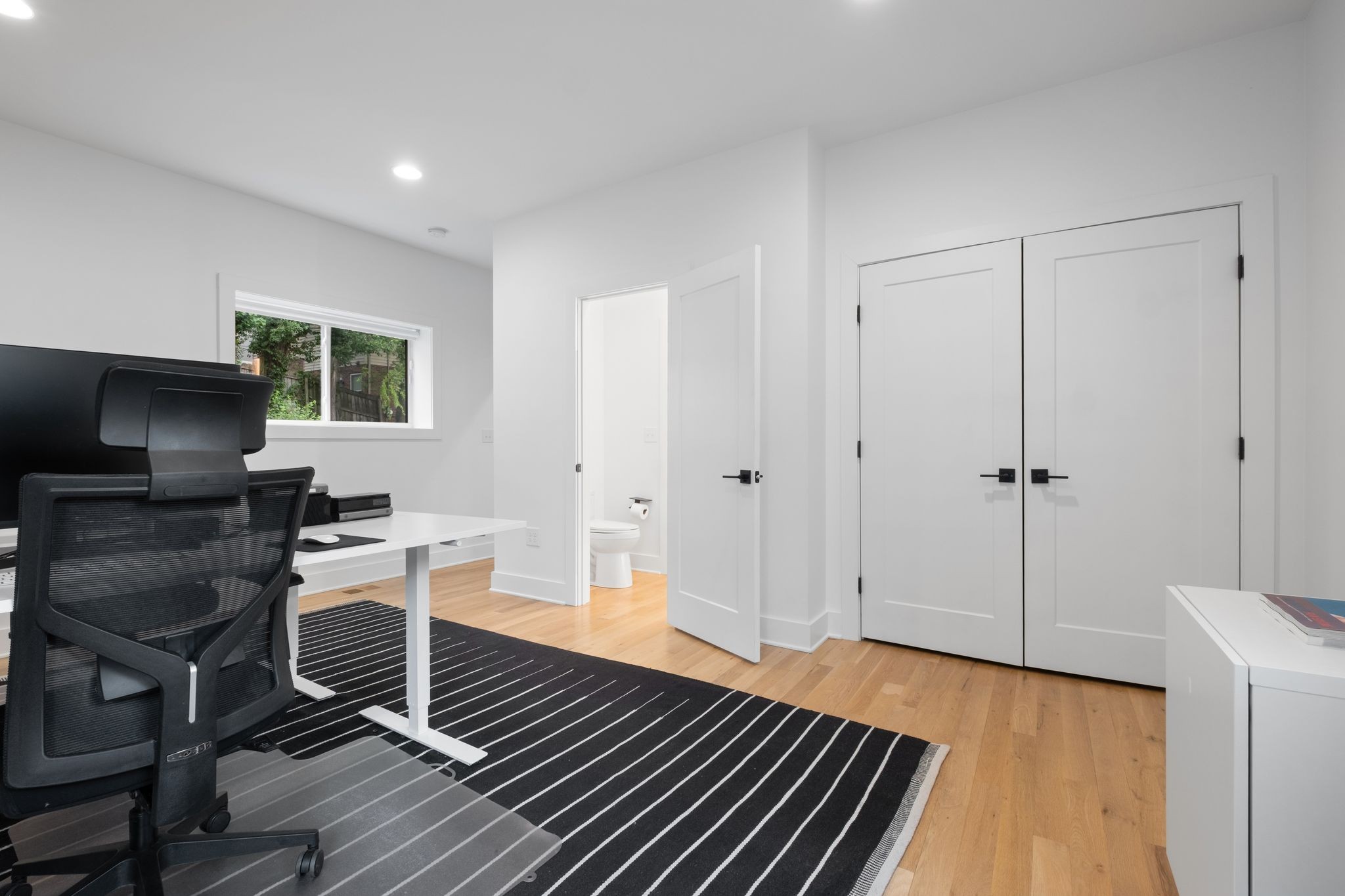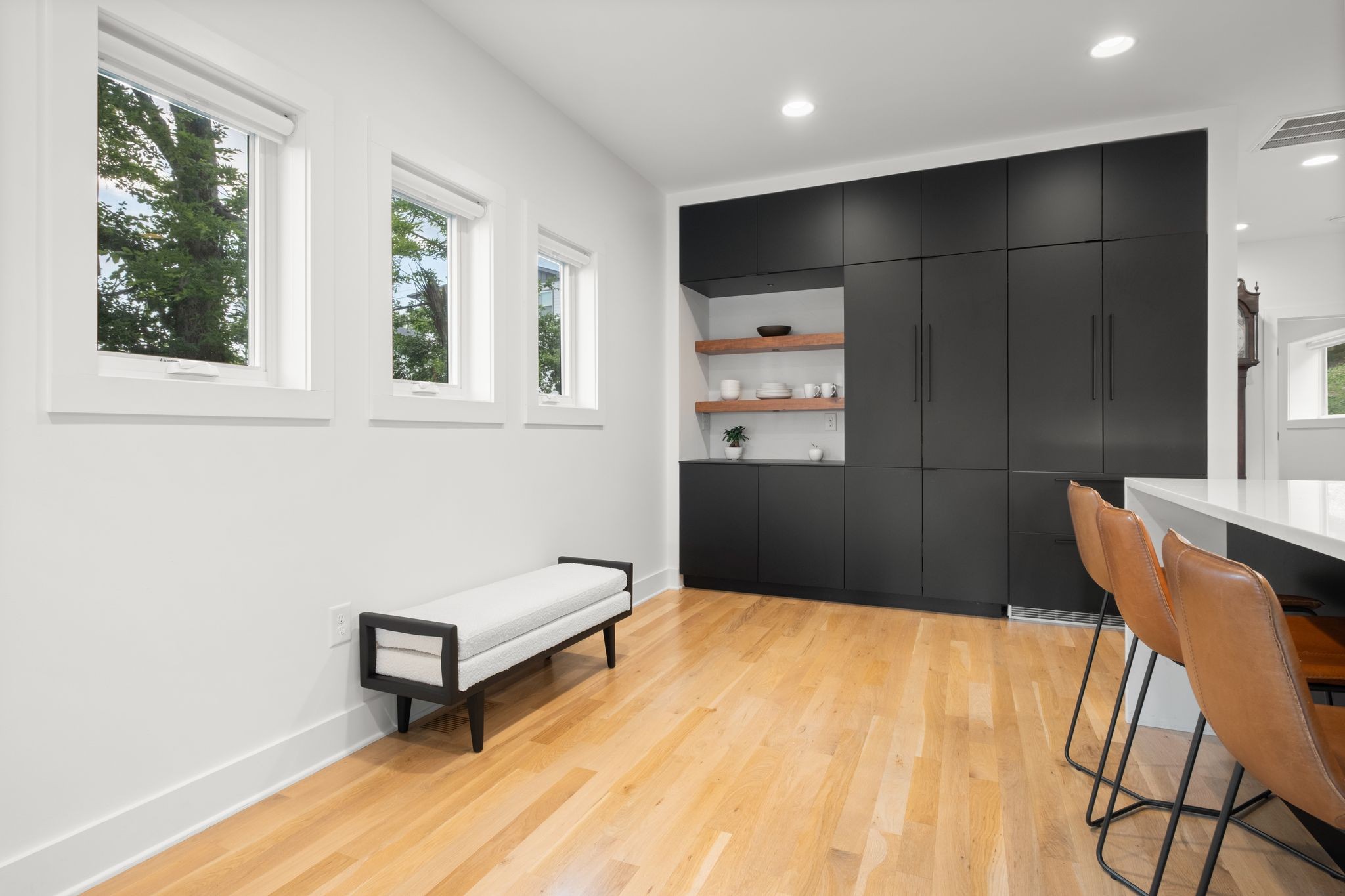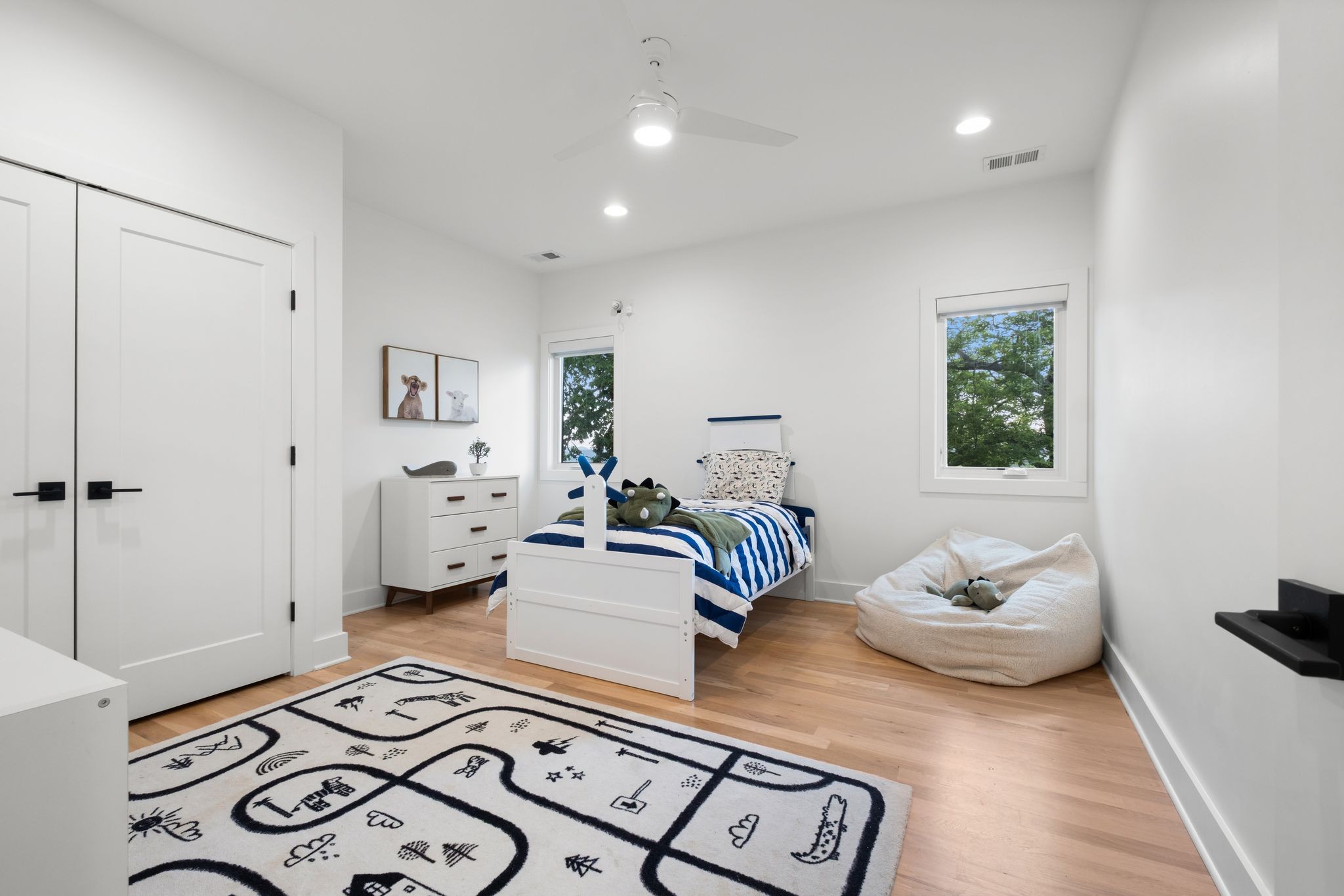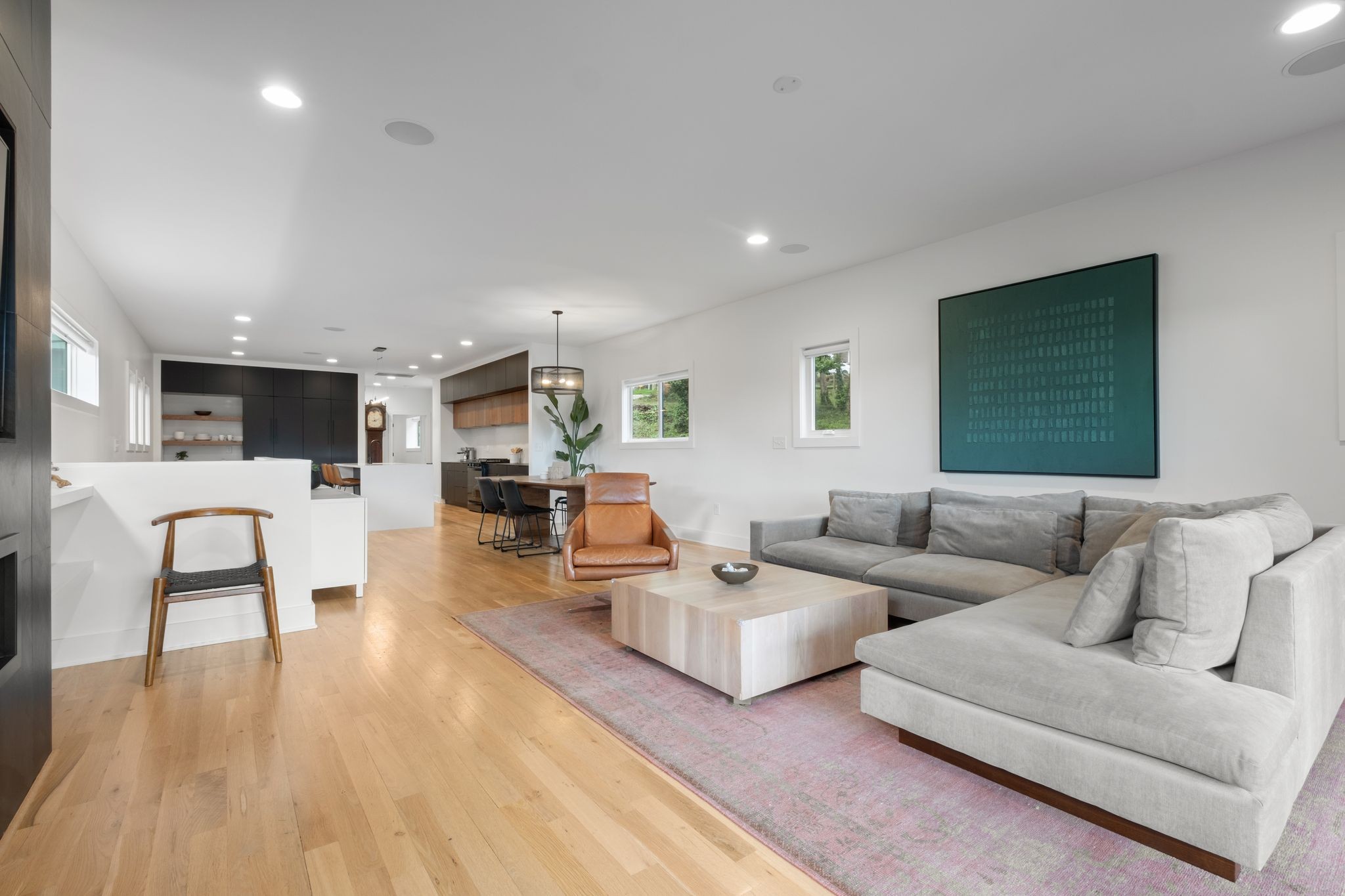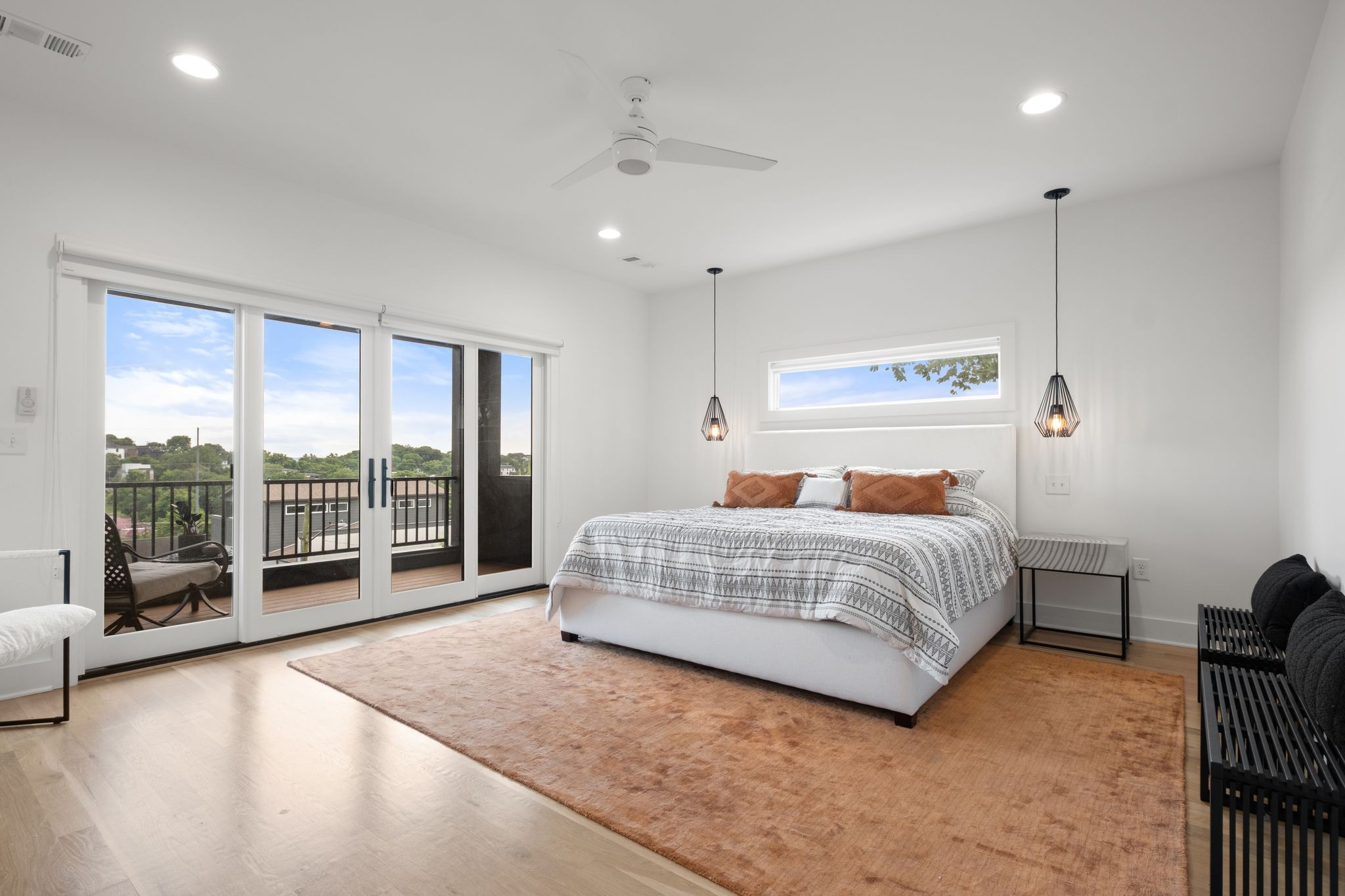 Step inside to a thoughtfully designed interior featuring real hardwood floors throughout, a sleek electric fireplace, and a designer-curated lighting package. Oversized windows flood every room with light, highlighting the home’s clean lines and modern aesthetic.