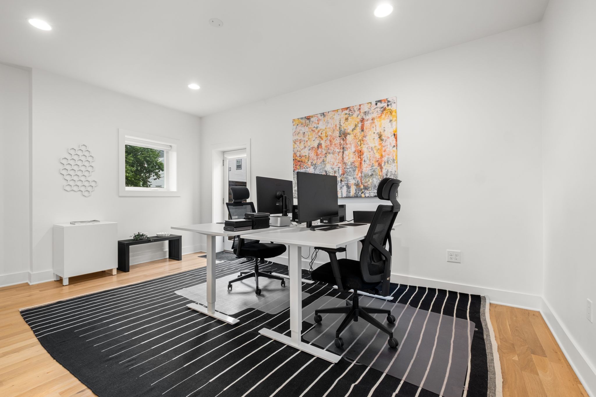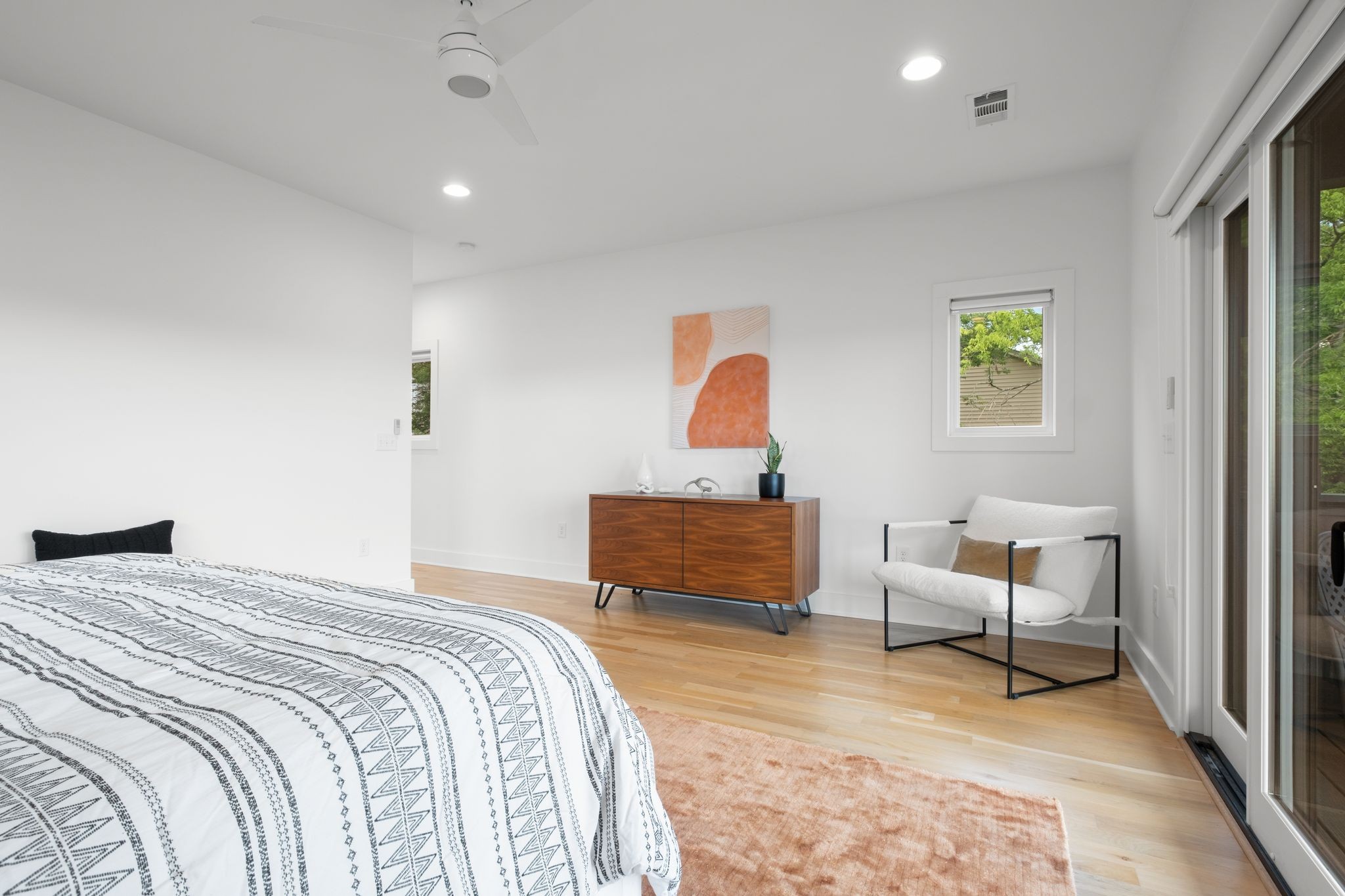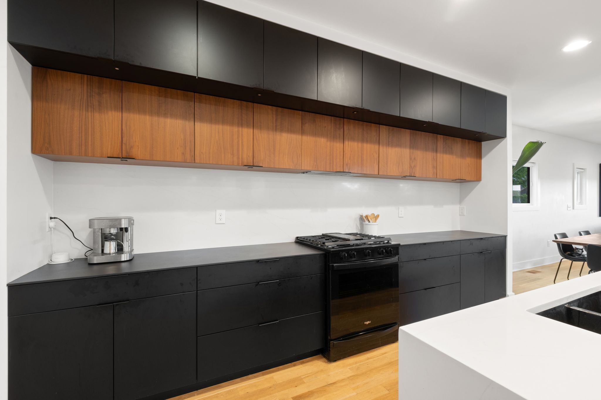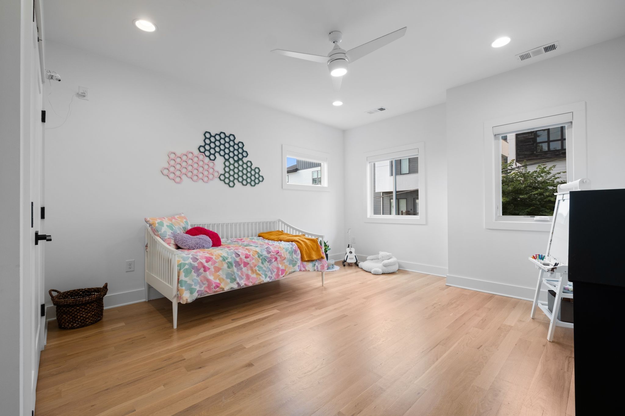 Step inside to a thoughtfully designed interior featuring real hardwood floors throughout, a sleek electric fireplace, and a designer-curated lighting package. Oversized windows flood every room with light, highlighting the home’s clean lines and modern aesthetic.