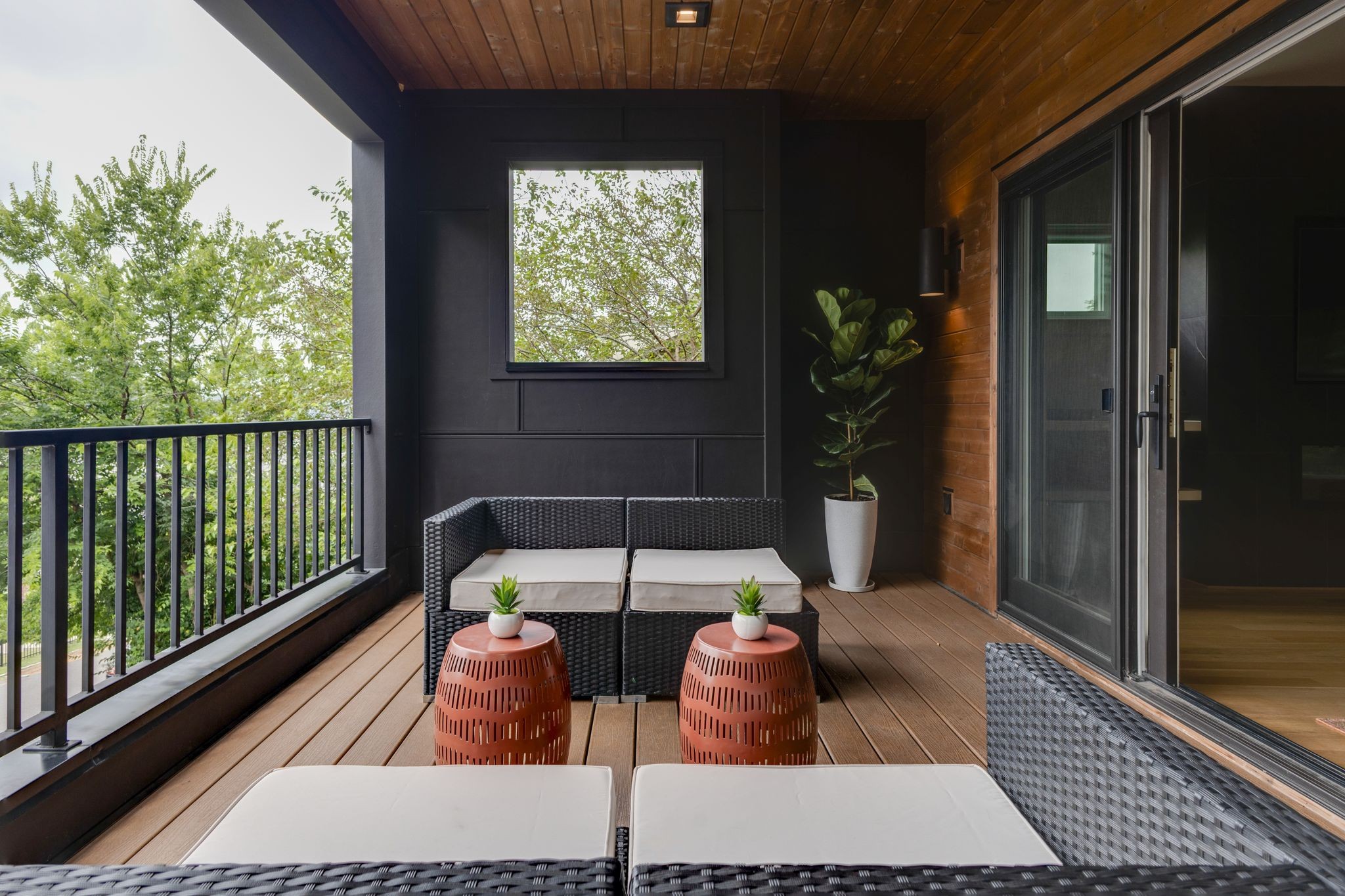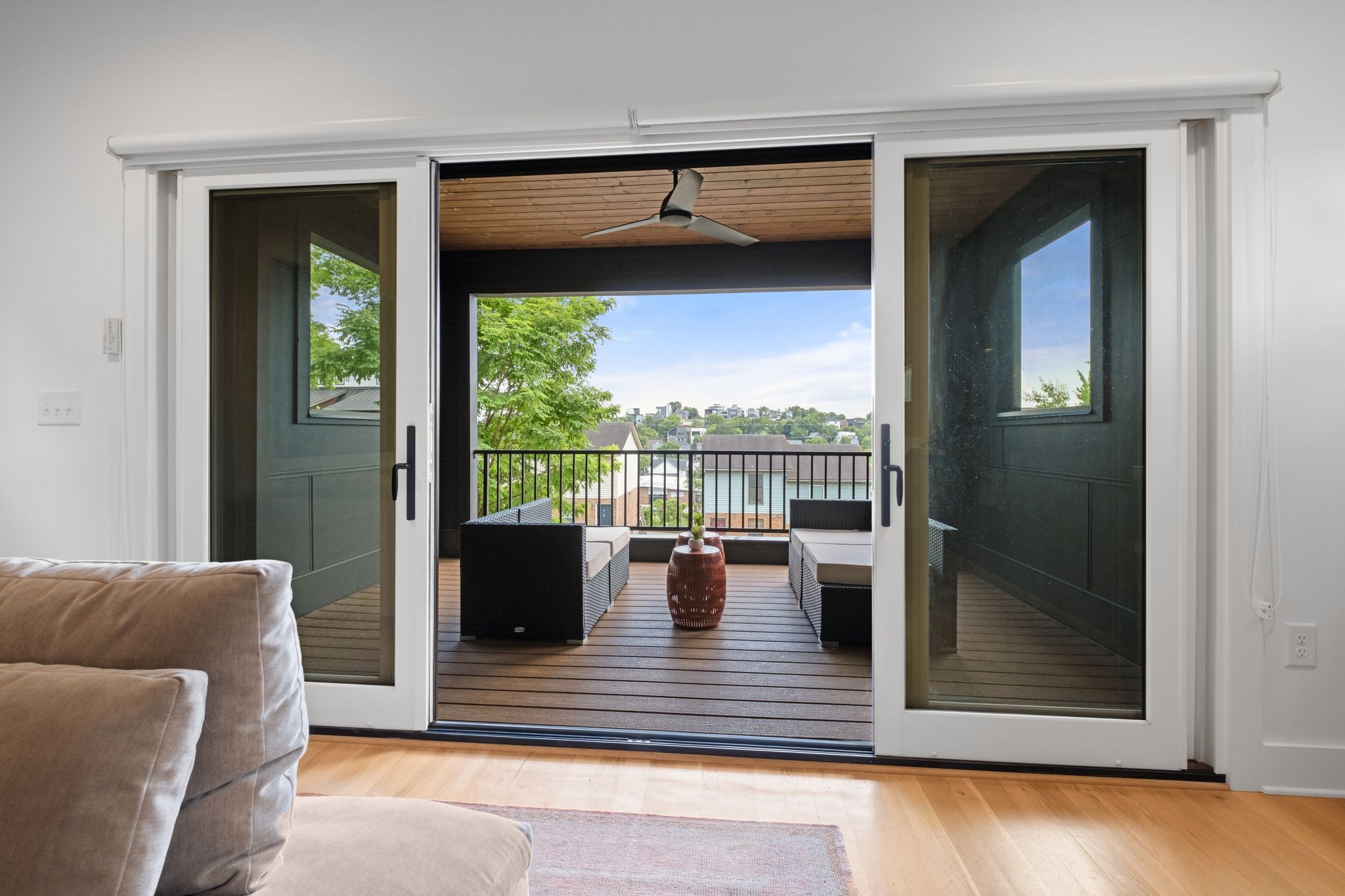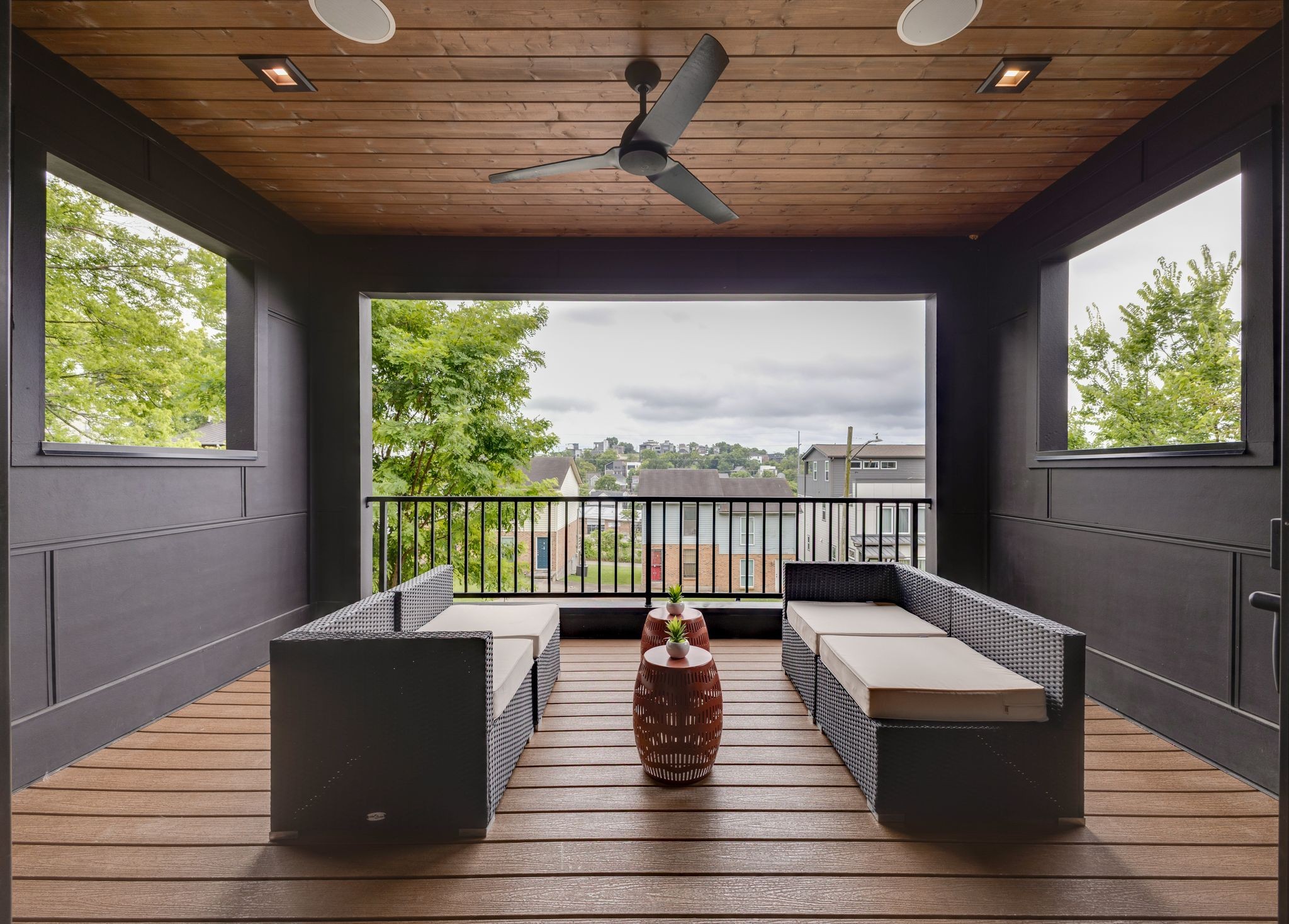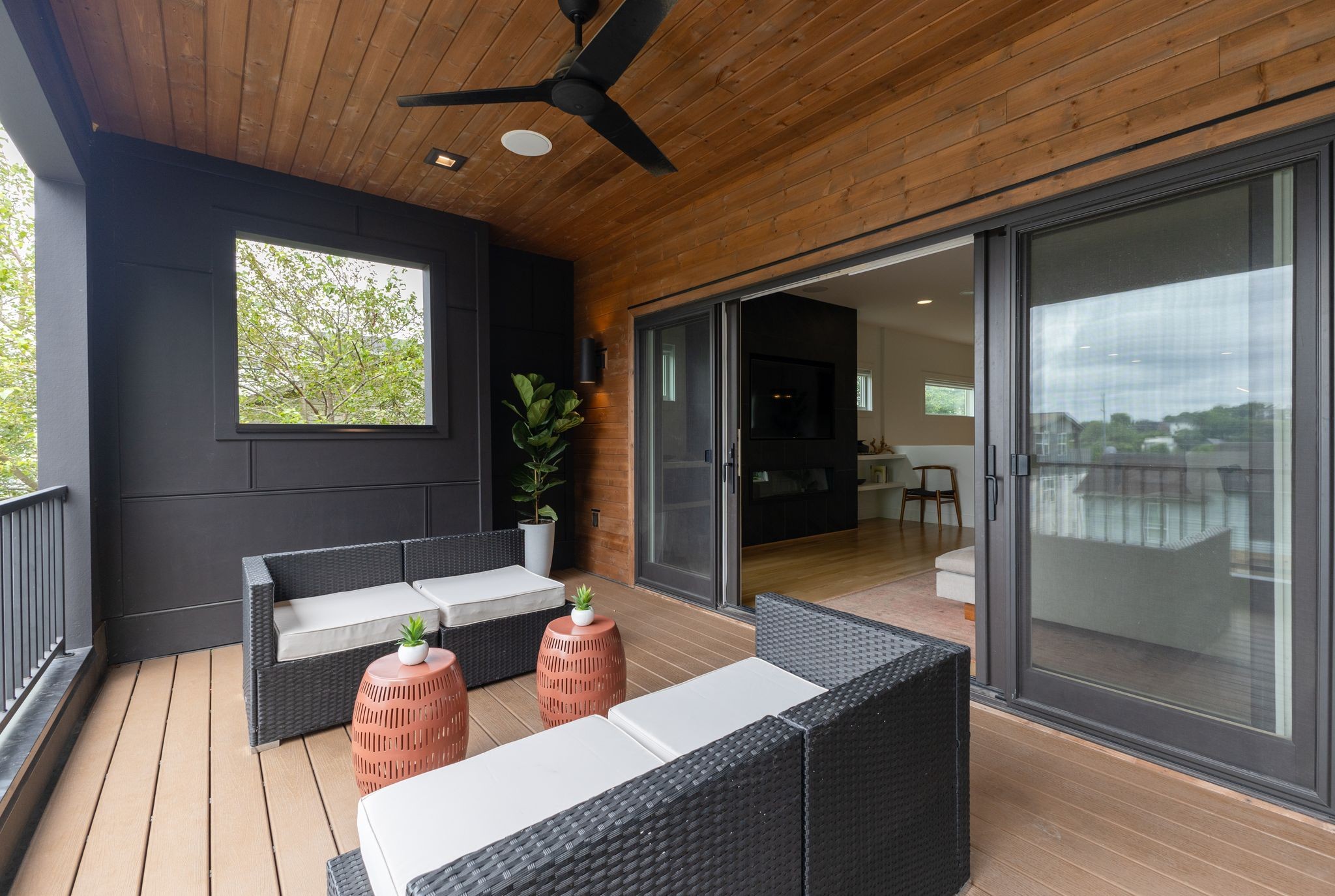 Upstairs, the second-floor front terrace is built for entertaining, with durable Trex decking, built-in speakers, a ceiling fan, and hardwired lighting. The bedroom level features a dedicated laundry room and ample storage throughout.