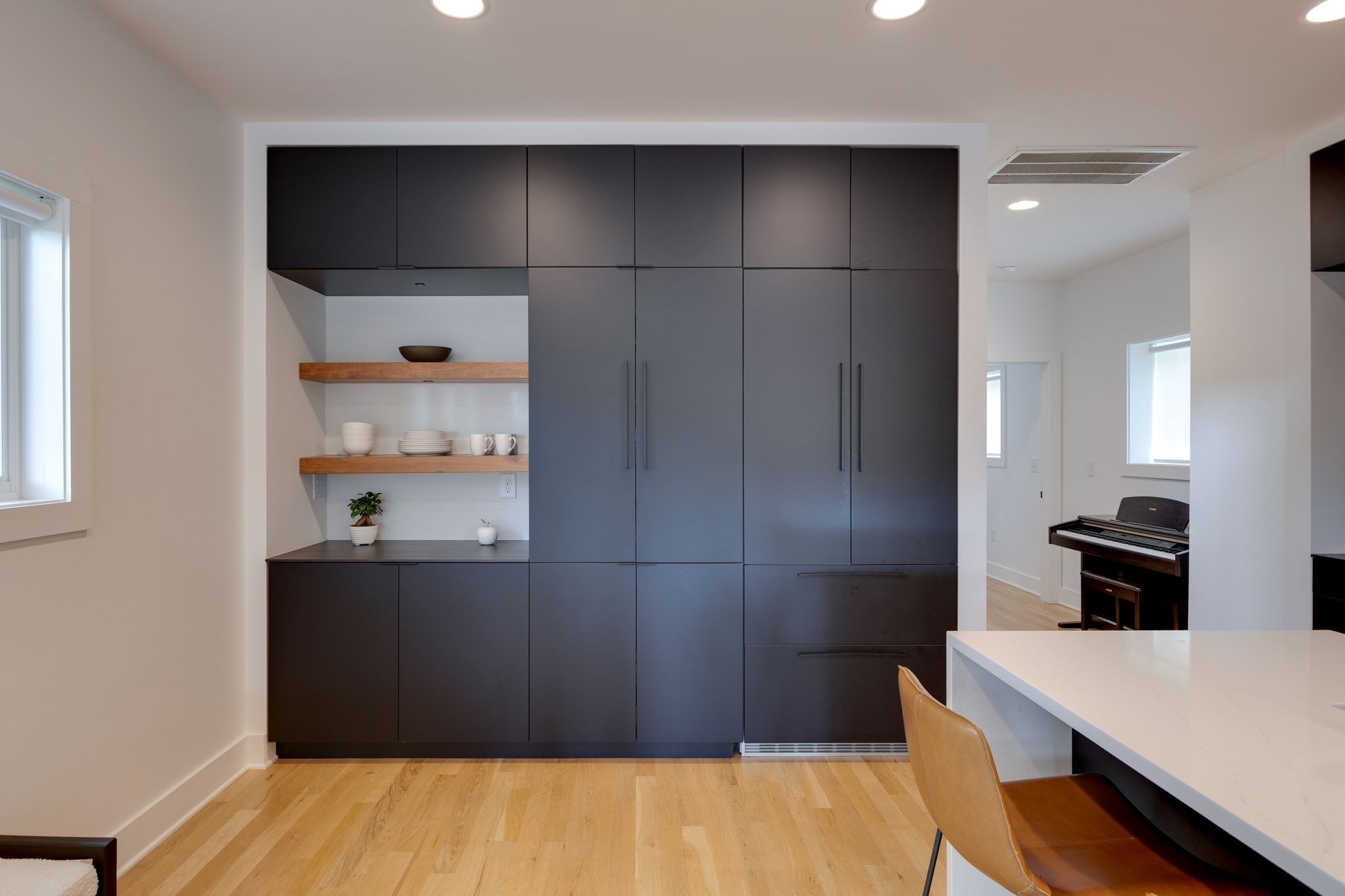 The chef’s kitchen is a showstopper, with open shelving, a Liebherr refrigerator, gas Whirlpool 4-burner range with center grill, Asko dishwasher, built-in pantry cabinetry with pull-out drawers, and a microwave—all designed for cooking and entertaining with ease.