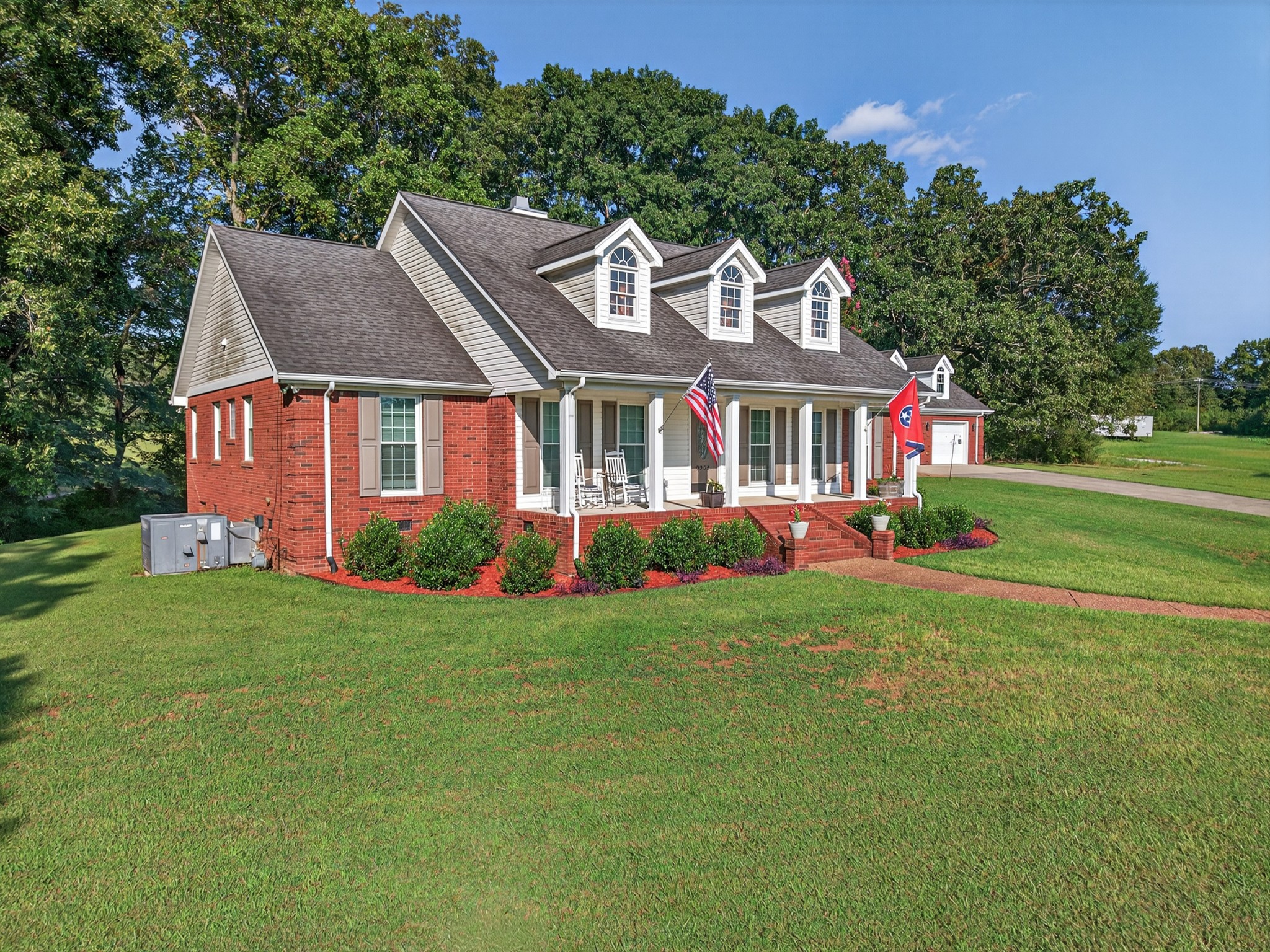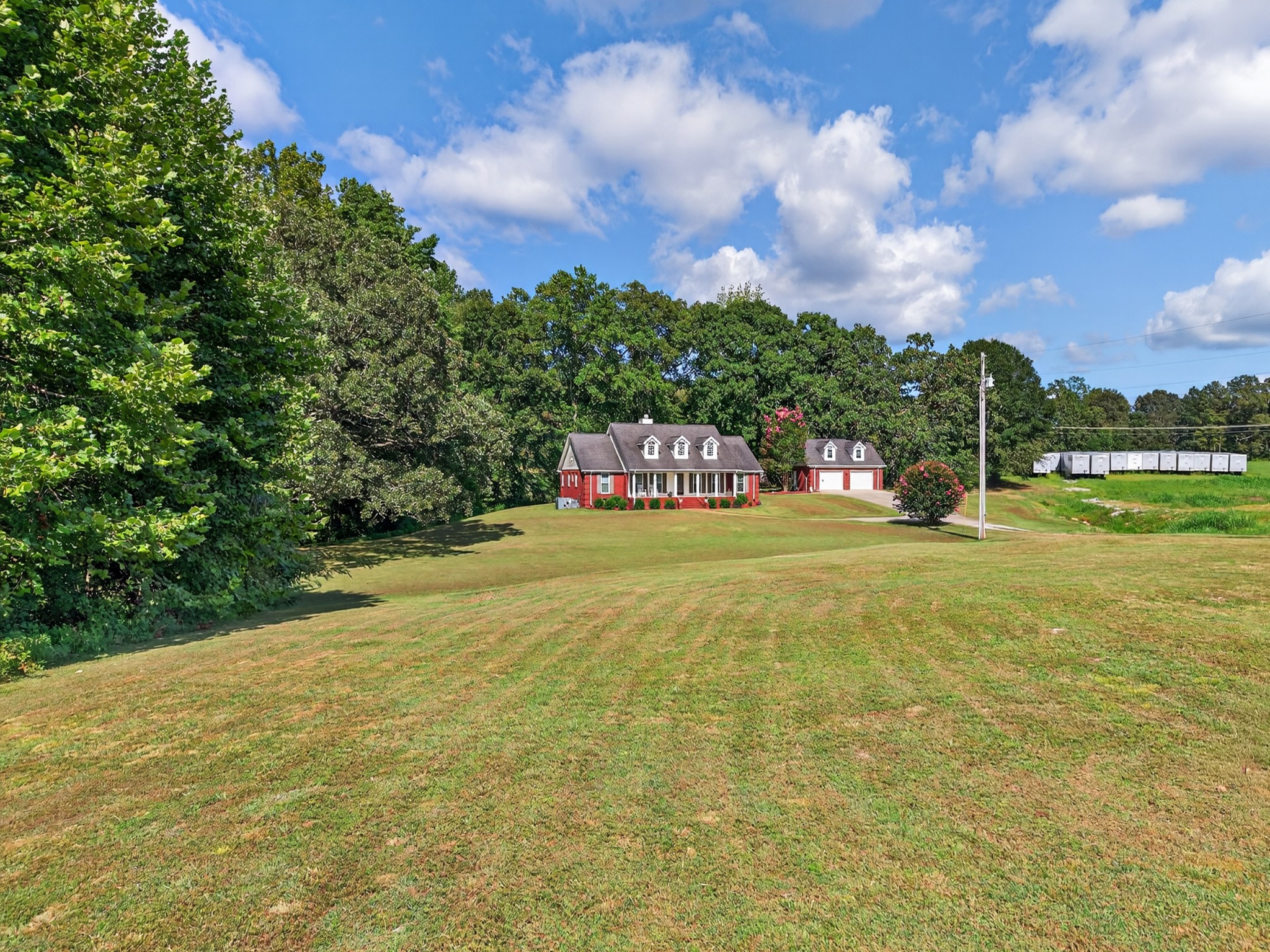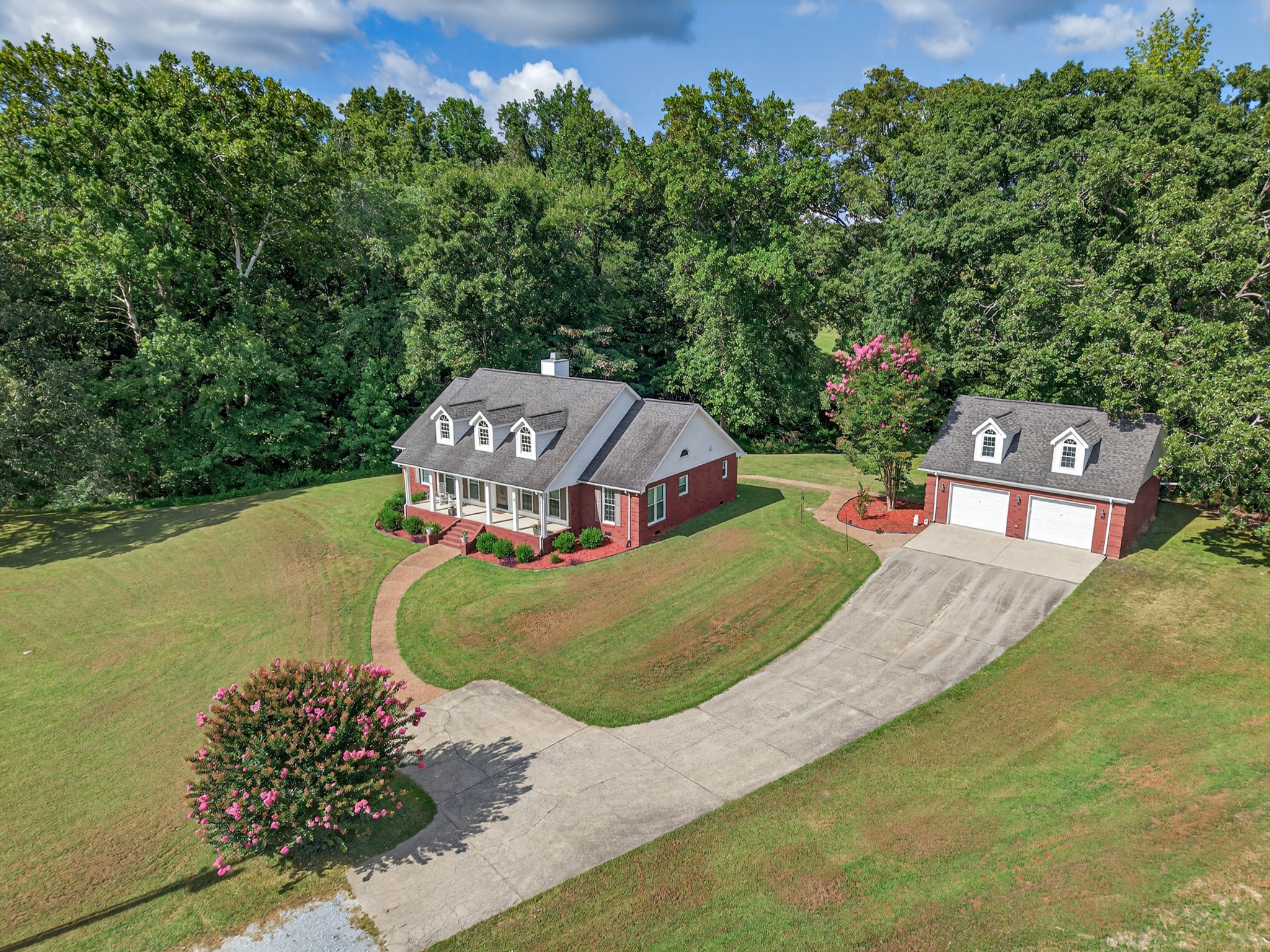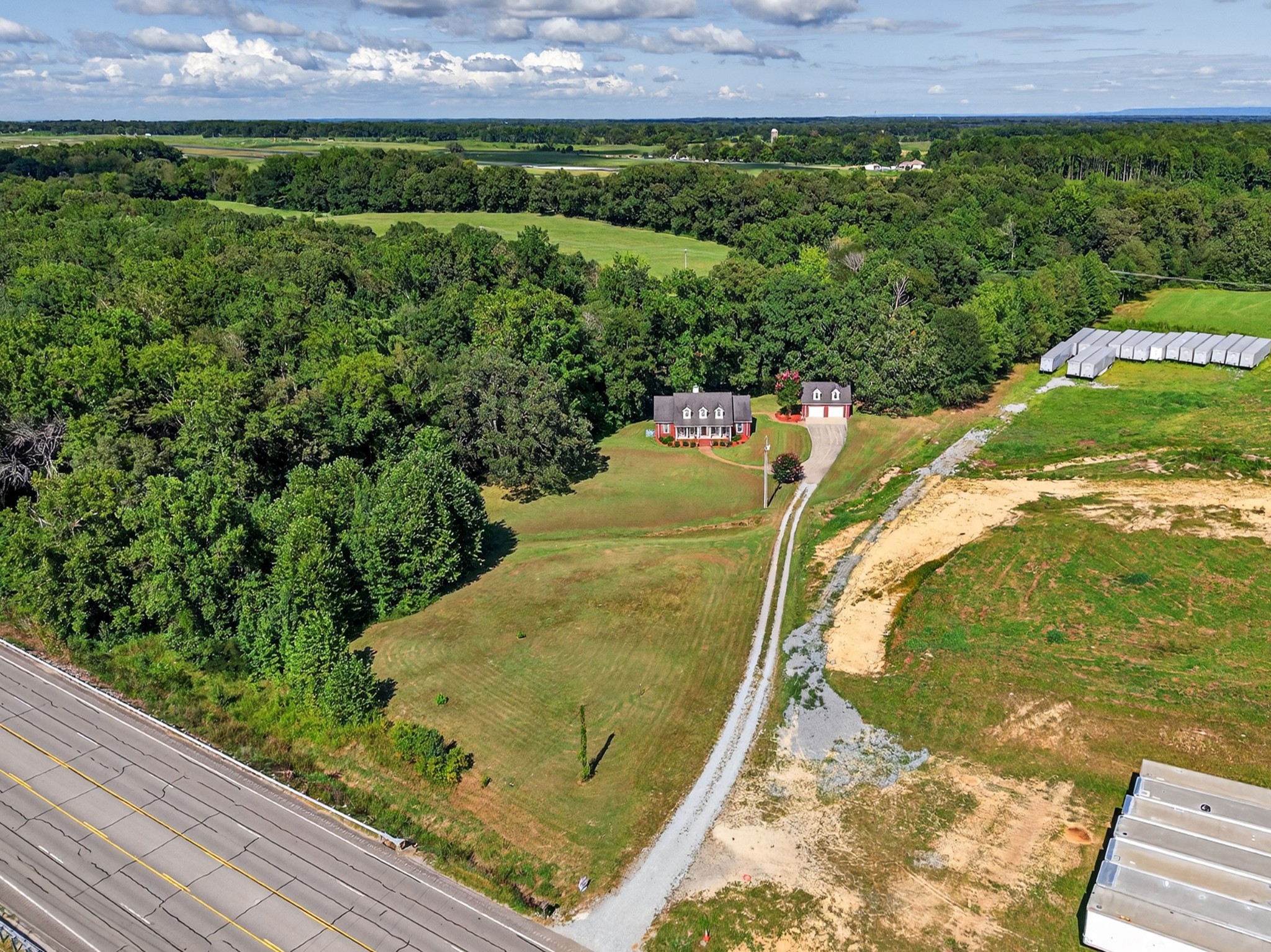 Welcome to your own mini estate just minutes from the Tennessee/Alabama line! This beautifully updated solid brick home on 2.63 acres offers the best of both worlds—highway visibility for future possibilities yet tucked back for peaceful privacy. A charming creek borders one side of the property, adding to its serene feel. Step inside to modern, neutral tones, granite counters, painted cabinets, stainless steel appliances. Enjoy the spacious formal dining room with built-ins, a casual dining nook, and a cozy family room with gas log fireplace. The owner’s suite features a glamour bath you’ll love to unwind in. Relax on your screened, covered back porch and take in the beautiful setting. Outside, there’s a huge 24x30 detached 2-car garage with an upstairs storage area—perfect for a workshop or future hobby space. With 280 feet of Huntsville Highway frontage and general purpose zoning, this property holds endless potential—whether you keep it as your private haven or explore its commercial opportunities. Just 30 minutes to Huntsville and convenient to Fayetteville, this is the ideal spot for those wanting a touch of country living with all the amenities close by.