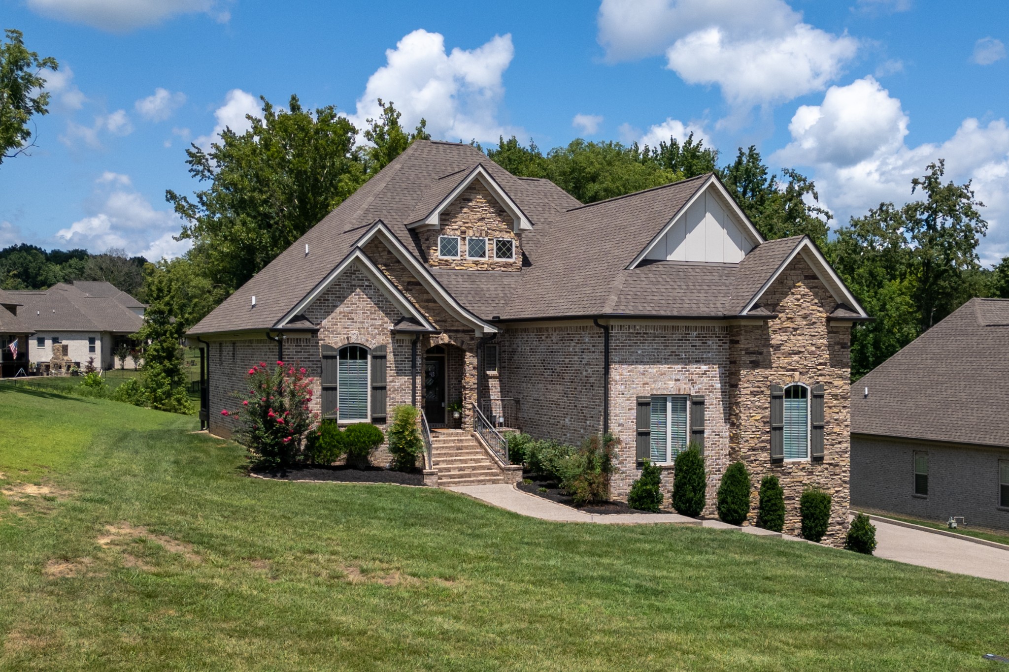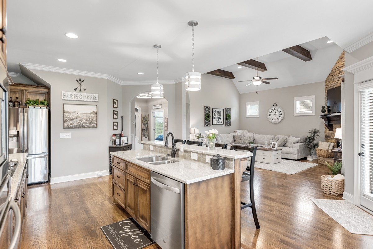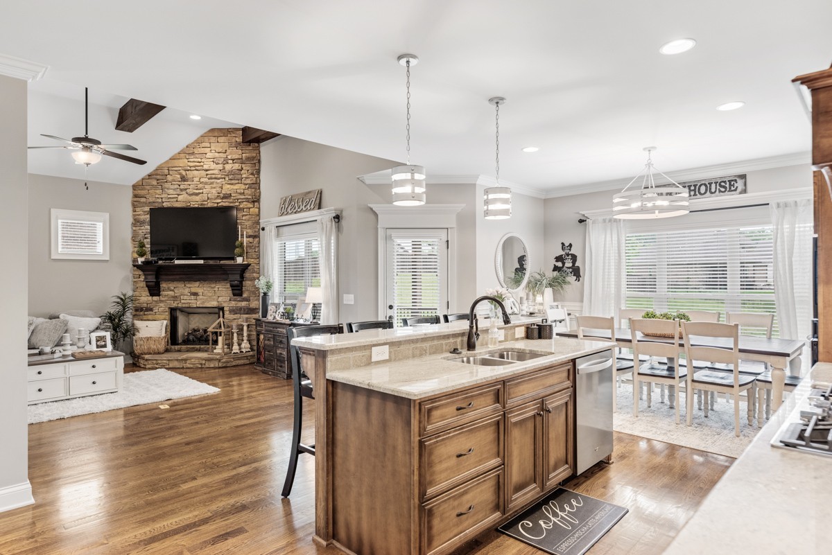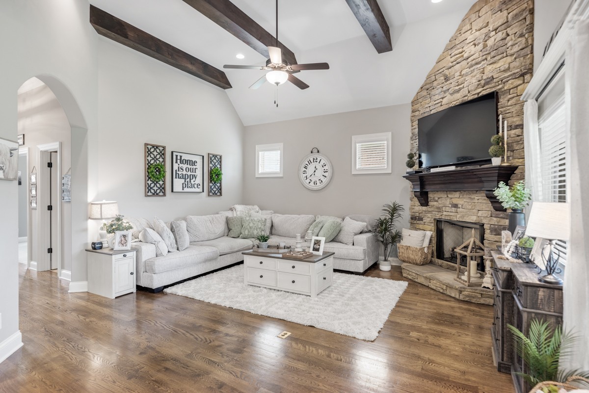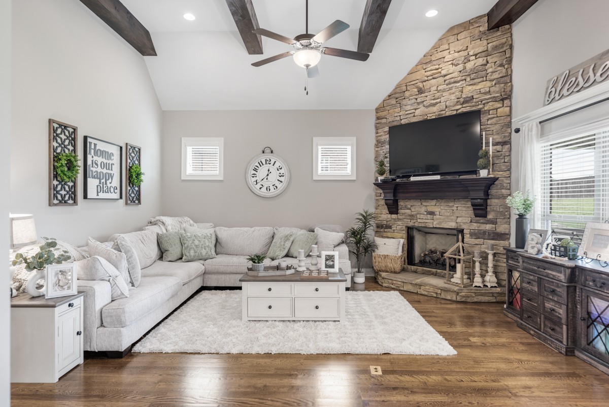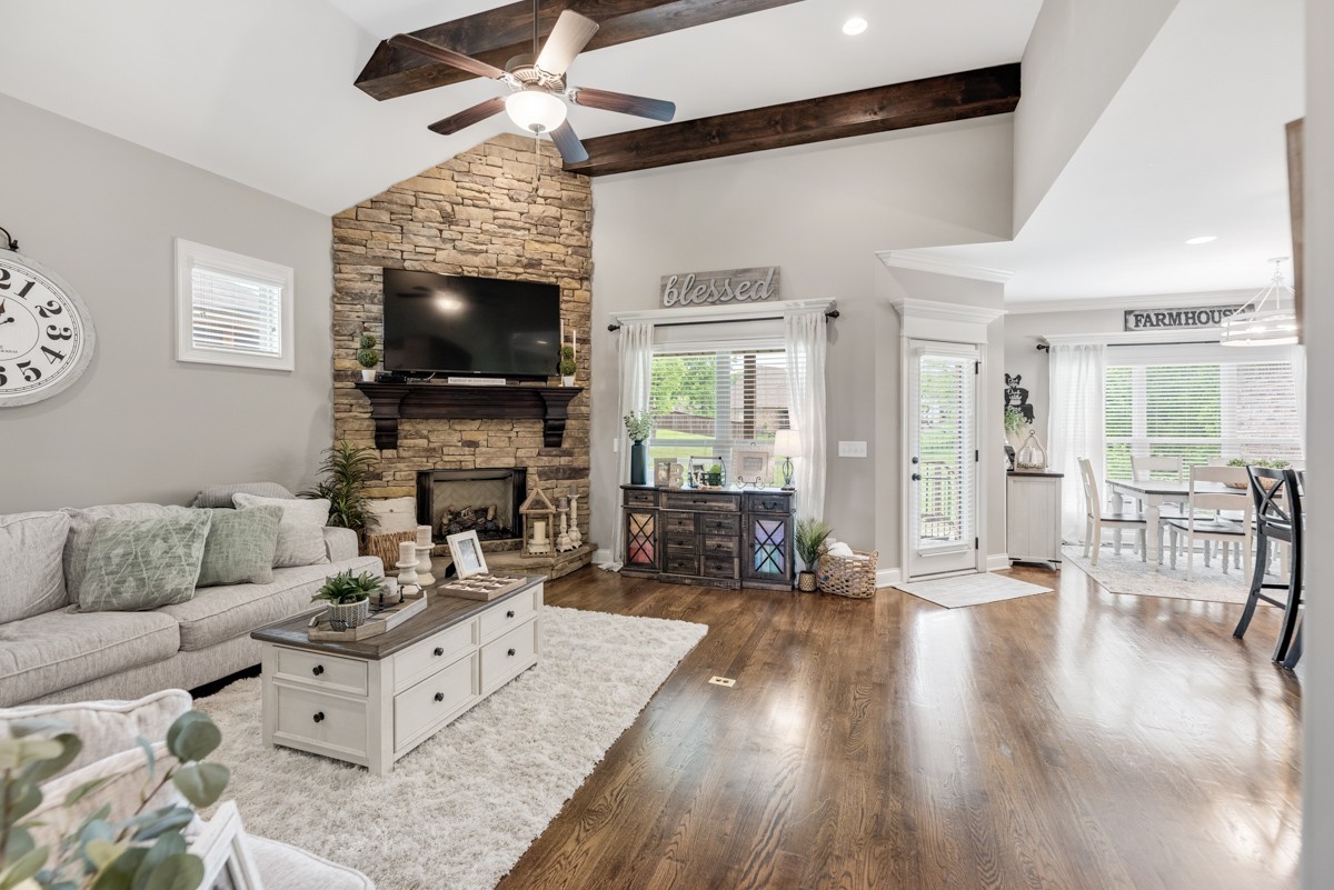 Inside, rich hardwood floors, custom trim, and an open-concept layout create a welcoming and modern living space. The living room centers around a striking stone fireplace, adding warmth and charm.