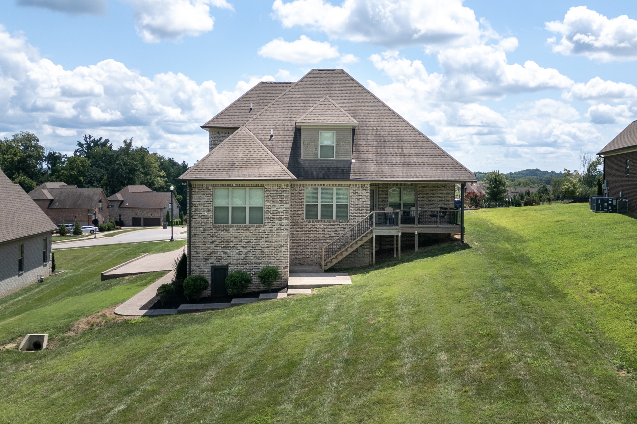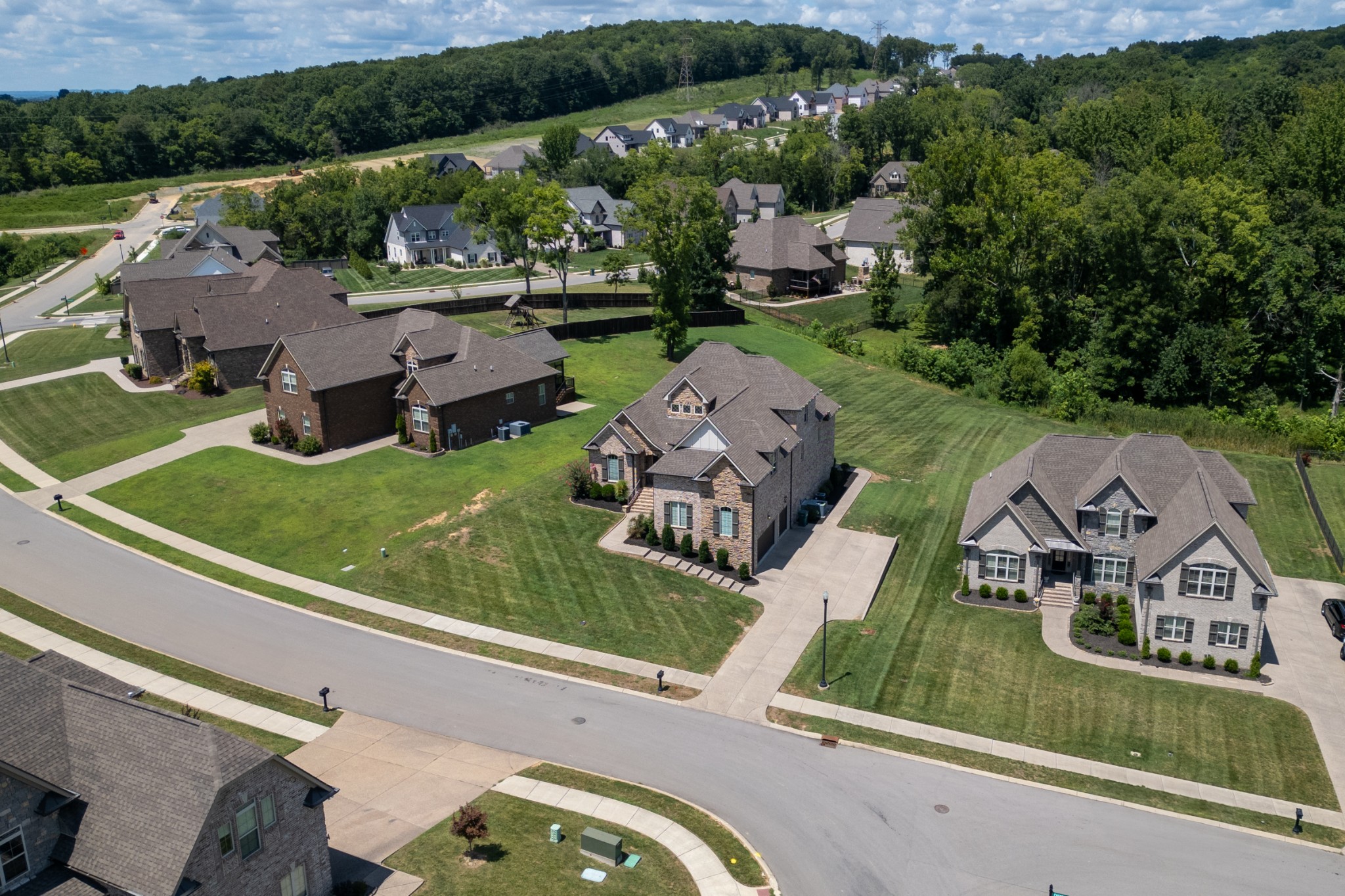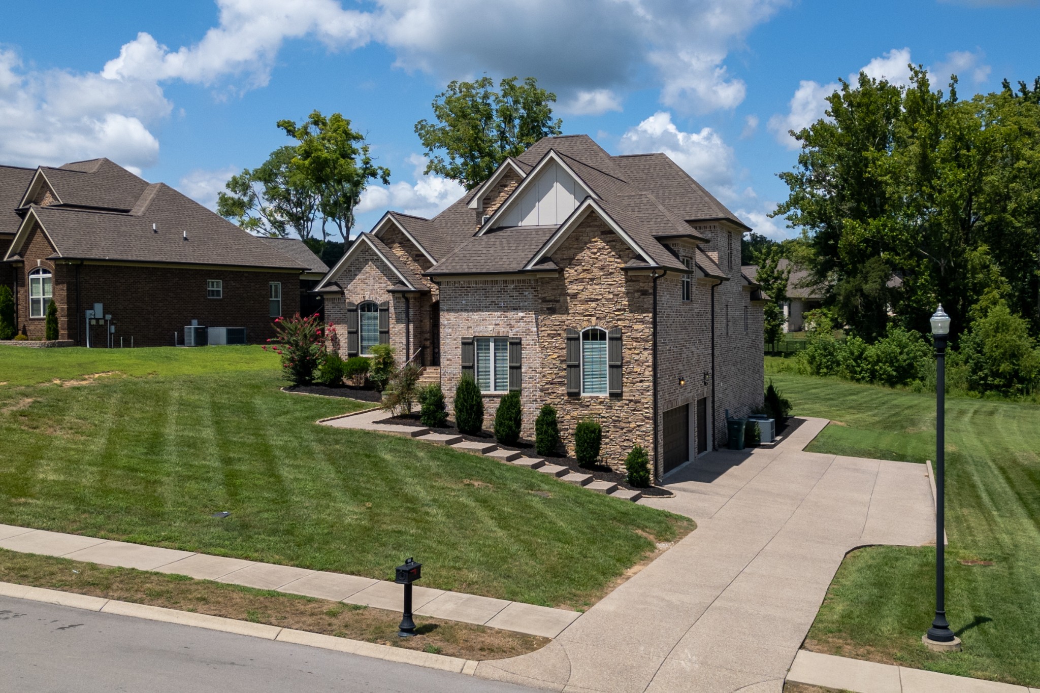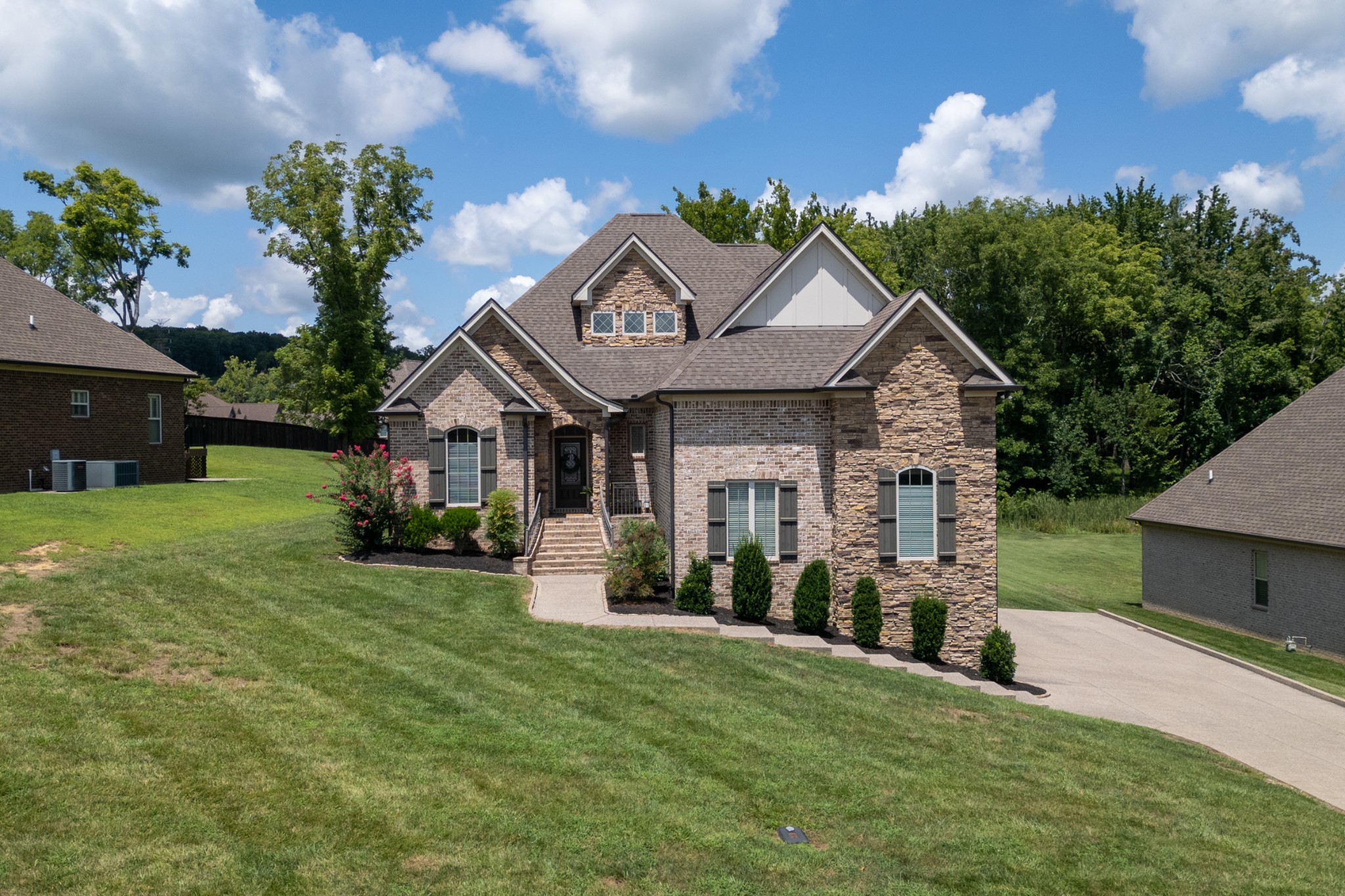 Inside, rich hardwood floors, custom trim, and an open-concept layout create a welcoming and modern living space. The living room centers around a striking stone fireplace, adding warmth and charm.