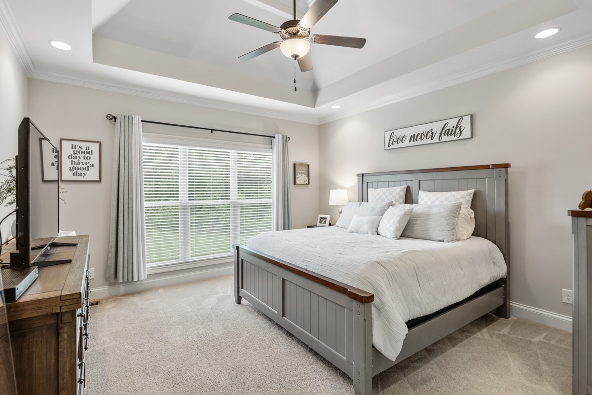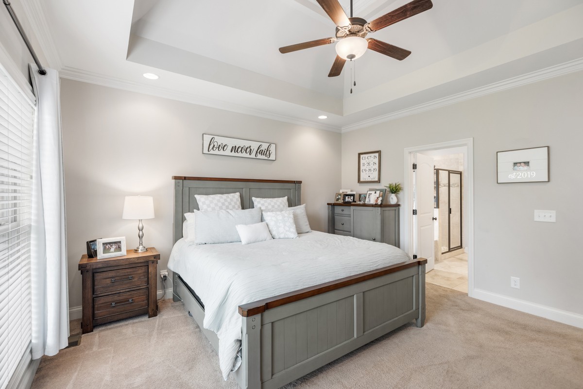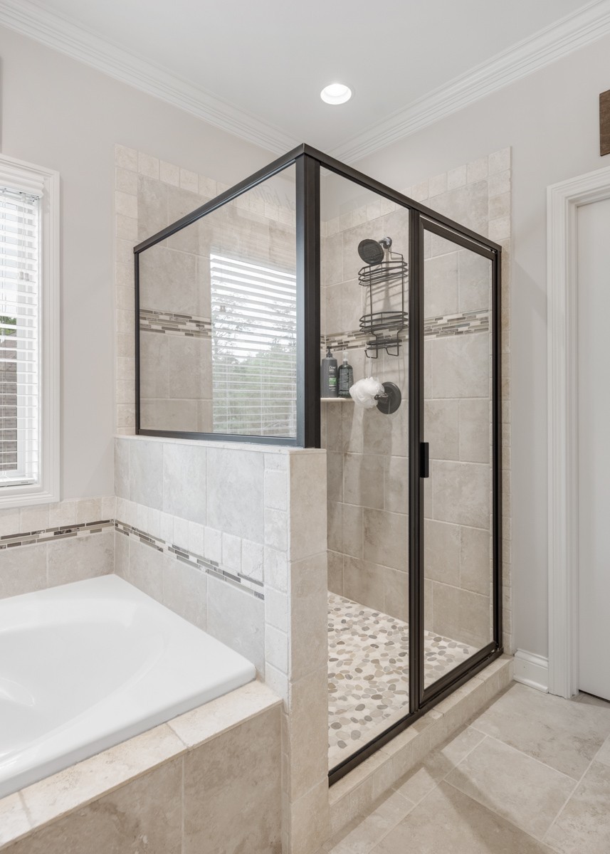 The main-level primary suite is a true retreat, featuring a luxurious bath with a walk-in tile shower, soaking tub, and dual vanities. A second bedroom on the main level provides flexibility for guests or a home office.