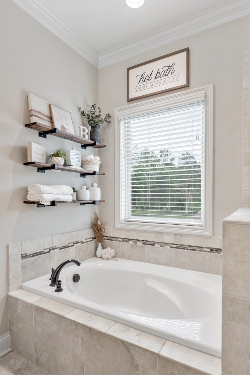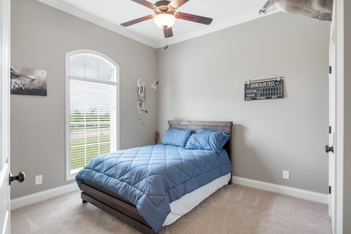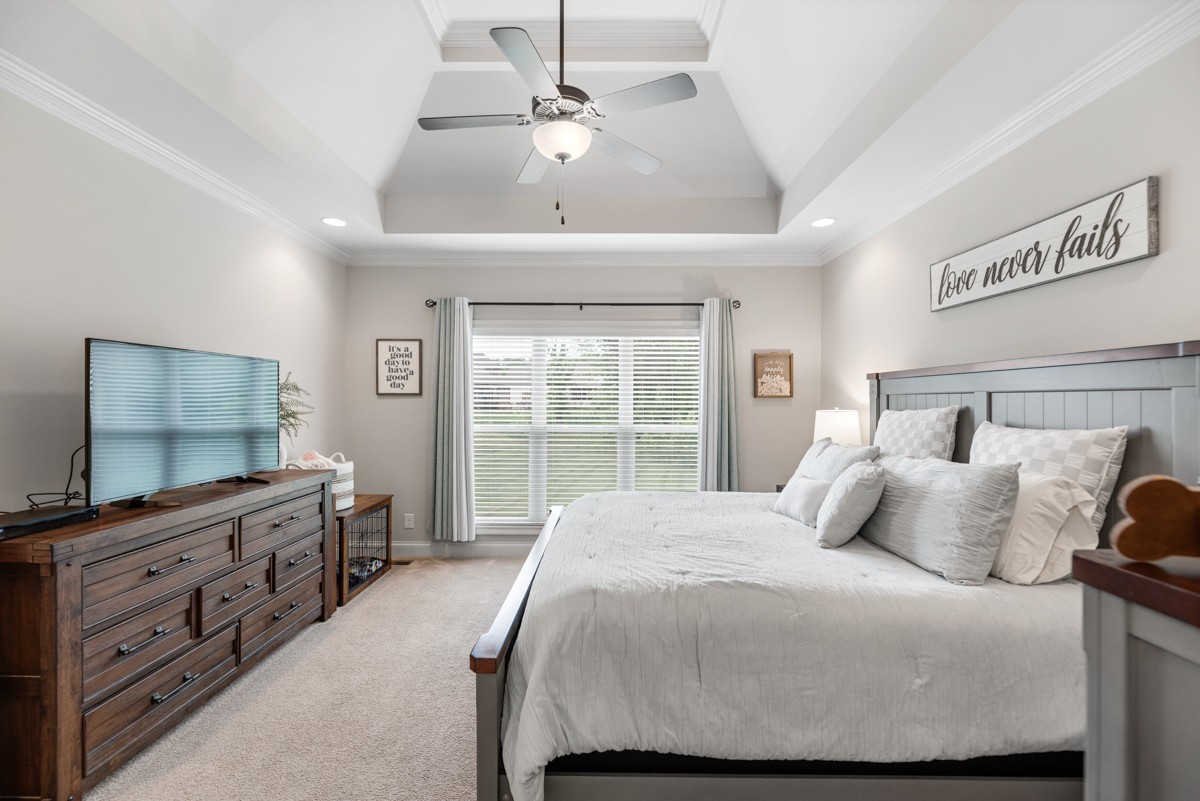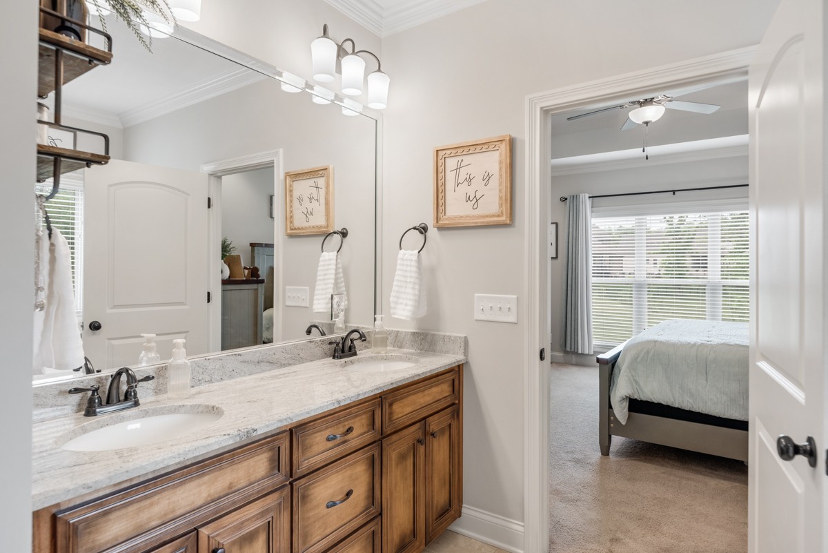 The main-level primary suite is a true retreat, featuring a luxurious bath with a walk-in tile shower, soaking tub, and dual vanities. A second bedroom on the main level provides flexibility for guests or a home office.