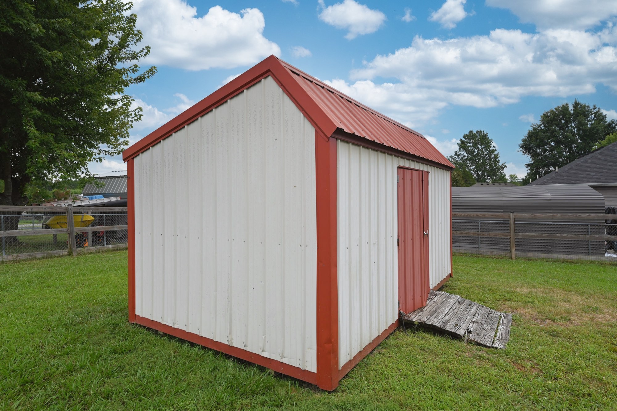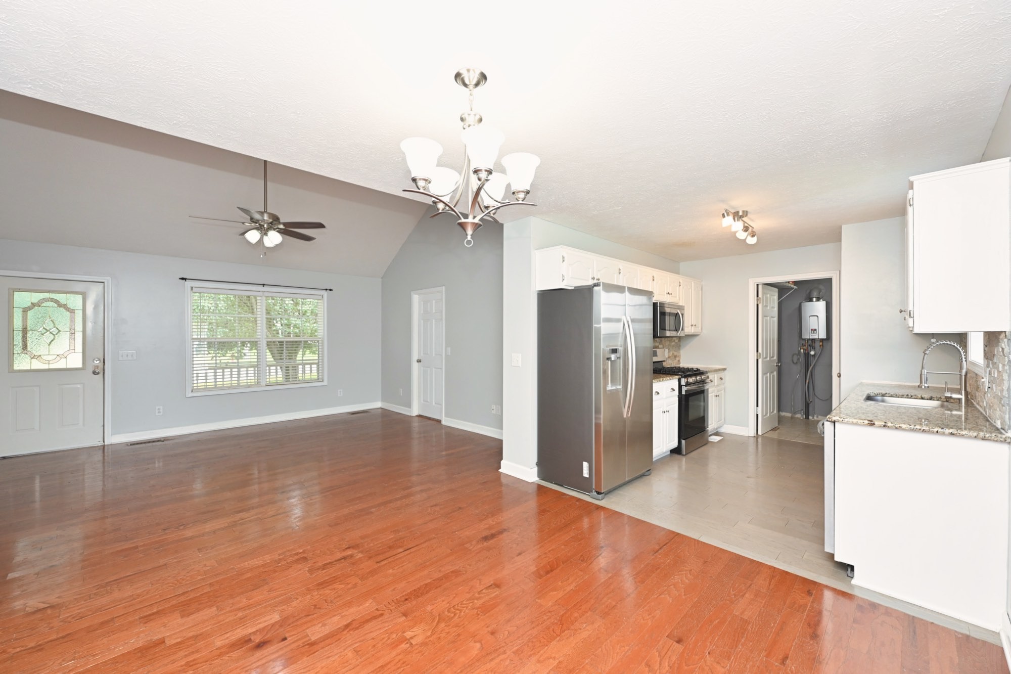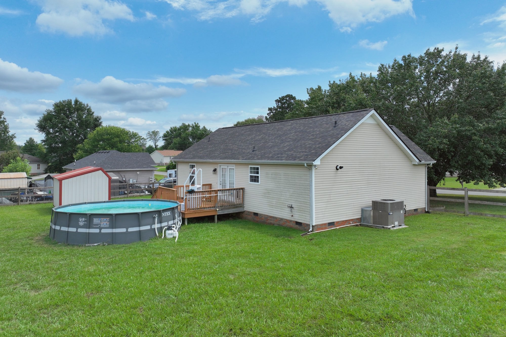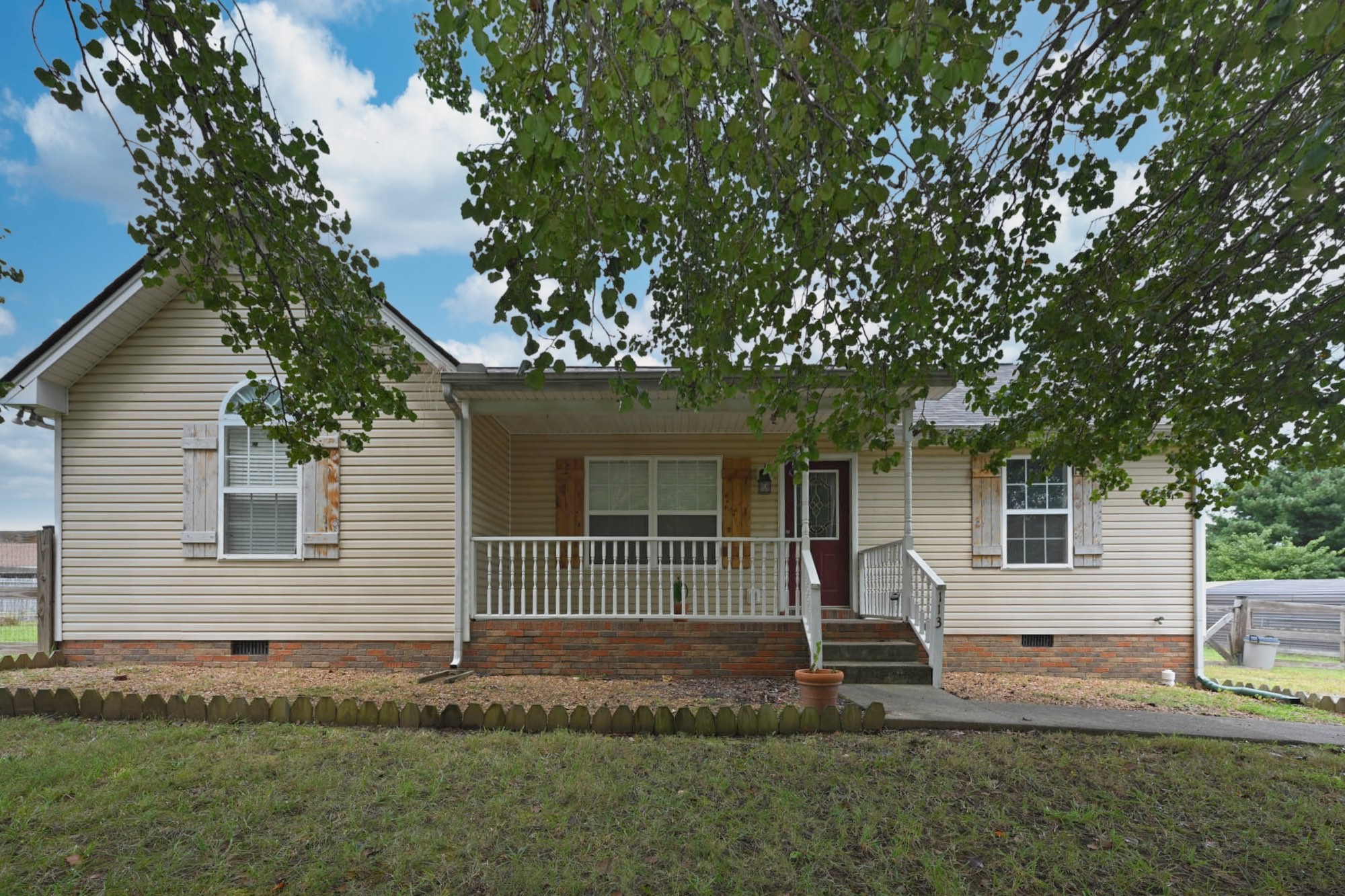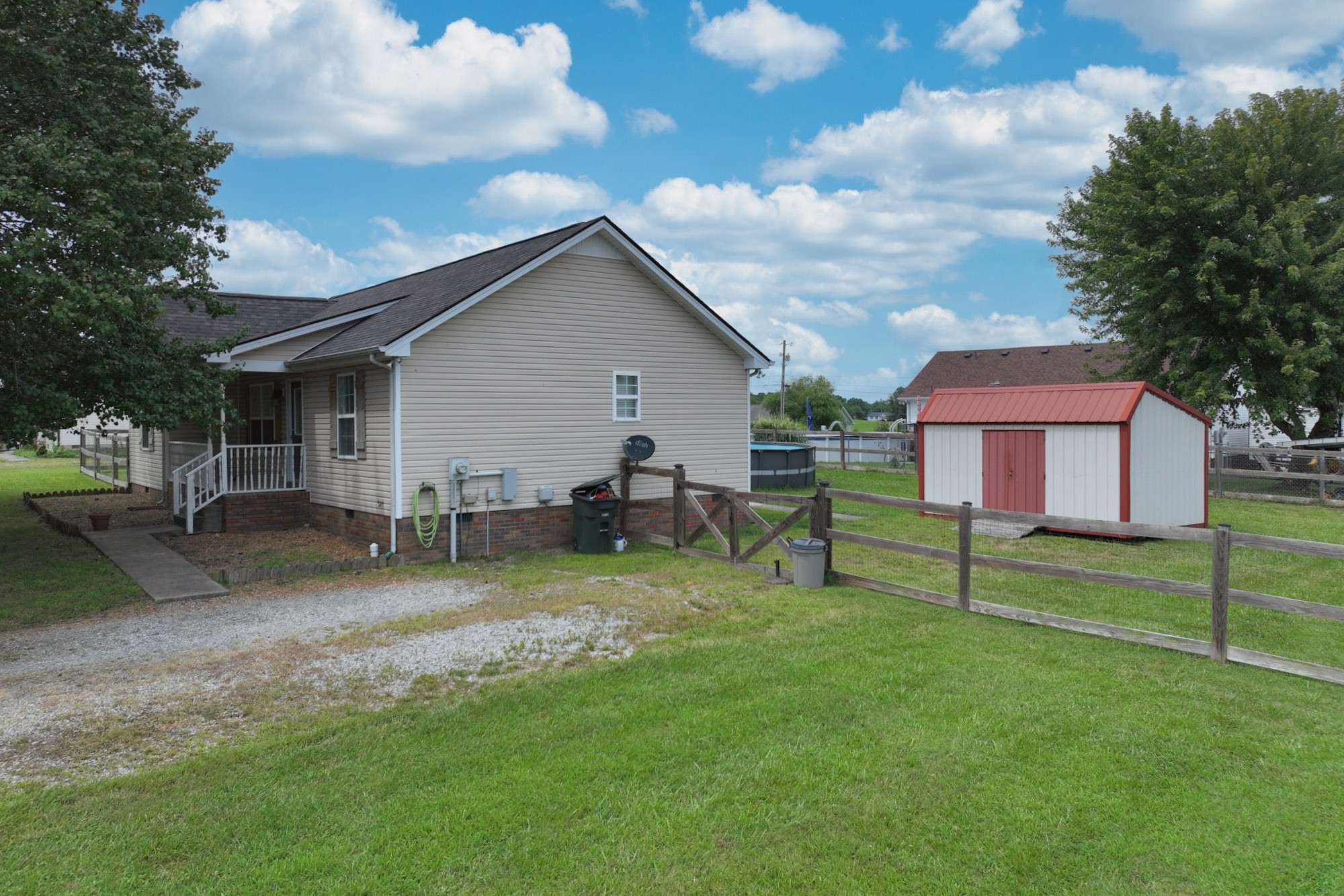 Lovely home with covered front porch and fenced back yard! Home offers an split floor plan and a large primary suite with vaulted ceilings. Heated tile floor in owners bath. New roof and gas tankless water heater. Storage building will remain.