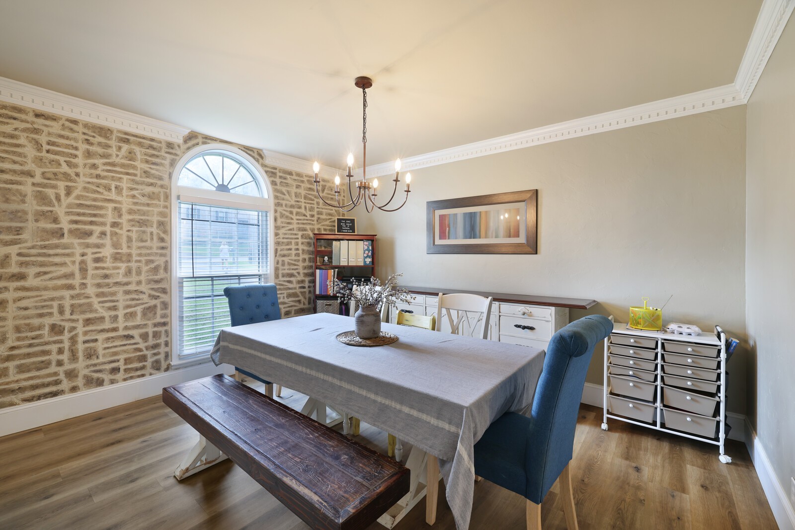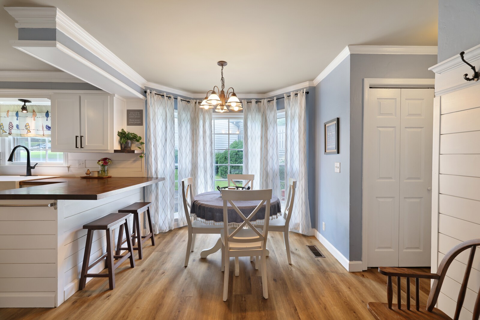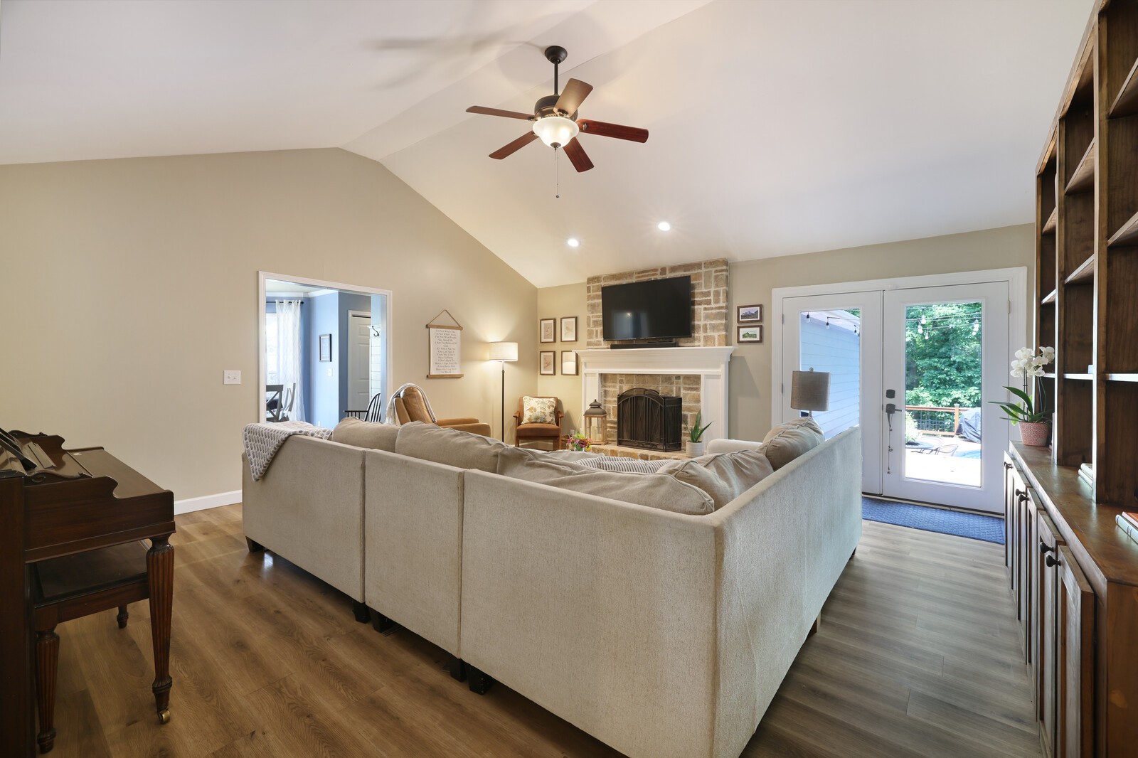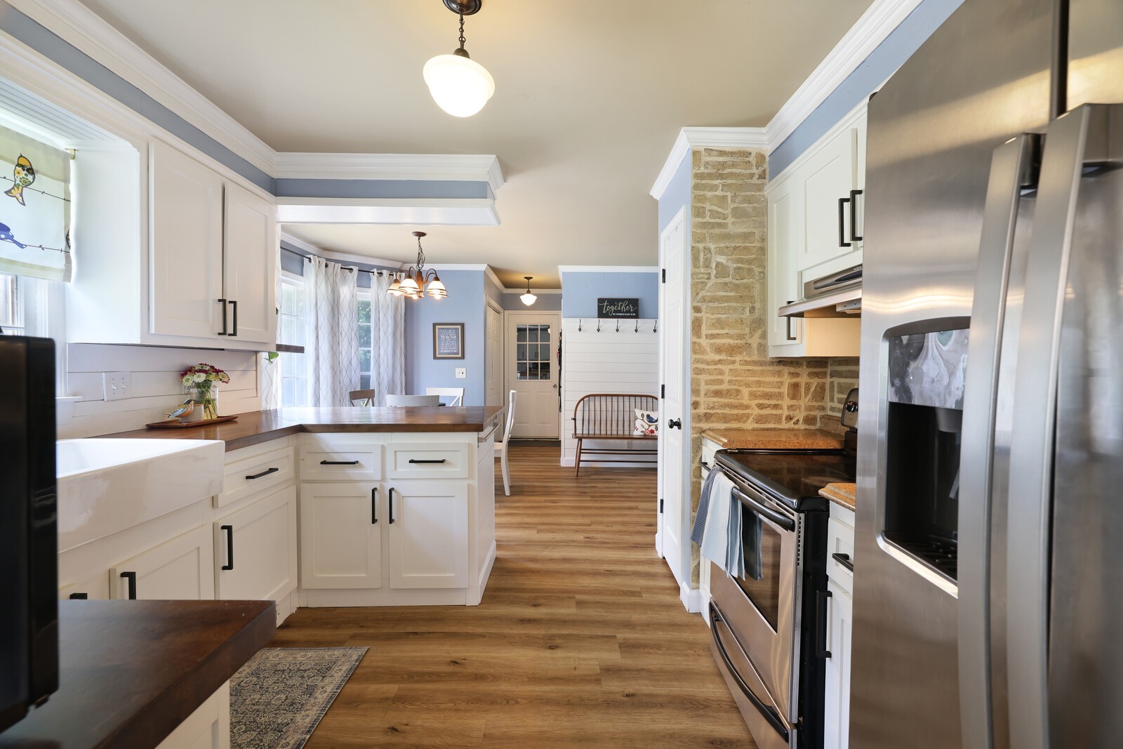 Welcome to this beautifully updated 3-bedroom, 2.5-bath home offering 2,044 square feet of stylish and functional living space. Step into the formal living room and flow into the elegant dining area, complete with a striking stone accent wall. The kitchen is a showstopper, featuring stainless steel appliances, crisp white cabinets, butcher block countertops, and charming shiplap and stone accents. Plus, you will enjoy a sunny eat-in nook perfect for casual dining. The cozy family room invites you to unwind with its soaring ceilings and stacked stone fireplace, creating the perfect atmosphere for relaxing or entertaining. The spacious primary suite features an en-suite bathroom with dual vanities, a luxurious jacuzzi tub, and shiplap accent walls that add a touch of rustic charm. Step outside to your personal oasis, the screened-in deck leads to a sparkling pool and new pool deck, both just a year old. With laminate and tile floors throughout (no carpet!), and a refrigerator that remains, this move-in-ready home blends comfort and convenience. Don’t miss this stunning home with a backyard built for year-round enjoyment!