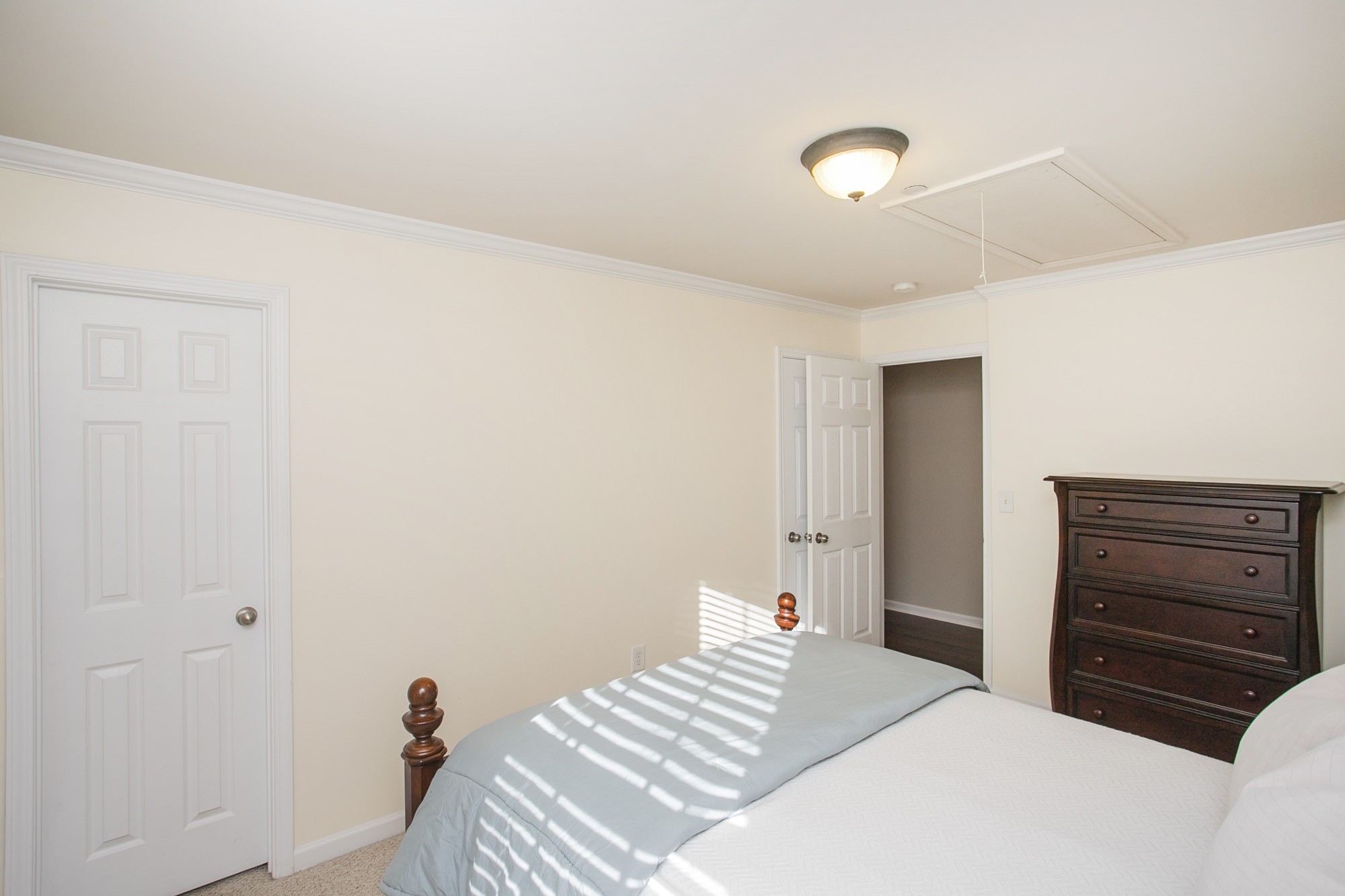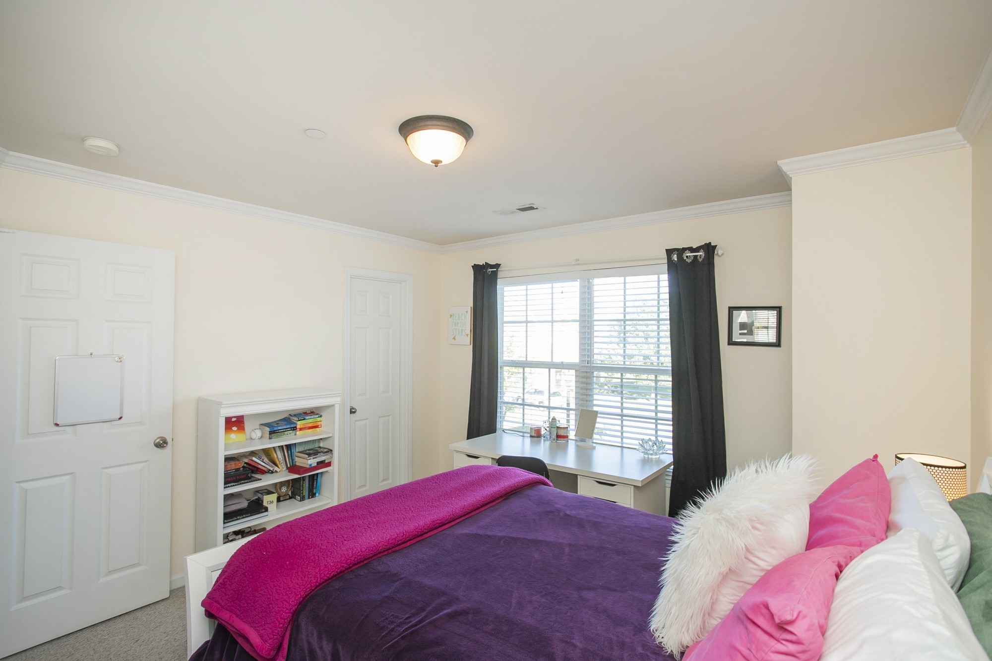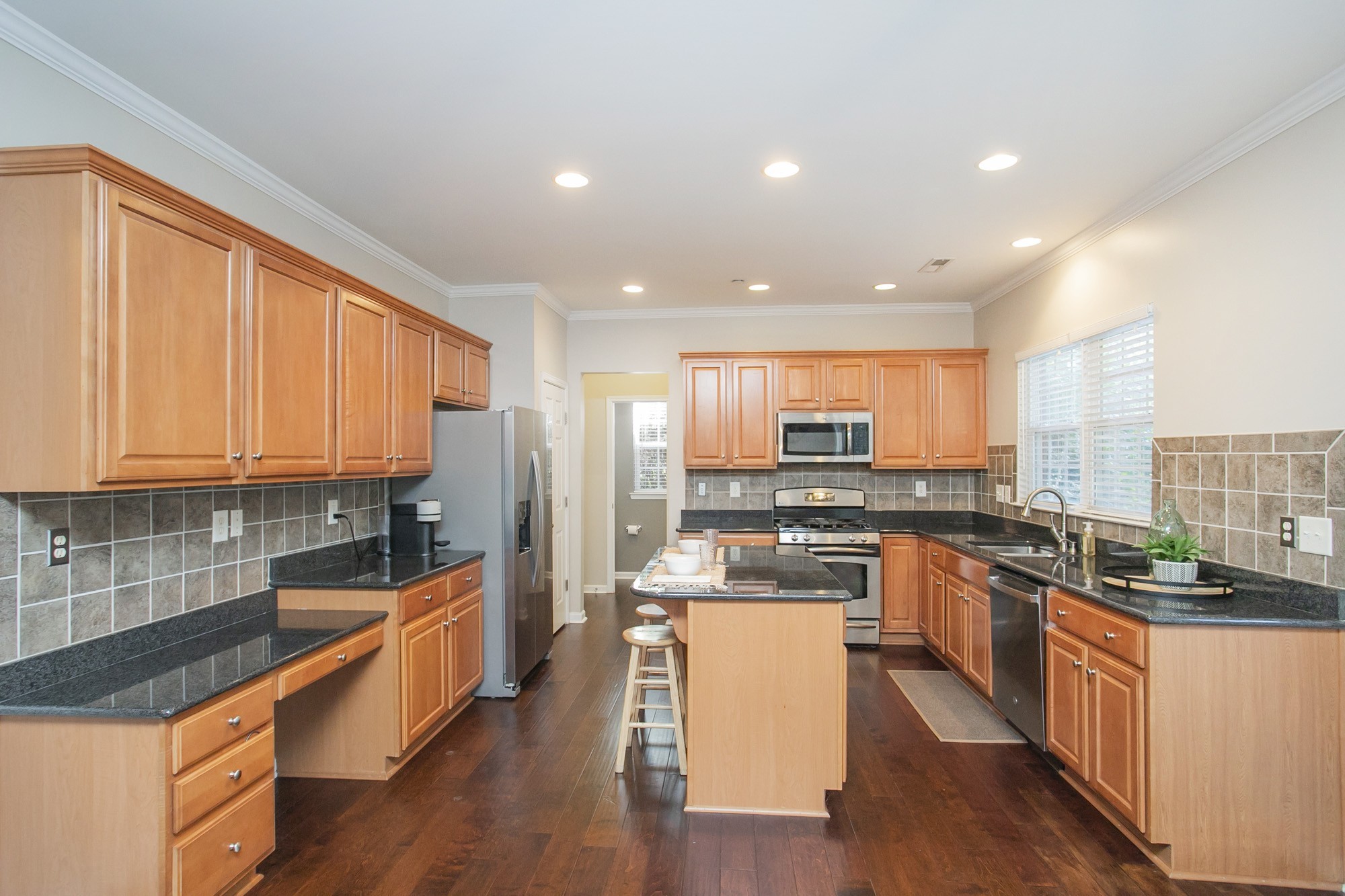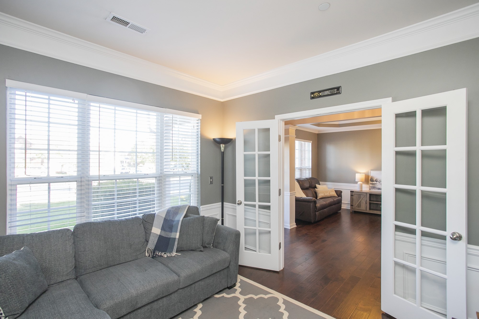 The spacious main-level office with french doors is ideal for working from home, while the refreshed main floor and hallway flooring and fresh paint throughout give the home a crisp feel. All bedrooms are conveniently located upstairs, each with generous closet space and thoughtful design.