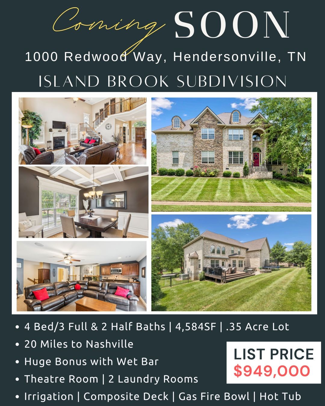 Beautiful NEW listing at 1000 Redwood Way, Hendersonville, TN ... "City by the Lake". This spacious 4-bed, 3 full & 2 half bath home is your gateway to the Nashville lifestyle—complete with 2 office/flex rooms, huge bonus room with mini-bar, 3 car garage, 2 laundry rooms & theatre room PLUS loads of storage....what a wonderful family home! Stainless appliances, separate pantry, custom cabinetry! Just 20 minutes from downtown Nashville, this is a great opportunity to experience the city, then retreat to the privacy of Island Brook subdivision where you can spread out and enjoy the beautiful mature landscaping and exceptional outdoor entertaining area! Irrigation, composite deck, gas fire bowl, hot tub and privacy fencing and so much more...