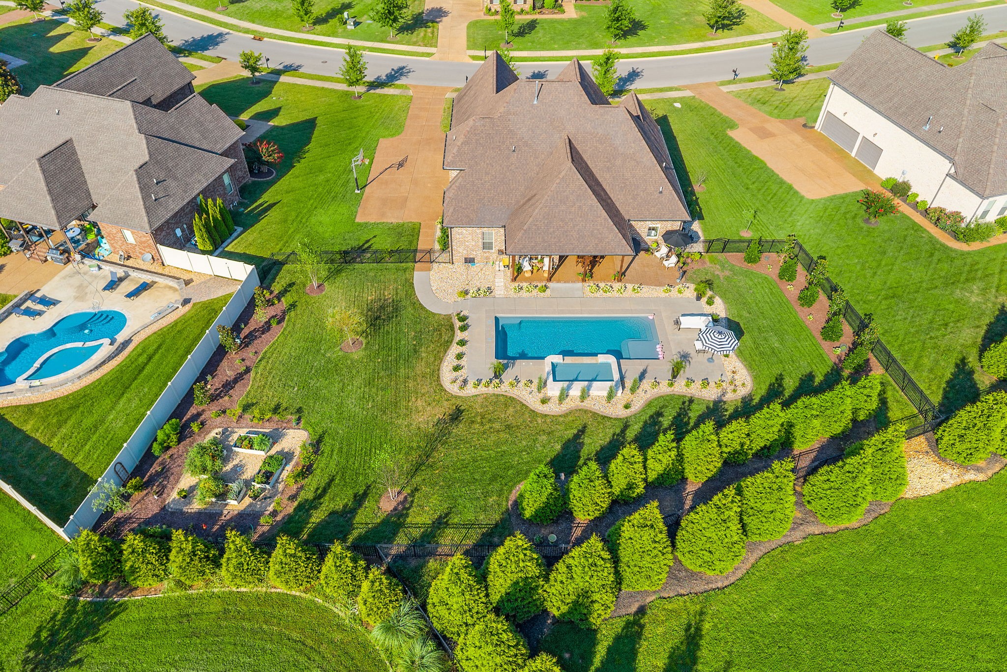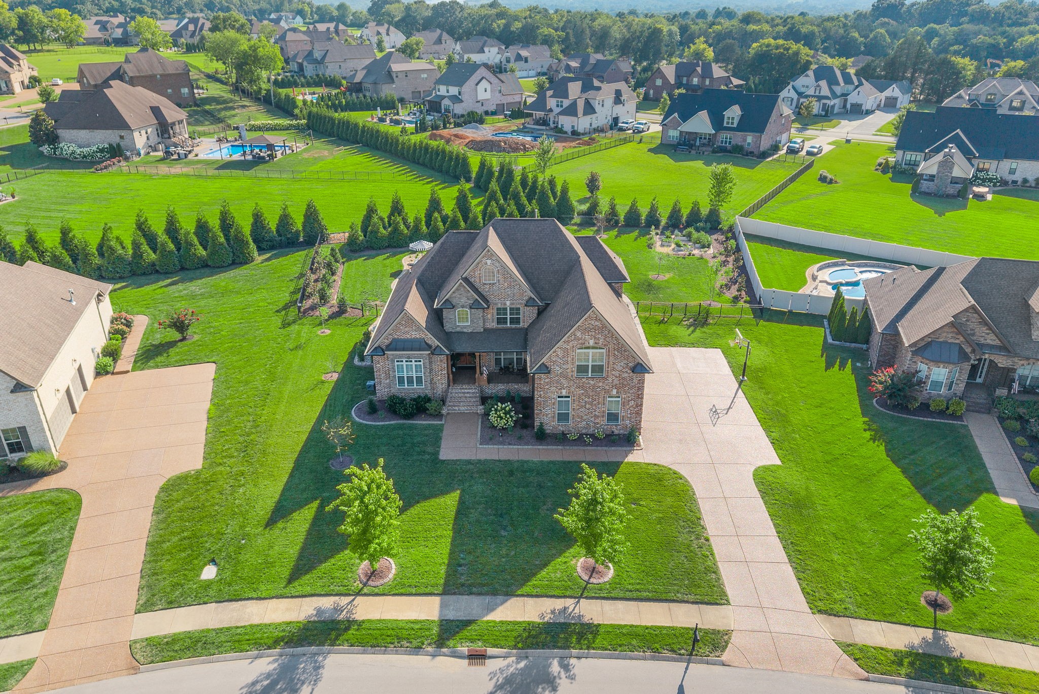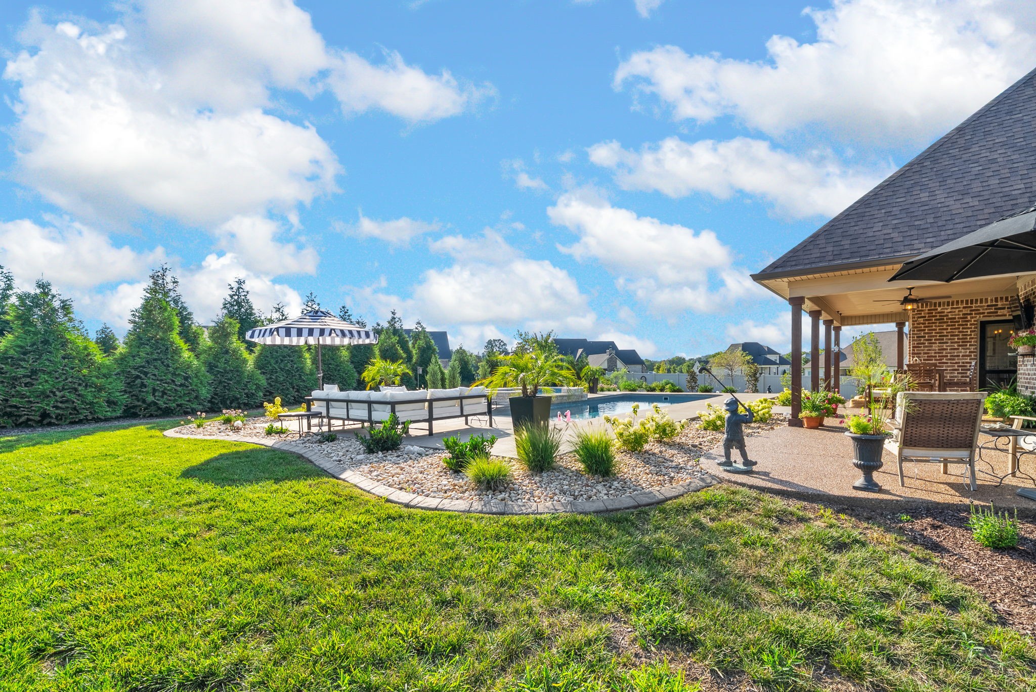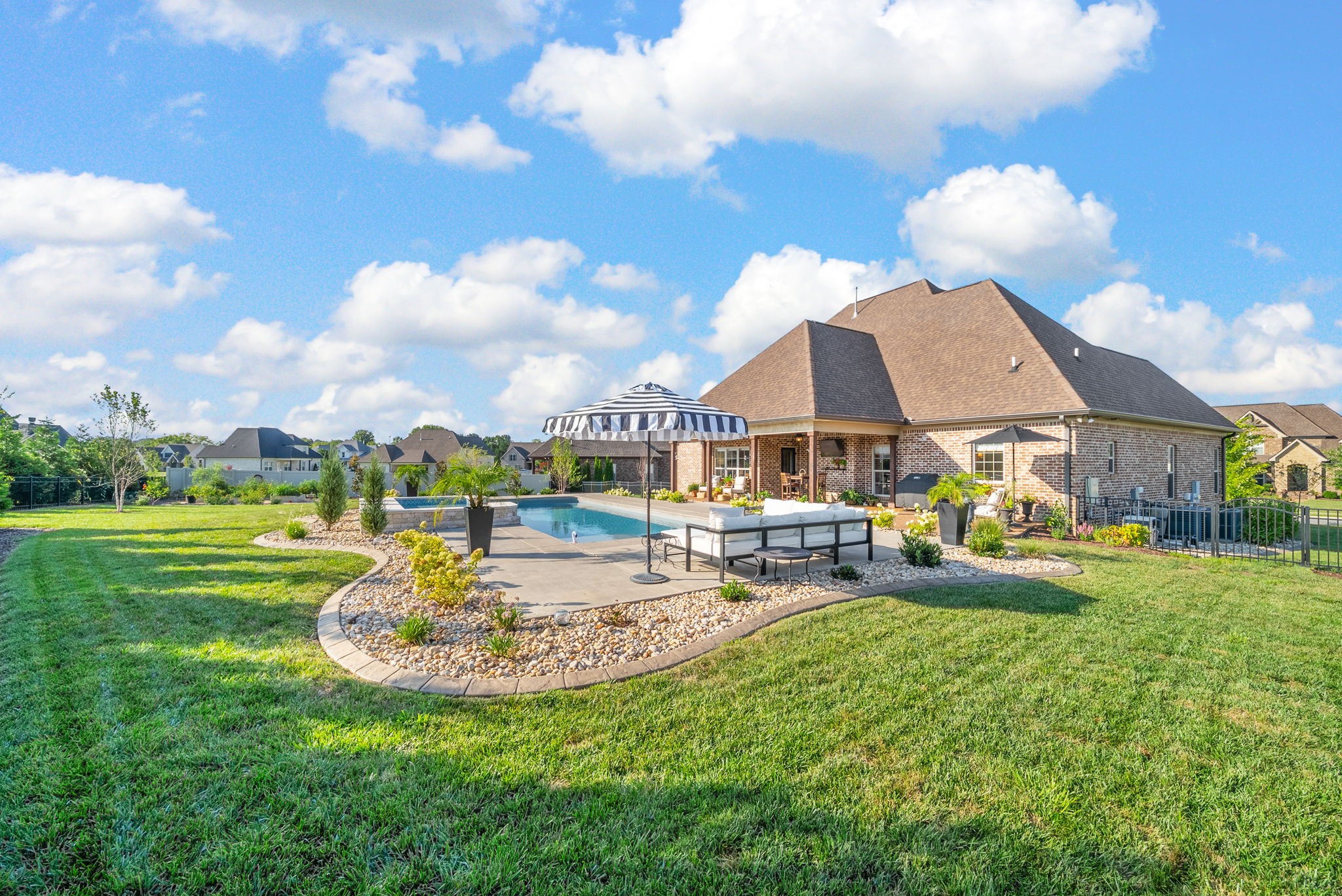 Exceptional home in the prestigious and highly sought-after Farmington Woods neighborhood, known for its all-brick homes situated on spacious half-acre or larger lots. This stunning property offers an entertainer’s dream backyard with an expanded patio, luxurious in-ground pool, and a sun shelf featuring a tranquil waterfall—creating a resort-style atmosphere right at home. Surrounded by mature privacy trees and a lush, irrigated lawn, this outdoor space is your own private oasis. Skip the headache of permits, approvals, and torn-up yards—this pool is already in place and ready for you to enjoy just in time for summer. Built by esteemed local builder Tim Tomlinson with Cornerstone, this home is packed with high-end finishes and quality craftsmanship throughout. What sets 148 Springfield Drive apart are the thoughtful upgrades added to an already impressive build. As you approach, you’ll notice the manicured lawn, beautiful landscaping, and three-car side-entry garage that not only offers more parking but also enhances the home’s curb appeal. The entire home was recently custom painted, and new designer light fixtures have been installed throughout, creating a fresh, custom feel. The layout is ideal for modern living, with two bedrooms on the main level and two more upstairs. The kitchen is a chef’s dream with quartz countertops, double ovens, a built-in gas range, and generous seating around the oversized island. There’s also a spacious eat-in area and a formal dining room. The laundry room is a step above with beautiful cabinetry, a sink, and a quartz countertop for folding. The fully renovated primary ensuite bathroom is a dream, offering spa-like finishes and thoughtful touches, along with dual primary closets. Upstairs, a large bonus room provides a multifunctional space for work, play, or relaxation.
