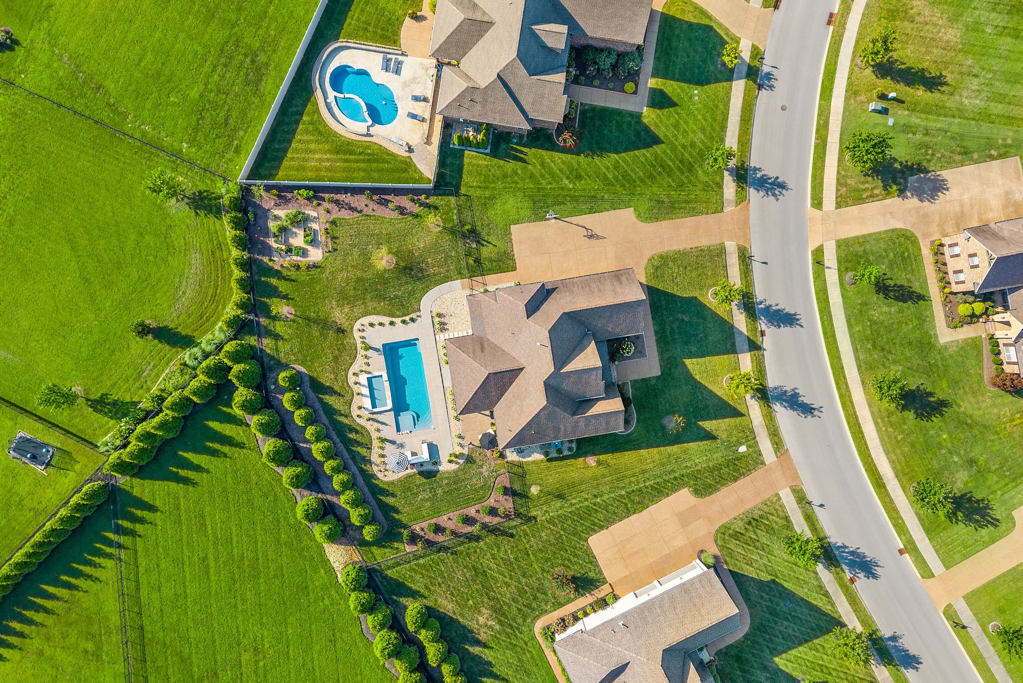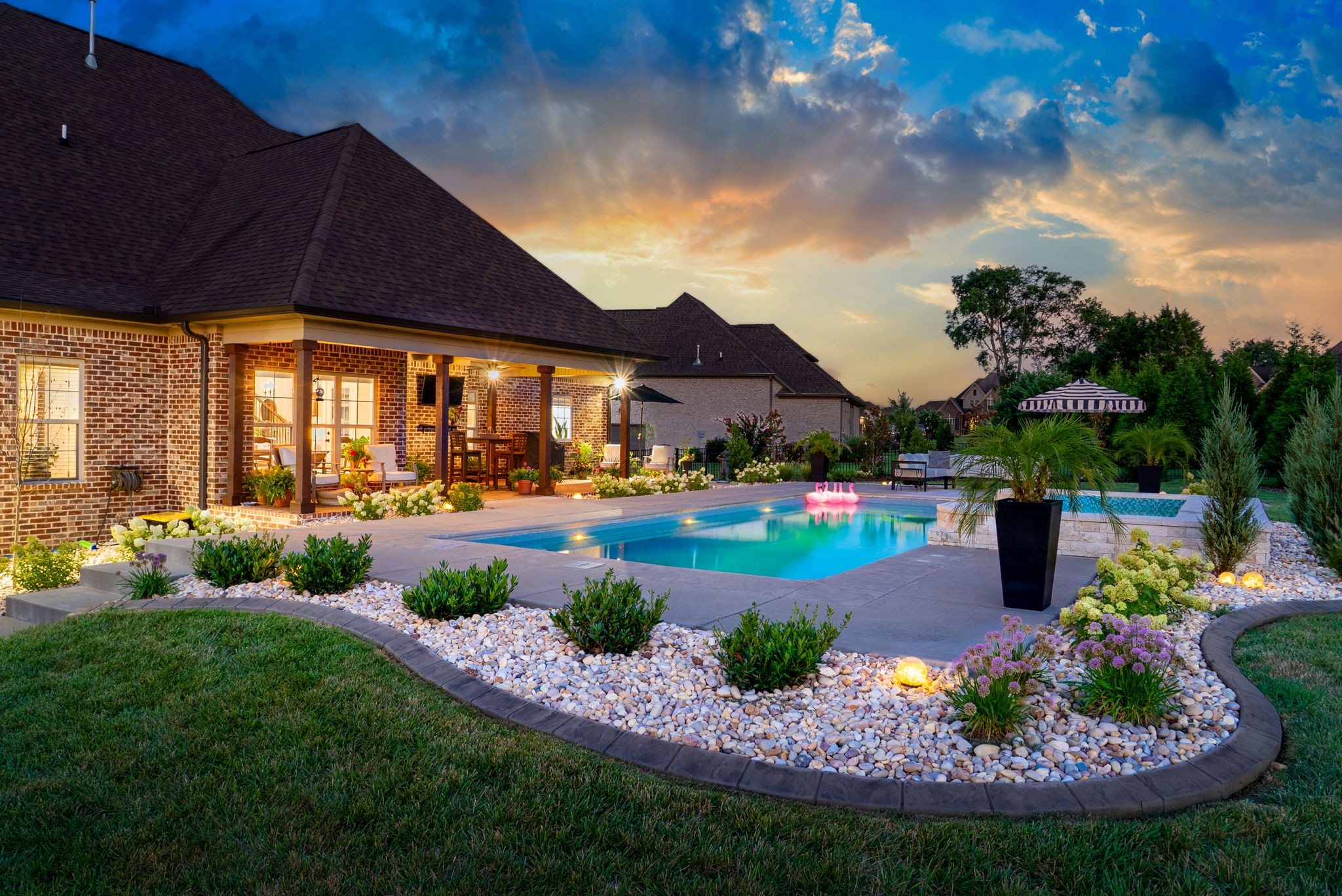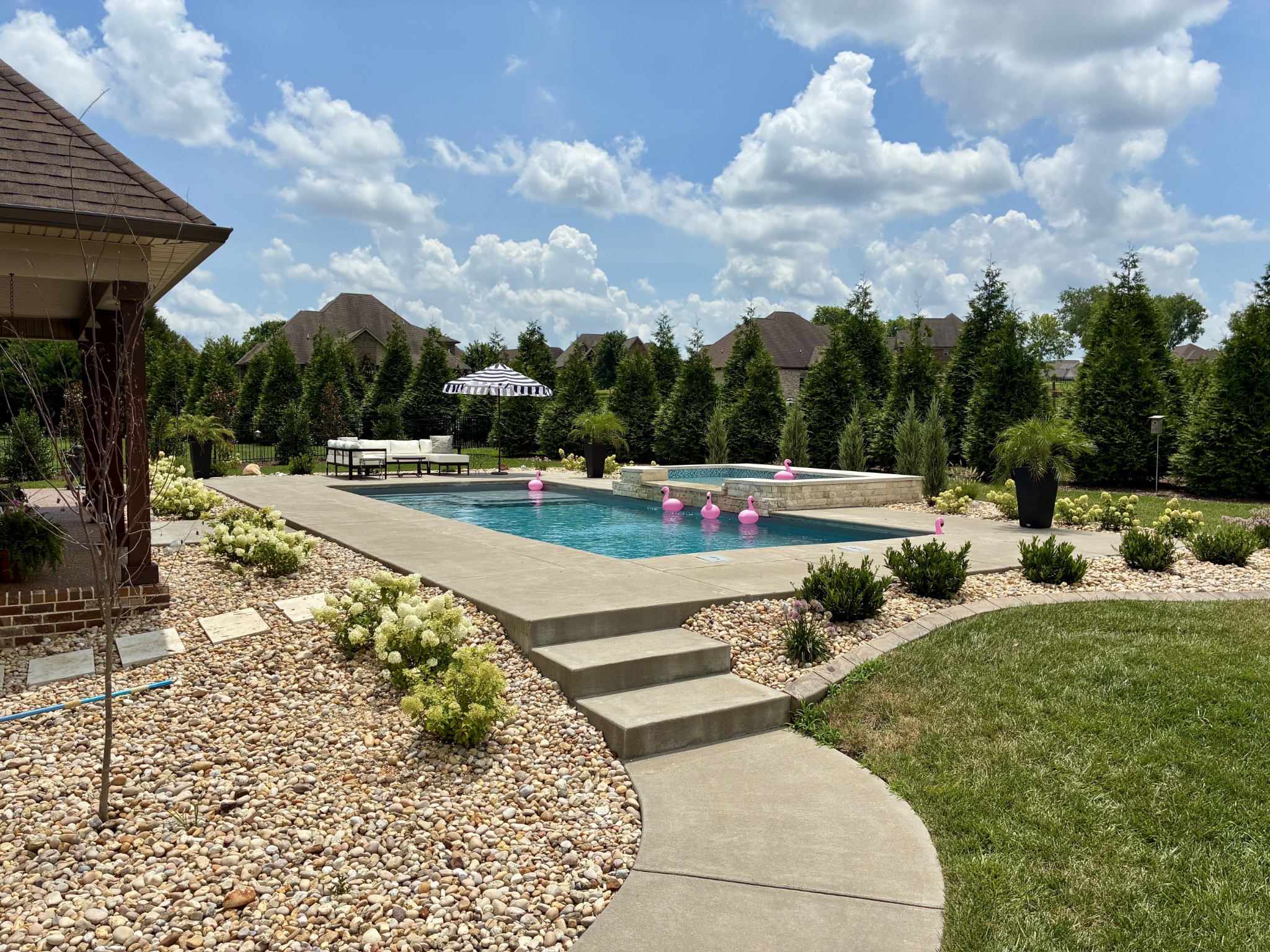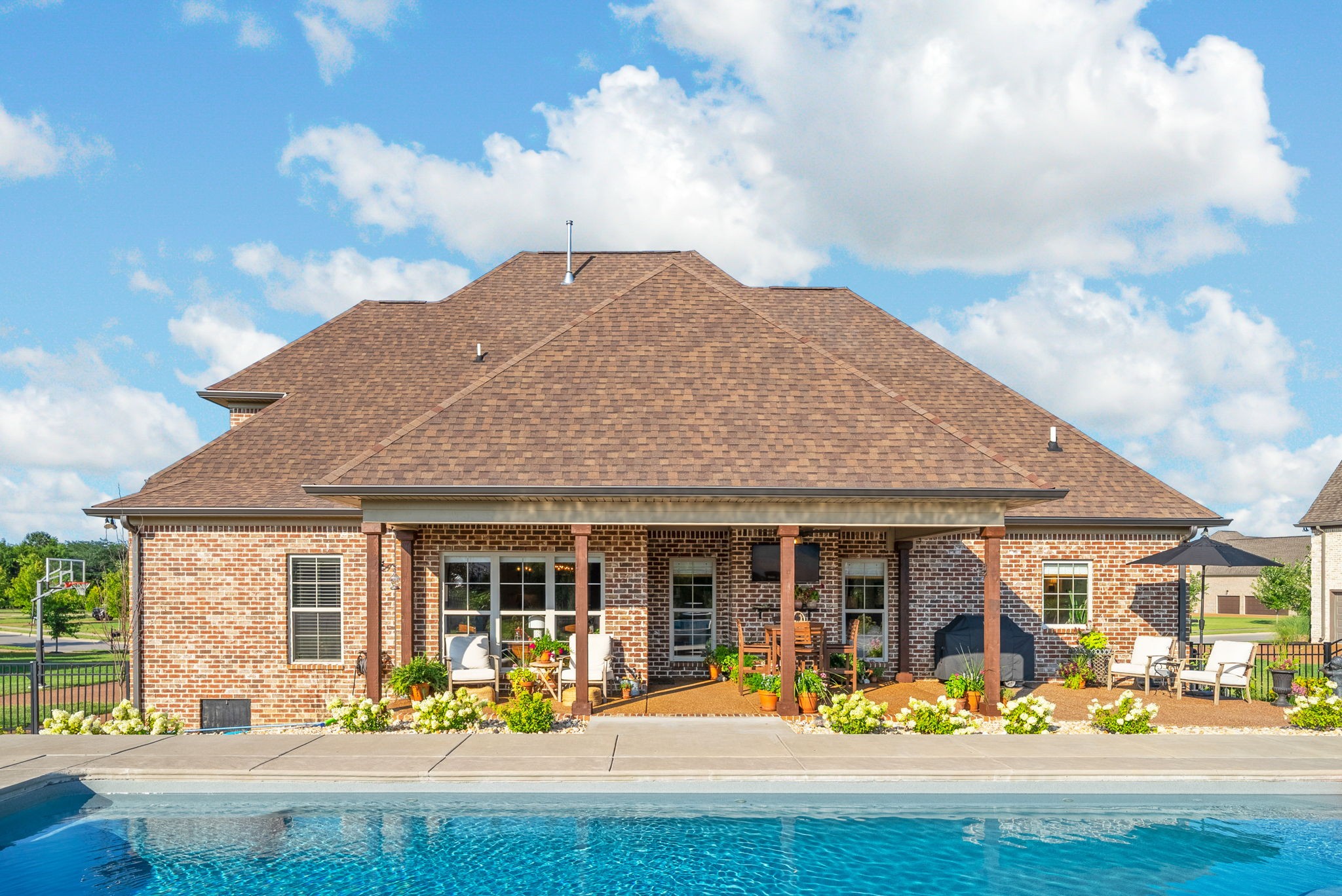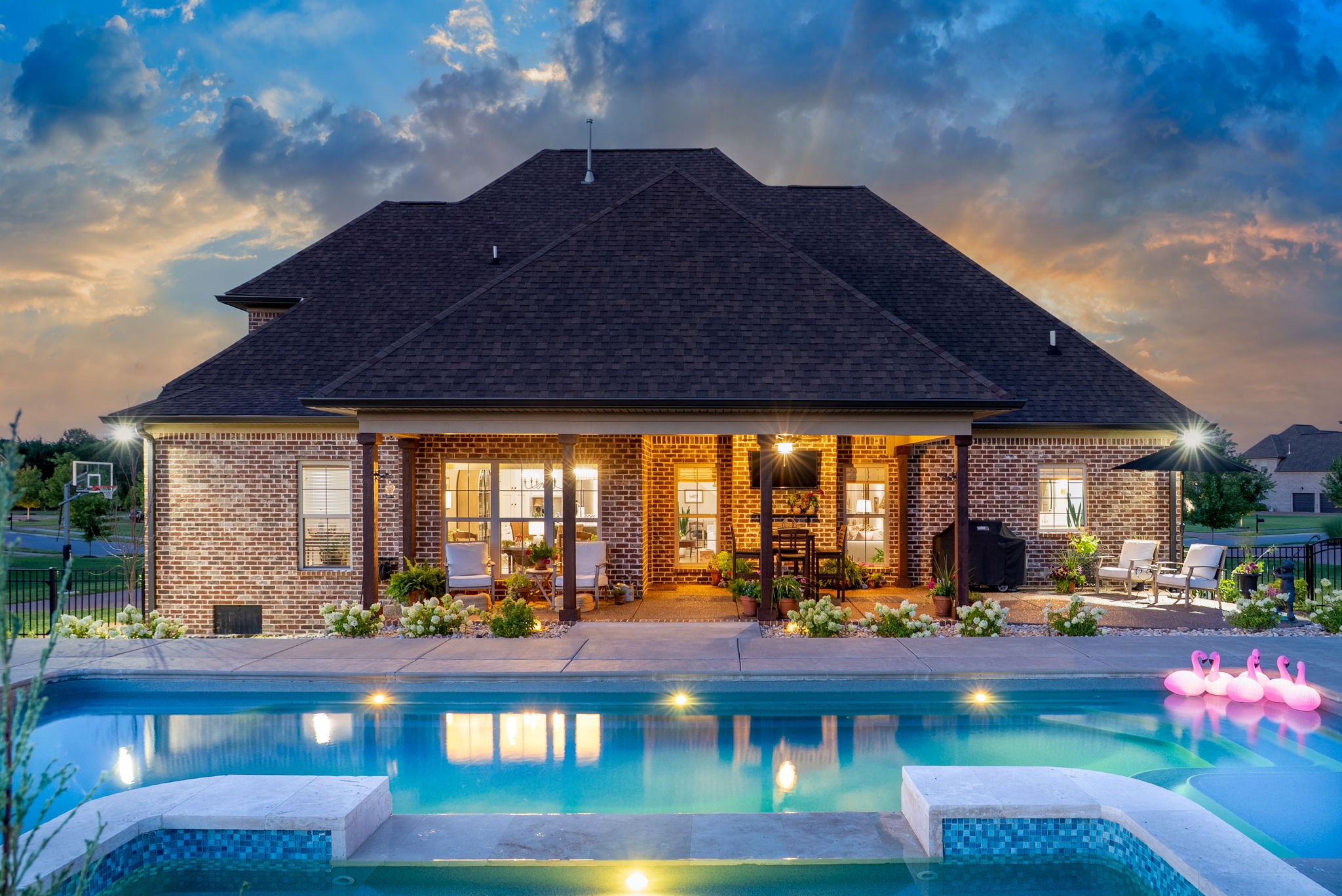 Exceptional home in the prestigious and highly sought-after Farmington Woods neighborhood, known for its all-brick homes situated on spacious half-acre or larger lots. This stunning property offers an entertainer’s dream backyard with an expanded patio, luxurious in-ground pool, and a sun shelf featuring a tranquil waterfall—creating a resort-style atmosphere right at home. Surrounded by mature privacy trees and a lush, irrigated lawn, this outdoor space is your own private oasis. Skip the headache of permits, approvals, and torn-up yards—this pool is already in place and ready for you to enjoy just in time for summer. Built by esteemed local builder Tim Tomlinson with Cornerstone, this home is packed with high-end finishes and quality craftsmanship throughout. What sets 148 Springfield Drive apart are the thoughtful upgrades added to an already impressive build. As you approach, you’ll notice the manicured lawn, beautiful landscaping, and three-car side-entry garage that not only offers more parking but also enhances the home’s curb appeal. The entire home was recently custom painted, and new designer light fixtures have been installed throughout, creating a fresh, custom feel. The layout is ideal for modern living, with two bedrooms on the main level and two more upstairs. The kitchen is a chef’s dream with quartz countertops, double ovens, a built-in gas range, and generous seating around the oversized island. There’s also a spacious eat-in area and a formal dining room. The laundry room is a step above with beautiful cabinetry, a sink, and a quartz countertop for folding. The fully renovated primary ensuite bathroom is a dream, offering spa-like finishes and thoughtful touches, along with dual primary closets. Upstairs, a large bonus room provides a multifunctional space for work, play, or relaxation.