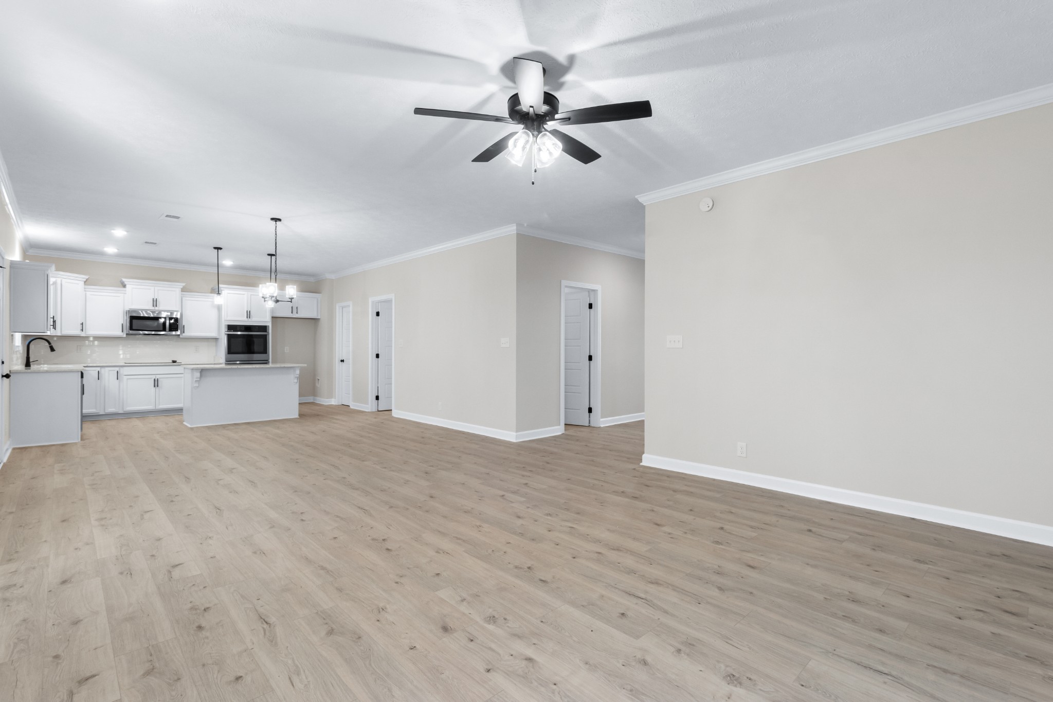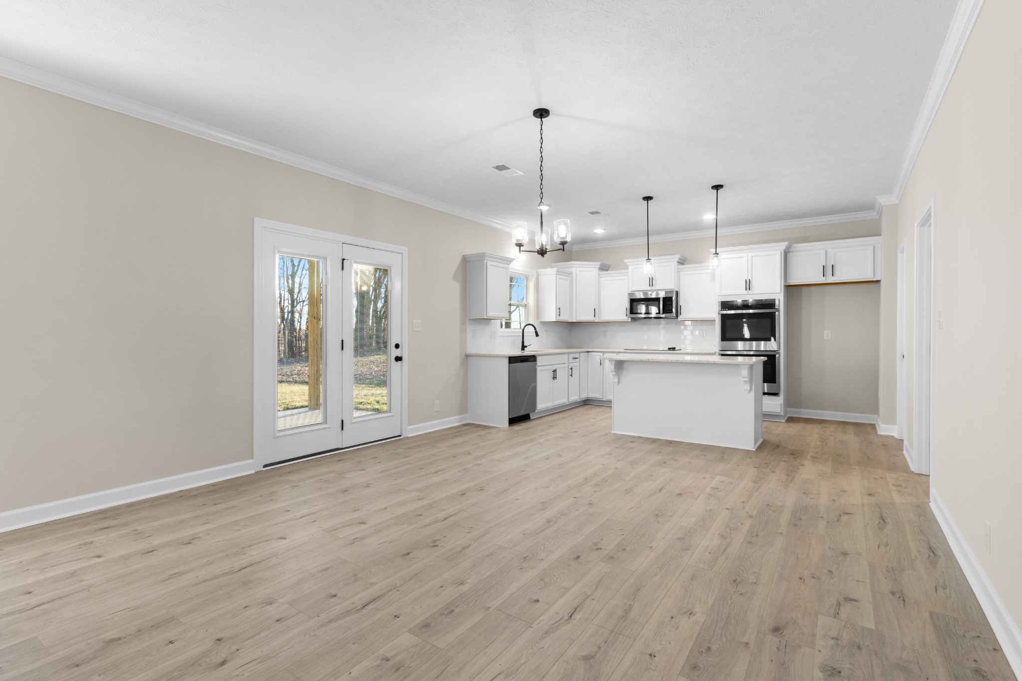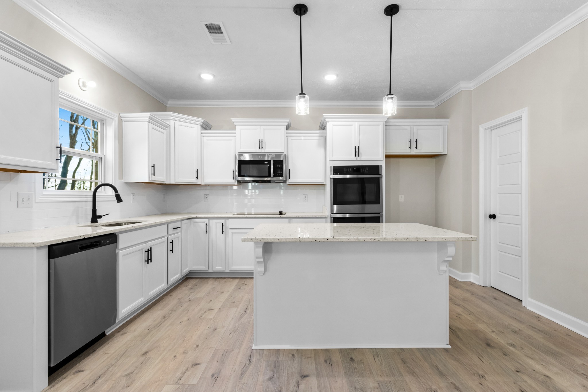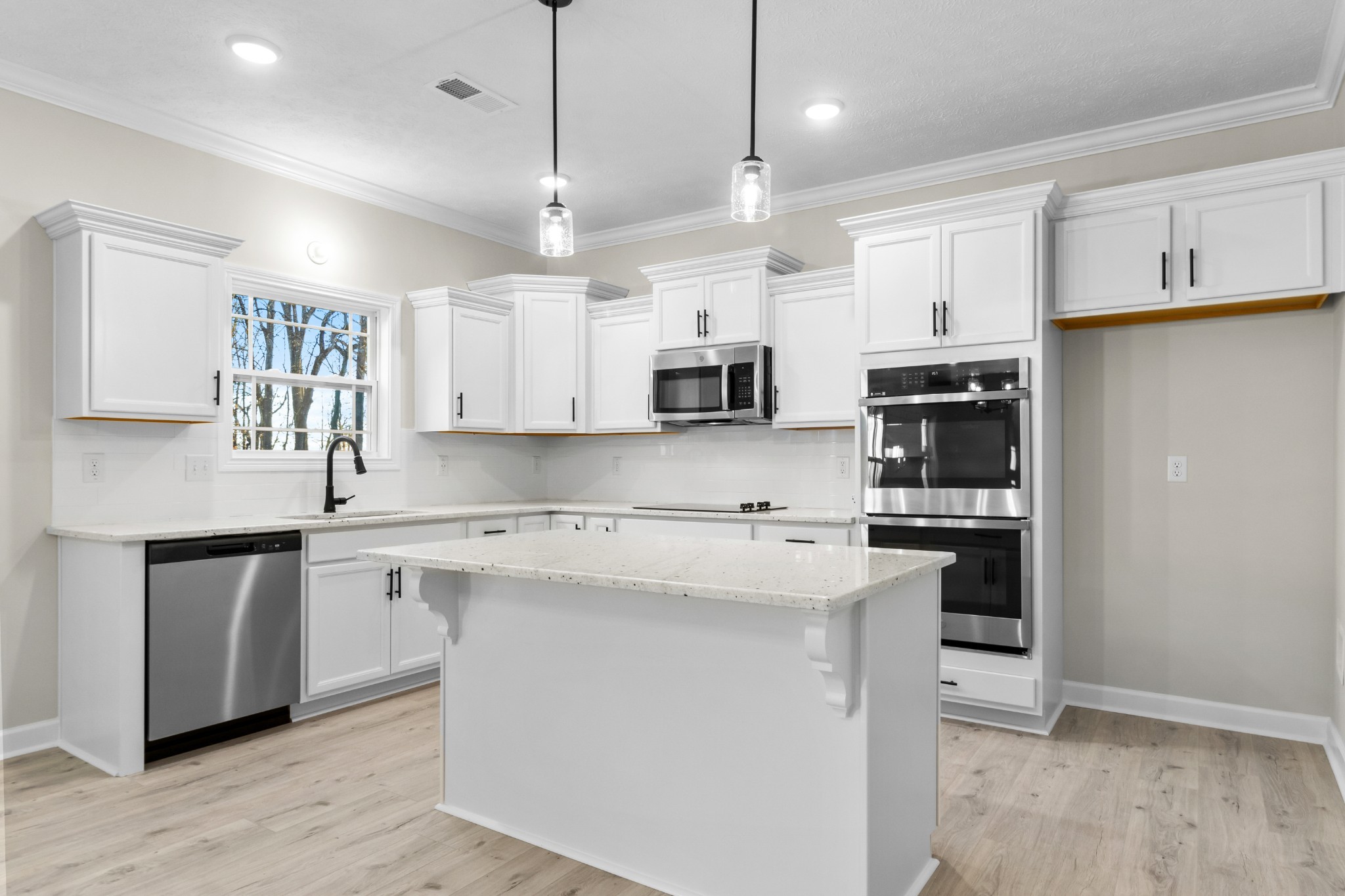 Let’s start with the heart of the home—the kitchen. Featuring a large island that opens into the living and dining areas, this space is absolutely made for entertaining. Whether you're hosting brunch or prepping a casual weeknight dinner, the open layout ensures you're always part of the conversation. Granite countertops, a stylish backsplash, sleek appliances including double ovens, and other high-end finishes give it a look you’ll never grow tired of.