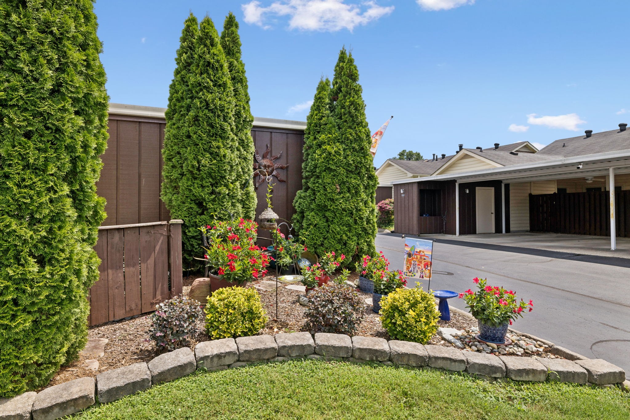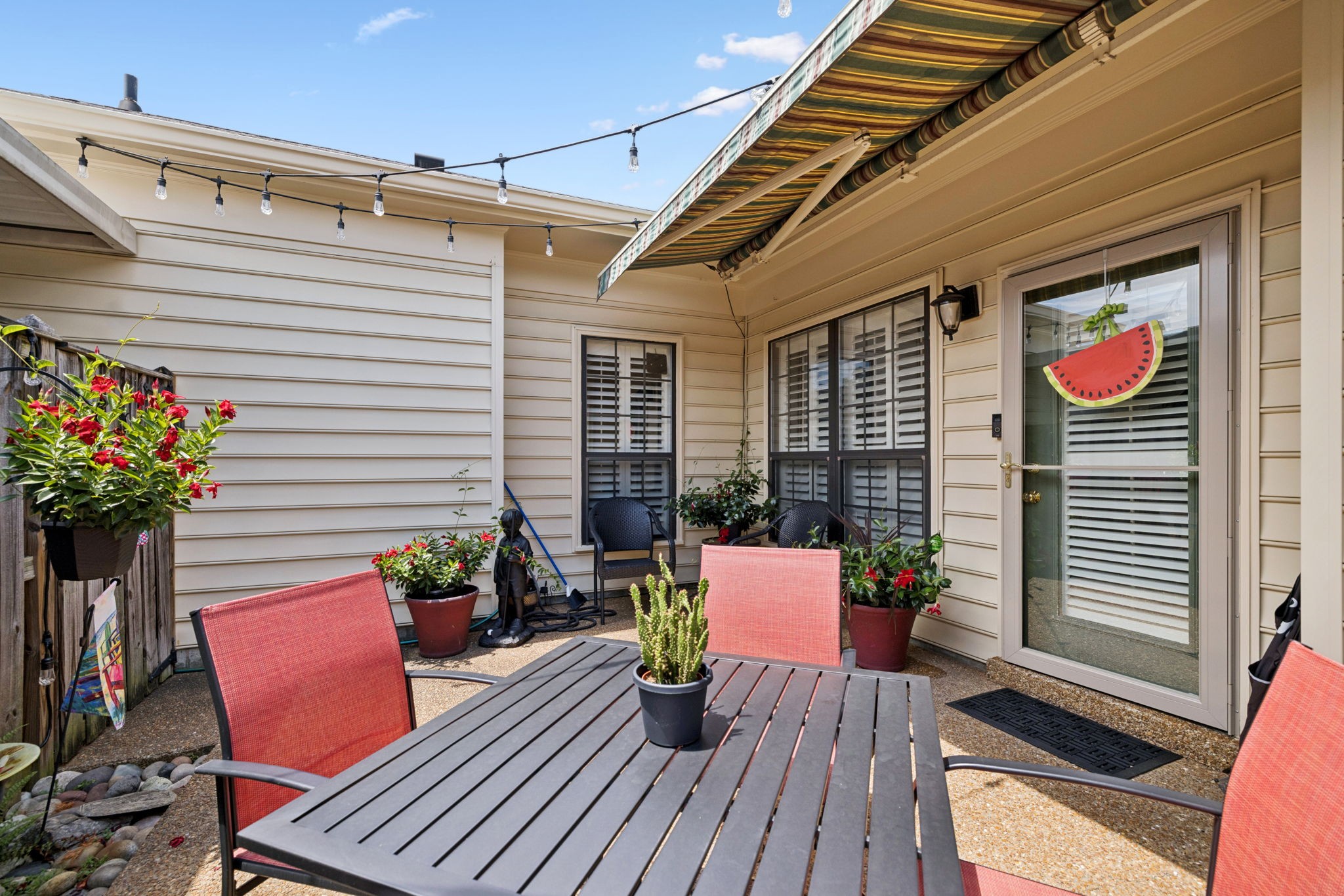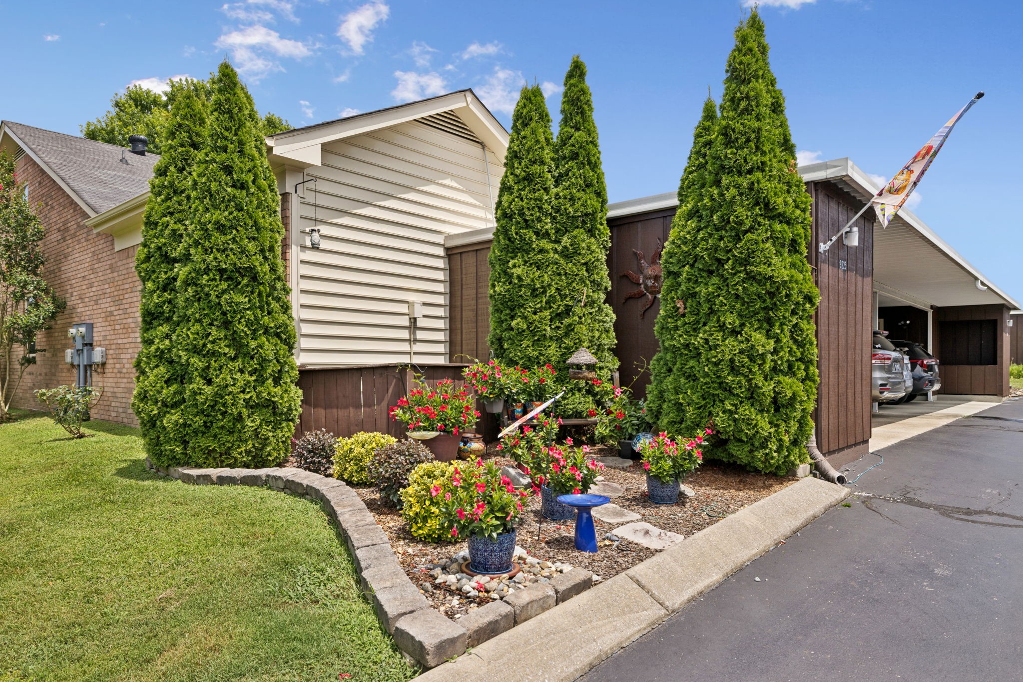 Desired Popular Andover Plan in River Plantation. Spacious 3BDR /3BA open floorplan with upstairs 14x14 flex room with full bath: possible 4th bedroom, bonus, exercise room or office. Kitchen & bathroom updates. Eat-in kitchen, pantry, tile backsplash & flooring, stainless appliances, granite countertops. Custom Plantation shutters, New fans & fixtures. Generous main-level primary suite features en-suite bath with separate shower, double vanities & cozy tub area. Separate dining room. Gas fireplace in Den plus vaulted ceilings in living room. 'Fancy Grates' cover AC grills. Appliances 11 yrs, HVAC 2 yrs, Hot water heater 4 yrs, & roof is included in HOA. Two car carport includes sizeable storage closet. Well maintained and READY FOR MOVE IN!! Community pool, walking trails & underground utilities. Not in flood zone. Conveniently located near restaurants, coffee shops & shopping. Easy access to I-40. Less than 20 min to downtown Nashville.