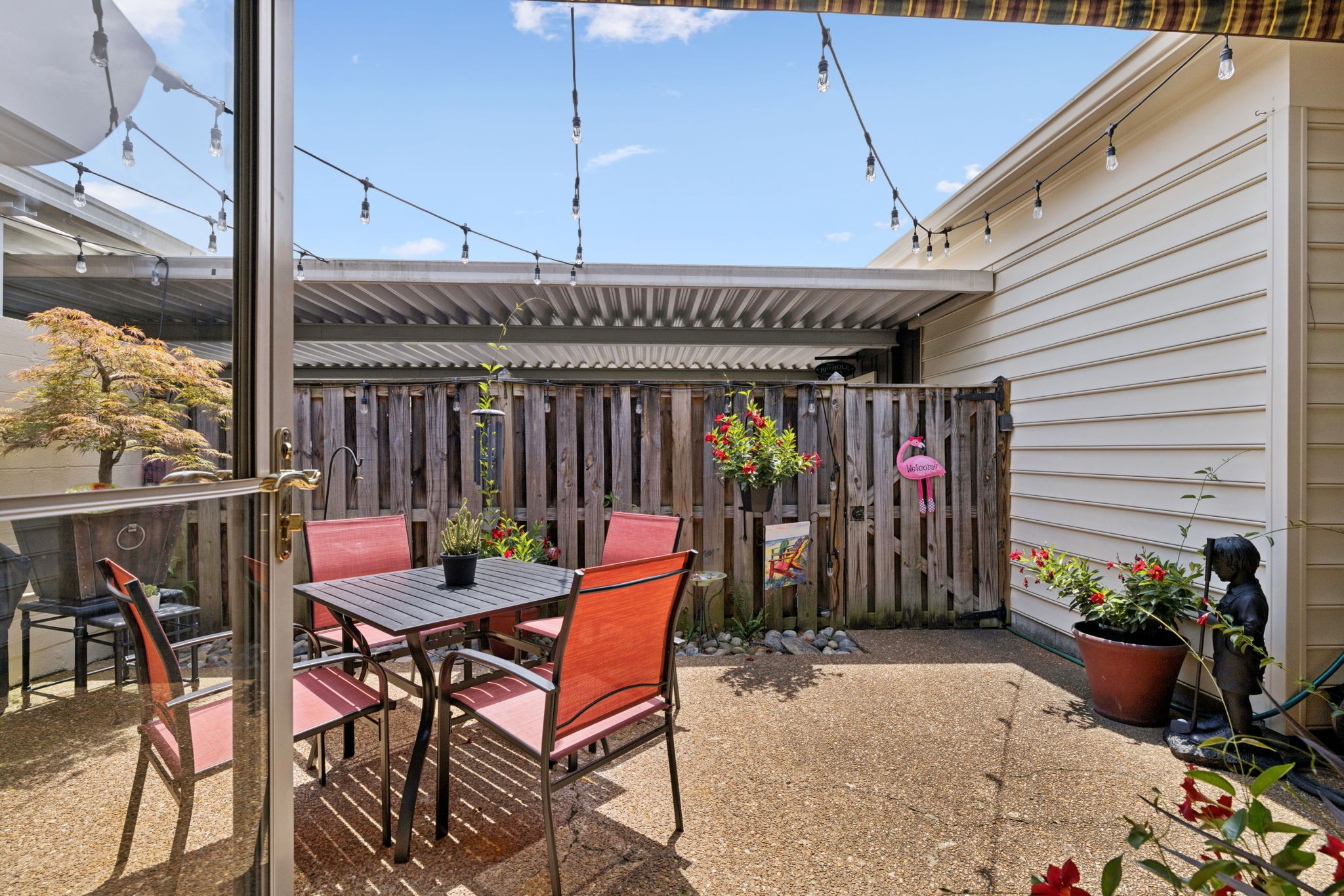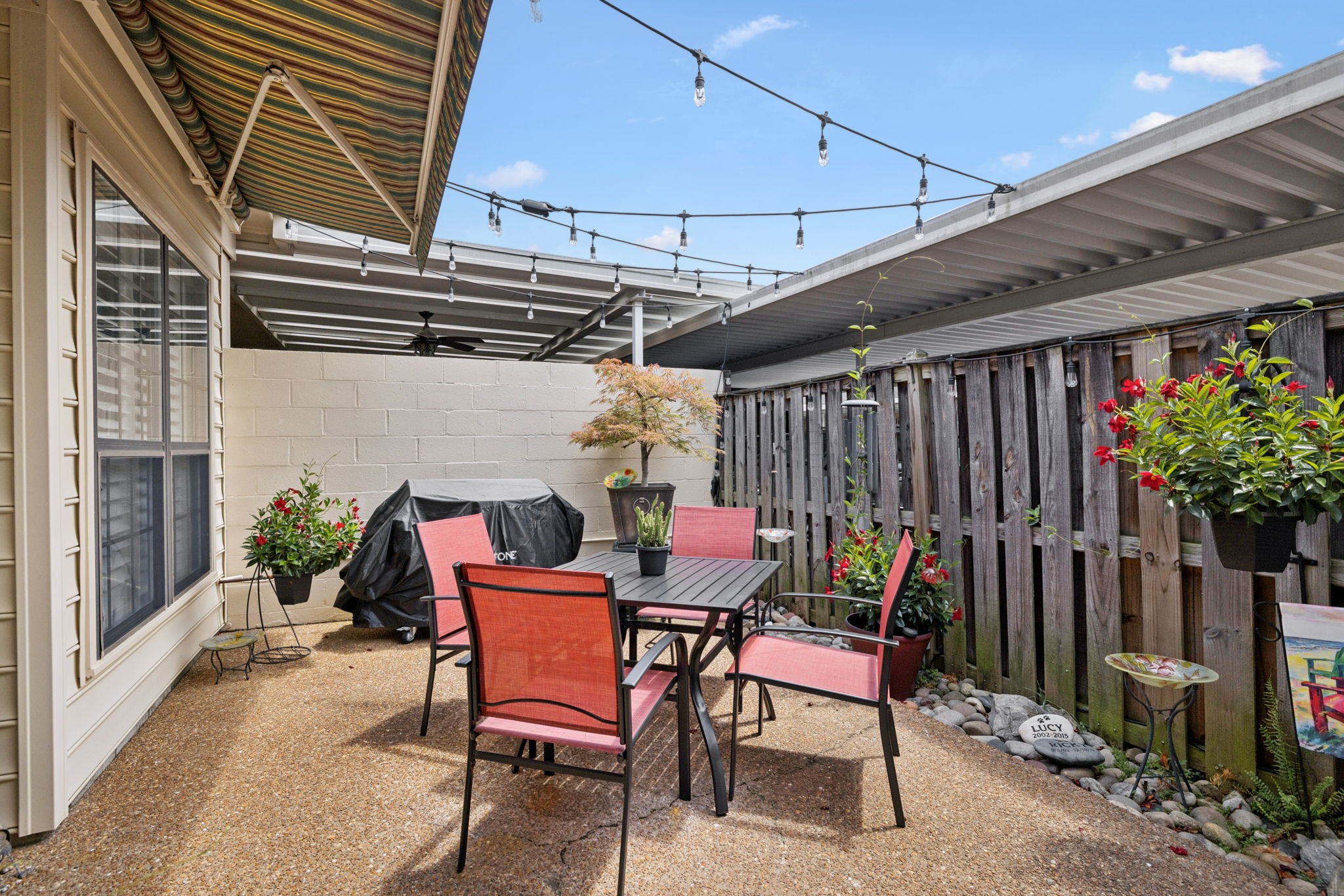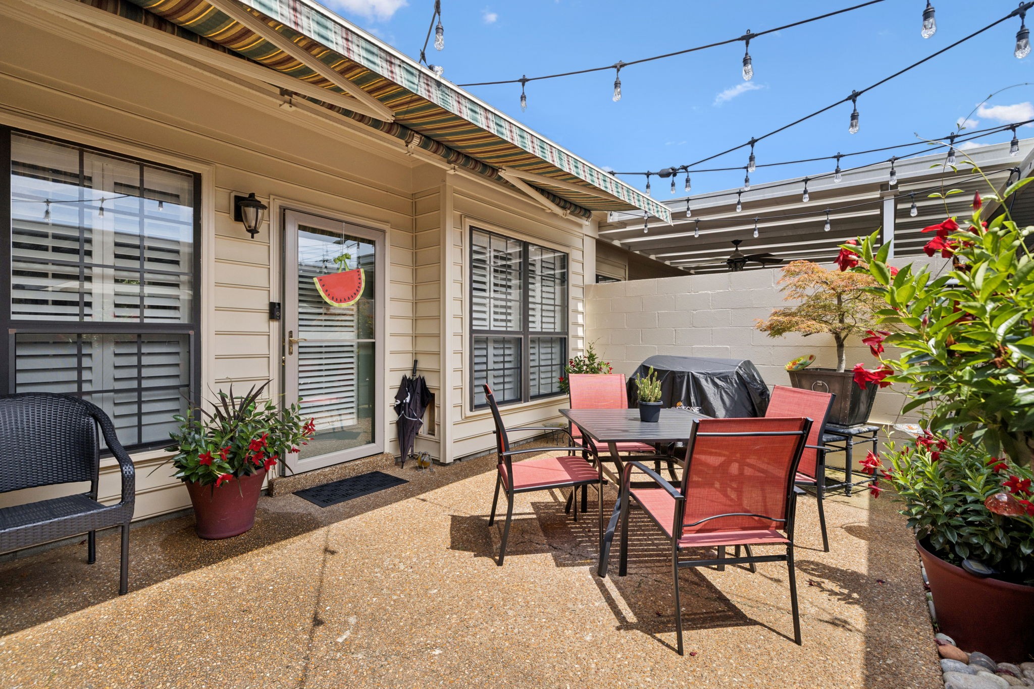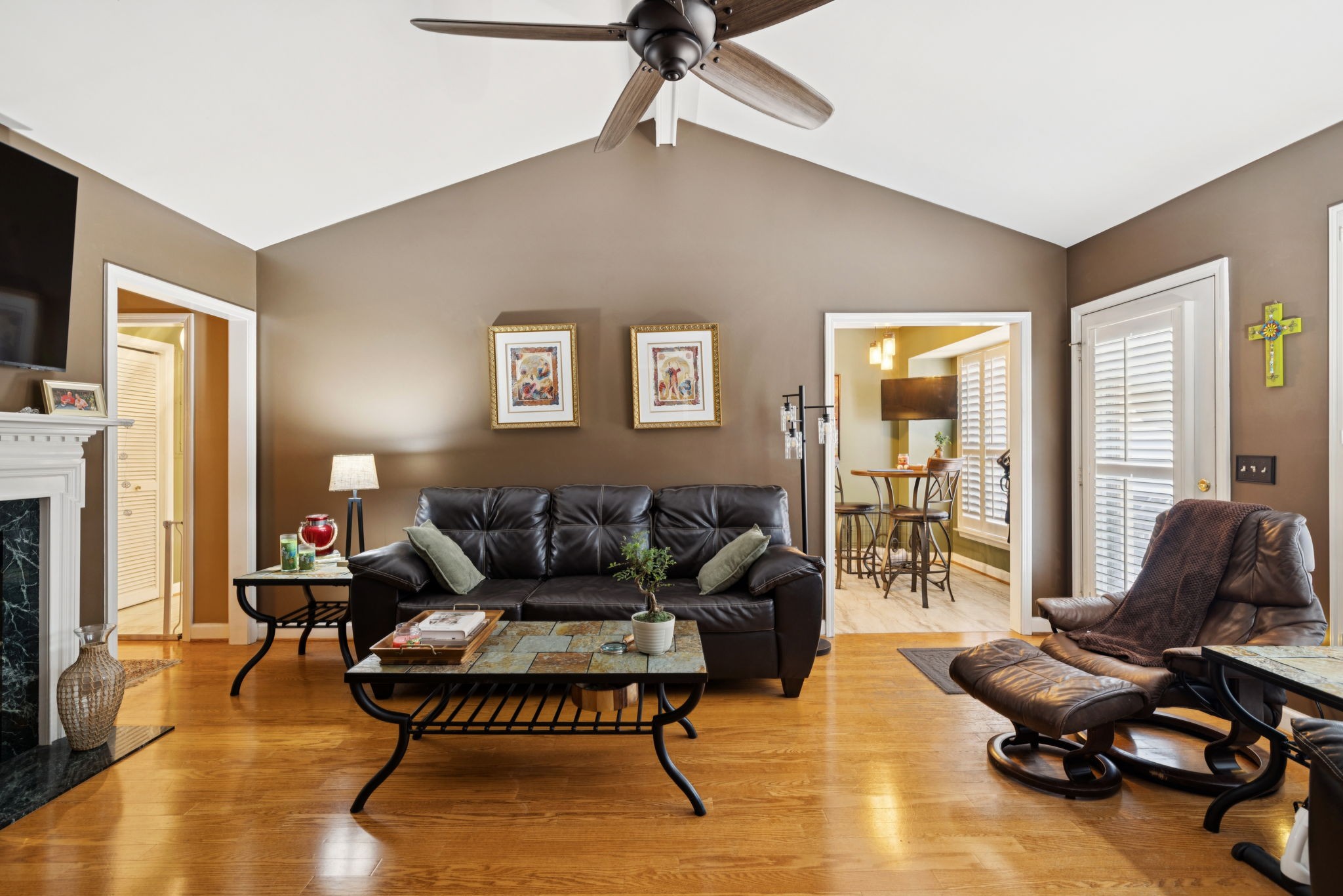 Desired Popular Andover Plan in River Plantation. Spacious 3BDR /3BA open floorplan with upstairs 14x14 flex room with full bath: possible 4th bedroom, bonus, exercise room or office. Kitchen & bathroom updates. Eat-in kitchen, pantry, tile backsplash & flooring, stainless appliances, granite countertops. Custom Plantation shutters, New fans & fixtures. Generous main-level primary suite features en-suite bath with separate shower, double vanities & cozy tub area. Separate dining room. Gas fireplace in Den plus vaulted ceilings in living room. 'Fancy Grates' cover AC grills. Appliances 11 yrs, HVAC 2 yrs, Hot water heater 4 yrs, & roof is included in HOA. Two car carport includes sizeable storage closet. Well maintained and READY FOR MOVE IN!! Community pool, walking trails & underground utilities. Not in flood zone. Conveniently located near restaurants, coffee shops & shopping. Easy access to I-40. Less than 20 min to downtown Nashville.