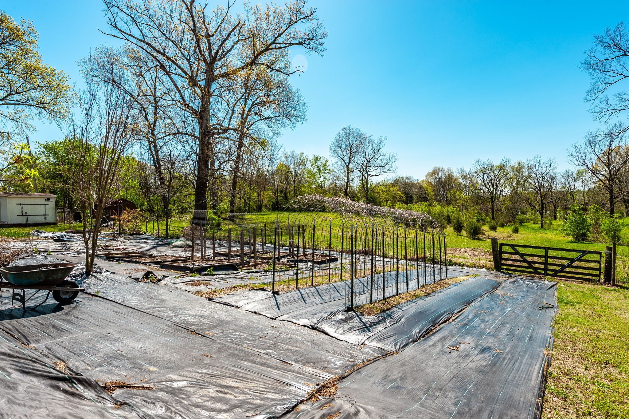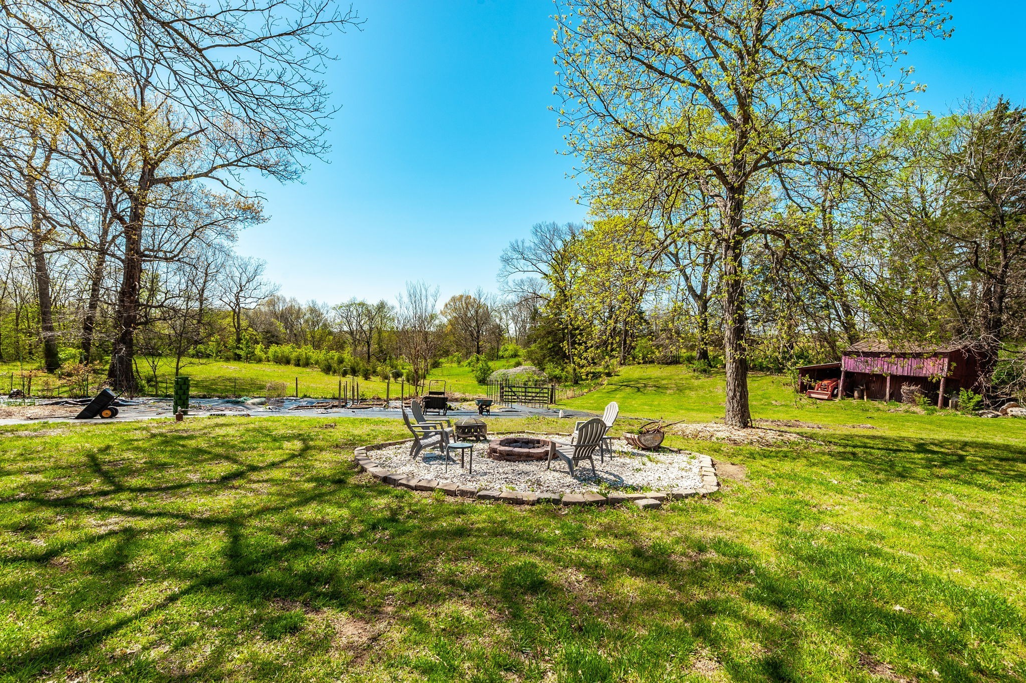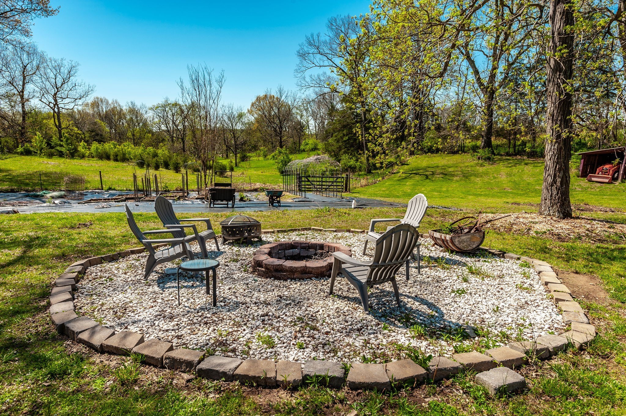 Outside, the detached garage was rebuilt from the foundation up and replaced with a steel-insulated structure, R-50 insulated garage doors, and additional attic storage. The extensive garden includes multiple fruit trees and raised beds that are ready to produce, and an old well near the garden can be re-tapped for irrigation. The property also includes a chicken coop, a storage building, and a barn. Approximately 3 acres are enclosed with a dog fence, with additional perimeter fencing around the rest of the property.