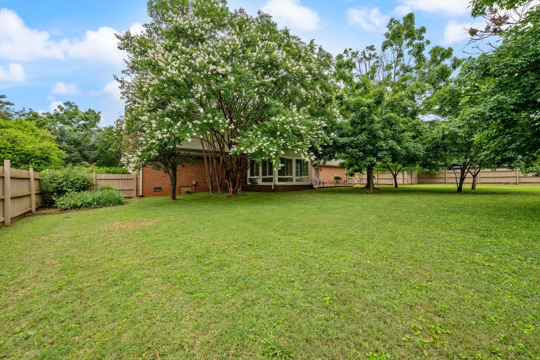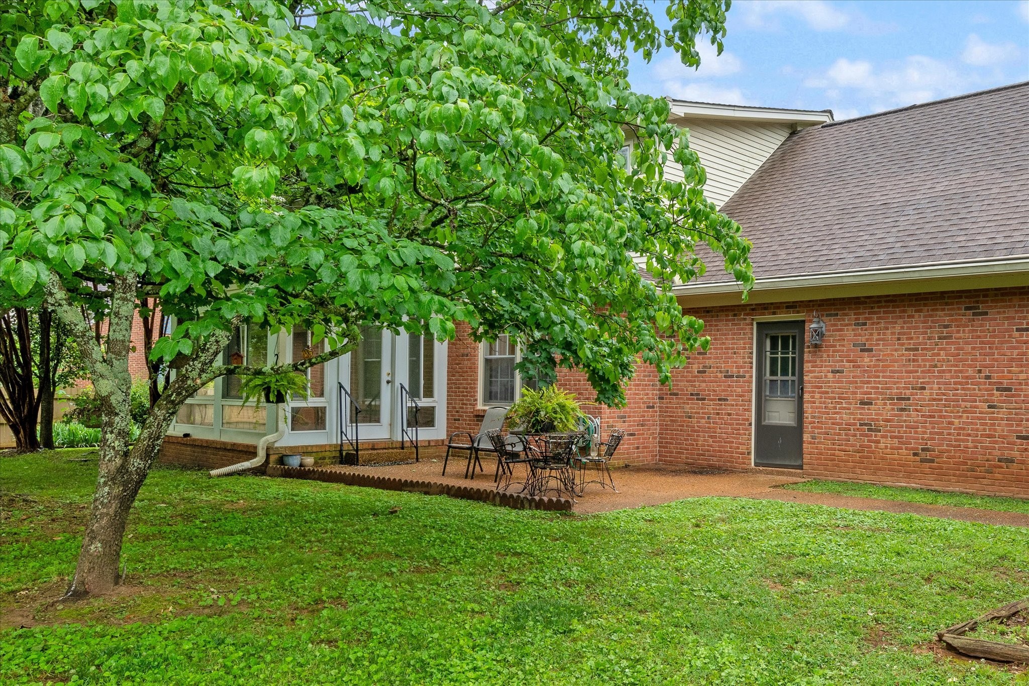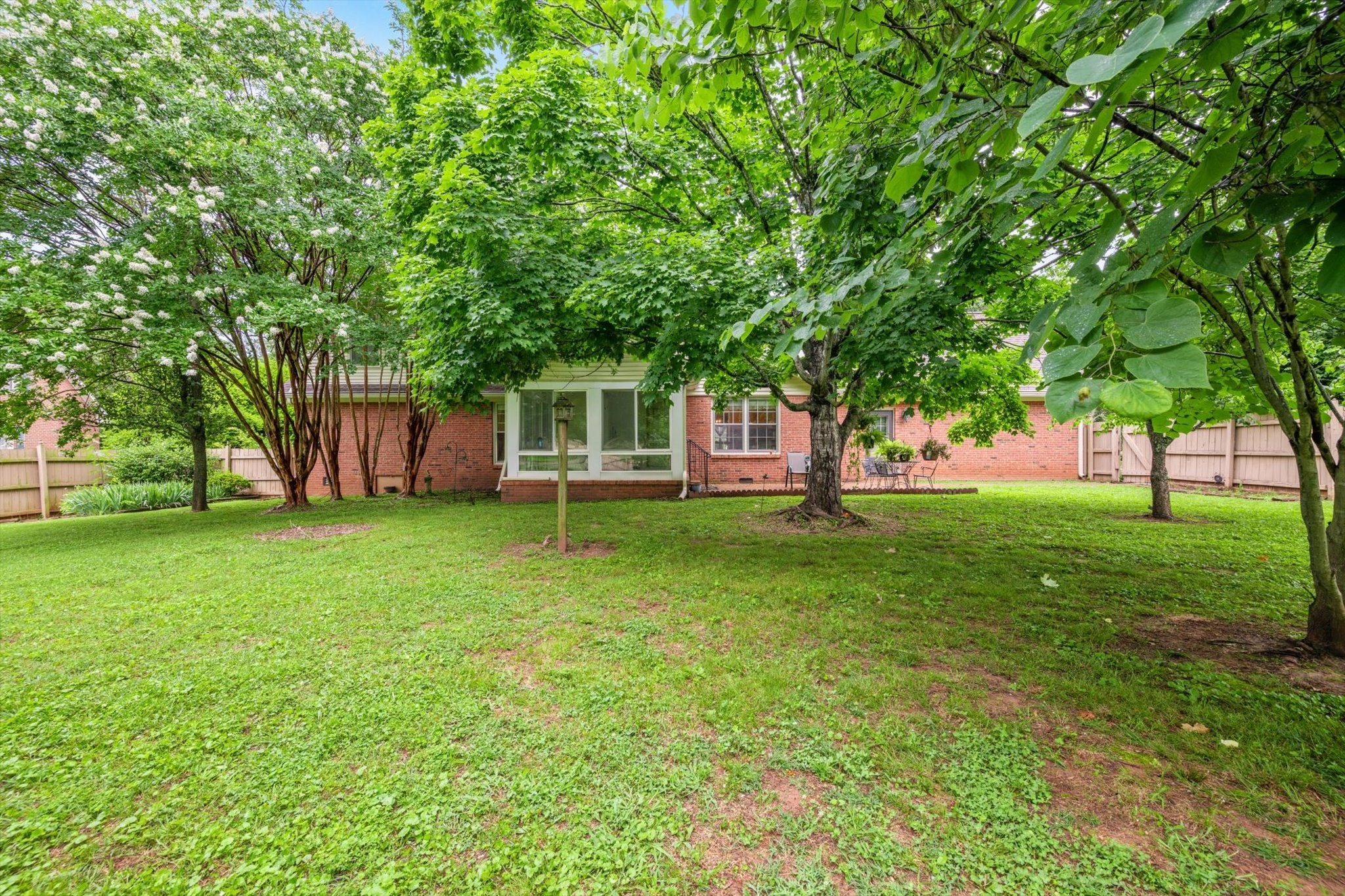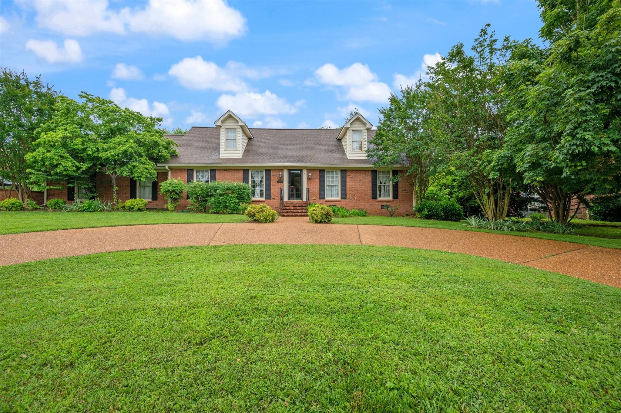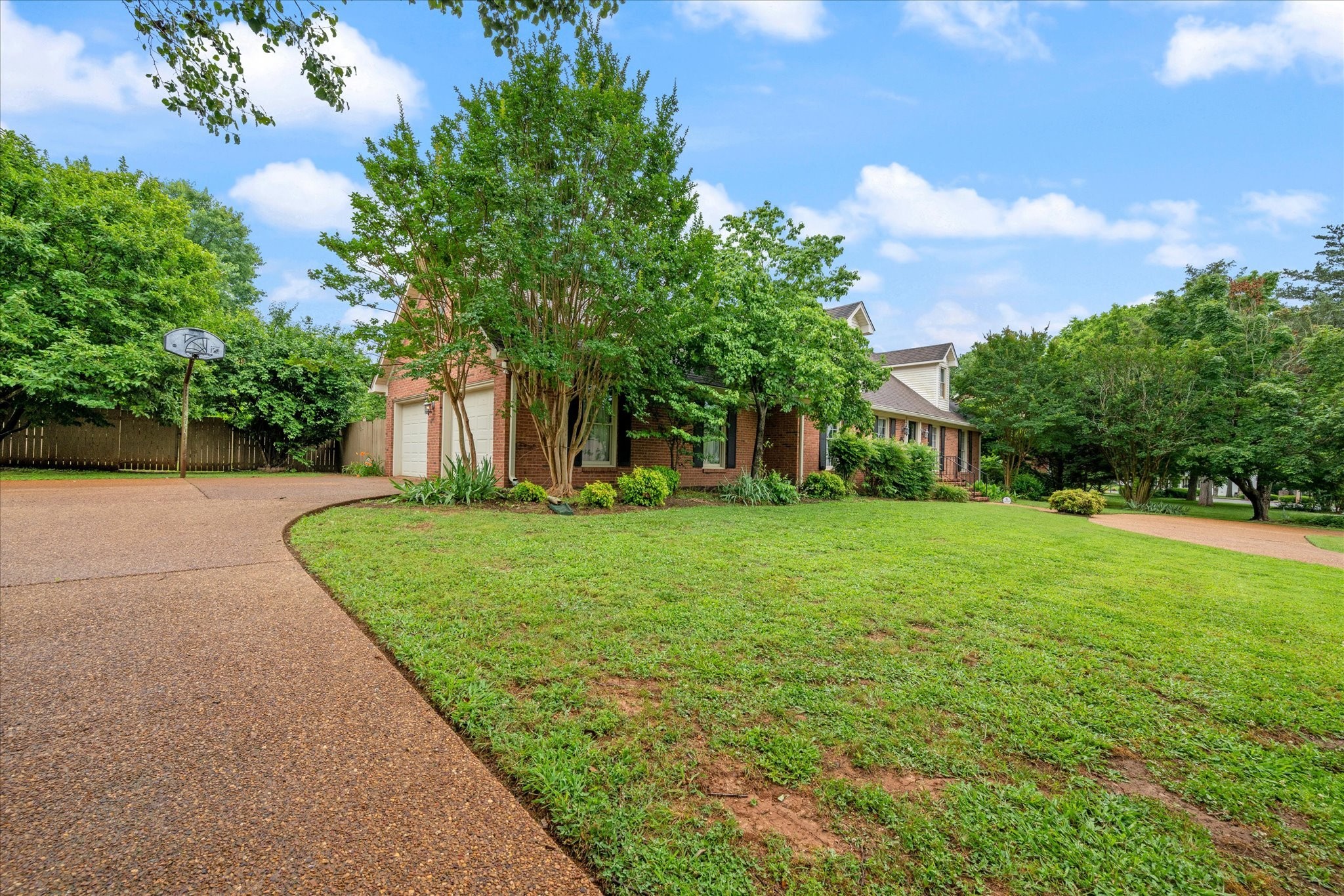 Step outside to a backyard that feels like a private oasis, with mature shade trees creating a peaceful, park-like setting. The side-entry garage and circular front drive provide ample parking and charming curb appeal.
