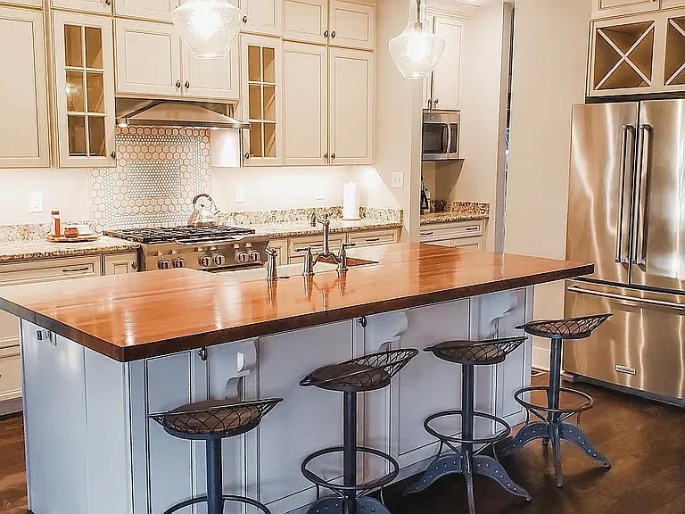 There is a spacious chef's kitchen featuring a 6-burner gas range, a large mahogany butcher-block island, ample cabinetry, and a convenient butler's pantry as well as 2 dining areas and living rooms in an expansive open layout style.