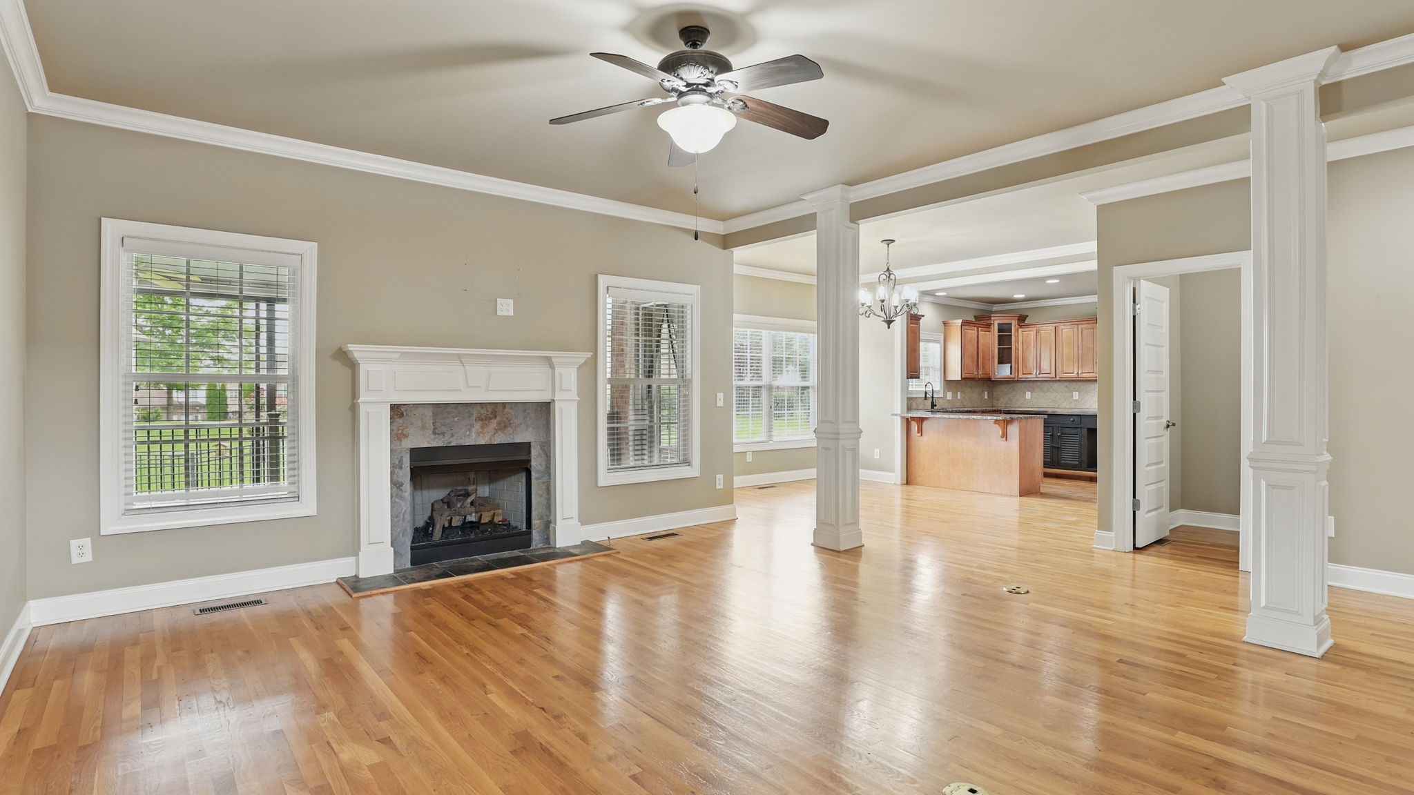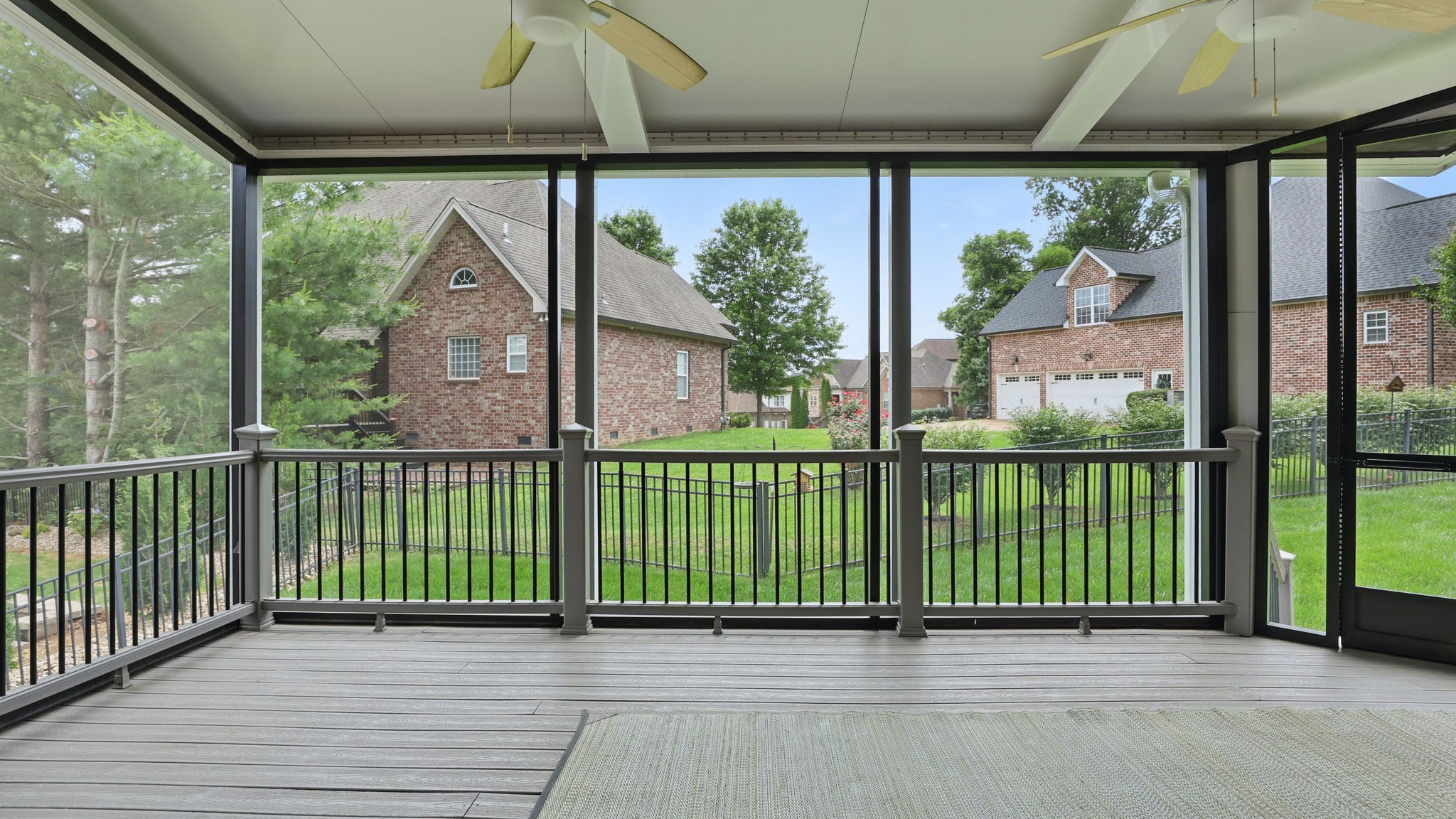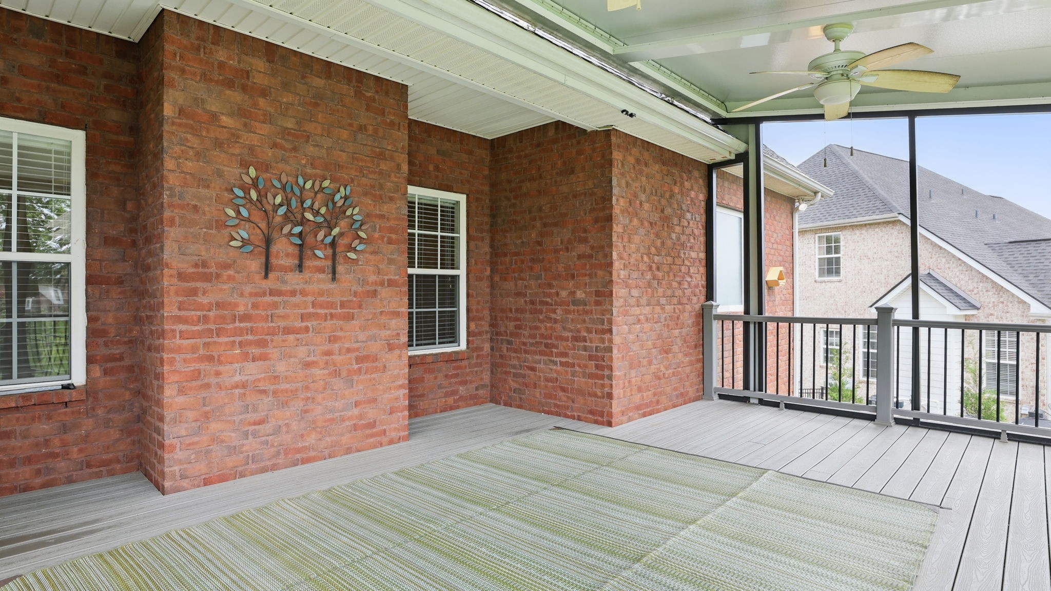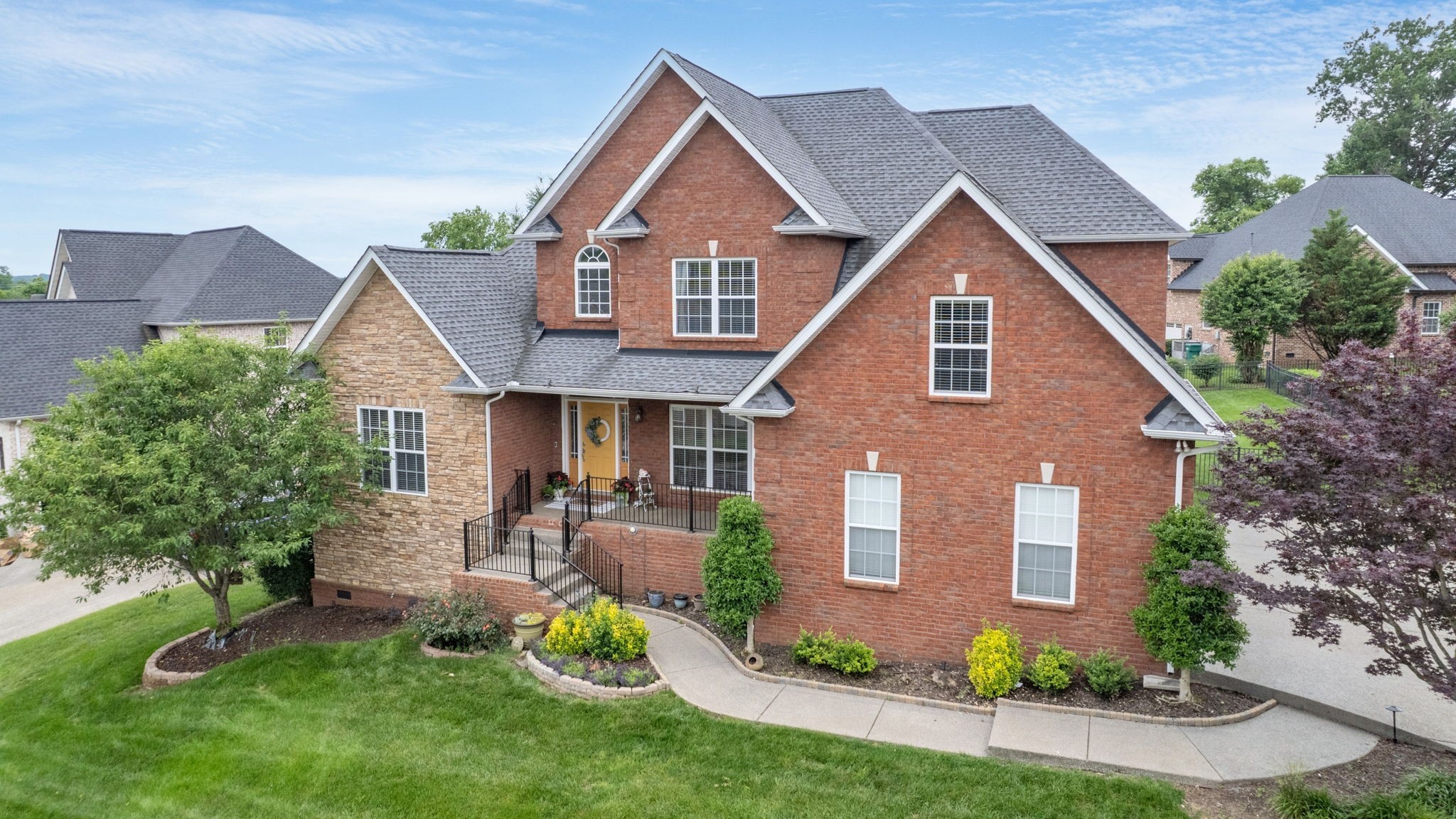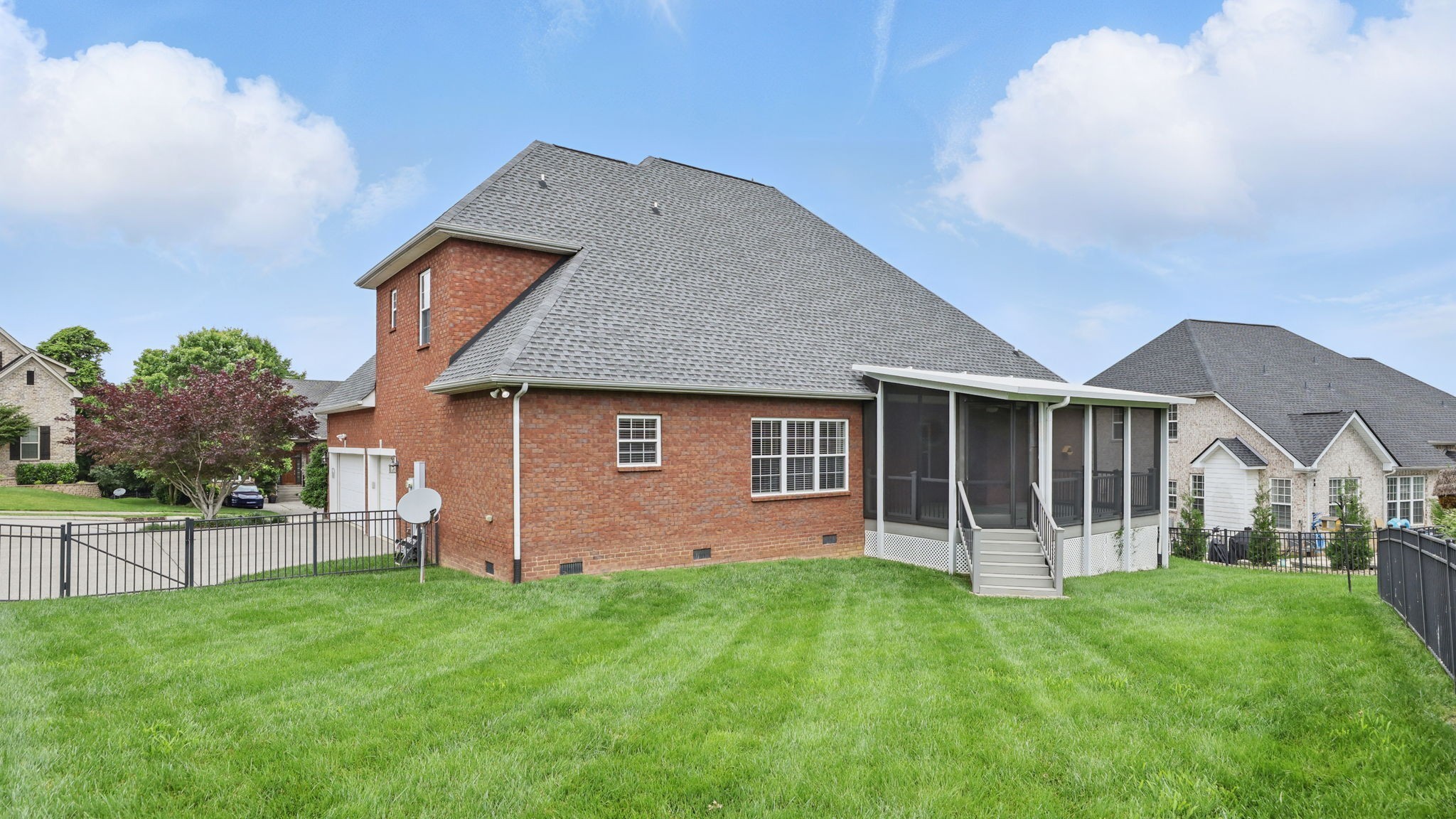 Just south of Franklin in Williamson County, this entertainer's dream features an open kitchen floor plan that flows into the cozy living room with a fireplace, leading to the back screened-in deck or the formal dining room. Decorative columns, crown molding, wainscoting, wood floors, and tray ceilings add a touch of elegance throughout. The second story includes three bedrooms, two full bathrooms, and a bonus media room. Appreciate the all-brick exterior, set above the road for privacy, with a lush green landscape and a fenced-in backyard. Enjoy the sunrise from the front porch with coffee and the sunset from the screened-in sunroom deck with a glass of wine. The neighborhood is peaceful, walkable, and features a clubhouse with a pool.
