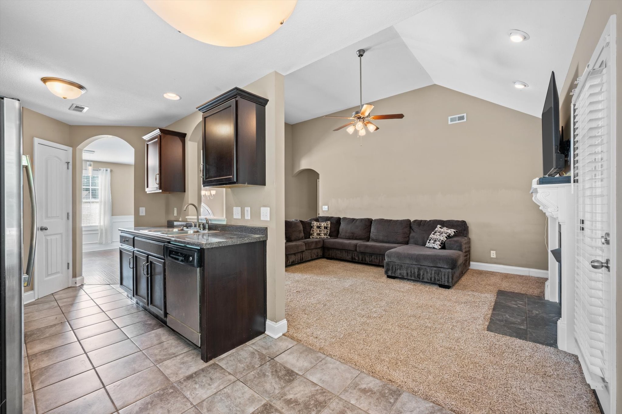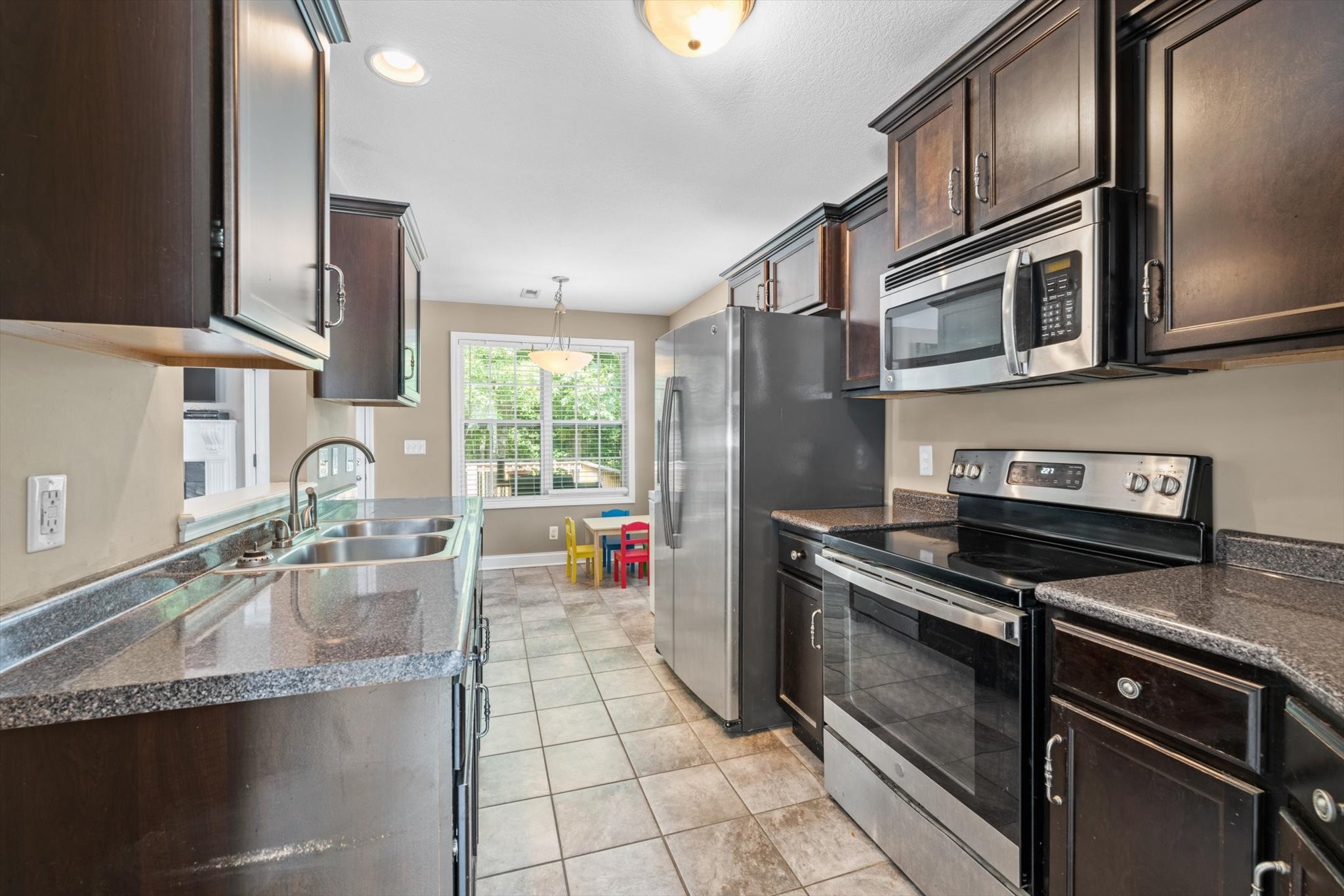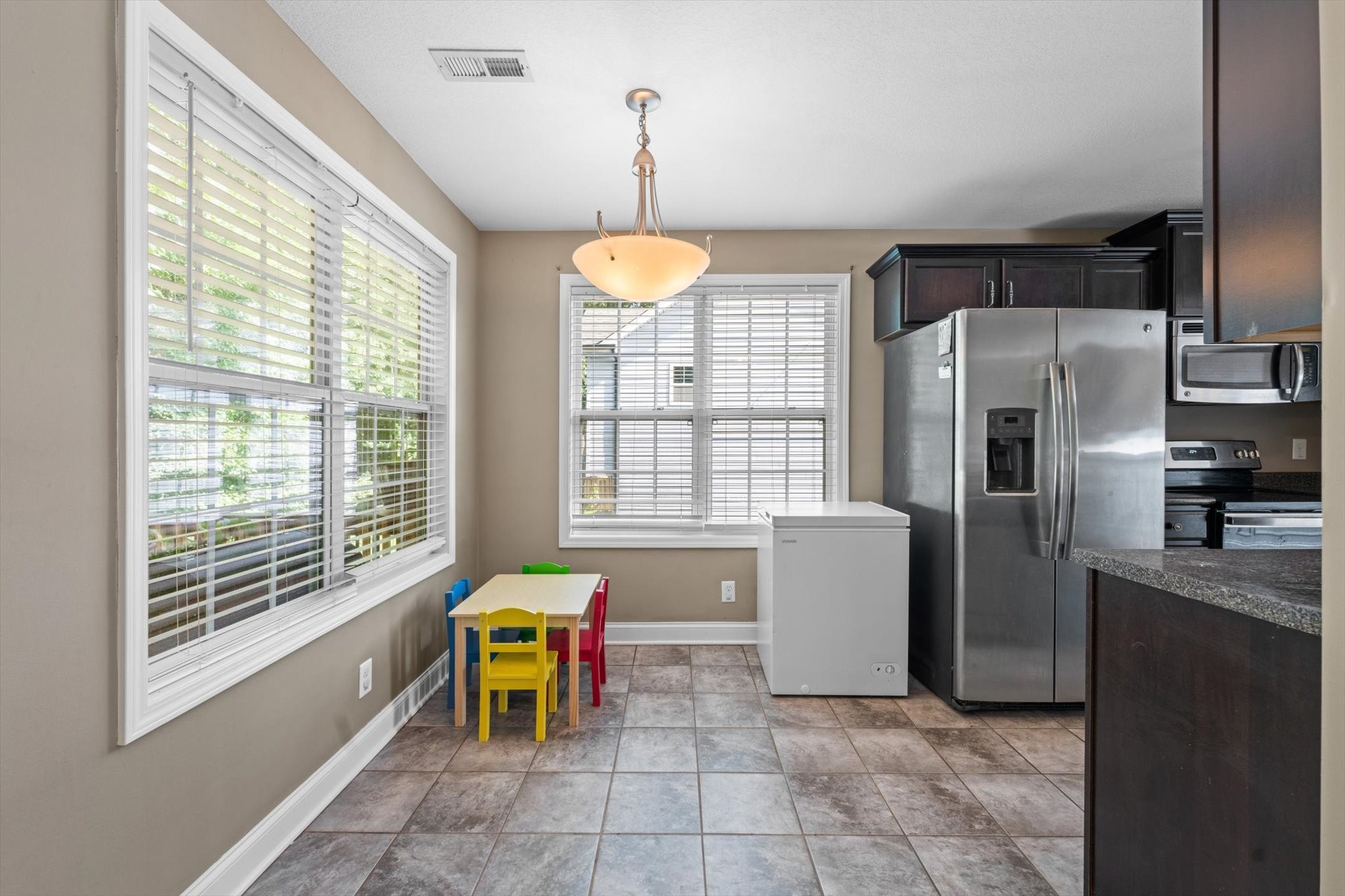 The kitchen boasts ample cabinet space and a cozy eat-in area, while the living room features warm natural light and plenty of space to unwind. The primary suite offers a peaceful retreat with its own private bath.