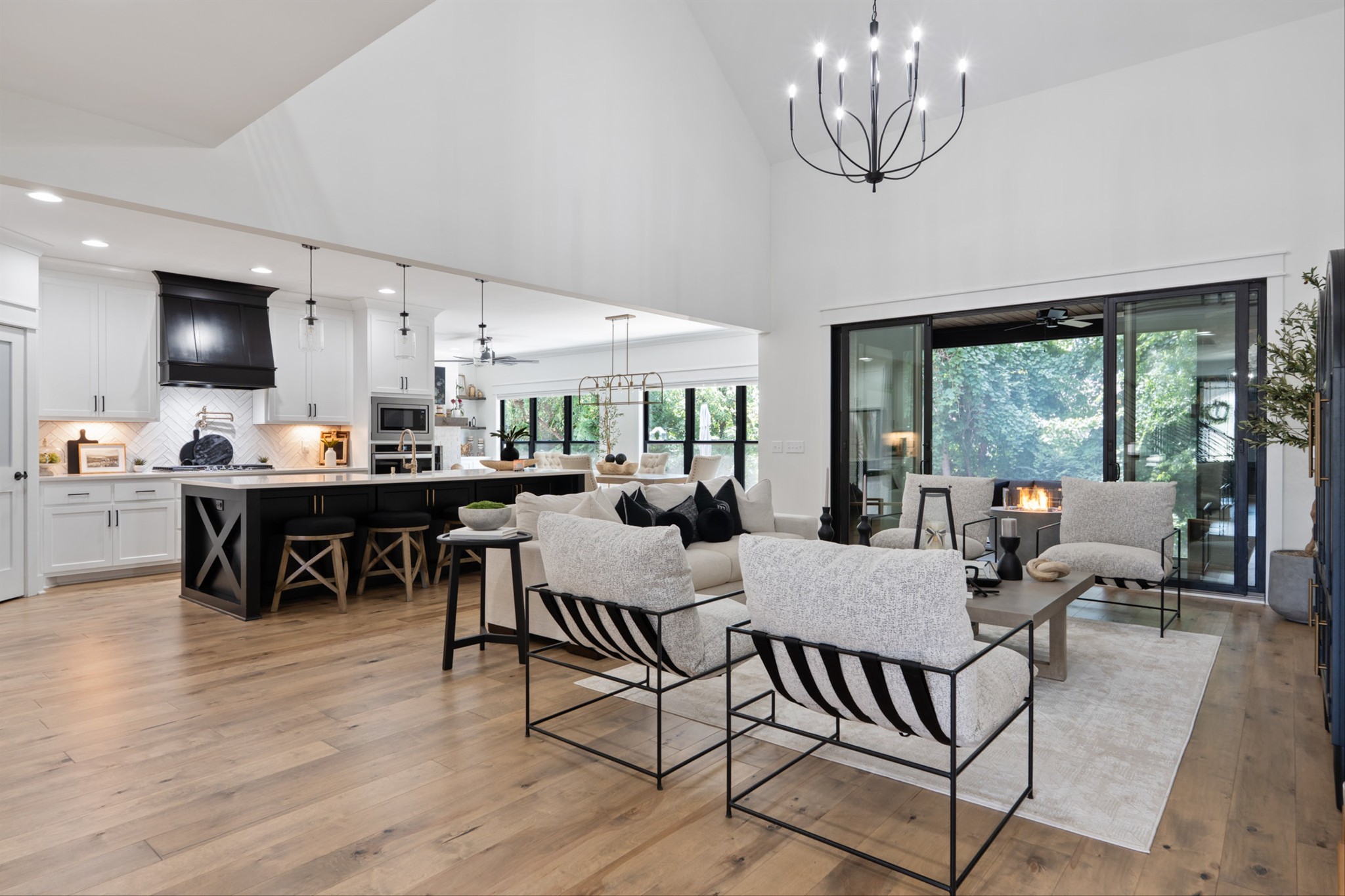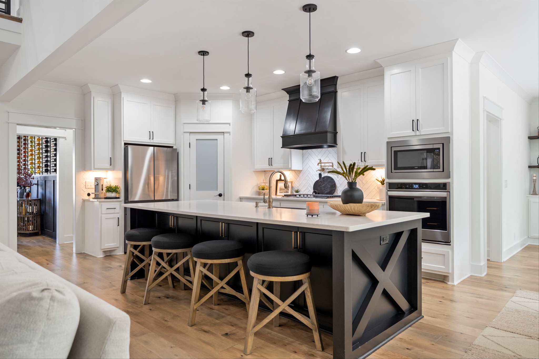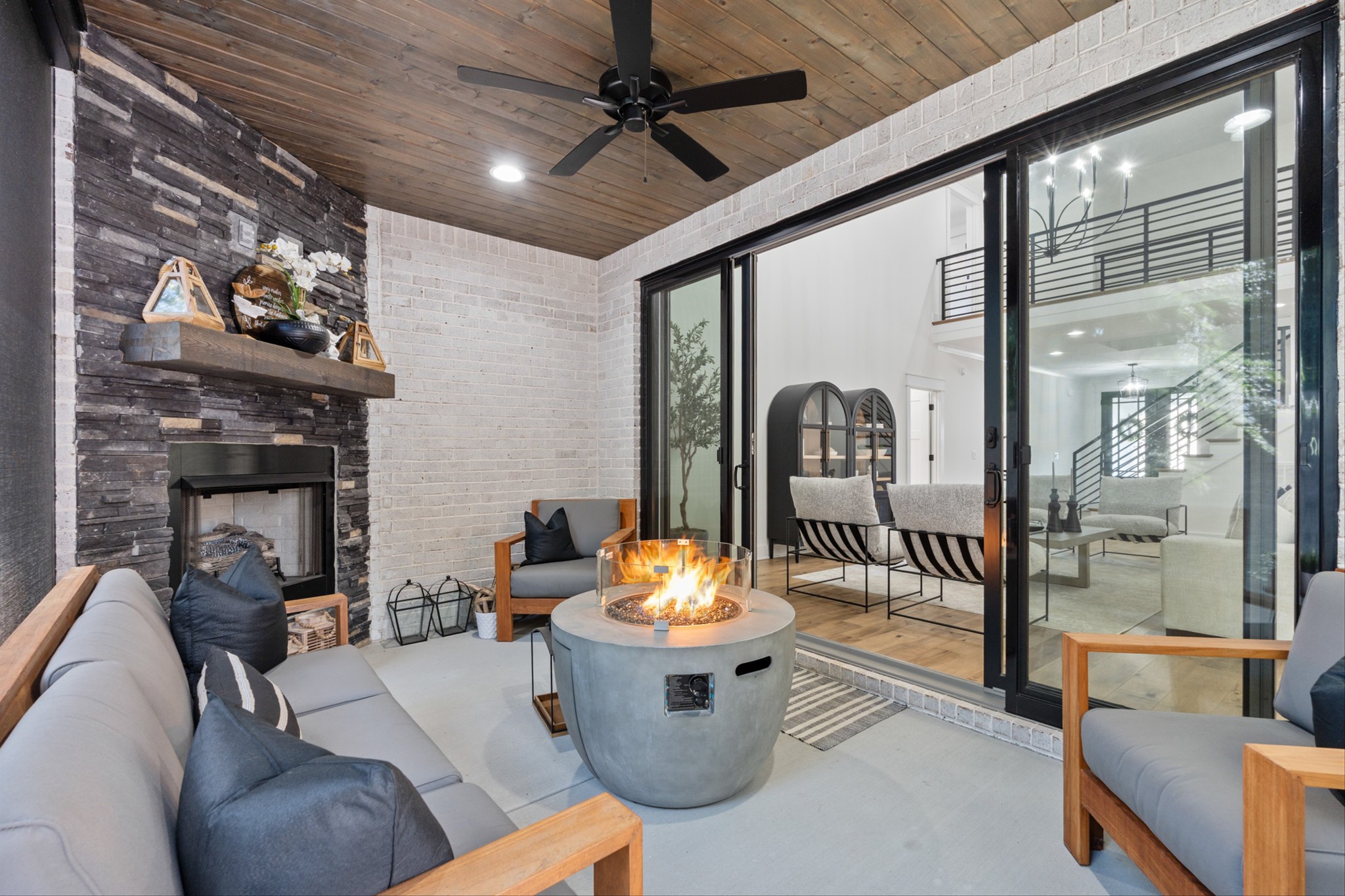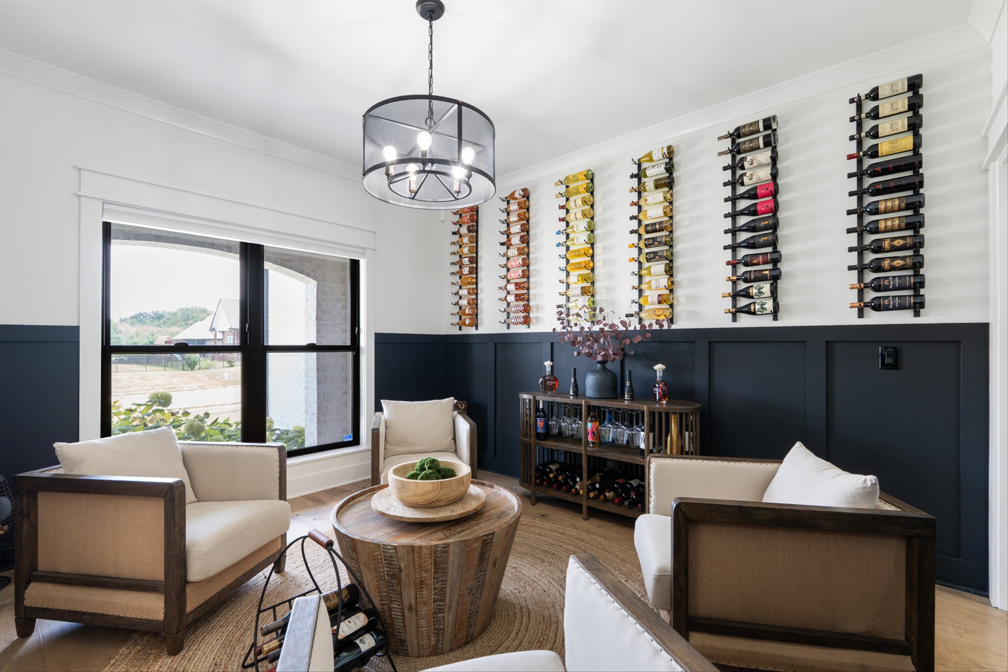 Luxury living custom-built awaits you! 5 BR & 4 full BTH, it's a dream come true! Upon entering, you'll immediately notice the exquisite upgrades throughout the home. The spacious entryway leads to a formal dining room, complete with glass sliding doors & a hidden pocket door. This room can easily be transformed into an office or, as the current owner has done, a charming wine room. The living room, featuring a soaring 20' ceiling that flows seamlessly into the gourmet kitchen. This kitchen is truly the heart of the home. It's equipped with custom cabinetry, a walk-in pantry, a gas cooktop w/ a vented hood, a pot filler, a modern backsplash, a concrete farmhouse sink, a wine fridge, & a 10' island w/ ample storage. Adjacent to the kitchen is a cozy breakfast nook & a hearth room, highlighted by a gas fireplace that serves as a stunning focal point. This space is ideal for family gatherings during meal prep & casual dining. To the left of the hearth room, you'll find a full bathroom & a guest bedroom, tucked away for your guests' privacy. Conveniently located downstairs is the laundry room, complete with a sink for added ease. The primary suite is also on the main level, featuring a coffered ceilings & a sitting area that creates a luxurious & functional retreat for relaxation or reading, separate from the main sleeping area. The primary bathroom boasts a spa-like atmosphere with dual shower heads & a rainfall shower head. You'll also find a walk-in master closet with built-in shelves. As you head upstairs note the custom iron handrail & the beautiful hardwood floors throughout. A catwalk overlooks the living area & front entryway. Upstairs, there are 3 BR, 2 full BTH, & a bonus room equipped w/ surround sound, a sink & a wine fridge making it the perfect media room. The sliding glass doors downstairs will lead to the screened-in covered back patio complete w/ a gas fireplace & TV hookup. Extended concrete patio is ideal for additional seating or a grilling space.
