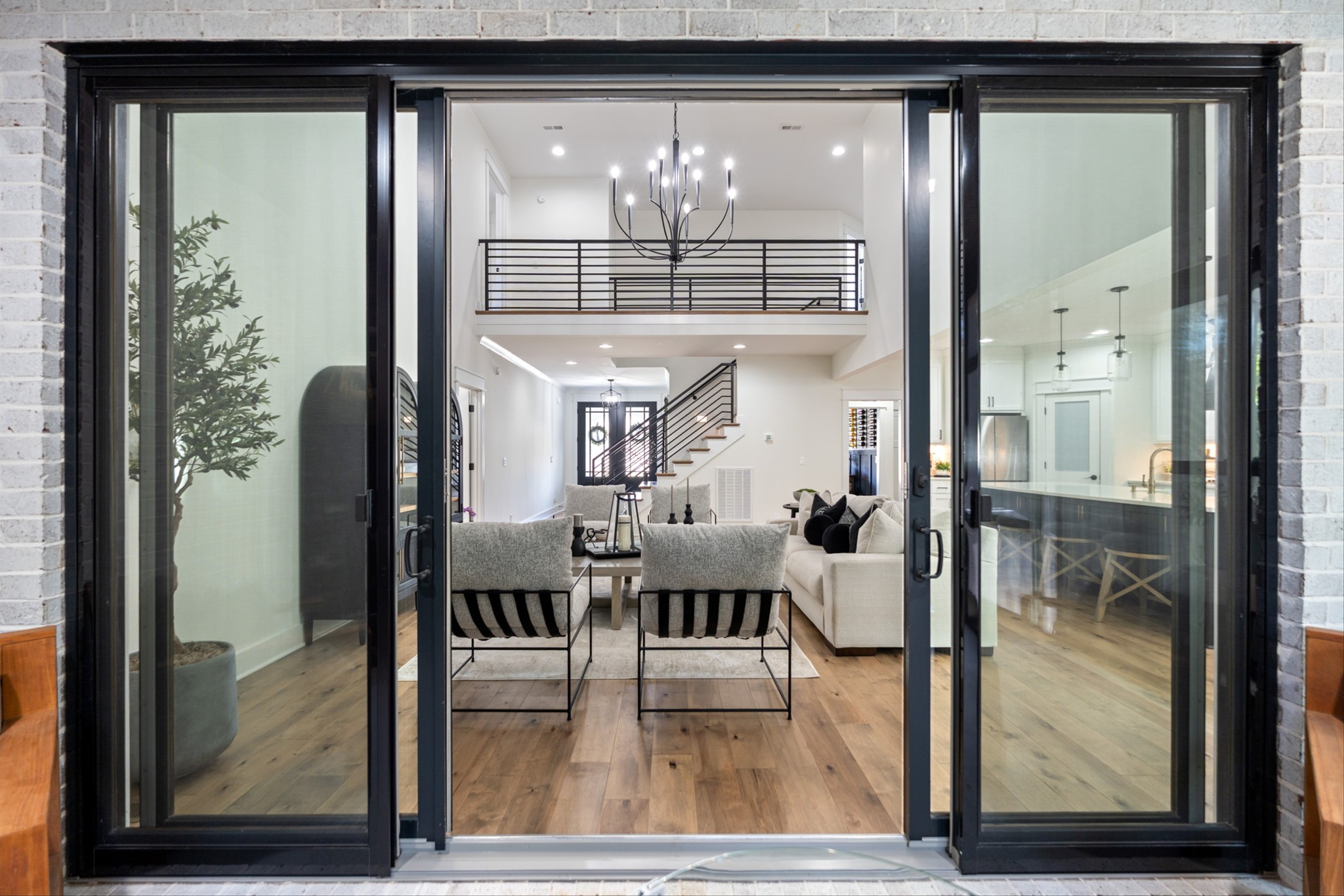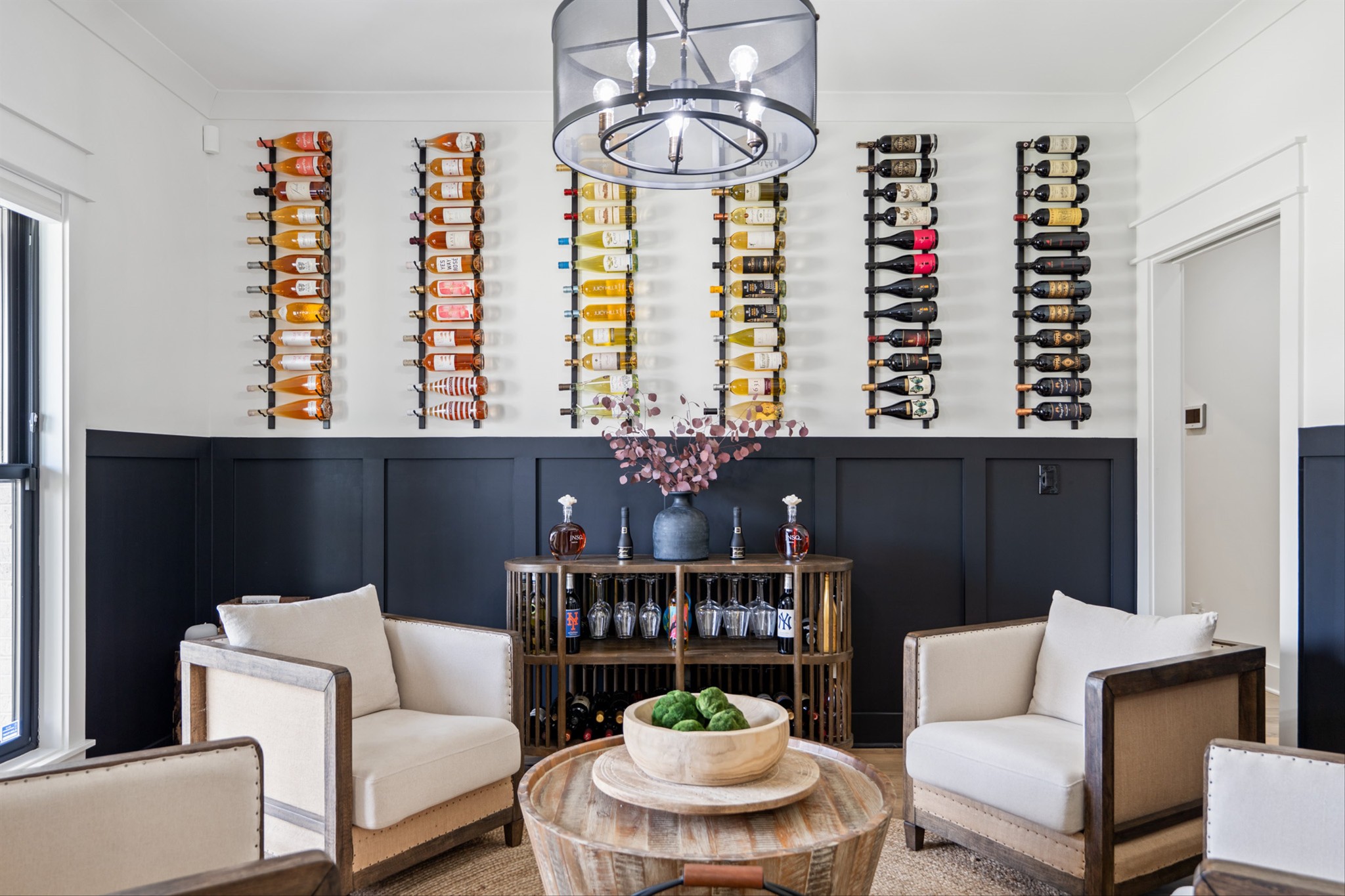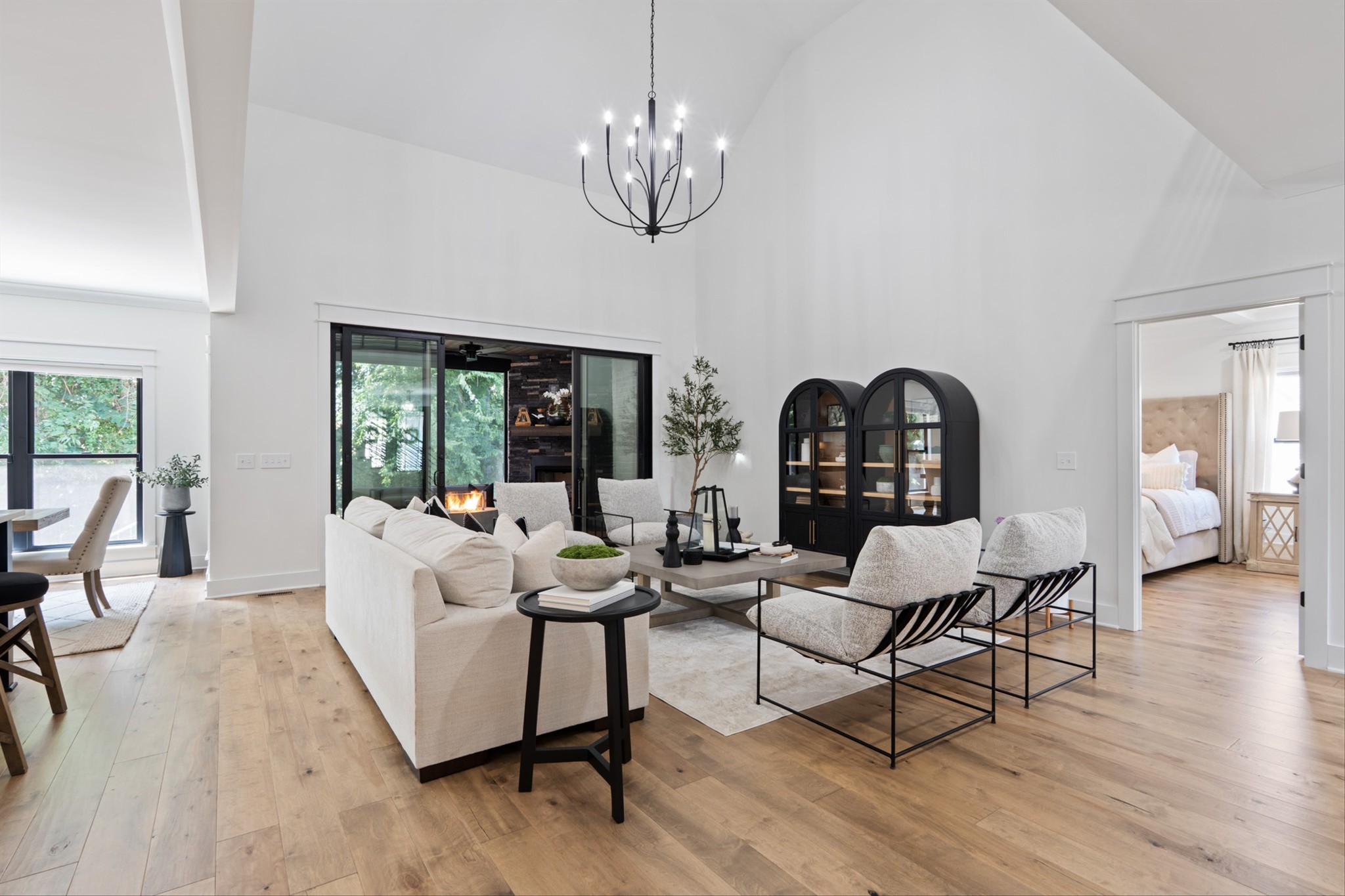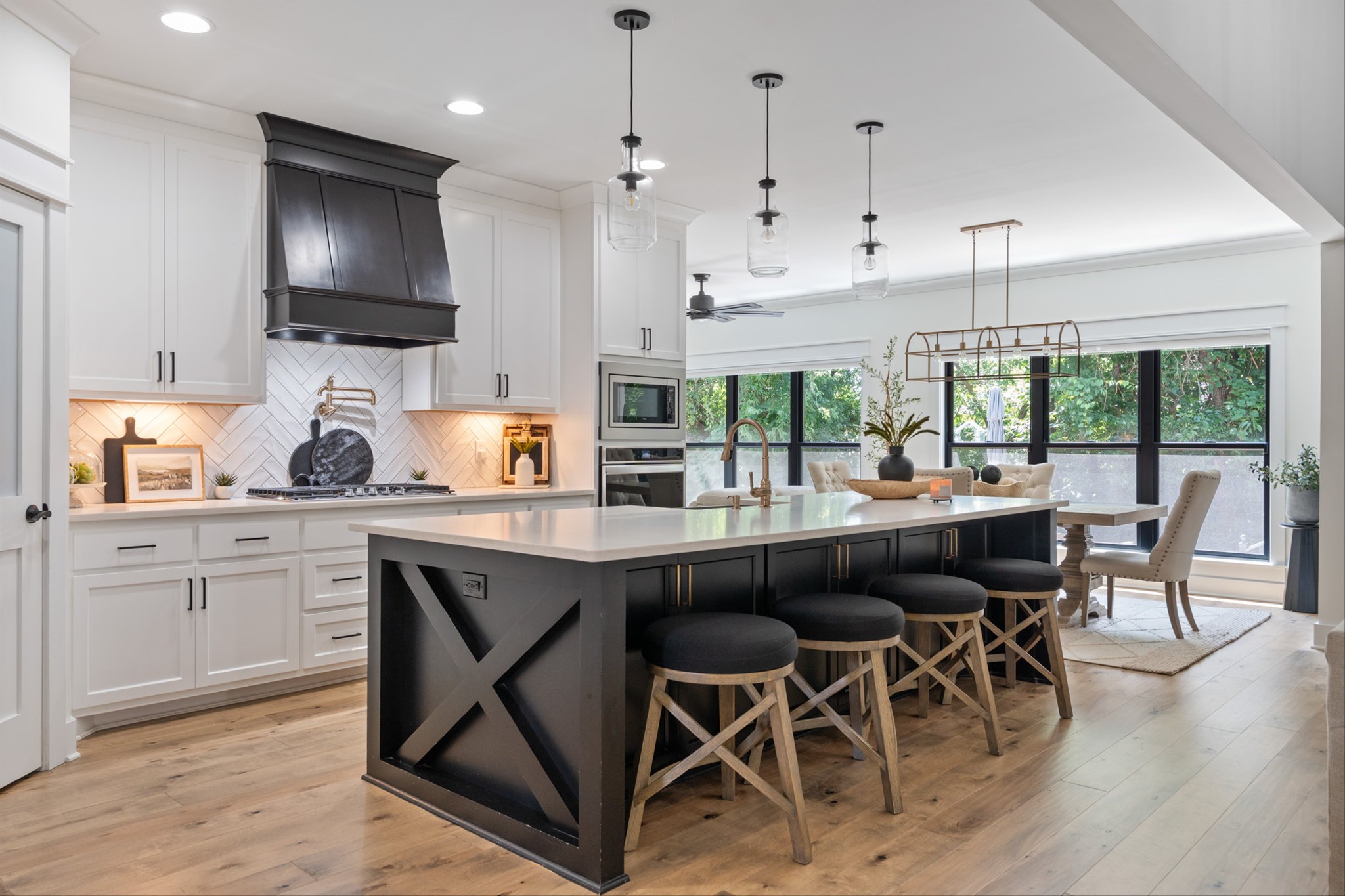 Luxury living custom-built awaits you! 5 BR & 4 full BTH, it's a dream come true! Upon entering, you'll immediately notice the exquisite upgrades throughout the home. The spacious entryway leads to a formal dining room, complete with glass sliding doors & a hidden pocket door. This room can easily be transformed into an office or, as the current owner has done, a charming wine room. The living room, featuring a soaring 20' ceiling that flows seamlessly into the gourmet kitchen. This kitchen is truly the heart of the home. It's equipped with custom cabinetry, a walk-in pantry, a gas cooktop w/ a vented hood, a pot filler, a modern backsplash, a concrete farmhouse sink, a wine fridge, & a 10' island w/ ample storage. Adjacent to the kitchen is a cozy breakfast nook & a hearth room, highlighted by a gas fireplace that serves as a stunning focal point. This space is ideal for family gatherings during meal prep & casual dining. To the left of the hearth room, you'll find a full bathroom & a guest bedroom, tucked away for your guests' privacy. Conveniently located downstairs is the laundry room, complete with a sink for added ease. The primary suite is also on the main level, featuring a coffered ceilings & a sitting area that creates a luxurious & functional retreat for relaxation or reading, separate from the main sleeping area. The primary bathroom boasts a spa-like atmosphere with dual shower heads & a rainfall shower head. You'll also find a walk-in master closet with built-in shelves. As you head upstairs note the custom iron handrail & the beautiful hardwood floors throughout. A catwalk overlooks the living area & front entryway. Upstairs, there are 3 BR, 2 full BTH, & a bonus room equipped w/ surround sound, a sink & a wine fridge making it the perfect media room. The sliding glass doors downstairs will lead to the screened-in covered back patio complete w/ a gas fireplace & TV hookup. Extended concrete patio is ideal for additional seating or a grilling space.
