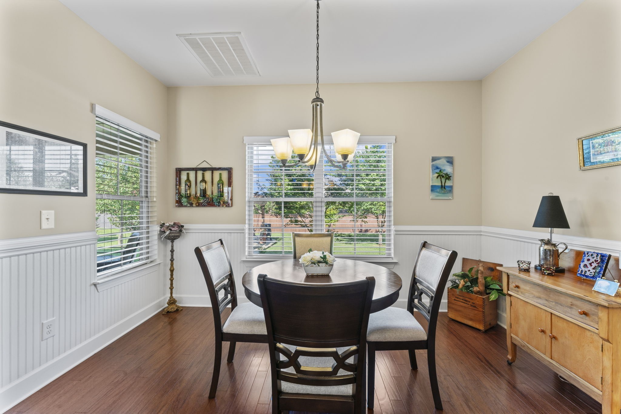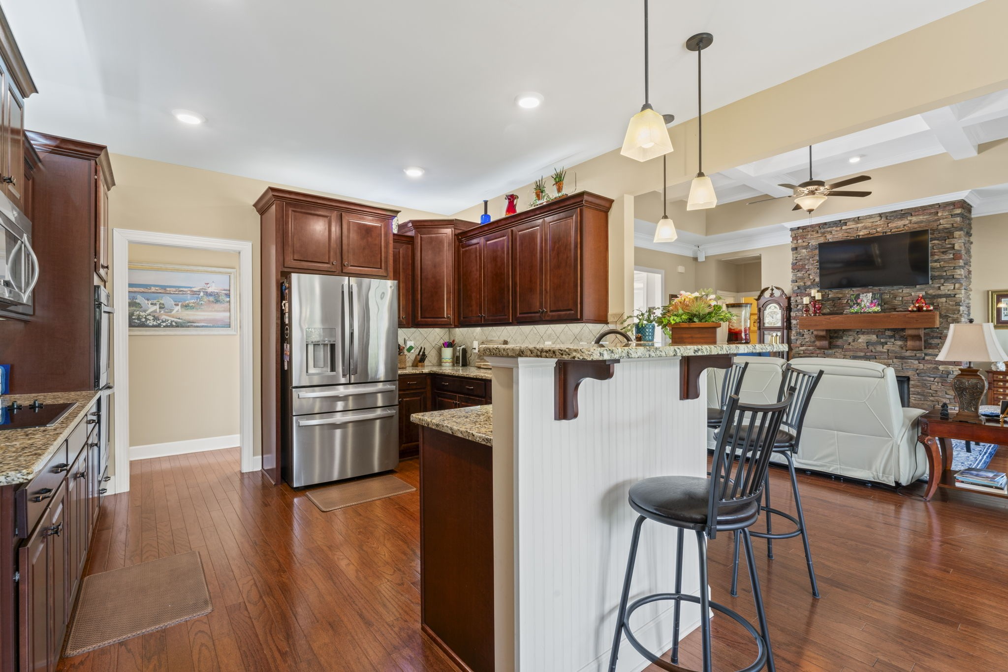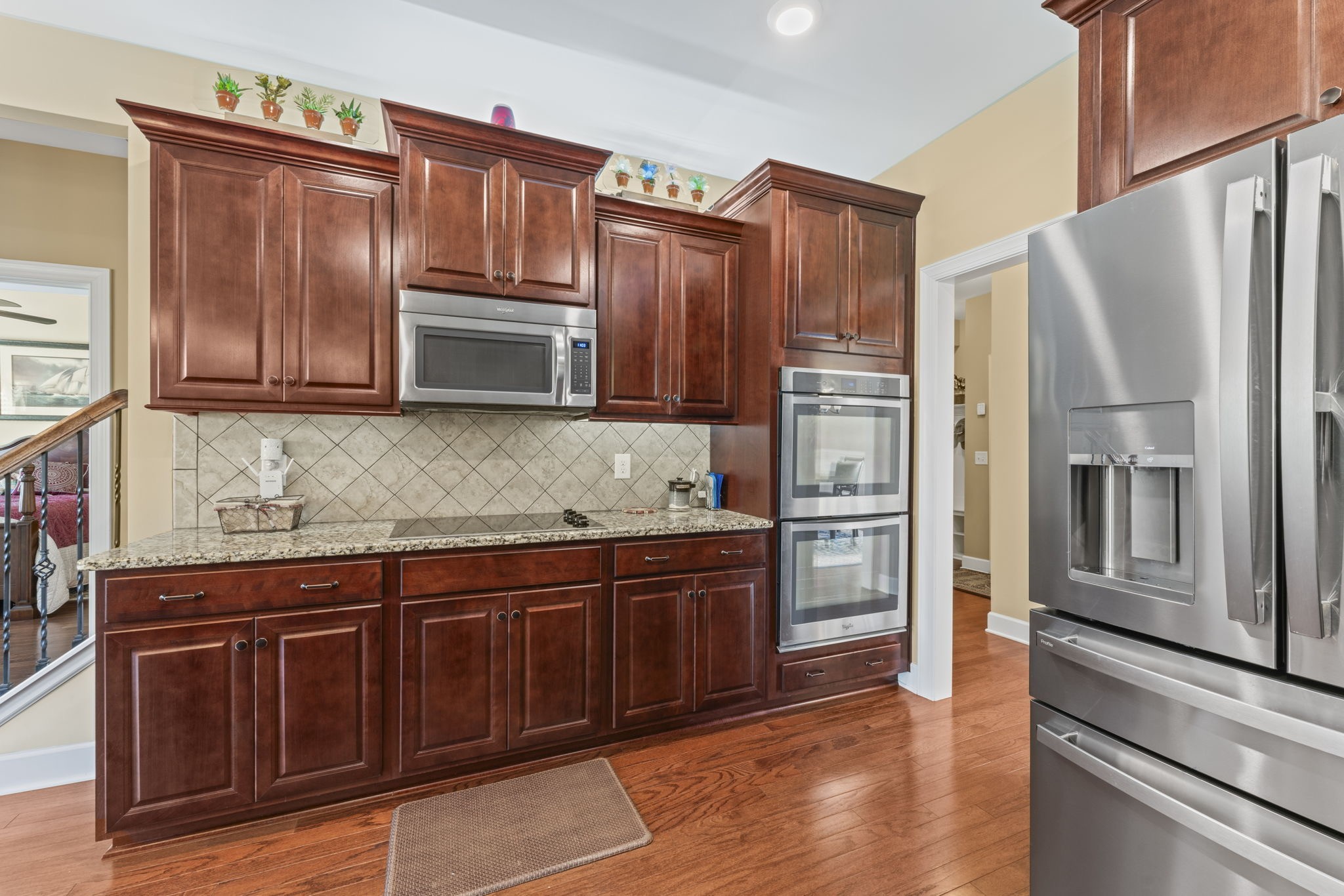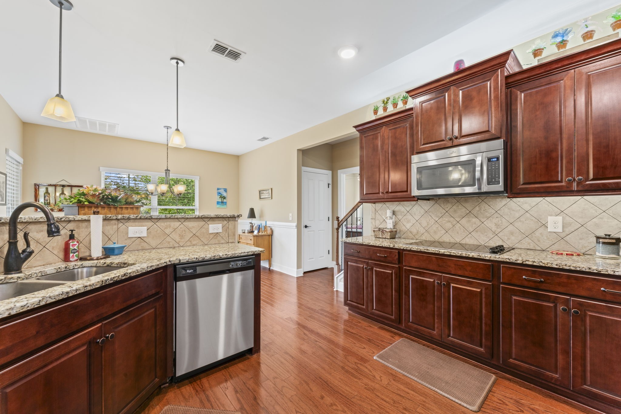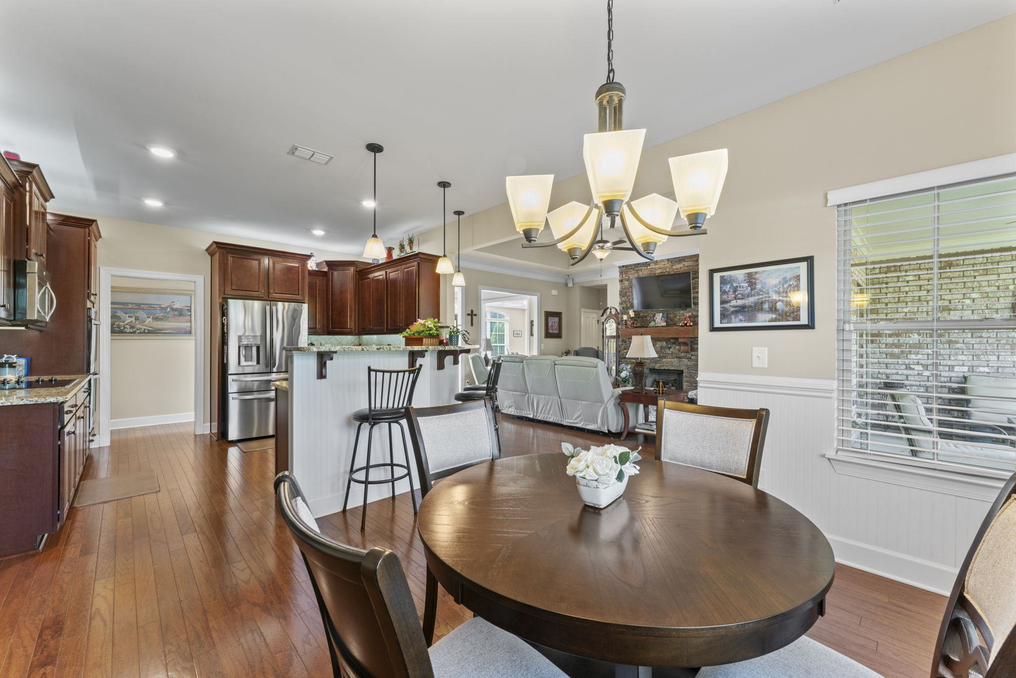 The spacious kitchen is updated with granite countertops, stylish cabinetry, and features both up and down lighting for ambiance. A breakfast nook overlooks the backyard, and the large living room includes a cozy natural gas fireplace and is wired for surround sound—along with the master suite and bonus room.