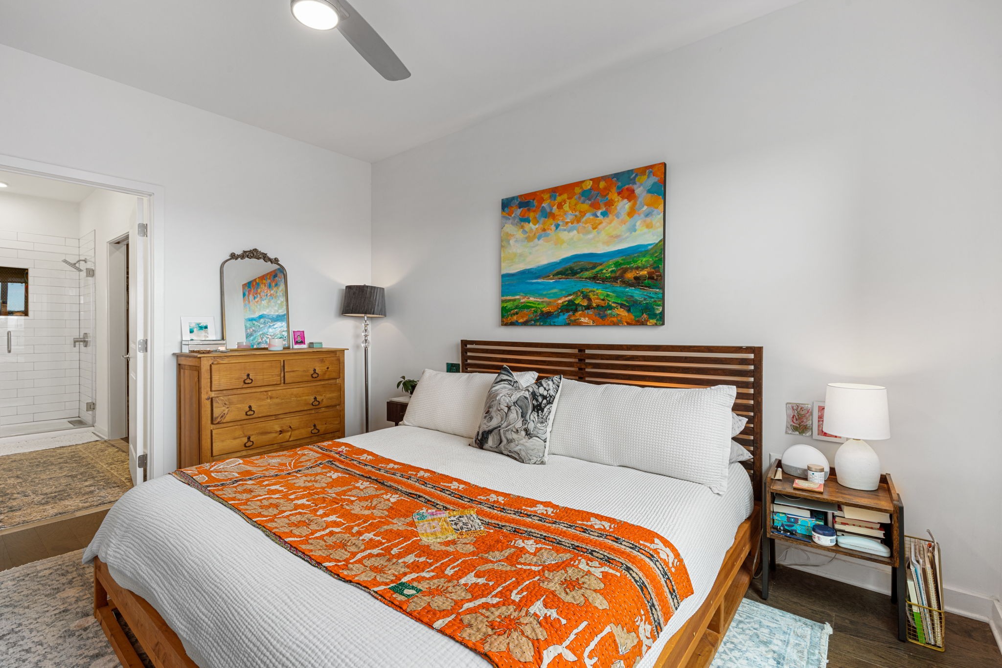 Both bedrooms are generously sized, each with its own full bath, including a luxurious primary suite with a walk-in shower and double vanities. Large windows and the top-floor setting provide added privacy, abundant natural light, and serene views with no neighbors above.